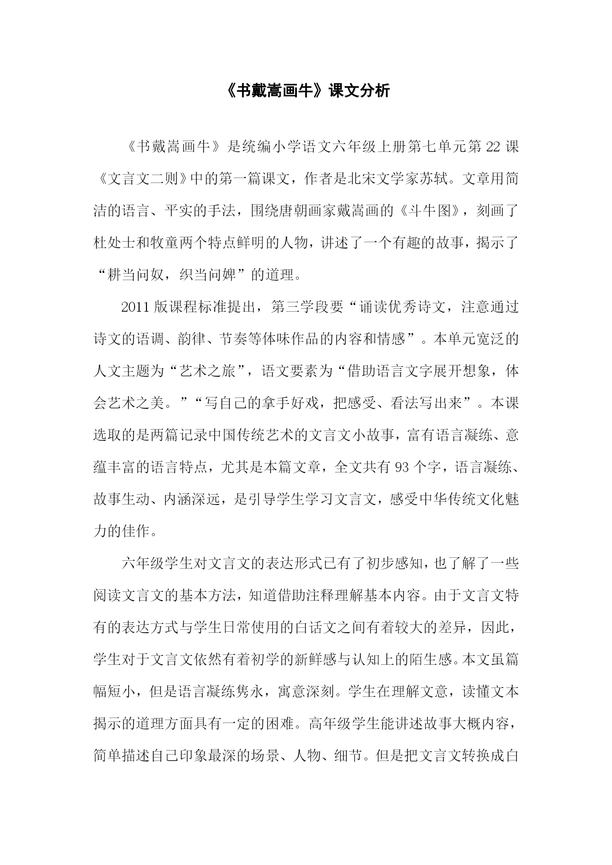《书戴嵩画牛》课文分析《书戴嵩画牛》是统编小学语文六年级上册第七单元第22课《文言文二则》中的第一篇课文,作者是北宋文学家苏轼。文章用简洁的语言、平实的手法,围绕唐朝画家戴嵩画的《斗牛图》,刻画了杜处士和牧童两个特点鲜明的人物,讲述了一个有趣的故事,揭示了“耕当问奴,织当问婢”的道理。2011版课程标准提出,第三学段要“诵读优秀诗文,注意通过诗文的语调、韵律、节奏等体味作品的内容和情感”。本单元宽泛的人文主题为“艺术之旅”,语文要素为“借助语言文字展开想象,体会艺术之美。”“写自己的拿手好戏,把感受、看法