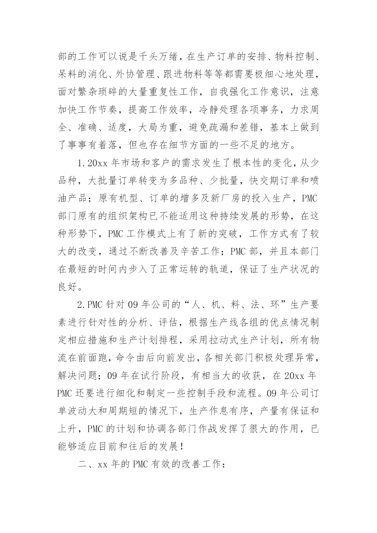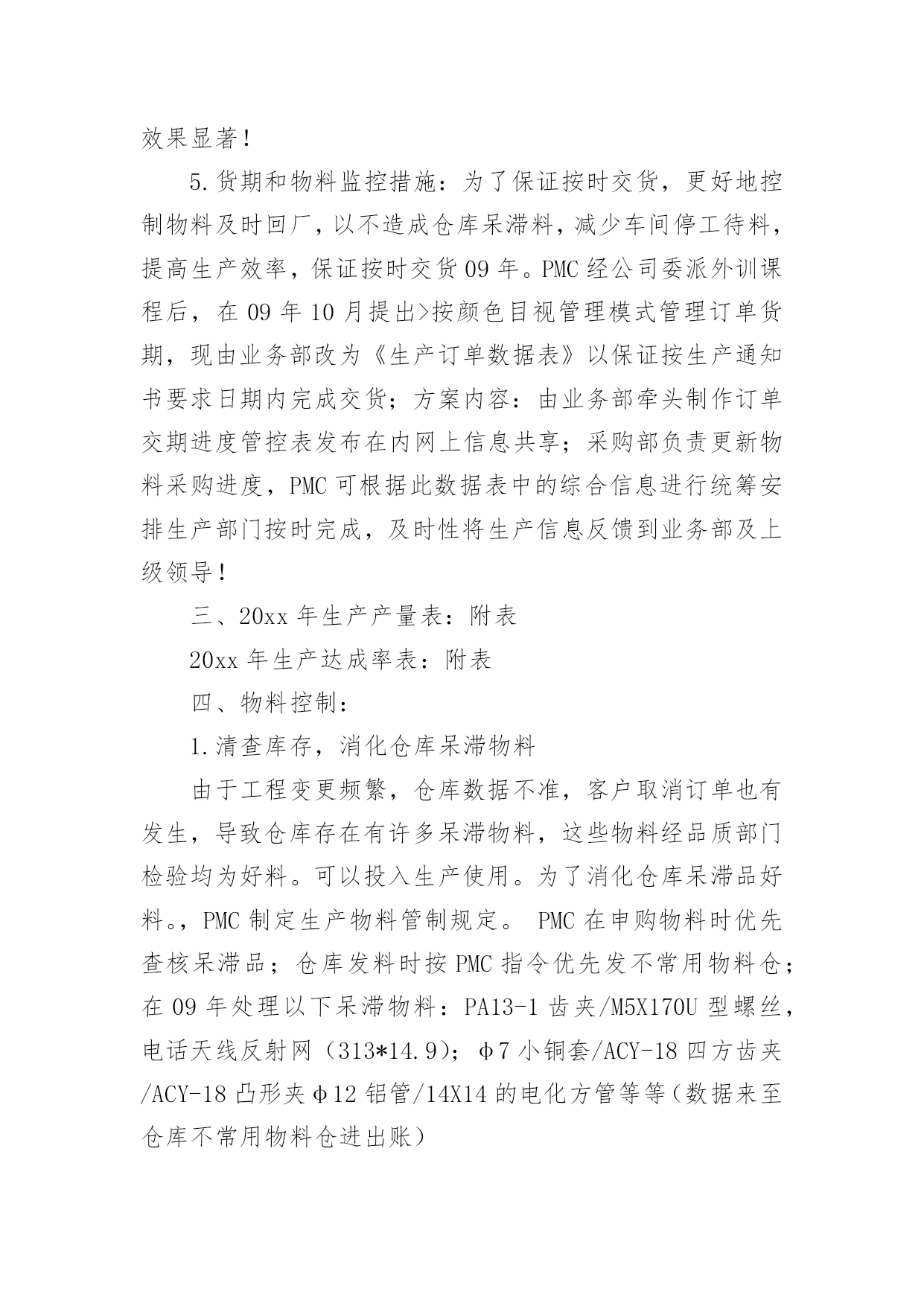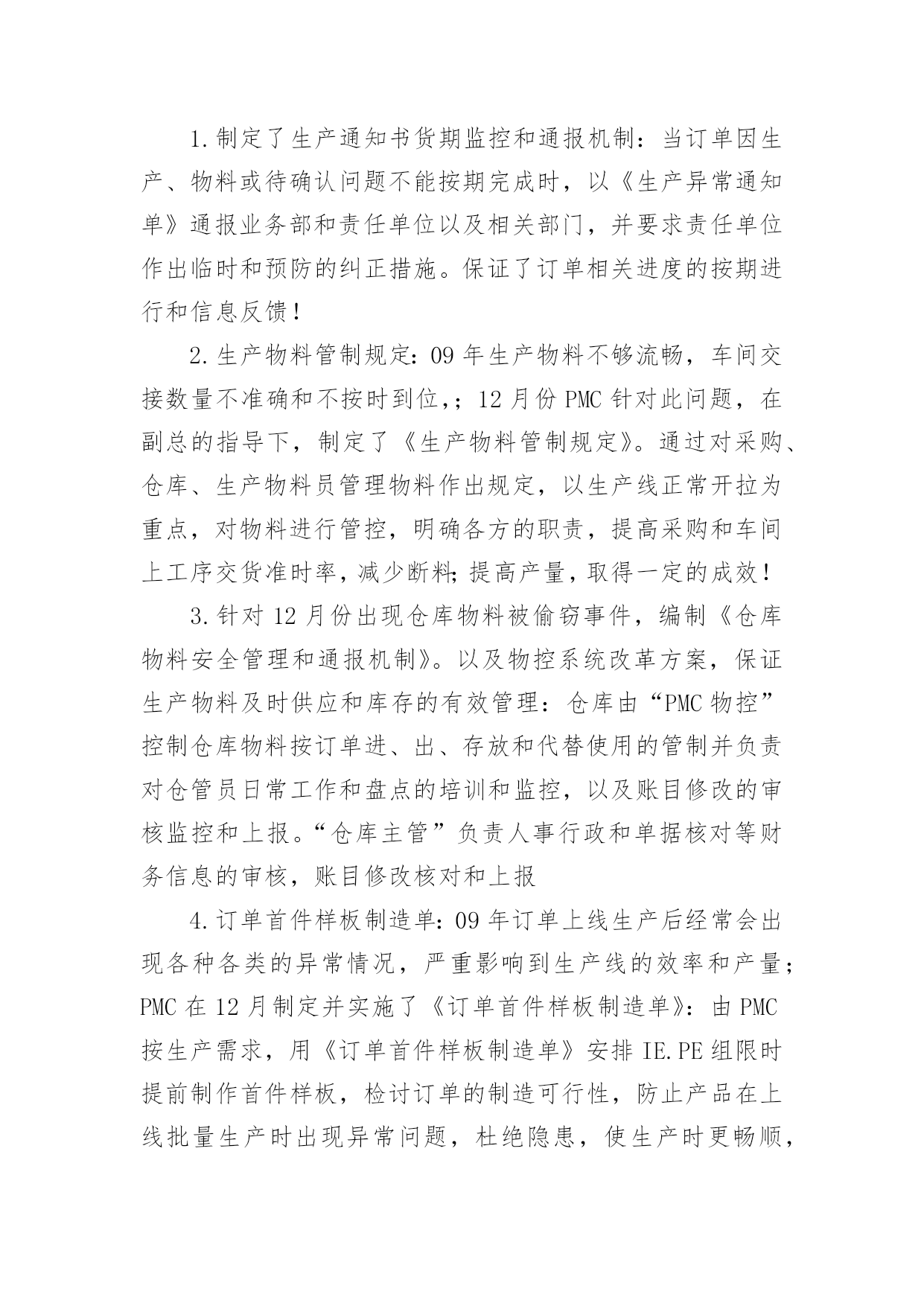 PMC工作总结总结是指对某一阶段的工作、学习或思想中的经验或情况进行分析研究,做出带有规律性结论的书面材料,它可以帮助我们有寻找学习和工作中的规律,不如我们来制定一份总结吧。如何把总结做到重点突出呢?下面是小编为大家整理的PMC工作总结,仅供参考,欢迎大家阅读。PMC工作总结1转眼间20xx年就在我们的忙碌而充实的工作中留在了背后。回顾这一年来的工作,PMC部门在公司领导及各部门同事的支持下,严格要求自己,按照公司的要求,较好地完成了部门的本职工作。通过这一年来的不断改善及辛苦工作,工作模式上有了新的突破,工作方式有了较大的改变,各方面均取得了一定的进步;现将一年来的工作情况总结如下:一、目标的达成、生产计划和产量控制:PMC部门的管理对公司来说起着至关重要的作用,公司的生产能否正常,销售计划能否按时、仓库是否会造成囤料、积料、物流是否正常畅通等等,可以说几乎掌握在PMC手中。因此,PMC部门所达成的目标在一定程度上也显示了公司订单及各种任务的完成情况及各部门之间相互配合的情况。作为公司的领头羊、生产的服务及控制部门,PMC部门清醒地认识到,PMC部是承上启下、沟通内外、协调左右、联系四面八方的枢纽,推动各项工作朝着既定目标前进的中心。PMC部的工作可以说是千头万绪,在生产订单的安排、物料控制、呆料的消化、外协管理、跟进物料等等都需要极细心地处理,面对繁杂琐碎的大量重复性工作,自我强化工作意识,注意加快工作节奏,提高工作效率,冷静处理各项事务,力求周全、准确、适度,大局为重,避免疏漏和差错,基本上做到了事事有着落,但也存在细节方面的一些不足的地方。1.20xx年市场和客户的需求发生了根本性的变化,从少品种,大批量订单转变为多品种、少批量,快交期订单和喷油产品;原有机型、订单的增多及新厂房的投入生产,PMC部门原有的组织架构已不能适用这种持续发展的形势,在这种形势下,PMC工作模式上有了新的突破,工作方式有了较大的改变,通过不断改善及辛苦工作;PMC部,并且本部门在最短的时间内步入了正常运转的轨道,保证了生产状况的良好。2.PMC针对09年公司的“人、机、料、法、环”生产要素进行针对性的分析、评估,根据生产线各组的优点情况制定相应措施和生产计划排程,采用拉动式生产计划,所有物流在前面跑,命令由后向前发出,各相关部门积极处理异常,解决问题;09年在试行阶段,有相当大的收获,在20xx年PMC还要进行细化和制定一些控制手段和流程。09年公司订单波动大和周期短的情况下,生产作息有序,产量有保证和上升,PMC的计划和协调各部门作战发挥了很大的作用,已能够适应目前和往后的发展!二、xx年的PMC有效的改善工作:1.制定了生产通知书货期监控和通报机制:当订单因生产、物料或待确认问题不能按期完成时,以《生产异常通知单》通报业务部和责任单位以及相关部门,并要求责任单位作出临时和预防的纠正措施。保证了订单相关进度的按期进行和信息反馈!2.生产物料管制规定:09年生产物料不够流畅,车间交接数量不准确和不按时到位,;12月份PMC针对此问题,在副总的指导下,制定了《生产物料管制规定》。通过对采购、仓库、生产物料员管理物料作出规定,以生产线正常开拉为重点,对物料进行管控,明确各方的职责,提高采购和车间上工序交货准时率,减少断料;提高产量,取得一定的成效!3.针对12月份出现仓库物料被偷窃事件,编制《仓库物料安全管理和通报机制》。以及物控系统改革方案,保证生产物料及时供应和库存的有效管理:仓库由“PMC物控”控制仓库物料按订单进、出、存放和代替使用的管制并负责对仓管员日常工作和盘点的培训和监控,以及账目修改的审核监控和上报。“仓库主管”负责人事行政和单据核对等财务信息的审核,账目修改核对和上报4.订单首件样板制造单:09年订单上线生产后经常会出现各种各类的异常情况,严重影响到生产线的效率和产量;PMC在12月制定并实施了《订单首件样板制造单》:由PMC按生产需求,用《订单首件样板制造单》安排IE.PE组限时提前制作首件样板,检讨订单的制造可行性,防止产品在上线批量生产时出现异常问题,杜绝隐患,使生产时更畅顺,效果显著!5.货期和物料监控措施:为了保证按时交货,更好地控制物料及时回厂,以不造成仓库呆滞料,减少车间停工待料,提高生产效率,保证按时交货09年。PMC经公司委派外训课程后,在09年10月提出>按颜色目视管理模式管理订单货期,现由业务部改为《生产订单数据表》以保证按生产通知书要求日期内完成交货;方案内容:由业务部牵头制作订单交期进度管控表发布在内网上信息共享;采购部负责更新物料采购进度,PMC可根据此数据表中的综合信息进行统筹安排生产部门按时完成,及时性将生产信息反馈到业务部及上级领导!三、20xx年生产产量表:附表20xx年生产达成率表:附表
