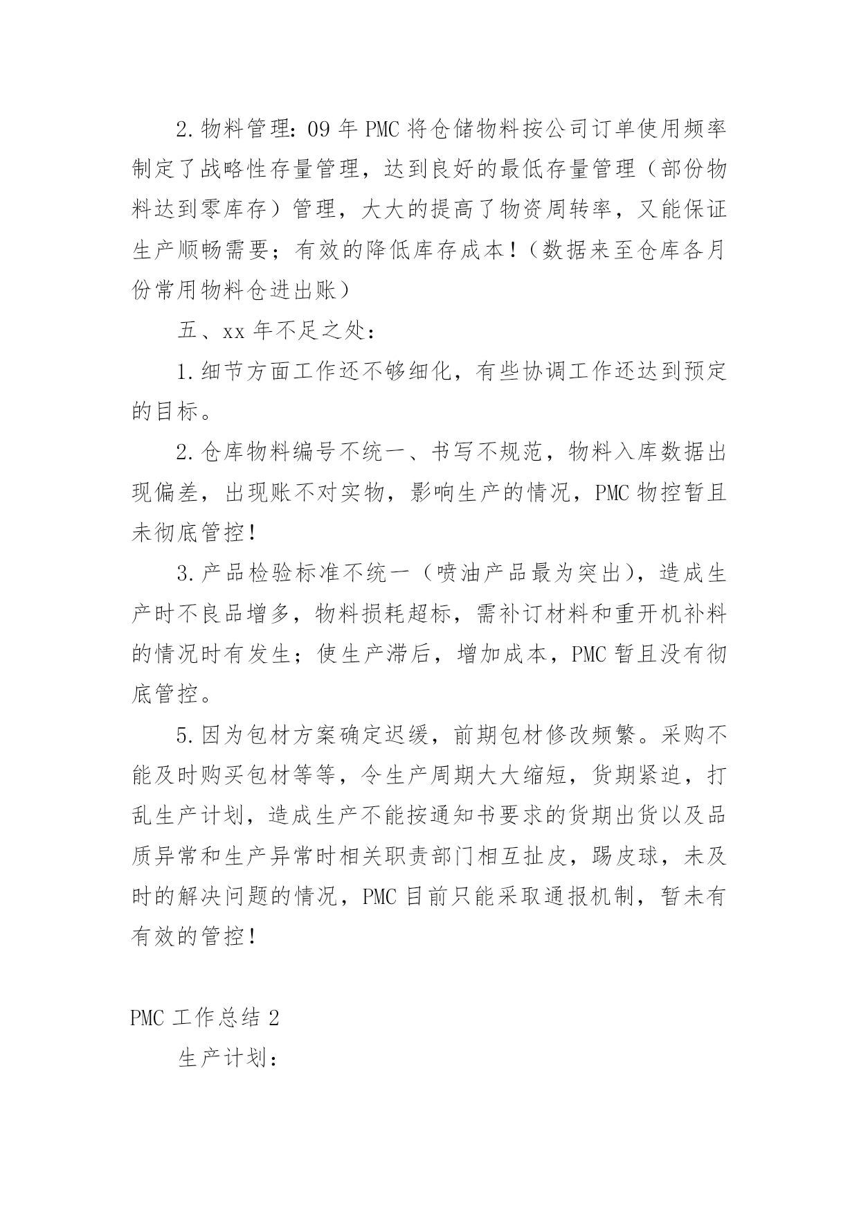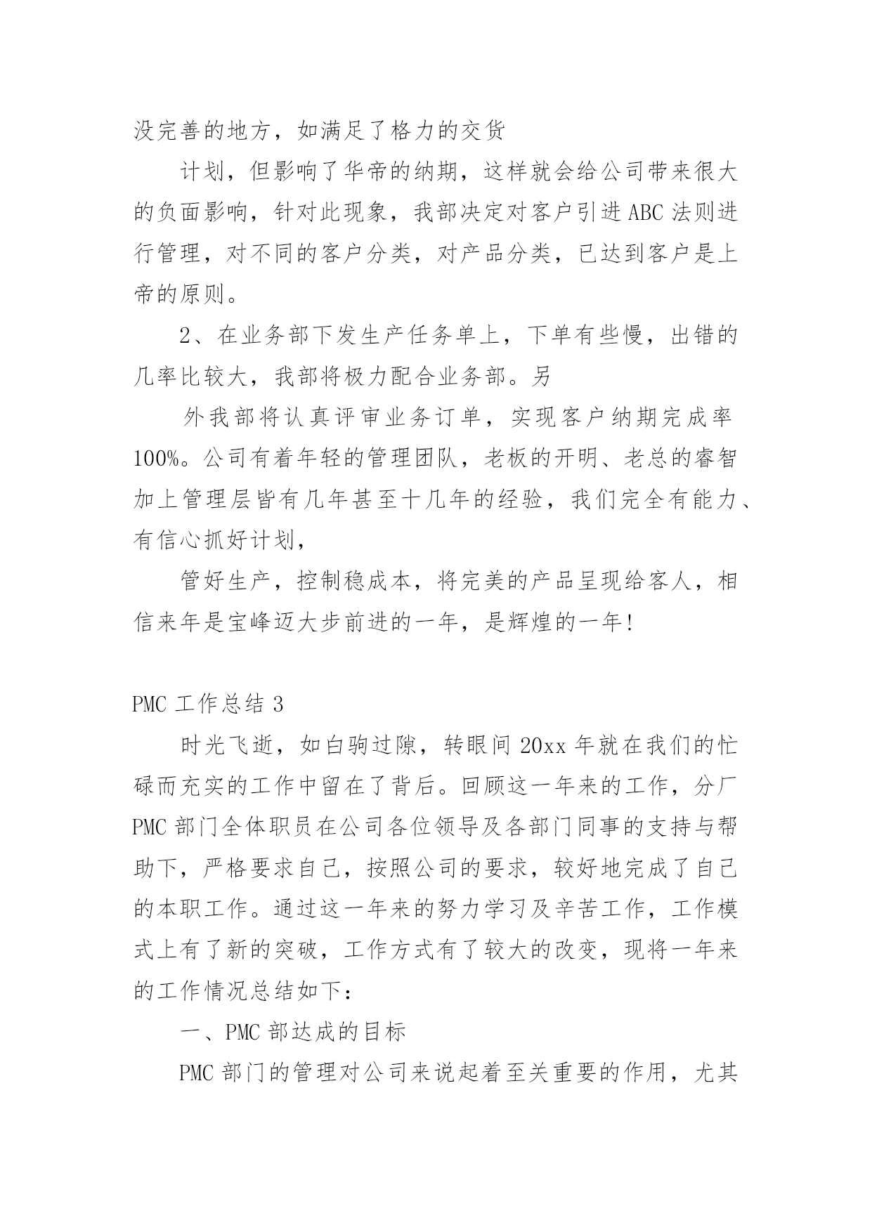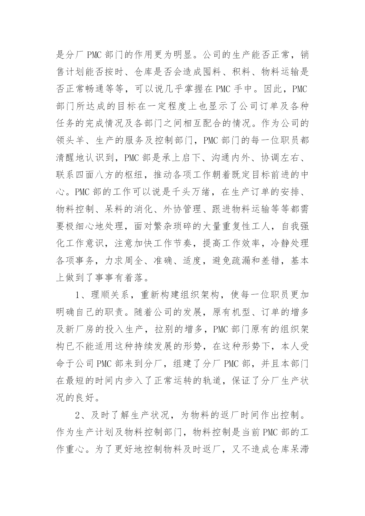 PMC工作总结总结是指对某一阶段的工作、学习或思想中的经验或情况进行分析研究,做出带有规律性结论的书面材料,它可以帮助我们有寻找学习和工作中的规律,不如我们来制定一份总结吧。如何把总结做到重点突出呢?下面是小编为大家整理的PMC工作总结,仅供参考,欢迎大家阅读。PMC工作总结1转眼间20xx年就在我们的忙碌而充实的工作中留在了背后。回顾这一年来的工作,PMC部门在公司领导及各部门同事的支持下,严格要求自己,按照公司的要求,较好地完成了部门的本职工作。通过这一年来的不断改善及辛苦工作,工作模式上有了新的突破,工作方式有了较大的改变,各方面均取得了一定的进步;现将一年来的工作情况总结如下:一、目标的达成、生产计划和产量控制:PMC部门的管理对公司来说起着至关重要的作用,公司的生产能否正常,销售计划能否按时、仓库是否会造成囤料、积料、物流是否正常畅通等等,可以说几乎掌握在PMC手中。因此,PMC部门所达成的目标在一定程度上也显示了公司订单及各种任务的完成情况及各部门之间相互配合的情况。作为公司的领头羊、生产的服务及控制部门,PMC部门清醒地认识到,PMC部是承上启下、沟通内外、协调左右、联系四面八方的枢纽,推动各项工作朝着既定目标前进的中心。PMC部的工作可以说是千头万绪,在生产订单的安排、物料控制、呆料的消化、外协管理、跟进物料等等都需要极细心地处理,面对繁杂琐碎的大量重复性工作,自我强化工作意识,注意加快工作节奏,提高工作效率,冷静处理各项事务,力求周全、准确、适度,大局为重,避免疏漏和差错,基本上做到了事事有着落,但也存在细节方面的一些不足的地方。1.20xx年市场和客户的需求发生了根本性的变化,从少品种,大批量订单转变为多品种、少批量,快交期订单和喷油产品;原有机型、订单的增多及新厂房的投入生产,PMC部门原有的组织架构已不能适用这种持续发展的形势,在这种形势下,PMC工作模式上有了新的突破,工作方式有了较大的改变,通过不断改善及辛苦工作;PMC部,并且本部门在最短的时间内步入了正常运转的轨道,保证了生产状况的良好。2.PMC针对09年公司的“人、机、料、法、环”生产要素进行针对性的分析、评估,根据生产线各组的优点情况制定相应措施和生产计划排程,采用拉动式生产计划,所有物流在前面跑,命令由后向前发出,各相关部门积极处理异常,解决问题;09年在试行阶段,有相当大的收获,在20xx年PMC还要进行细化和制定一些控制手段和流程。09年公司订单波动大和周期短的情况下,生产作息有序,产量有保证和上升,PMC的计划和协调各部门作战发挥了很大的作用,已能够适应目前和往后的发展!二、xx年的PMC有效的改善工作:1.制定了生产通知书货期监控和通报机制:当订单因生产、物料或待确认问题不能按期完成时,以《生产异常通知单》通报业务部和责任单位以及相关部门,并要求责任单位作出临时和预防的纠正措施。保证了订单相关进度的按期进行和信息反馈!2.生产物料管制规定:09年生产物料不够流畅,车间交接数量不准确和不按时到位,;12月份PMC针对此问题,在副总的指导下,制定了《生产物料管制规定》。通过对采购、仓库、生产物料员管理物料作出规定,以生产线正常开拉为重点,对物料进行管控,明确各方的职责,提高采购和车间上工序交货准时率,减少断料;提高产量,取得一定的成效!3.针对12月份出现仓库物料被偷窃事件,编制《仓库物料安全管理和通报机制》。以及物控系统改革方案,保证生产物料及时供应和库存的有效管理:仓库由“PMC物控”控制仓库物料按订单进、出、存放和代替使用的管制并负责对仓管员日常工作和盘点的培训和监控,以及账目修改的审核监控和上报。“仓库主管”负责人事行政和单据核对等财务信息的审核,账目修改核对和上报4.订单首件样板制造单:09年订单上线生产后经常会出现各种各类的异常情况,严重影响到生产线的效率和产量;PMC在12月制定并实施了《订单首件样板制造单》:由PMC按生产需求,用《订单首件样板制造单》安排IE.PE组限时提前制作首件样板,检讨订单的制造可行性,防止产品在上线批量生产时出现异常问题,杜绝隐患,使生产时更畅顺,效果显著!5.货期和物料监控措施:为了保证按时交货,更好地控制物料及时回厂,以不造成仓库呆滞料,减少车间停工待料,提高生产效率,保证按时交货09年。PMC经公司委派外训课程后,在09年10月提出>按颜色目视管理模式管理订单货期,现由业务部改为《生产订单数据表》以保证按生产通知书要求日期内完成交货;方案内容:由业务部牵头制作订单交期进度管控表发布在内网上信息共享;采购部负责更新物料采购进度,PMC可根据此数据表中的综合信息进行统筹安排生产部门按时完成,及时性将生产信息反馈到业务部及上级领导!三、20xx年生产产量表:附表20xx年生产达成率表:附表