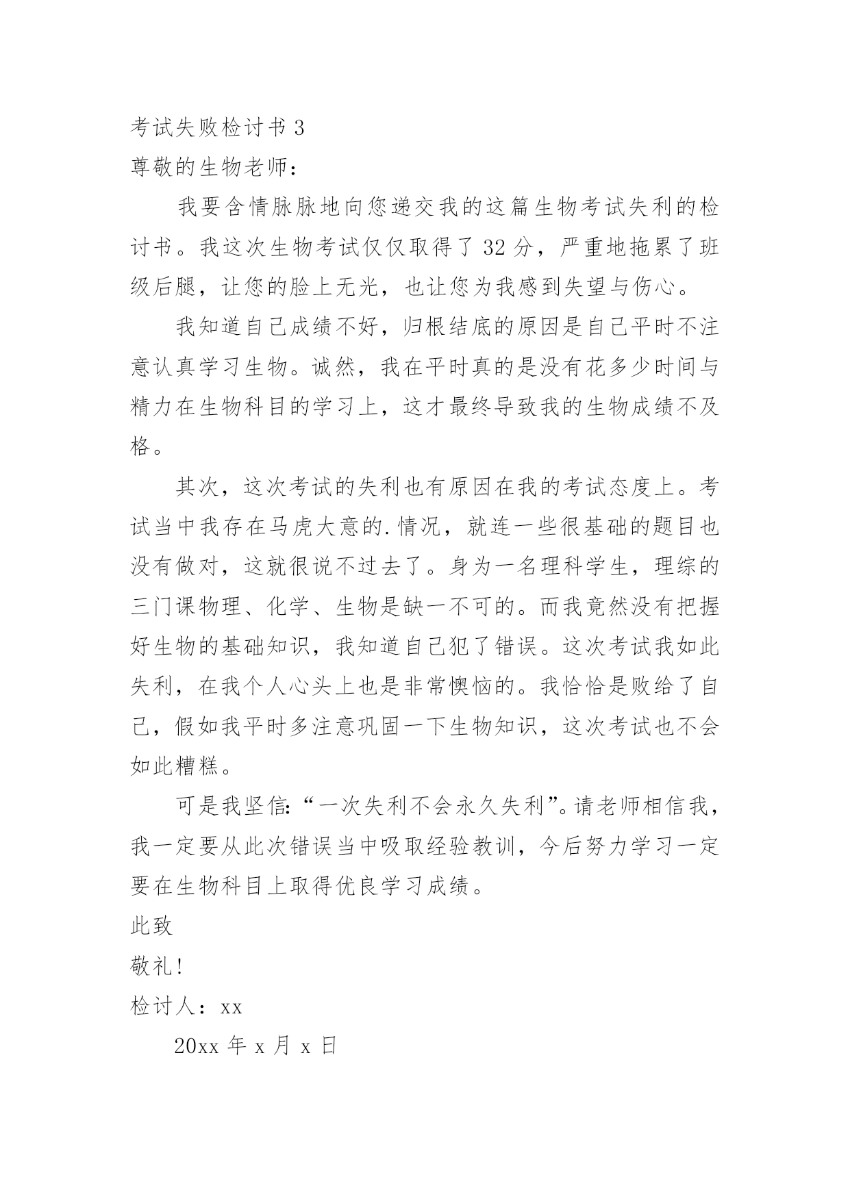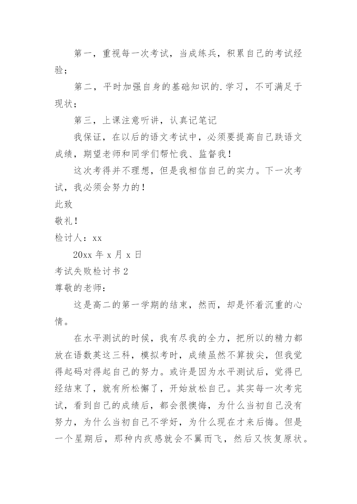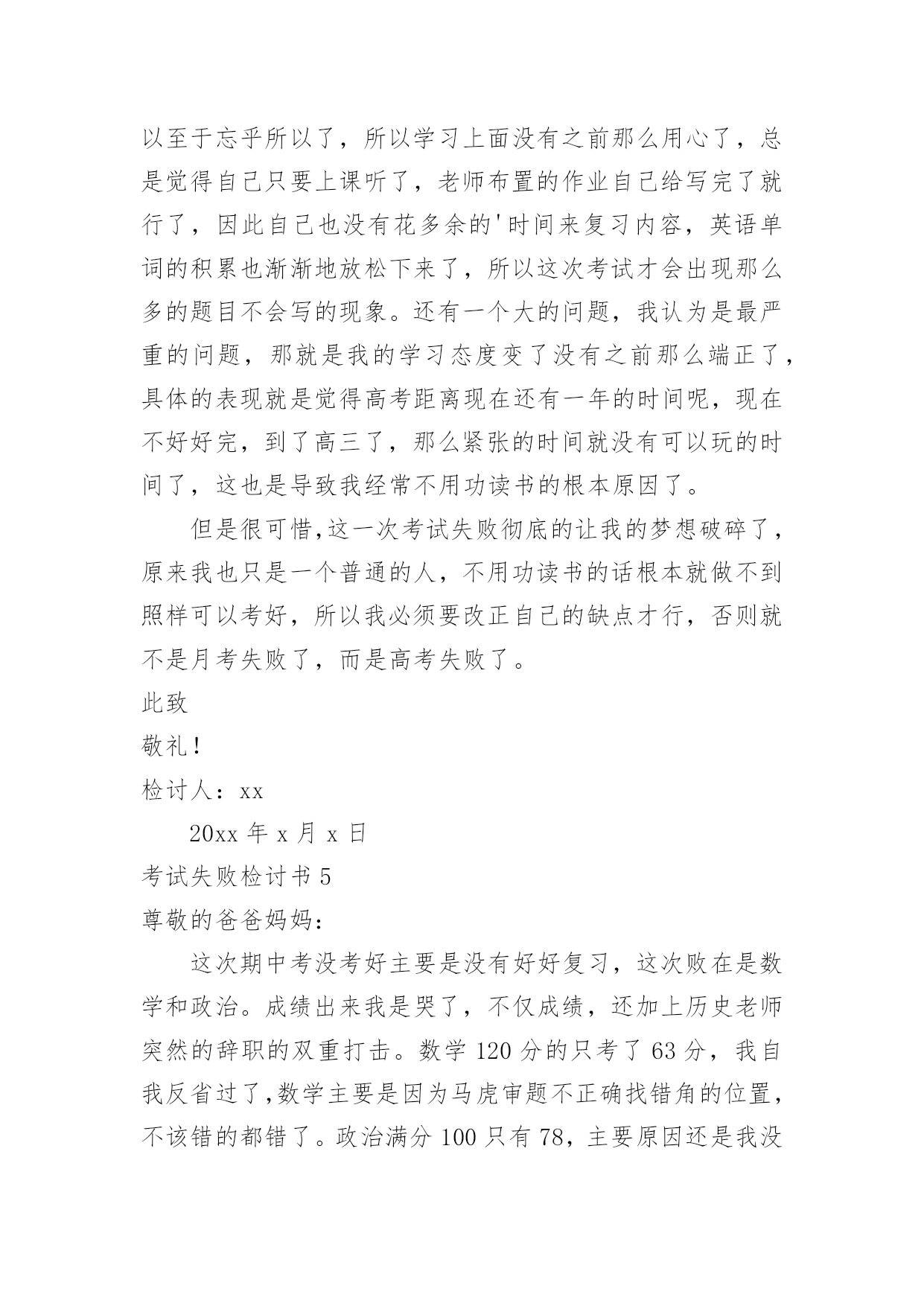 考试失败检讨书考试失败检讨书在学习、工作、生活中犯错误以后,需要写检讨书来好好地检讨,请注意写检讨书要注意正确的格式。其实很多朋友都不知道怎么写检讨书吧!以下是小编为大家整理的考试失败检讨书,仅供参考,欢迎大家阅读。考试失败检讨书1尊敬的老师:您好!我叫xxx,在xx次考试中,我考了分,全班平均分是分,最高分是,我的分数比最高分差分,比平均分差分,在班里位居xx名。综合分析,此次考试存在以下问题:第一,思想不重视。认为这次考试是小考,没有好处,对付对付就完了。但是正是我轻视的思想造成了此次考试不好的结果。平时我的语文成绩不错,在班里居中上游。第二,从此次考试中,发现自己的基础知识不扎实。在基础知识项目被扣分,占全部被扣分数的%。原以为自己的基础知识扎实,其实不然,给自己敲了警钟。第三,从考试中,发现自己上课没有集中精神听老师讲课。因为很多老师讲的资料出此刻考试中,而自己没有听讲,所以不会。由以上几点,我决定在今后的学习中,做到:第一,重视每一次考试,当成练兵,积累自己的考试经验;第二,平时加强自身的基础知识的.学习,不可满足于现状;第三,上课注意听讲,认真记笔记我保证,在以后的语文考试中,必须要提高自己跌语文成绩,期望老师和同学们帮忙我、监督我!这次考得并不理想,但是我相信自己的实力。下一次考试,我必须会努力的!此致敬礼!检讨人:xx20xx年x月x日考试失败检讨书2尊敬的老师:这是高二的第一学期的结束,然而,却是怀着沉重的心情。在水平测试的时候,我有尽我的全力,把所以的精力都放在语数英这三科,模拟考时,成绩虽然不算拔尖,但我觉得起码对得起自己的努力。或许是因为水平测试后,觉得已经结束了,就有所松懈了,开始放松自己。其实每一次考完试,看到自己的成绩后,都会很懊悔,为什么当初自己没有努力,为什么当初自己不学好,为什么现在才来后悔。但是一个星期后,那种内疚感就会不翼而飞,然后又恢复原状。高一升上来的时候,全级二百多,然后就一直退,六百多,一千零几,一千四百几。上了高二,我有努力,但是我的努力并没有得到回报,对我来说,是一种打击。有人问,我们班有没有人作弊,别人都会很爽快地回答,有,多的很!其实作弊的人应该不少吧,但是被发现了又会怎么样,也不会向上级报告,只会对他进行口头上的`教育。也对,毕竟关系到标兵班文明班的评选吧。但我会觉得很不公平,为什么努力的,得不到回报,而那些不做作业,不听课,每天在玩手机的,却可以进步。在初中时,一直都很注重成绩,每天都不停地背,不停地学,我不是一个聪明的人,所以我可以做的,也只有这种读书的方法。但是这种学习方法仿佛并不适合如今九科的学习。每一科都那么重要,真的不知道怎样才能真正地分配好,怎样才能真正地学好。我成绩差,归根到底是自己不努力,不能怪别人。平时我都会放大部分时间在语文,英语,历史上,但这一次考试成绩都并不理想。考试时的状态也很重要吧。这一次期末考,应该是谷底了,我不知道,下一次我的努力,会不会得到应有的回报,希望会有吧,但是我不会放弃,找回初中时的那一份冲劲,应该不难吧。特此,敬礼!检讨人:xx20xx年x月x日考试失败检讨书3尊敬的生物老师:我要含情脉脉地向您递交我的这篇生物考试失利的检讨书。我这次生物考试仅仅取得了32分,严重地拖累了班级后腿,让您的脸上无光,也让您为我感到失望与伤心。我知道自己成绩不好,归根结底的原因是自己平时不注意认真学习生物。诚然,我在平时真的是没有花多少时间与精力在生物科目的学习上,这才最终导致我的生物成绩不及格。其次,这次考试的失利也有原因在我的考试态度上。考试当中我存在马虎大意的.情况,就连一些很基础的题目也没有做对,这就很说不过去了。身为一名理科学生,理综的三门课物理、化学、生物是缺一不可的。而我竟然没有把握好生物的基础知识,我知道自己犯了错误。这次考试我如此失利,在我个人心头上也是非常懊恼的。我恰恰是败给了自己,假如我平时多注意巩固一下生物知识,这次考试也不会如此糟糕。可是我坚信:“一次失利不会永久失利”。请老师相信我,我一定要从此次错误当中吸取经验教训,今后努力学习一定要在生物科目上取得优良学习成绩。此致敬礼!检讨人:xx20xx年x月x日考试失败检讨书4尊敬的老师:您好!从到大,我们受到的教育就是要好好学习,只有学习用功了,后面才能够上一个好一点的大学,这样子将来出来工作了才可以更加的轻松,不至于争取做一个又苦又累的工作,所以无论是家长还是老师都是在这样子的严格要求着我们每一个学生,我们身为学生经过这么多年的读书学习也应该懂得这个道理。这次的考试失败虽然并不能说自己的学习有没有用工,但是至少可以反映自己在学习上面是出现了一些状况的,只能为数学老师说的那样,只要上课认真听课了并且弄懂了,不要求做什么难的题目,但是少前面九十分都是可以拿到得,因为那些都
