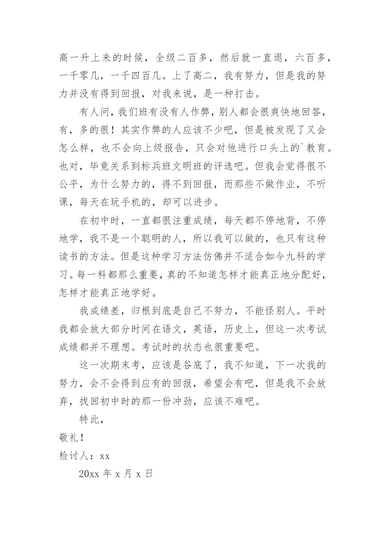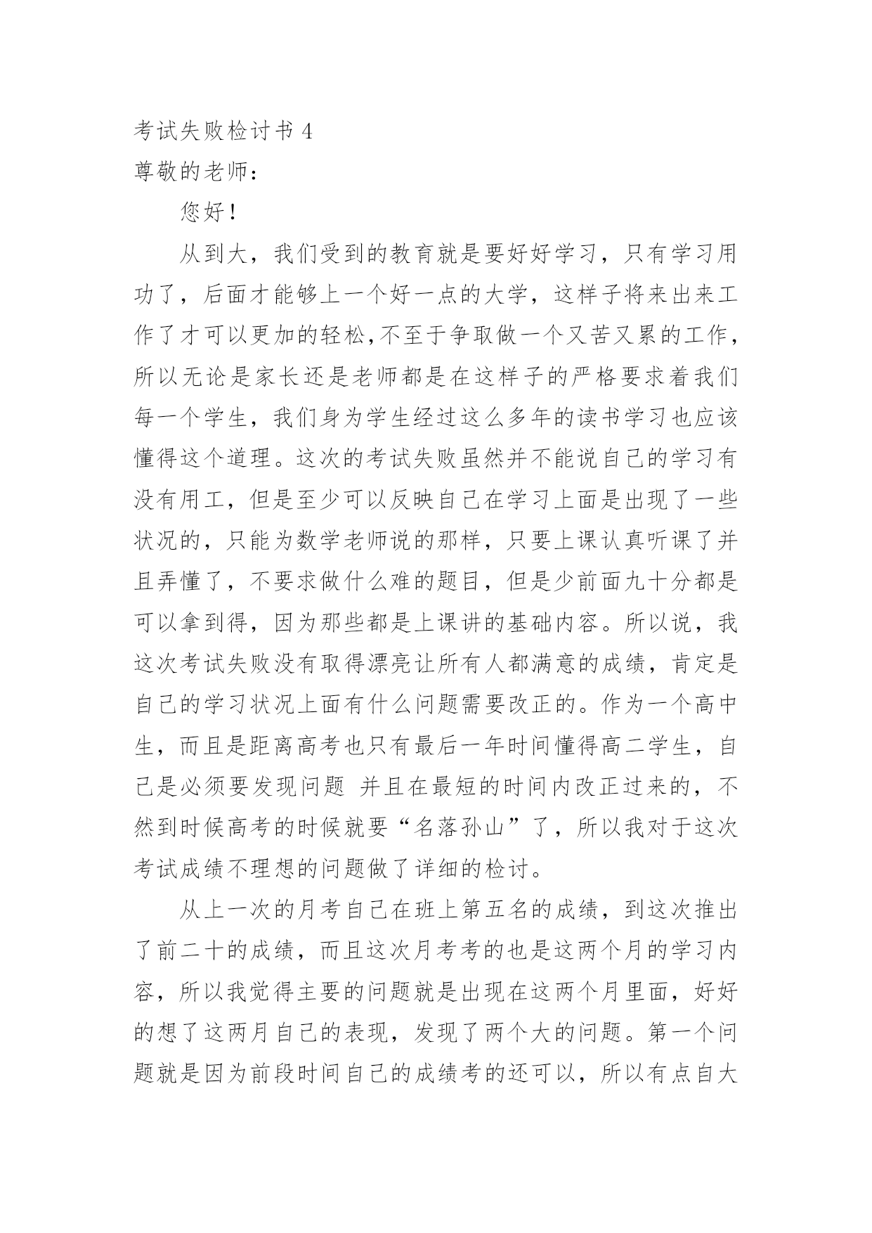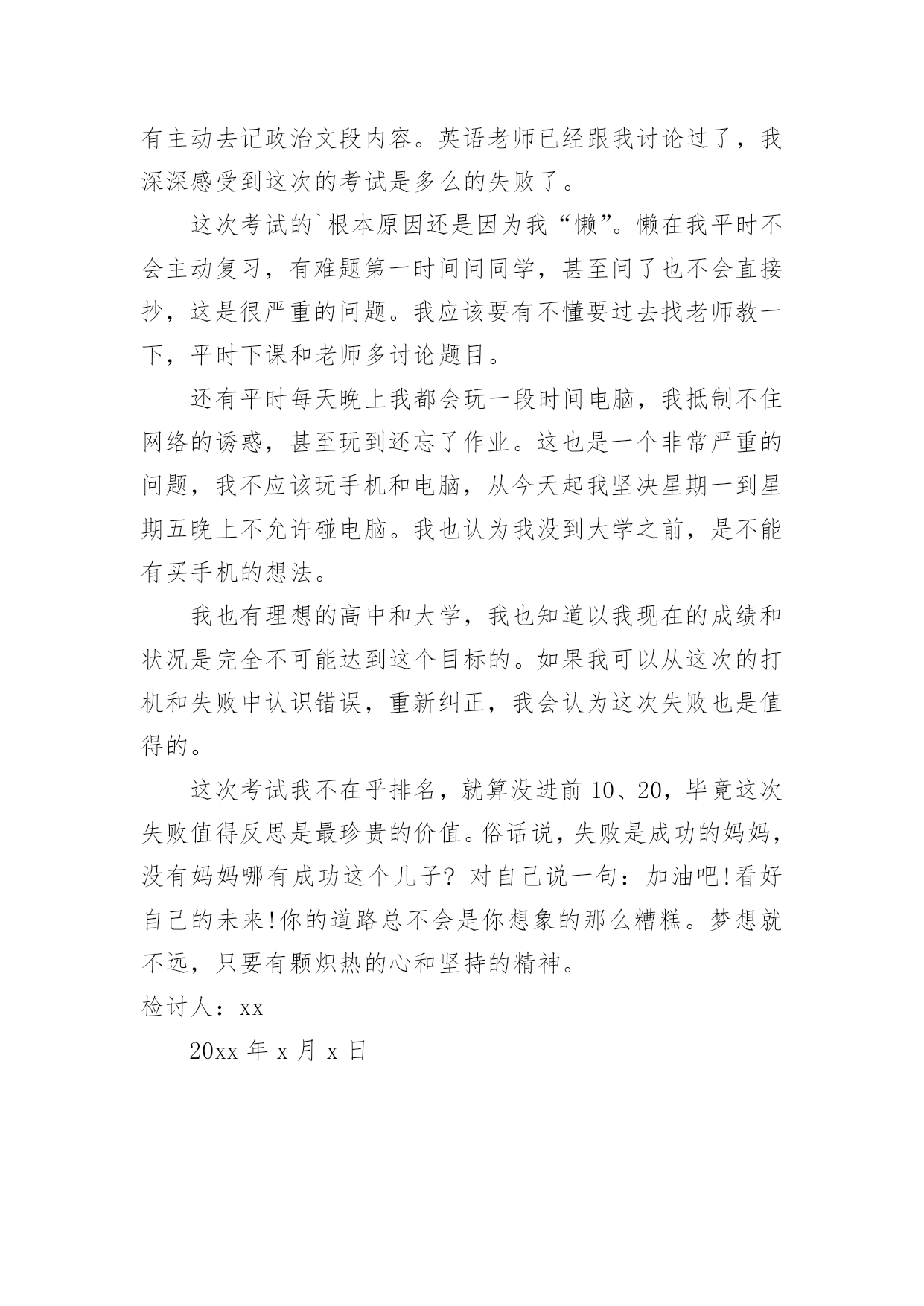 考试失败检讨书考试失败检讨书在学习、工作、生活中犯错误以后,需要写检讨书来好好地检讨,请注意写检讨书要注意正确的格式。其实很多朋友都不知道怎么写检讨书吧!以下是小编为大家整理的考试失败检讨书,仅供参考,欢迎大家阅读。考试失败检讨书1尊敬的老师:您好!我叫xxx,在xx次考试中,我考了分,全班平均分是分,最高分是,我的分数比最高分差分,比平均分差分,在班里位居xx名。综合分析,此次考试存在以下问题:第一,思想不重视。认为这次考试是小考,没有好处,对付对付就完了。但是正是我轻视的思想造成了此次考试不好的结果。平时我的语文成绩不错,在班里居中上游。第二,从此次考试中,发现自己的基础知识不扎实。在基础知识项目被扣分,占全部被扣分数的%。原以为自己的基础知识扎实,其实不然,给自己敲了警钟。第三,从考试中,发现自己上课没有集中精神听老师讲课。因为很多老师讲的资料出此刻考试中,而自己没有听讲,所以不会。由以上几点,我决定在今后的学习中,做到:第一,重视每一次考试,当成练兵,积累自己的考试经验;第二,平时加强自身的基础知识的.学习,不可满足于现状;第三,上课注意听讲,认真记笔记我保证,在以后的语文考试中,必须要提高自己跌语文成绩,期望老师和同学们帮忙我、监督我!这次考得并不理想,但是我相信自己的实力。下一次考试,我必须会努力的!此致敬礼!检讨人:xx20xx年x月x日考试失败检讨书2尊敬的老师:这是高二的第一学期的结束,然而,却是怀着沉重的心情。在水平测试的时候,我有尽我的全力,把所以的精力都放在语数英这三科,模拟考时,成绩虽然不算拔尖,但我觉得起码对得起自己的努力。或许是因为水平测试后,觉得已经结束了,就有所松懈了,开始放松自己。其实每一次考完试,看到自己的成绩后,都会很懊悔,为什么当初自己没有努力,为什么当初自己不学好,为什么现在才来后悔。但是一个星期后,那种内疚感就会不翼而飞,然后又恢复原状。高一升上来的时候,全级二百多,然后就一直退,六百多,一千零几,一千四百几。上了高二,我有努力,但是我的努力并没有得到回报,对我来说,是一种打击。有人问,我们班有没有人作弊,别人都会很爽快地回答,有,多的很!其实作弊的人应该不少吧,但是被发现了又会怎么样,也不会向上级报告,只会对他进行口头上的`教育。也对,毕竟关系到标兵班文明班的评选吧。但我会觉得很不公平,为什么努力的,得不到回报,而那些不做作业,不听课,每天在玩手机的,却可以进步。在初中时,一直都很注重成绩,每天都不停地背,不停地学,我不是一个聪明的人,所以我可以做的,也只有这种读书的方法。但是这种学习方法仿佛并不适合如今九科的学习。每一科都那么重要,真的不知道怎样才能真正地分配好,怎样才能真正地学好。我成绩差,归根到底是自己不努力,不能怪别人。平时我都会放大部分时间在语文,英语,历史上,但这一次考试成绩都并不理想。考试时的状态也很重要吧。这一次期末考,应该是谷底了,我不知道,下一次我的努力,会不会得到应有的回报,希望会有吧,但是我不会放弃,找回初中时的那一份冲劲,应该不难吧。特此,敬礼!检讨人:xx20xx年x月x日考试失败检讨书3尊敬的生物老师:我要含情脉脉地向您递交我的这篇生物考试失利的检讨书。我这次生物考试仅仅取得了32分,严重地拖累了班级后腿,让您的脸上无光,也让您为我感到失望与伤心。我知道自己成绩不好,归根结底的原因是自己平时不注意认真学习生物。诚然,我在平时真的是没有花多少时间与精力在生物科目的学习上,这才最终导致我的生物成绩不及格。其次,这次考试的失利也有原因在我的考试态度上。考试当中我存在马虎大意的.情况,就连一些很基础的题目也没有做对,这就很说不过去了。身为一名理科学生,理综的三门课物理、化学、生物是缺一不可的。而我竟然没有把握好生物的基础知识,我知道自己犯了错误。这次考试我如此失利,在我个人心头上也是非常懊恼的。我恰恰是败给了自己,假如我平时多注意巩固一下生物知识,这次考试也不会如此糟糕。可是我坚信:“一次失利不会永久失利”。请老师相信我,我一定要从此次错误当中吸取经验教训,今后努力学习一定要在生物科目上取得优良学习成绩。此致敬礼!检讨人:xx20xx年x月x日考试失败检讨书4尊敬的老师:您好!从到大,我们受到的教育就是要好好学习,只有学习用功了,后面才能够上一个好一点的大学,这样子将来出来工作了才可以更加的轻松,不至于争取做一个又苦又累的工作,所以无论是家长还是老师都是在这样子的严格要求着我们每一个学生,我们身为学生经过这么多年的读书学习也应该懂得这个道理。这次的考试失败虽然并不能说自己的学习有没有用工,但是至少可以反映自己在学习上面是出现了一些状况的,只能为数学老师说的那样,只要上课认真听课了并且弄懂了,不要求做什么难的题目,但是少前面九十分都是可以拿到得,因为那些都