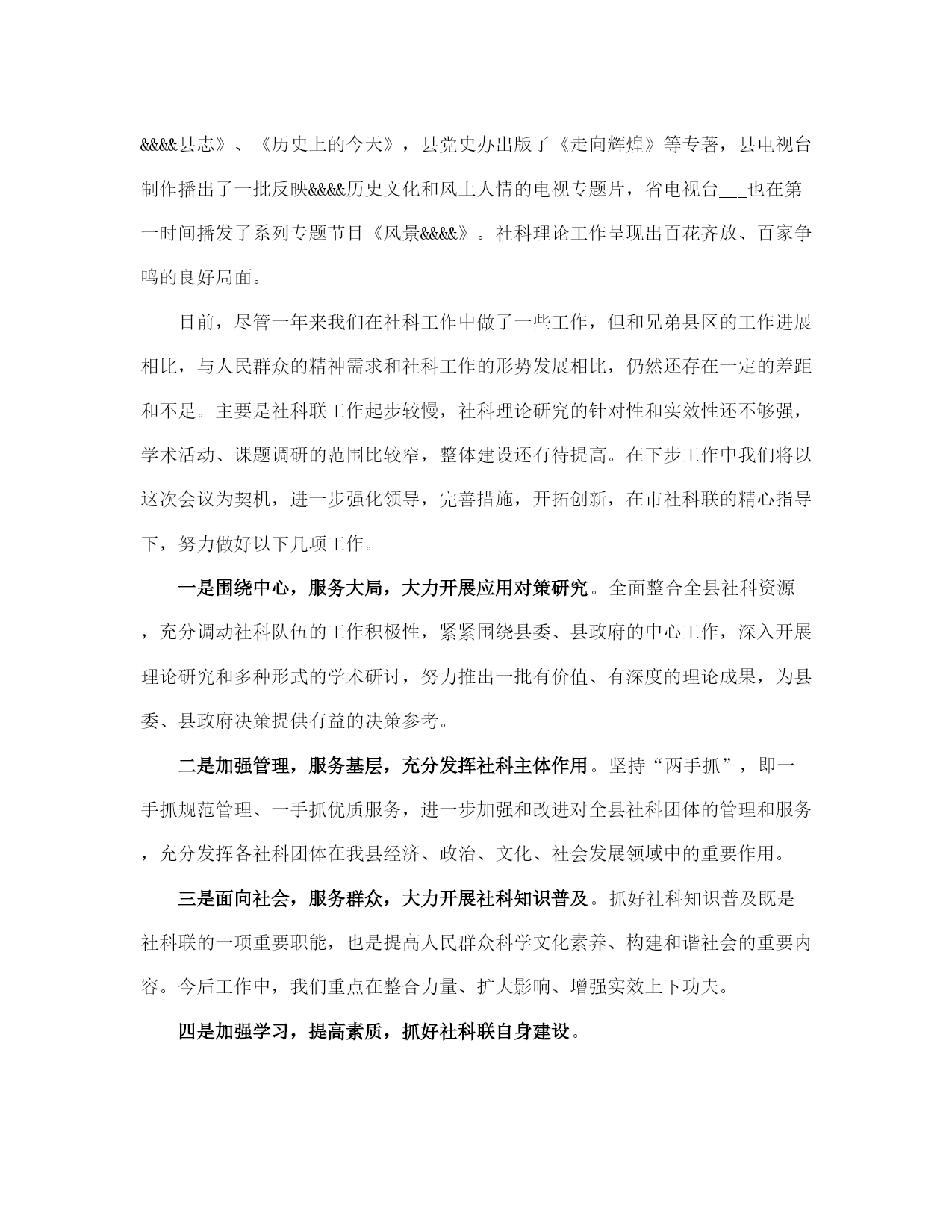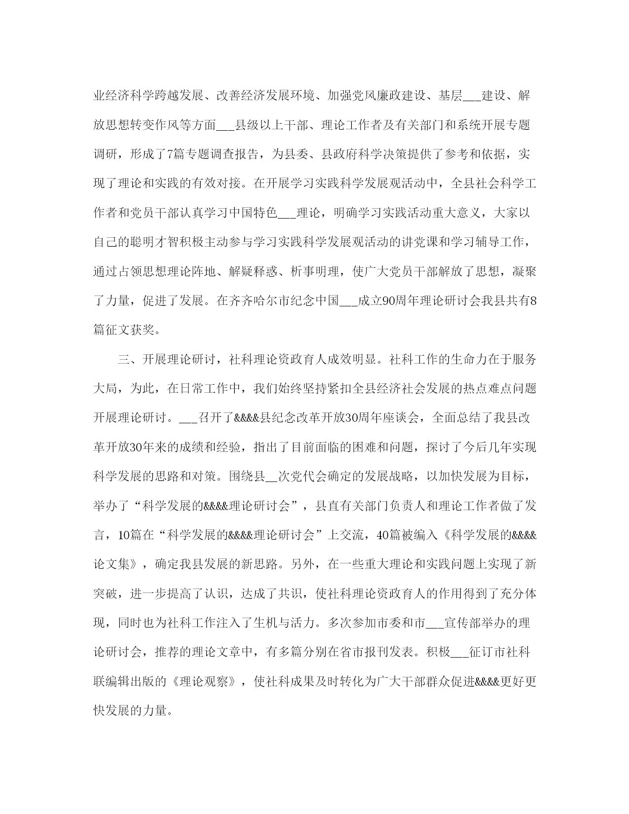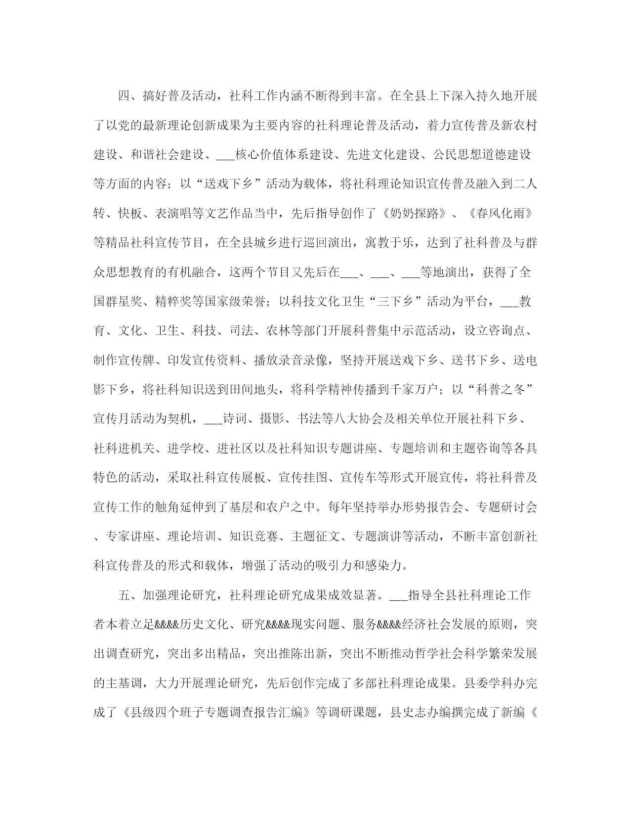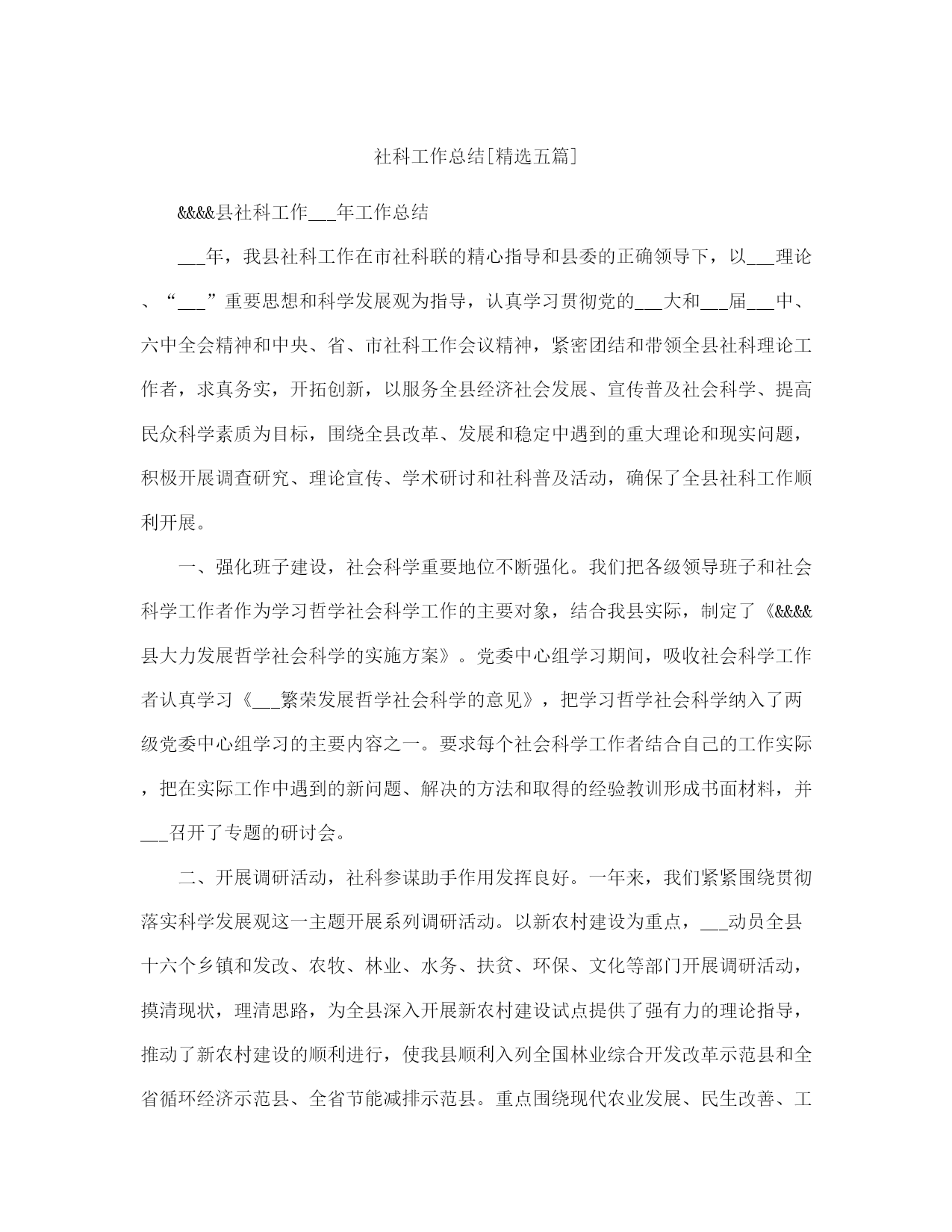 社科工作总结(完整版)文档资料可直接使用,可编辑,欢迎下载社科工作总结[精选五篇]&&&&县社科工作___年工作总结___年,我县社科工作在市社科联的精心指导和县委的正确领导下,以___理论、“___”重要思想和科学发展观为指导,认真学习贯彻党的___大和___届___中、六中全会精神和中央、省、市社科工作会议精神,紧密团结和带领全县社科理论工作者,求真务实,开拓创新,以服务全县经济社会发展、宣传普及社会科学、提高民众科学素质为目标,围绕全县改革、发展和稳定中遇到的重大理论和现实问题,积极开展调查研究、理论宣传、学术研讨和社科普及活动,确保了全县社科工作顺利开展。一、强化班子建设,社会科学重要地位不断强化。我们把各级领导班子和社会科学工作者作为学习哲学社会科学工作的主要对象,结合我县实际,制定了《&&&&县大力发展哲学社会科学的实施方案》。党委中心组学习期间,吸收社会科学工作者认真学习《___繁荣发展哲学社会科学的意见》,把学习哲学社会科学纳入了两级党委中心组学习的主要内容之一。要求每个社会科学工作者结合自己的工作实际,把在实际工作中遇到的新问题、解决的方法和取得的经验教训形成书面材料,并___召开了专题的研讨会。二、开展调研活动,社科参谋助手作用发挥良好。一年来,我们紧紧围绕贯彻落实科学发展观这一主题开展系列调研活动。以新农村建设为重点,___动员全县十六个乡镇和发改、农牧、林业、水务、扶贫、环保、文化等部门开展调研活动,摸清现状,理清思路,为全县深入开展新农村建设试点提供了强有力的理论指导,推动了新农村建设的顺利进行,使我县顺利入列全国林业综合开发改革示范县和全省循环经济示范县、全省节能减排示范县。重点围绕现代农业发展、民生改善、工业经济科学跨越发展、改善经济发展环境、加强党风廉政建设、基层___建设、解放思想转变作风等方面___县级以上干部、理论工作者及有关部门和系统开展专题调研,形成了7篇专题调查报告,为县委、县政府科学决策提供了参考和依据,实现了理论和实践的有效对接。在开展学习实践科学发展观活动中,全县社会科学工作者和党员干部认真学习中国特色___理论,明确学习实践活动重大意义,大家以自己的聪明才智积极主动参与学习实践科学发展观活动的讲党课和学习辅导工作,通过占领思想理论阵地、解疑释惑、析事明理,使广大党员干部解放了思想,凝聚了力量,促进了发展。在齐齐哈尔市纪念中国___成立90周年理论研讨会我县共有8篇征文获奖。三、开展理论研讨,社科理论资政育人成效明显。社科工作的生命力在于服务大局,为此,在日常工作中,我们始终坚持紧扣全县经济社会发展的热点难点问题开展理论研讨。___召开了&&&&县纪念改革开放30周年座谈会,全面总结了我县改革开放30年来的成绩和经验,指出了目前面临的困难和问题,探讨了今后几年实现科学发展的思路和对策。围绕县__次党代会确定的发展战略,以加快发展为目标,举办了“科学发展的&&&&理论研讨会”,县直有关部门负责人和理论工作者做了发言,10篇在“科学发展的&&&&理论研讨会”上交流,40篇被编入《科学发展的&&&&论文集》,确定我县发展的新思路。另外,在一些重大理论和实践问题上实现了新突破,进一步提高了认识,达成了共识,使社科理论资政育人的作用得到了充分体现,同时也为社科工作注入了生机与活力。多次参加市委和市___宣传部举办的理论研讨会,推荐的理论文章中,有多篇分别在省市报刊发表。积极___征订市社科联编辑出版的《理论观察》,使社科成果及时转化为广大干部群众促进&&&&更好更快发展的力量。四、搞好普及活动,社科工作内涵不断得到丰富。在全县上下深入持久地开展了以党的最新理论创新成果为主要内容的社科理论普及活动,着力宣传普及新农村建设、和谐社会建设、___核心价值体系建设、先进文化建设、公民思想道德建设等方面的内容;以“送戏下乡”活动为载体,将社科理论知识宣传普及融入到二人转、快板、表演唱等文艺作品当中,先后指导创作了《奶奶探路》、《春风化雨》等精品社科宣传节目,在全县城乡进行巡回演出,寓教于乐,达到了社科普及与群众思想教育的有机融合,这两个节目又先后在___、___、___等地演出,获得了全国群星奖、精粹奖等国家级荣誉;以科技文化卫生“三下乡”活动为平台,___教育、文化、卫生、科技、司法、农林等部门开展科普集中示范活动,设立咨询点、制作宣传牌、印发宣传资料、播放录音录像,坚持开展送戏下乡、送书下乡、送电影下乡,将社科知识送到田间地头,将科学精神传播到千家万户;以“科普之冬”宣传月活动为契机,___诗词、摄影、书法等八大协会及相关单位开展社科下乡、社科进机关、进学校、进社区以及社科知识专题讲座、专题培训和主题咨询等各具特色的活动,采取社科宣传展板、宣传挂图、宣传车等形式开展宣传,将社科