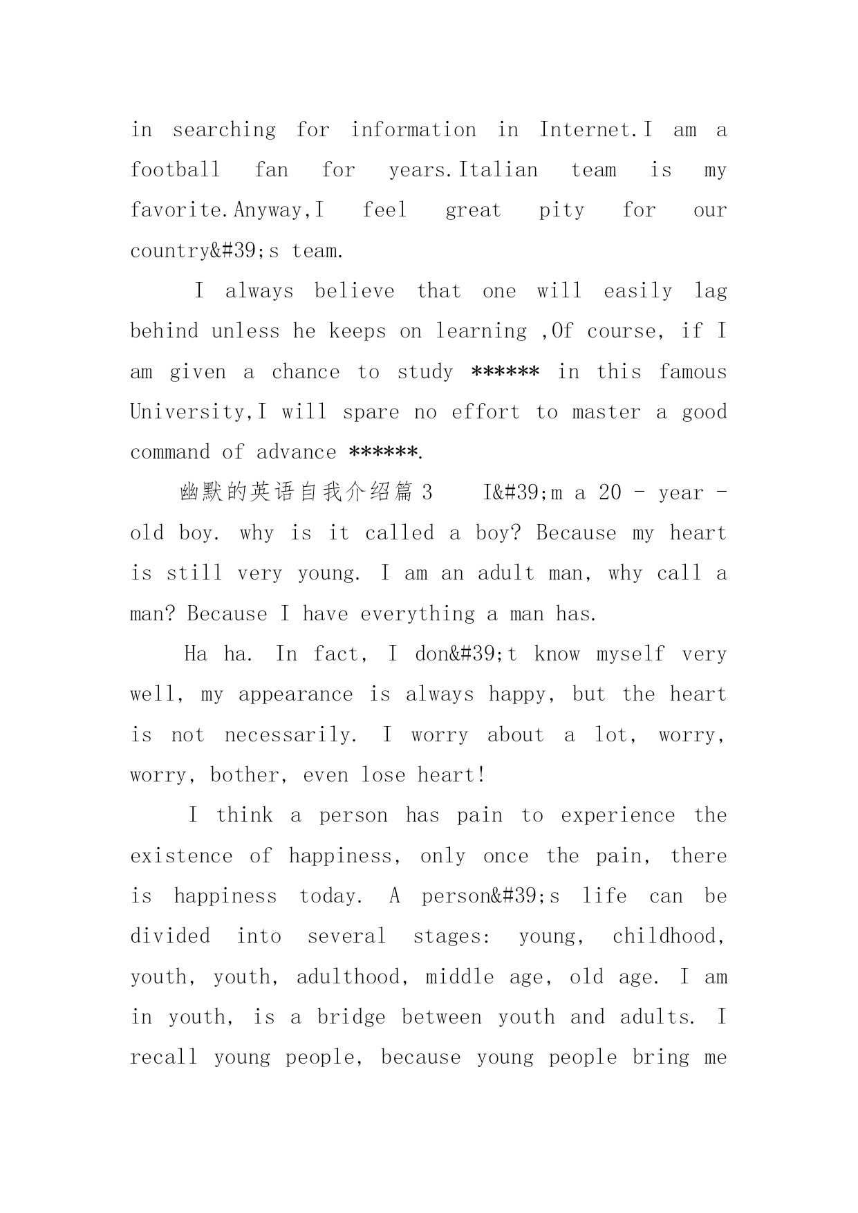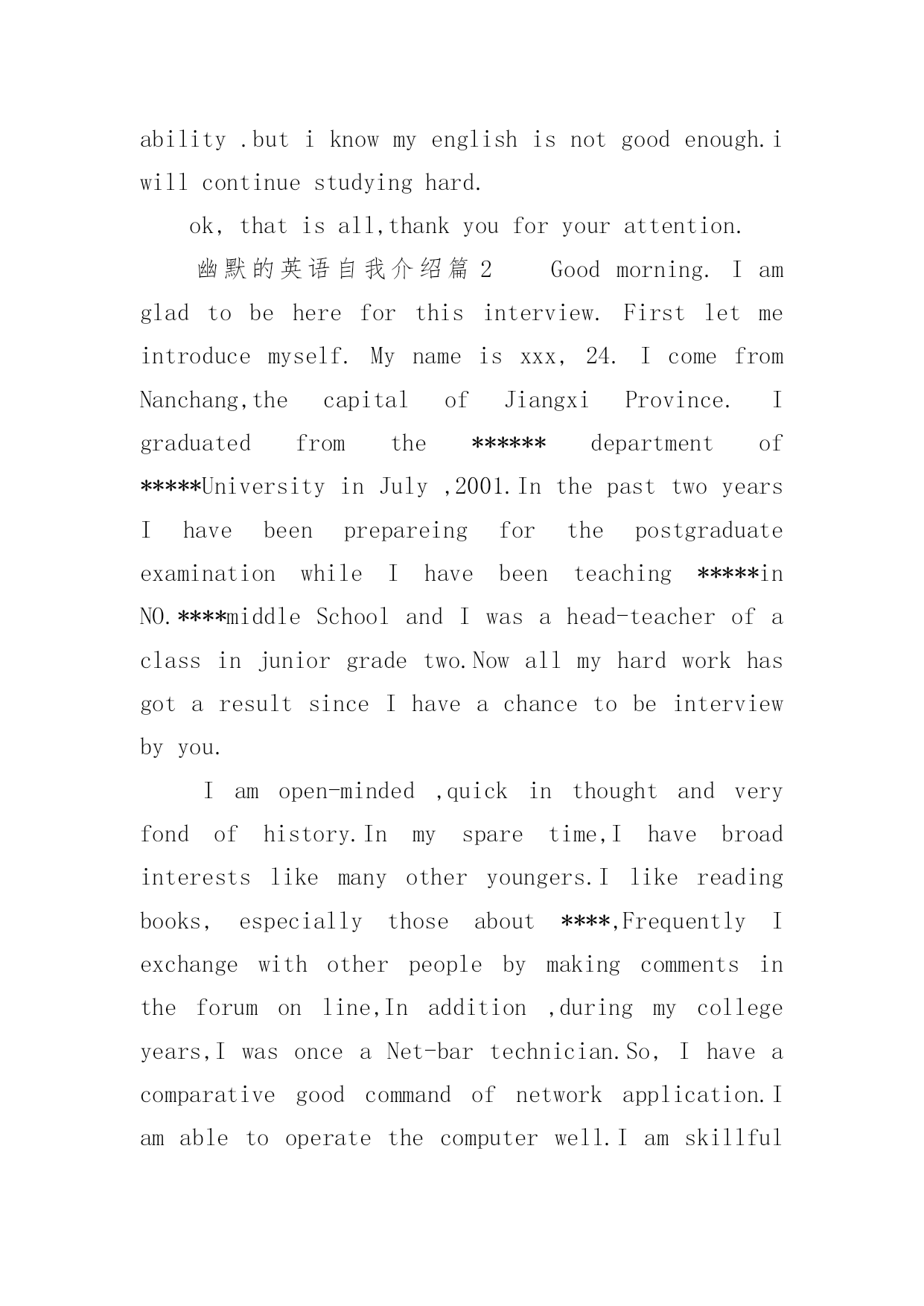幽默的英语自我介绍幽默的英语自我介绍不管我们身处那个场面都离不开自我介绍,这个也是一种社交交往的一种。因此,自我介绍显得非常的'重要。那么,如何做一个幽默的英语自我介绍呢?来看看吧!幽默的英语自我介绍篇1goodmorning/afternoon/evening,mynameisxxx.itisreallyagreathonortohavethisopportunity/chancetointroducemyself.generallyspeaking,iamahardworkingstudentespeciallydothethingiaminterestedin.iwilltrymybesttofinishitnomatterhowdifficultitis,furthermore,iamapersonwithgreatperserverence.duringthedayspreparingforthecolledge-entranceexamination,iinsistonrunningeveryday.nomatterwhattheweatherwaslike.andjustowningtothis,icouldconcentrateonmystudyandsucceededintheend.well,inmysparetime,ilikebasketball,tennisandchinesechess.andenglishismyfavoratesubject.ioftengotoenglishcornertopractisemyoralenglishoneverythursday,andwritecompositionstoimprovemywittenability.butiknowmyenglishisnotgoodenough.iwillcontinuestudyinghard.ok,thatisall,thankyouforyourattention.幽默的英语自我介绍篇2Goodmorning.Iamgladtobehereforthisinterview.Firstletmeintroducemyself.Mynameisxxx,24.IcomefromNanchang,thecapitalofJiangxiProvince.Igraduatedfromthe******departmentof*****UniversityinJuly,2001.InthepasttwoyearsIhavebeenprepareingforthepostgraduateexaminationwhileIhavebeenteaching*****inNO.****middleSchoolandIwasahead-teacherofaclassinjuniorgradetwo.NowallmyhardworkhasgotaresultsinceIhaveachancetobeinterviewbyyou.Iamopen-minded,quickinthoughtandveryfondofhistory.Inmysparetime,Ihavebroadinterestslikemanyotheryoungers.Ilikereadingbooks,especiallythoseabout****,FrequentlyIexchangewithotherpeoplebymakingcommentsintheforumonline,Inaddition,duringmycollegeyears,IwasonceaNet-bartechnician.So,Ihaveacomparativegoodcommandofnetworkapplication.Iamabletooperatethecomputerwell.IamskillfulinsearchingforinformationinInternet.Iamafootballfanforyears.Italianteamismyfavorite.Anyway,Ifeelgreatpityforourcountry'steam.Ialwaysbelievethatonewilleasilylagbehindunlesshekeepsonlearning,Ofcourse,ifIamgivenachancetostudy******inthisfamousUniversity,Iwillsparenoefforttomasteragoodcommandofadvance******.幽默的英语自我介绍篇3I'ma20-year-oldboy.whyisitc