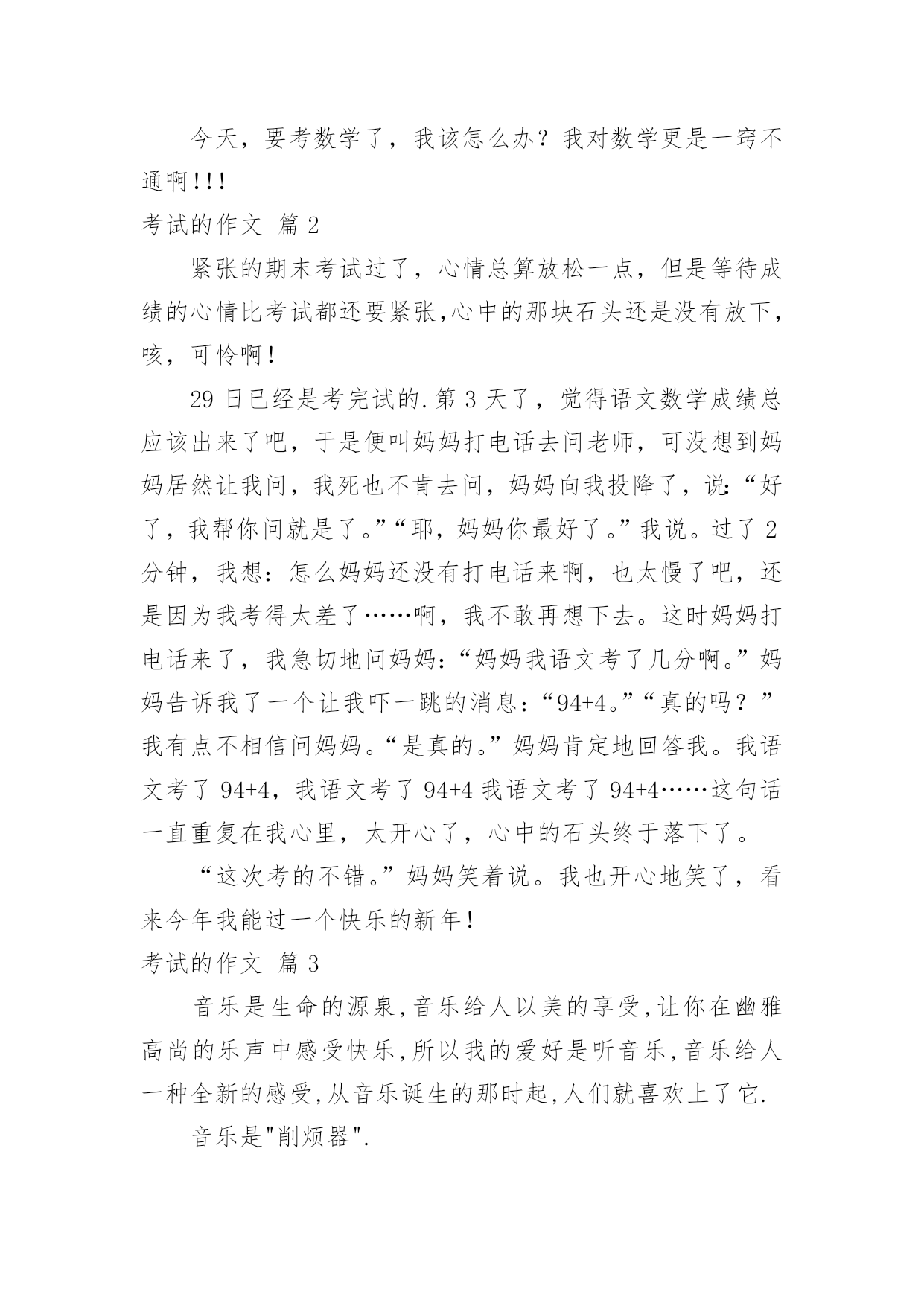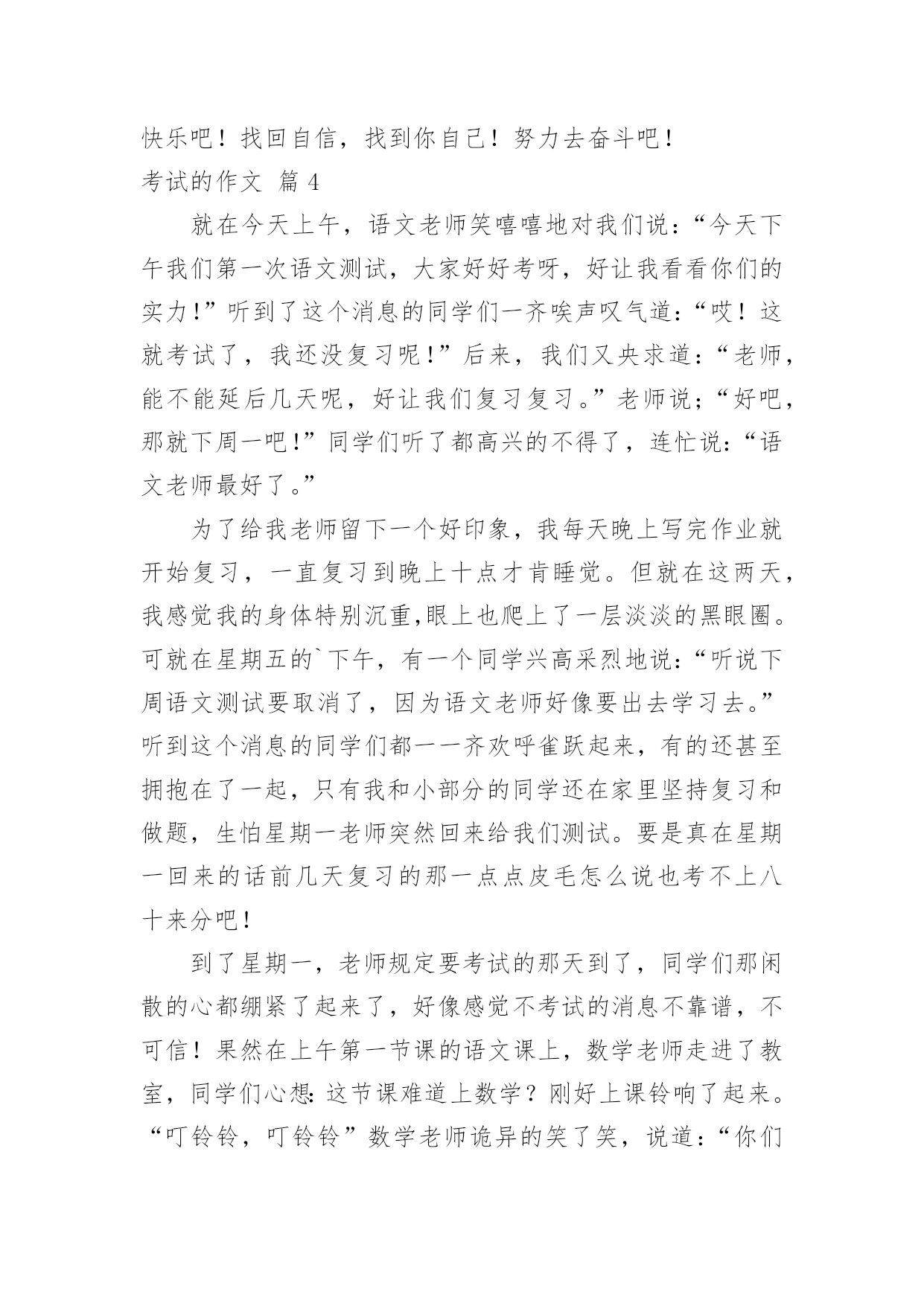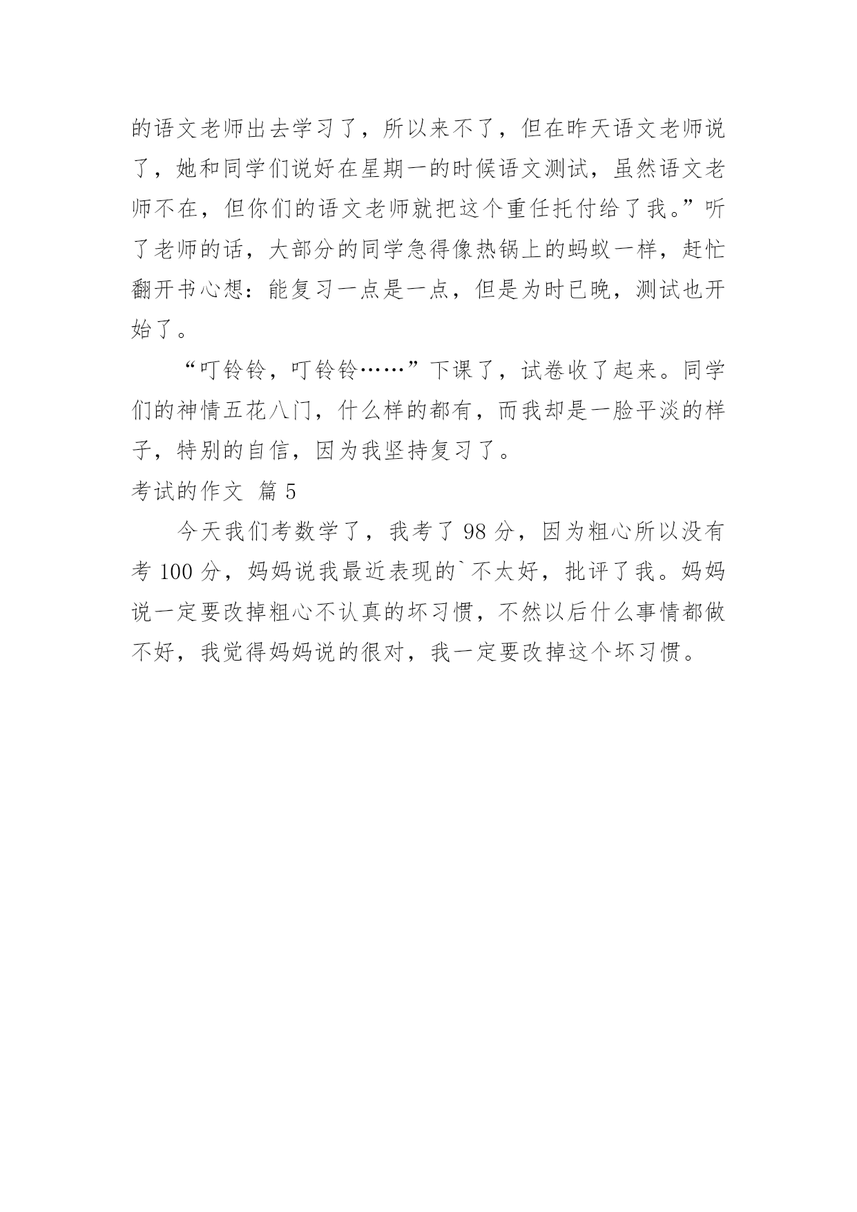 考试的作文考试的作文在平平淡淡的学习、工作、生活中,大家都不可避免地会接触到作文吧,作文是从内部言语向外部言语的过渡,即从经过压缩的简要的、自己能明白的语言,向开展的、具有规范语法结构的、能为他人所理解的外部语言形式的转化。作文的注意事项有许多,你确定会写吗?以下是小编为大家整理的考试的作文5篇,供大家参考借鉴,希望可以帮助到有需要的朋友。考试的作文篇14月17日-4月19日,是我校的期中考试的日子。我不怕小考,可是但凡这大考我都会让自己的心变得紧张焦躁,我这是……昨天,我怀着一颗扑通扑通直跳的心情,走进二号考场。语文卷子一发,便迫不及待的'写,1、2题我觉得很简单,便放松了自己的心情。可是,第3题的题目是短语的用法,我害怕急了——我对短语一窍不通。没办法,只有随自己的心走了,我选了“C”。考完试,我听到大部分人说的也是“C”,悬着的心落了下来。下午考英语。英语一直是我的强项,并且我又是英语课代表,所以应该没问题。果然,答完试卷,我顿时身心都放松了下来,虽然可能会有错题,但毕竟是少数吧!我这样想。今天,要考数学了,我该怎么办?我对数学更是一窍不通啊!!!考试的作文篇2紧张的期末考试过了,心情总算放松一点,但是等待成绩的心情比考试都还要紧张,心中的那块石头还是没有放下,咳,可怜啊!29日已经是考完试的.第3天了,觉得语文数学成绩总应该出来了吧,于是便叫妈妈打电话去问老师,可没想到妈妈居然让我问,我死也不肯去问,妈妈向我投降了,说:“好了,我帮你问就是了。”“耶,妈妈你最好了。”我说。过了2分钟,我想:怎么妈妈还没有打电话来啊,也太慢了吧,还是因为我考得太差了……啊,我不敢再想下去。这时妈妈打电话来了,我急切地问妈妈:“妈妈我语文考了几分啊。”妈妈告诉我了一个让我吓一跳的消息:“94+4。”“真的吗?”我有点不相信问妈妈。“是真的。”妈妈肯定地回答我。我语文考了94+4,我语文考了94+4我语文考了94+4……这句话一直重复在我心里,太开心了,心中的石头终于落下了。“这次考的不错。”妈妈笑着说。我也开心地笑了,看来今年我能过一个快乐的新年!考试的作文篇3音乐是生命的源泉,音乐给人以美的享受,让你在幽雅高尚的乐声中感受快乐,所以我的爱好是听音乐,音乐给人一种全新的感受,从音乐诞生的那时起,人们就喜欢上了它.音乐是"削烦器".有一次我考试没考好,心里十分不是滋味,回到家里有佳人的责备声,让我更难受了,我慢慢移动着双、脚好象有不计其数的烦恼都压在我的背上,我好象有点累的感觉,我不知道自己该做些什么,是痛苦流涕地好好宣泄一下自己对考试成绩的悲伤呢还是躺在床上好好反省一下自己呢?这是我不住的望着别处."呀!"我的随身听我快速的拿出它听起来,我不一会儿就进入了音乐的世界,我仿佛在飞,我和声谱在飞,高音谱号在底下为我们加油,五线谱在跳舞,我在音乐声中自由的飞翔,这里没有考卷,这里没有分数,这里没有悲伤,这里只有快乐我把一切悲伤和痛苦都抛在脑后,我的整个身体都在音乐的海洋里快乐的遨游,这时我才感觉到一丝的放松!我的爱好就是这样的,在音乐中寻找快乐,在音乐中享受快乐!作文的`内容就是这样的,在作文中我们读到了一个孩子的心声,在学习中的失落无望,在逃避现实,在音乐中寻找着那份隐隐作痛的快乐!我不禁有点可怜和同情孩子的处境,然而,我们也不能不去面对现实,跌倒了就应该爬起来,失败了就应该重头再来,我们不应该因为失败了就不敢去尝试,所以我们应该找到自己的不足,去面对这一切!不要当我们失败了才知道没有好好的学习过,不要当我们错过了才觉得后悔!我们要从失败中找到自己的错误,发现自己的不足,然后坚持不懈的去努力!那么成功又怎么会远离我们呢?试着改变自己,走出那个痛苦的圈子让自己变得更加快乐吧!找回自信,找到你自己!努力去奋斗吧!考试的作文篇4就在今天上午,语文老师笑嘻嘻地对我们说:“今天下午我们第一次语文测试,大家好好考呀,好让我看看你们的实力!”听到了这个消息的同学们一齐唉声叹气道:“哎!这就考试了,我还没复习呢!”后来,我们又央求道:“老师,能不能延后几天呢,好让我们复习复习。”老师说;“好吧,那就下周一吧!”同学们听了都高兴的不得了,连忙说:“语文老师最好了。”为了给我老师留下一个好印象,我每天晚上写完作业就开始复习,一直复习到晚上十点才肯睡觉。但就在这两天,我感觉我的身体特别沉重,眼上也爬上了一层淡淡的黑眼圈。可就在星期五的`下午,有一个同学兴高采烈地说:“听说下周语文测试要取消了,因为语文老师好像要出去学习去。”听到这个消息的同学们都一一齐欢呼雀跃起来,有的还甚至拥抱在了一起,只有我和小部分的同学还在家里坚持复习和做题,生怕星期一老师突然回来给我们测试。要是真在星期一回来的话前几天复习的那一点点皮毛怎么说也考不上八十来分吧!到了星期一,老师规定要考