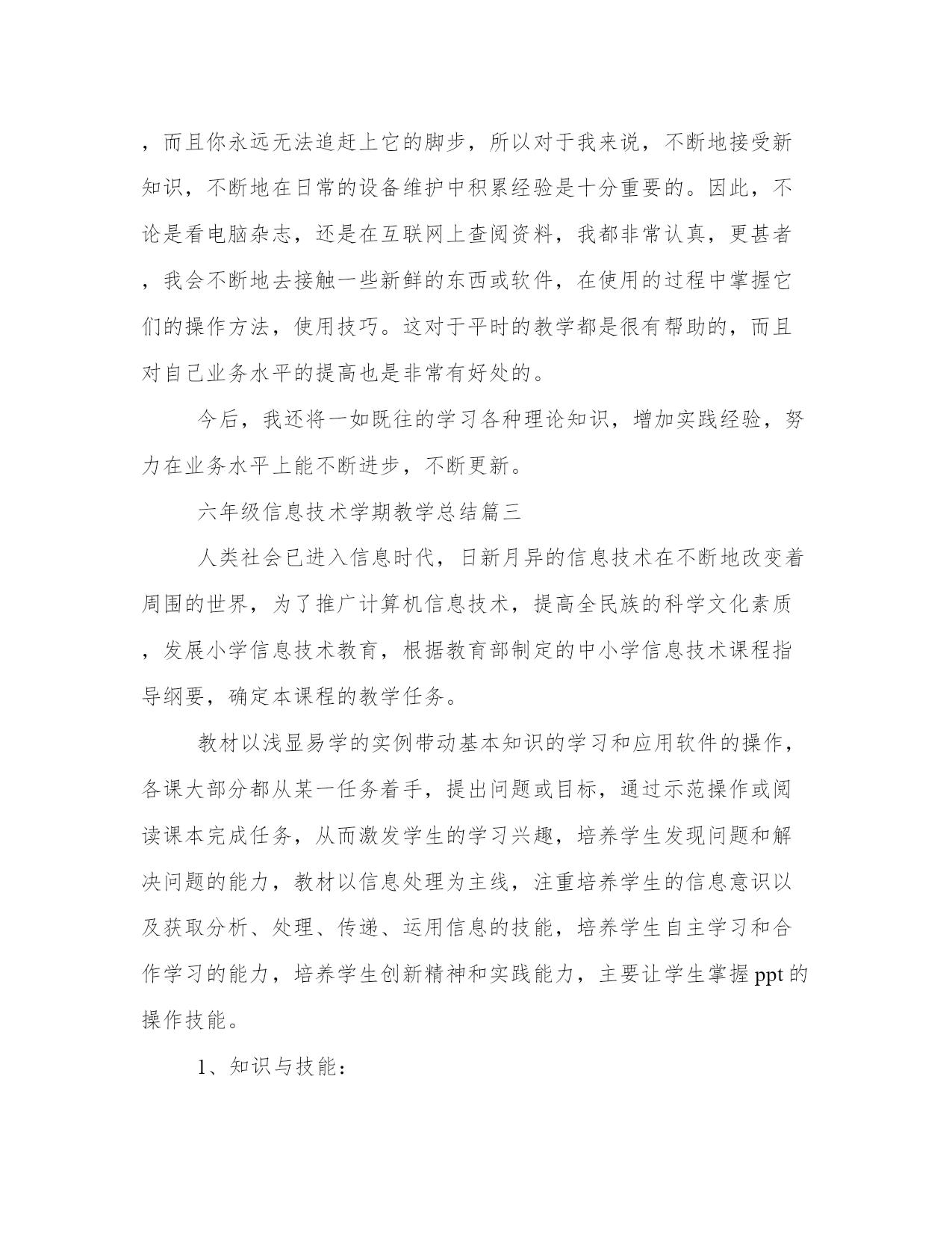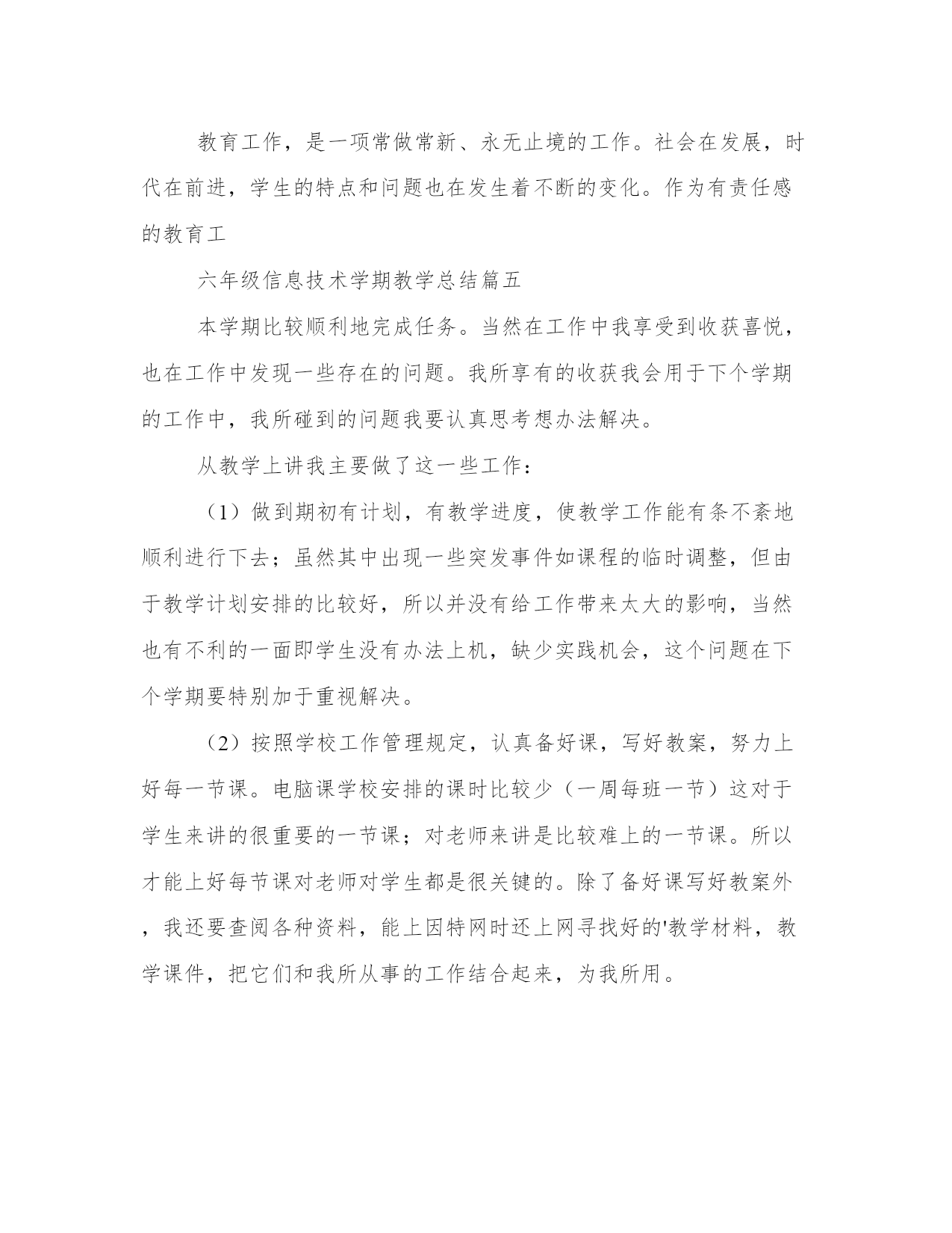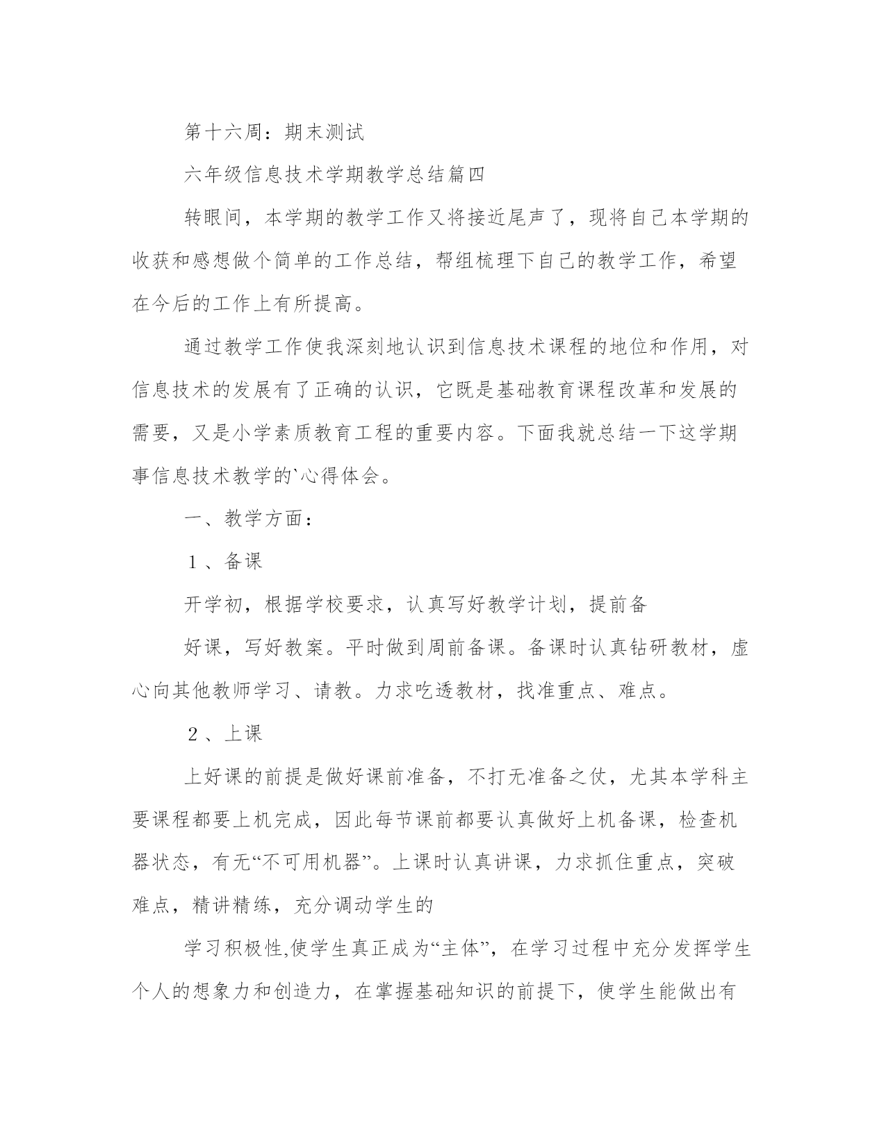 2024年六年级信息技术学期教学总结(十三篇)总结是指对某一阶段的工作、学习或思想中的经验或情况加以总结和概括的书面材料,它可以明确下一步的工作方向,少走弯路,少犯错误,提高工作效益,因此,让我们写一份总结吧。总结书写有哪些要求呢?我们怎样才能写好一篇总结呢?下面是小编带来的优秀总结范文,希望大家能够喜欢!六年级信息技术学期教学总结篇一1、教材中有很多知识只需要学生作了解就可以了,不要求学生操作。比如第四单元的“神龟妙算”、“弹琴奏乐”、“挥毫泼墨”、“百鸡问题”等。由于这些内容不仅有一定的难度,而且有一家的不深度,作为小学六年级的学生,要想熟练掌握这部分内容,大多数都没有这种知识基础。让他们作了解的理由就是给他们奠定一定的基础,让有条件和余力的学生可以继续探究,培养他们的学习兴趣,为将来进入更进一步的学习创造条件。2、有些内可以作选学要求,作为小学生来说,受限于各方面的知识。由于本教材对小学生的知识有一定的要求,特别是数学知识,所以,限于学生对一些必要的知识不是掌握得很熟悉,在编写过程的时候很容易达不到目的。从第三单元起,广大学生就感到困难,很难独立完成,就是合作完成,也仅限于在教师出示的例子上。如果要独立创造,那就更加困难了。所以这些知识点,我们只要求学生在教师的指导下能完成就可以了。还有一些包括解度计算、颜色填充等问题,学生可能也不容易掌握。3、一些比较简单的内容可以讲得快一些,目的是节约时间来为比较困难的内容提供多练习的机会。比如在第一单元的内容,相对比较简单。在讲解这些内容的过程中,可以把它们整合起来讲,在前节课就可以贯穿下节课的内容。尽量节约课时,为第二、三单元留下充足的'时间。4、当然,作为本教材介绍的知识比较全面,涉及到美术作图、数学计算、乐曲改写等方面。无论是学生不能完全掌握,就是教师,要完全掌握也有一定的难度。我们是不是就要放弃呢?不是,有句话说得好“师父领进门,成功靠各人”,只是让学生了解相关的知识,如果有兴趣的学生,可以进行更深入的钻研。也为他们将来打好基础。也许他们将来的文化知识丰富了,就会想到用某某软件来做某事,到那个时候,他们学起来就更快了。5、在教学的过程中,会出现一些意外的问题。同样的一个过程,在某种版本中却出现执行不出来的情况,而换一个版本又有可能执行出来。当然,还有像“弹琴奏乐”这样的内容,是受版本限制的。鉴于这种情况,我们在演示里往往会出现一些偶然,学生们就会怀疑,怎么做不出来呢,而仔细核对过程,又是正确的。所以,我们有必要向学生说明这点。6、为了丰富教学内容和增加自已的知识面。在电脑上下载了一些相关的资料和过程等。自已在课余参考对照,不断的总结经验。尽量找到一些简捷的方法进行教学,既节约时间,又能达到效果,也增加了学生的知识面。7、多关注学生的学习兴趣和接收情况,很多学生都有浓厚的兴趣,如果只限于书面的知识,他们可能觉得有点枯燥。采取多种教学方法让学生尝试到自已的成功:教学生在过程中修改参数以达到不同的效果;在网络中下载相关的过程,引导学生操作,获得新的知识;组织学生分组探讨,总结讨论,获得理性的认识;鼓励有余力、有条件的学生独立独创,把自已的作品供大家欣赏等。8、当然,鉴于自已的知识有限,还需要不断的学习提高,丰富自已,组织教学,以便能传授给学生更多的知识。六年级信息技术学期教学总结篇二本学期,我所从事的六年级信息技术教学工作,顺利地完成了任务。本人在教育教学上,爱岗敬业,严谨治教,热爱学生,努力做到把学生教好,让学生成功成才。信息技术课,不仅仅是让学生学会几种操作,更重要的是要提高学生的信息素养。因此我在教育教学方面积极加强教学理论素养,努力搞好教学工作。现将本学期的工作总结如下:从开学我就给自己制定了一套详尽的工作计划,其中最主要的,也是最需要自己去努力的,就是本学期内一定要把六年级的课备好,制作课件,以便上课的时候能更直观形象的将每节课所要学习的内容以及操作步骤完整的展示给学生看,让教学过程更直观更简单,更好地完成教学任务。工具性是信息技术课程的突出特点,即学即用是信息技术课堂教学中激发学生学习兴趣的重要手段。在教学中,我淡化学科系统性,将每一个教学模块相对独立出来,在每一个教学点后,我都尽量安排学生联系生活学习实际,学以致用。因为各个学生家庭条件不一,所以学生的信息技术基础参差不齐,差异很大。针对这一状况,我在教学中对学生实施因材实施,学习任务安排上分层要求,从而让每个学生都学有所获,体验成功的喜悦。同时,鼓励基础好的学生积极协助老师辅导基础较差的同学共同进步。放下严肃的面孔,关爱学生,尊重学生的人格,包容学生无知的过错,久而久之,逐步形成了良好的师生关系。把共同面对的困难、应对措施和目标拿出来与学生平等对话、讨论,增进了学生对老师的信任感。