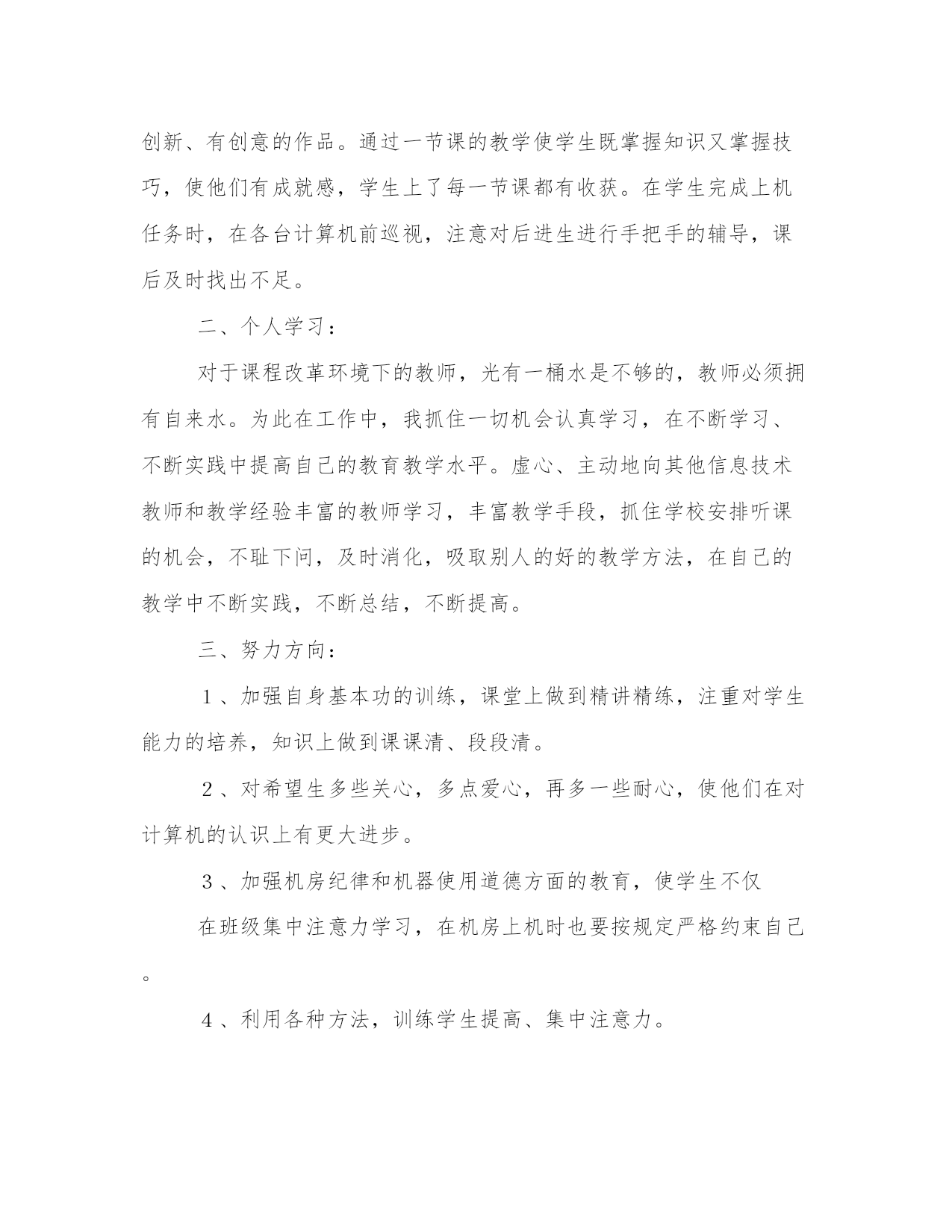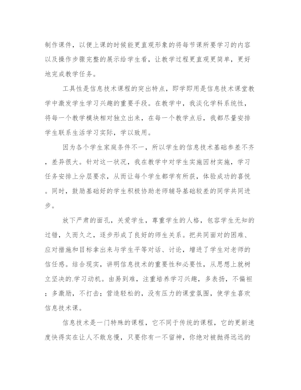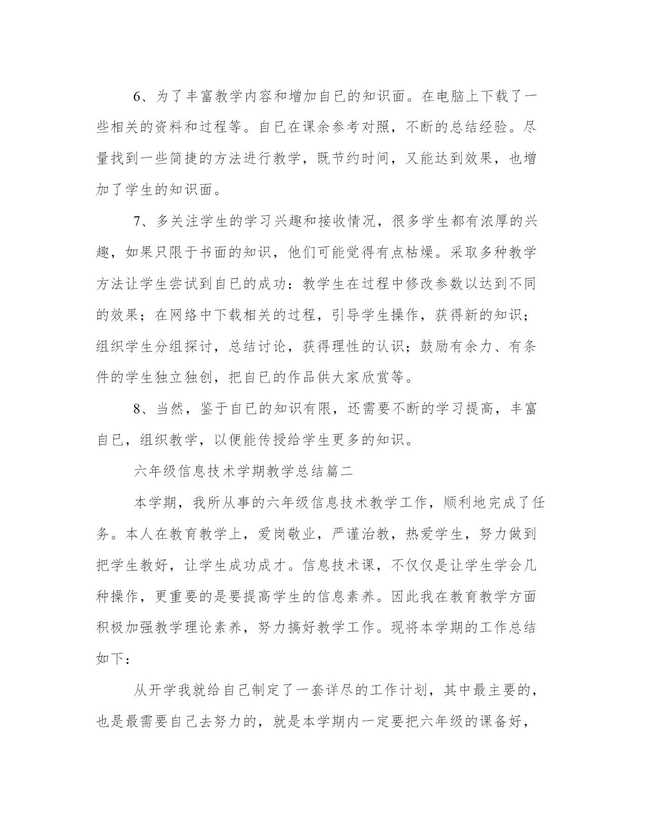 2024年六年级信息技术学期教学总结(十三篇)总结是指对某一阶段的工作、学习或思想中的经验或情况加以总结和概括的书面材料,它可以明确下一步的工作方向,少走弯路,少犯错误,提高工作效益,因此,让我们写一份总结吧。总结书写有哪些要求呢?我们怎样才能写好一篇总结呢?下面是小编带来的优秀总结范文,希望大家能够喜欢!六年级信息技术学期教学总结篇一1、教材中有很多知识只需要学生作了解就可以了,不要求学生操作。比如第四单元的“神龟妙算”、“弹琴奏乐”、“挥毫泼墨”、“百鸡问题”等。由于这些内容不仅有一定的难度,而且有一家的不深度,作为小学六年级的学生,要想熟练掌握这部分内容,大多数都没有这种知识基础。让他们作了解的理由就是给他们奠定一定的基础,让有条件和余力的学生可以继续探究,培养他们的学习兴趣,为将来进入更进一步的学习创造条件。2、有些内可以作选学要求,作为小学生来说,受限于各方面的知识。由于本教材对小学生的知识有一定的要求,特别是数学知识,所以,限于学生对一些必要的知识不是掌握得很熟悉,在编写过程的时候很容易达不到目的。从第三单元起,广大学生就感到困难,很难独立完成,就是合作完成,也仅限于在教师出示的例子上。如果要独立创造,那就更加困难了。所以这些知识点,我们只要求学生在教师的指导下能完成就可以了。还有一些包括解度计算、颜色填充等问题,学生可能也不容易掌握。3、一些比较简单的内容可以讲得快一些,目的是节约时间来为比较困难的内容提供多练习的机会。比如在第一单元的内容,相对比较简单。在讲解这些内容的过程中,可以把它们整合起来讲,在前节课就可以贯穿下节课的内容。尽量节约课时,为第二、三单元留下充足的'时间。4、当然,作为本教材介绍的知识比较全面,涉及到美术作图、数学计算、乐曲改写等方面。无论是学生不能完全掌握,就是教师,要完全掌握也有一定的难度。我们是不是就要放弃呢?不是,有句话说得好“师父领进门,成功靠各人”,只是让学生了解相关的知识,如果有兴趣的学生,可以进行更深入的钻研。也为他们将来打好基础。也许他们将来的文化知识丰富了,就会想到用某某软件来做某事,到那个时候,他们学起来就更快了。5、在教学的过程中,会出现一些意外的问题。同样的一个过程,在某种版本中却出现执行不出来的情况,而换一个版本又有可能执行出来。当然,还有像“弹琴奏乐”这样的内容,是受版本限制的。鉴于这种情况,我们在演示里往往会出现一些偶然,学生们就会怀疑,怎么做不出来呢,而仔细核对过程,又是正确的。所以,我们有必要向学生说明这点。6、为了丰富教学内容和增加自已的知识面。在电脑上下载了一些相关的资料和过程等。自已在课余参考对照,不断的总结经验。尽量找到一些简捷的方法进行教学,既节约时间,又能达到效果,也增加了学生的知识面。7、多关注学生的学习兴趣和接收情况,很多学生都有浓厚的兴趣,如果只限于书面的知识,他们可能觉得有点枯燥。采取多种教学方法让学生尝试到自已的成功:教学生在过程中修改参数以达到不同的效果;在网络中下载相关的过程,引导学生操作,获得新的知识;组织学生分组探讨,总结讨论,获得理性的认识;鼓励有余力、有条件的学生独立独创,把自已的作品供大家欣赏等。8、当然,鉴于自已的知识有限,还需要不断的学习提高,丰富自已,组织教学,以便能传授给学生更多的知识。六年级信息技术学期教学总结篇二本学期,我所从事的六年级信息技术教学工作,顺利地完成了任务。本人在教育教学上,爱岗敬业,严谨治教,热爱学生,努力做到把学生教好,让学生成功成才。信息技术课,不仅仅是让学生学会几种操作,更重要的是要提高学生的信息素养。因此我在教育教学方面积极加强教学理论素养,努力搞好教学工作。现将本学期的工作总结如下:从开学我就给自己制定了一套详尽的工作计划,其中最主要的,也是最需要自己去努力的,就是本学期内一定要把六年级的课备好,制作课件,以便上课的时候能更直观形象的将每节课所要学习的内容以及操作步骤完整的展示给学生看,让教学过程更直观更简单,更好地完成教学任务。工具性是信息技术课程的突出特点,即学即用是信息技术课堂教学中激发学生学习兴趣的重要手段。在教学中,我淡化学科系统性,将每一个教学模块相对独立出来,在每一个教学点后,我都尽量安排学生联系生活学习实际,学以致用。因为各个学生家庭条件不一,所以学生的信息技术基础参差不齐,差异很大。针对这一状况,我在教学中对学生实施因材实施,学习任务安排上分层要求,从而让每个学生都学有所获,体验成功的喜悦。同时,鼓励基础好的学生积极协助老师辅导基础较差的同学共同进步。放下严肃的面孔,关爱学生,尊重学生的人格,包容学生无知的过错,久而久之,逐步形成了良好的师生关系。把共同面对的困难、应对措施和目标拿出来与学生平等对话、讨论,增进了学生对老师的信任感。