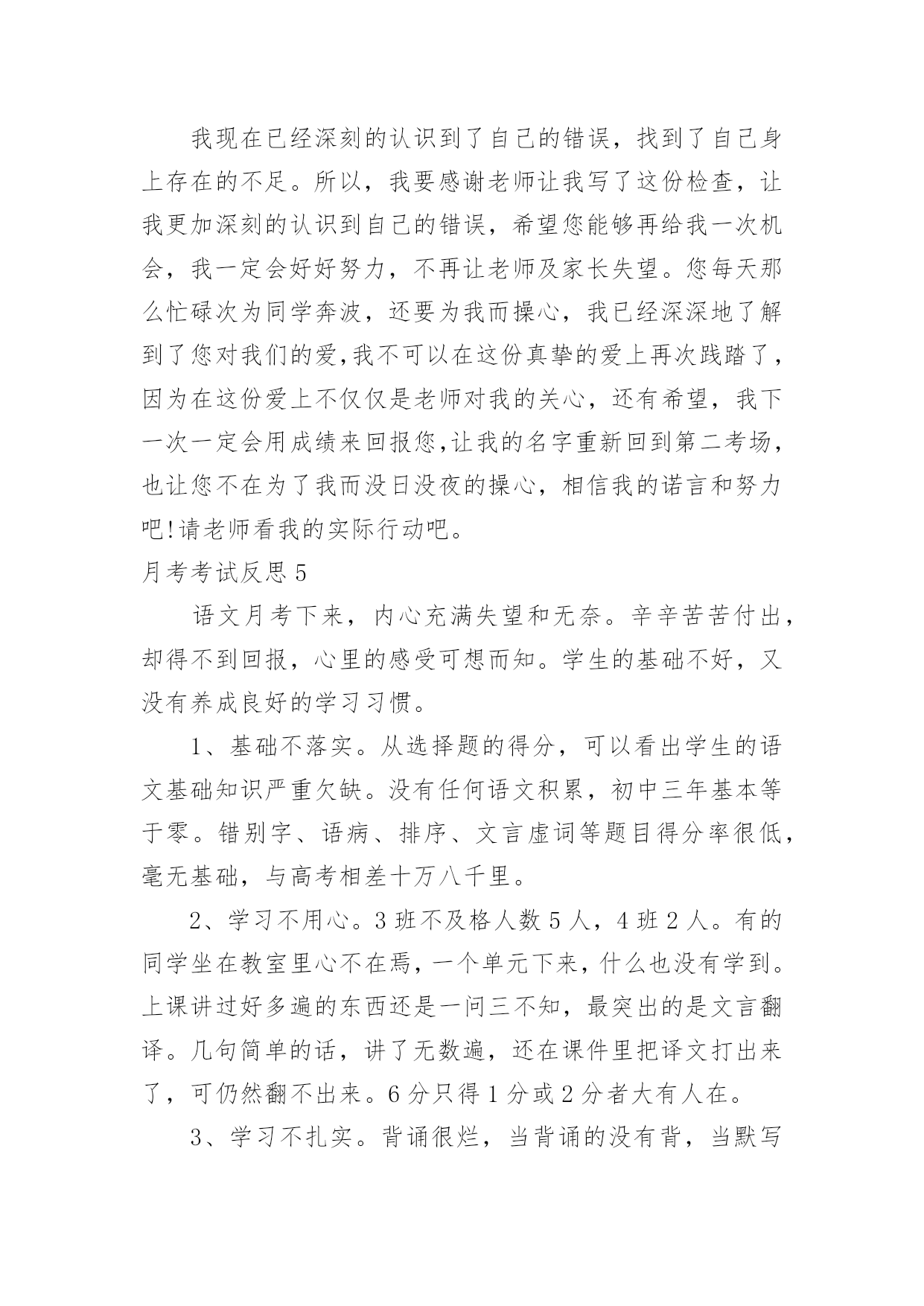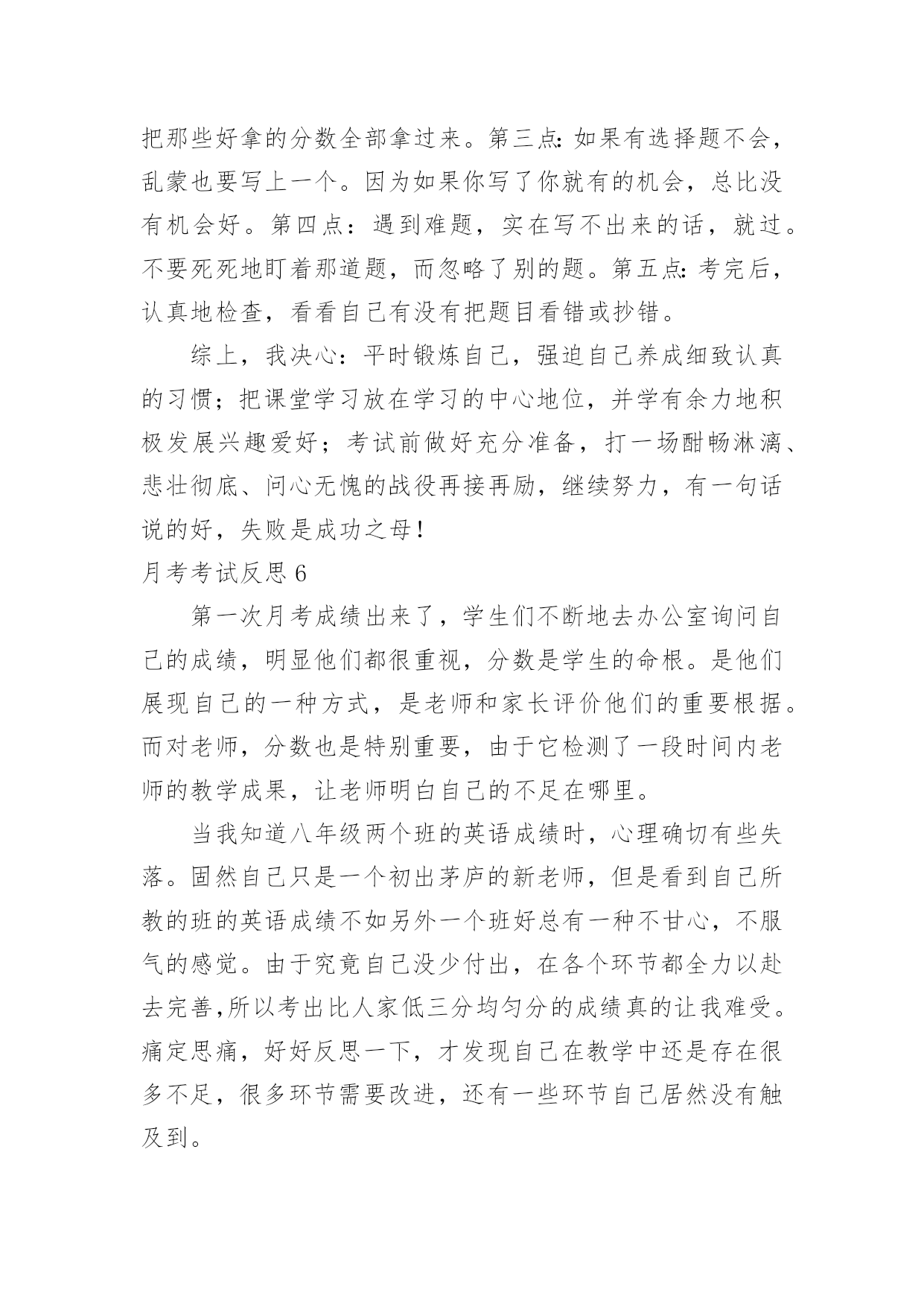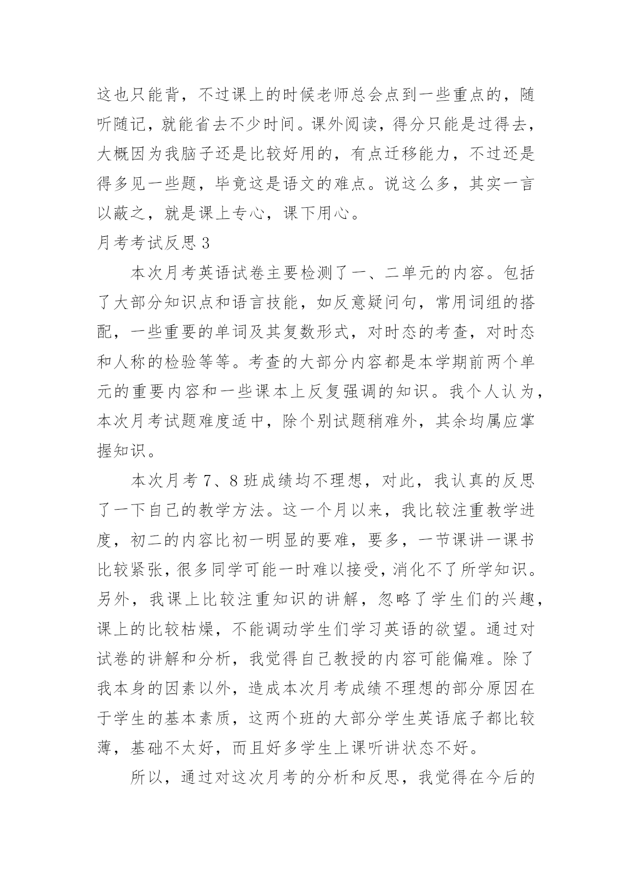 月考考试反思月考考试反思(15篇)在发展不断提速的社会中,我们需要很强的教学能力,所谓反思就是能够迅速从一个场景和事态中抽身出来,看自己在前一个场景和事态中自己的表现。那么优秀的反思是什么样的呢?下面是小编帮大家整理的月考考试反思,欢迎阅读与收藏。月考考试反思1这次语文考了80分,真是好遗憾啊!这次期中考试考的还不错,班里第二,年级第69名,但是语文成绩没上优秀率!唉,我觉得这次期中考试能冲到前面去主要是副科成绩好,主科成绩嘛,语文80,数学100,英语84。看着这种形势,有点后怕啊!下次月考可没有副科考试,拼的是主科实力,还记得上次月考只排了个年级170,班里第9,看来高手还是多啊!再分析一下吧,除了数学,我语文和英语都没有上优秀率,如果这次副科成绩不算在内,我很有可能没进前180名啊(想到这儿,冷汗直冒)!所以,我要好好学,争取次次都在前几名。但这也不能是嘴上说说就能达成的,这次大家都没有考好,考后肯定有高手做出深刻的自我检讨,下次的前几名就不是那是容易进的了。因为考试考的好,肯定要被调到前两排去,那样最好了,能更好的跟老师互动,看清黑板,听老师讲课也更清楚。我要好好学语文,努力做到上课不开一丝小差,把老师讲解的知识紧记脑中,下次不再在老师讲过的知识上丢分了。并且,我还要在自己爱看的散文上加一些名著,把它一读再读,将用的好的词句记在心上,使自己的文章更加的美。不知怎的,平常我的作文还不错,可为什么一到考场上就发挥不出应有的水平?我觉得可能还是平常练习的不够多吧?所以,平常空闲时要多管管博客,发博文,还有一点,什么文章我都要学着写,不然会吃亏的。加油!加强语文和英语,让它们和数学一同并进。为下次月考迎战!月考考试反思2这次月考已经过去,成绩不尽如人意,不过老师说的对,评价和测试只是次要的,月考的意义最重要的还是找到自己的问题。这次语文在最基础的选择题上就错,字音字形不到位,中国字都认不对,这可悲哀。其次的大失分点就是文言文翻译和背默。失分之多惨不忍睹,暴露出平日里对于课文理解不透彻,课上不记重点,不会记笔记的严重问题。而作文得42分,平均分的水平,老师批语“有思想,没写好。”大概是没写好吧,由于不知道时间,写作文的时候有点急。虽然我觉得不急的话也多不几分。我唯一的优点就是想法比较多,文章的中心比较容易出新,而作文的结构手法就差远。意识到问题就得改正,才能让月考有意义。我觉得对于课上的这些基础知识,记笔记是必须的,但如果能把这些知识当成常识记下来的话,肯定是非常nice的。文言文翻译,根本就没有意识去背是肯定不行的,考试就直接点到死穴,这也只能背,不过课上的时候老师总会点到一些重点的,随听随记,就能省去不少时间。课外阅读,得分只能是过得去,大概因为我脑子还是比较好用的,有点迁移能力,不过还是得多见一些题,毕竟这是语文的难点。说这么多,其实一言以蔽之,就是课上专心,课下用心。月考考试反思3本次月考英语试卷主要检测了一、二单元的内容。包括了大部分知识点和语言技能,如反意疑问句,常用词组的搭配,一些重要的单词及其复数形式,对时态的考查,对时态和人称的检验等等。考查的大部分内容都是本学期前两个单元的重要内容和一些课本上反复强调的知识。我个人认为,本次月考试题难度适中,除个别试题稍难外,其余均属应掌握知识。本次月考7、8班成绩均不理想,对此,我认真的反思了一下自己的教学方法。这一个月以来,我比较注重教学进度,初二的内容比初一明显的要难,要多,一节课讲一课书比较紧张,很多同学可能一时难以接受,消化不了所学知识。另外,我课上比较注重知识的讲解,忽略了学生们的兴趣,课上的比较枯燥,不能调动学生们学习英语的欲望。通过对试卷的讲解和分析,我觉得自己教授的内容可能偏难。除了我本身的因素以外,造成本次月考成绩不理想的部分原因在于学生的基本素质,这两个班的大部分学生英语底子都比较薄,基础不太好,而且好多学生上课听讲状态不好。所以,通过对这次月考的分析和反思,我觉得在今后的工作中,应在调动学生积极性方面多下点功夫。应多关注成绩不太好的学生,尽快提高他们的成绩。我目前一段时间内的目标就是争取期中考试成绩比这次月考要好。月考考试反思4在以前的学习中,我没有认真努力,这次没考好,现在想起来非常后悔。今天,我怀着愧疚和懊悔的心情,写下这份检查。以向您表示我的决心和悔改之意,只希望您能够给我一个改正错误的机会。谢谢您。以前我没有意识到自己的散漫和无知,对于XX这种需要大量做题的学科,总是抱有偷懒心理。以至于最终引火自焚,导致了这种恶果。不但对不起父母和老师,更在同学中间成为了反面教材.也是对XX班的一种不责任的表现.另外还让老师经常担心。我已深深地认识到了自己的错误,作为小学生,我没有意识到自己已经是个12岁的大孩子了,非但没有帮老师、家长分担压力,反而给他们