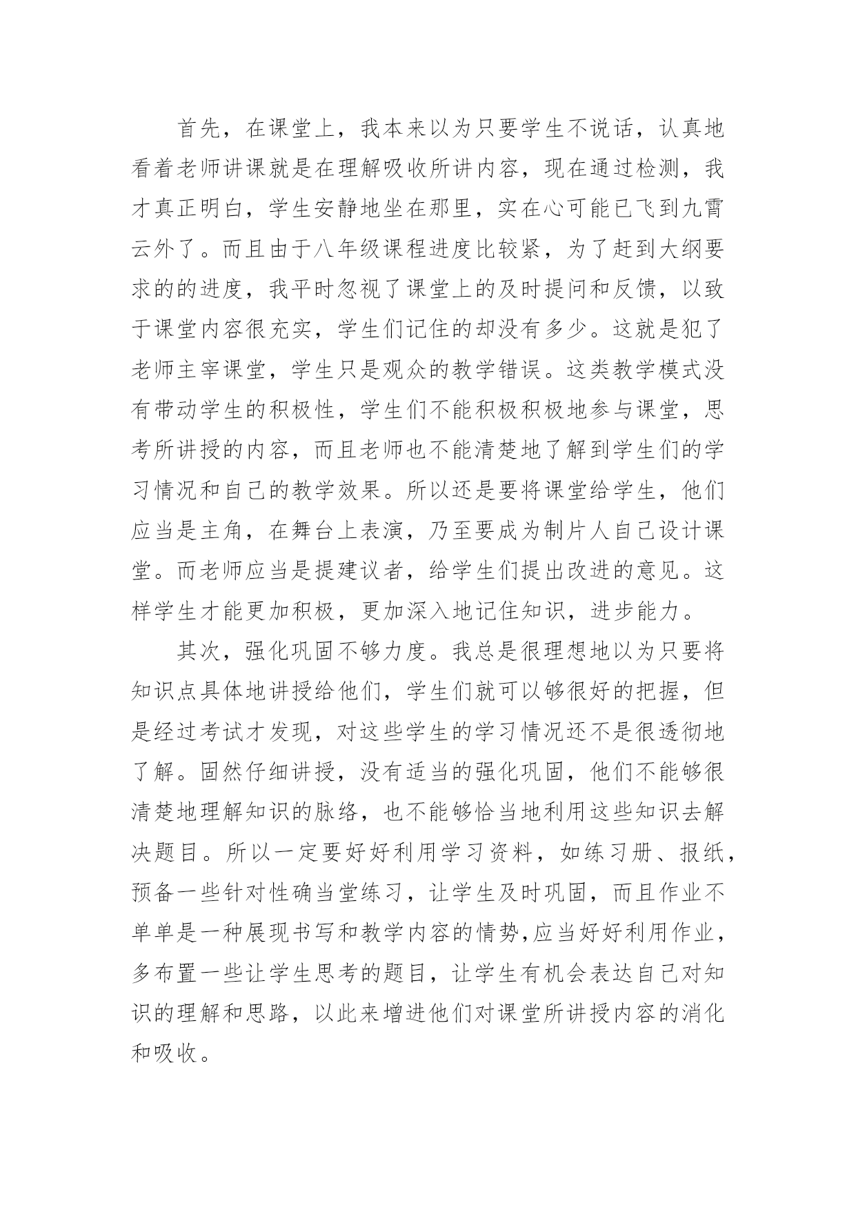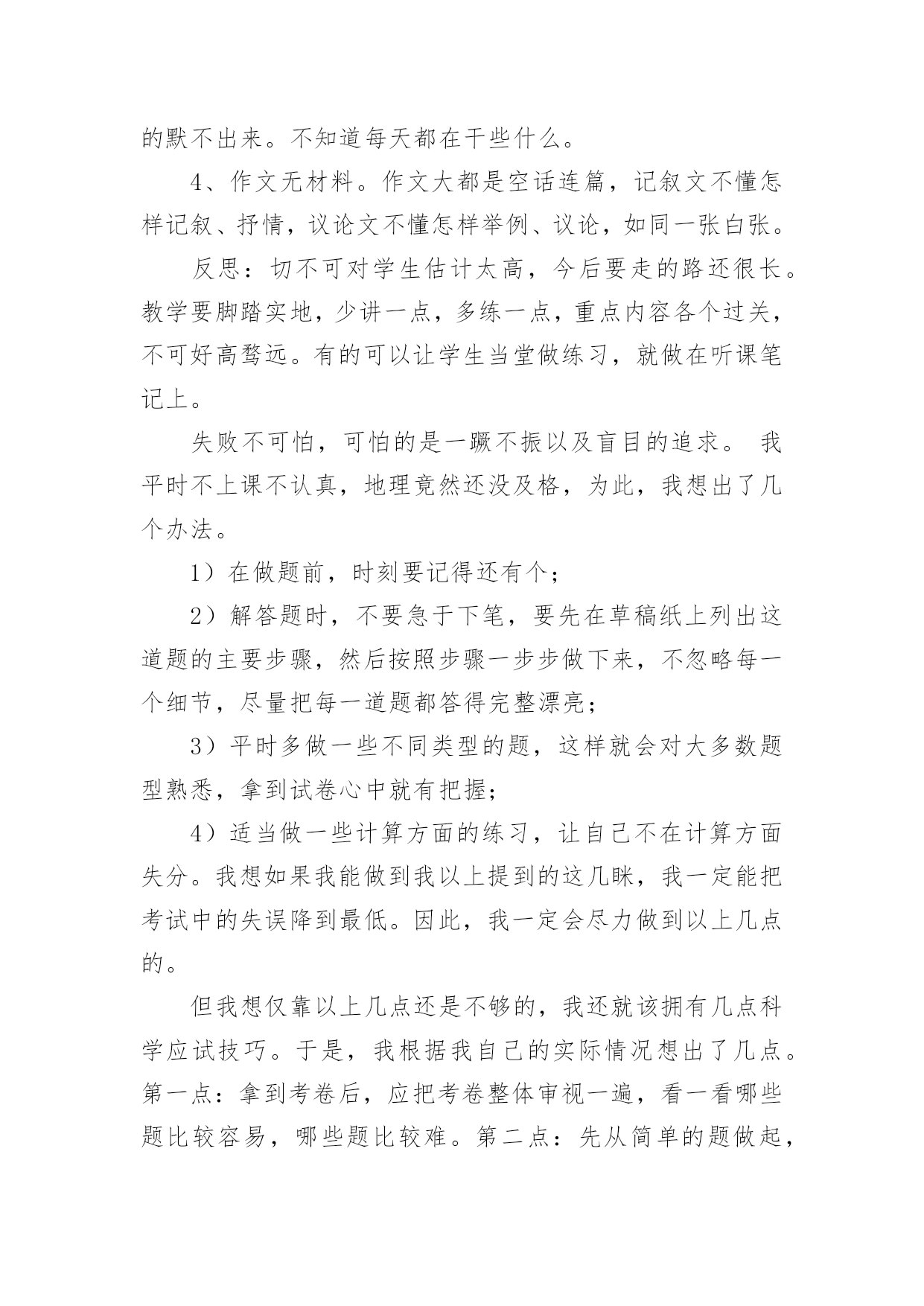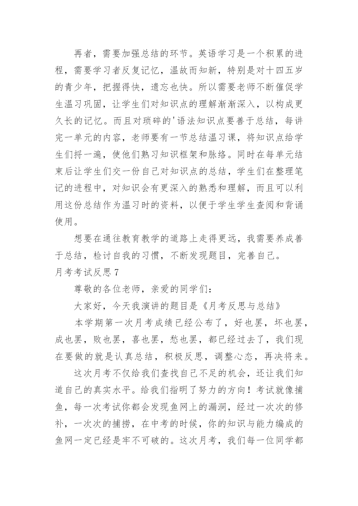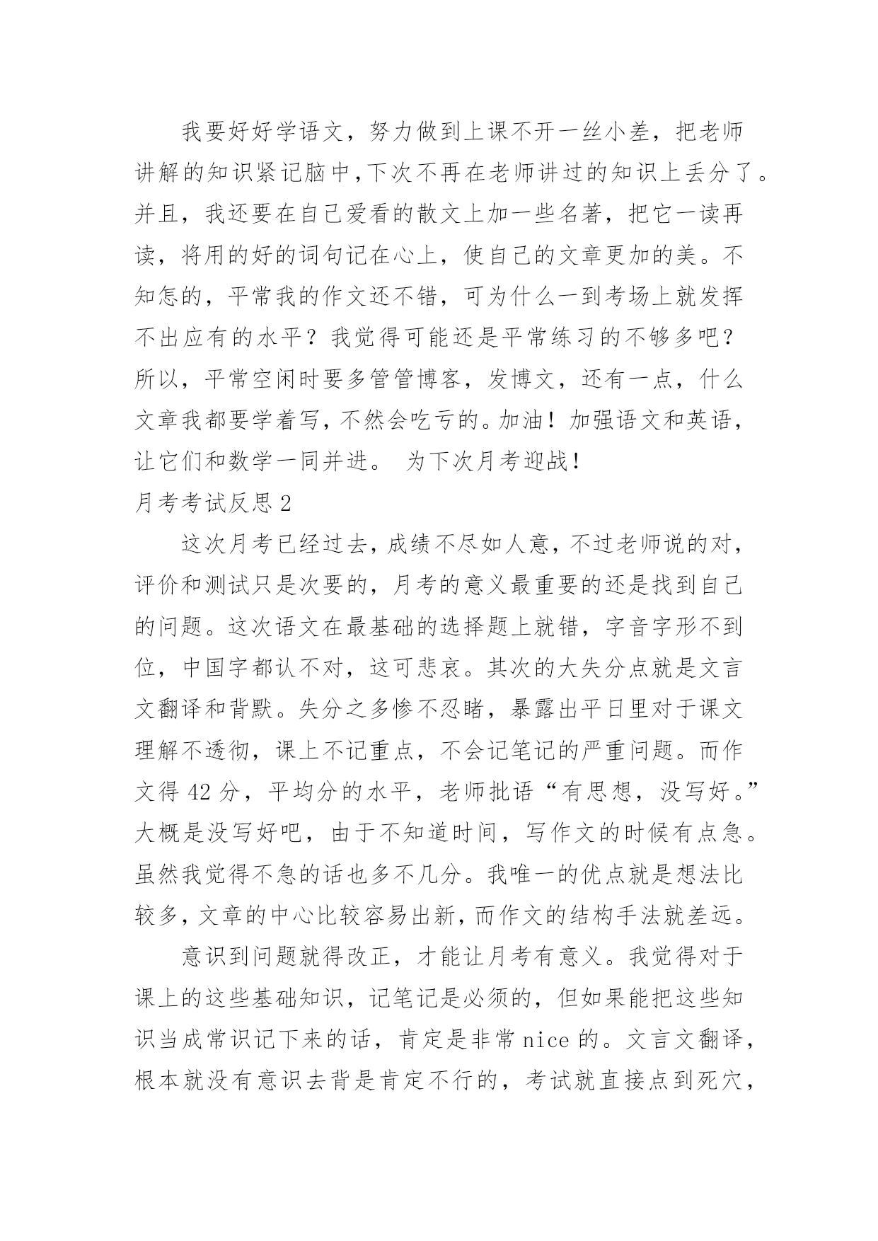 月考考试反思月考考试反思(15篇)在发展不断提速的社会中,我们需要很强的教学能力,所谓反思就是能够迅速从一个场景和事态中抽身出来,看自己在前一个场景和事态中自己的表现。那么优秀的反思是什么样的呢?下面是小编帮大家整理的月考考试反思,欢迎阅读与收藏。月考考试反思1这次语文考了80分,真是好遗憾啊!这次期中考试考的还不错,班里第二,年级第69名,但是语文成绩没上优秀率!唉,我觉得这次期中考试能冲到前面去主要是副科成绩好,主科成绩嘛,语文80,数学100,英语84。看着这种形势,有点后怕啊!下次月考可没有副科考试,拼的是主科实力,还记得上次月考只排了个年级170,班里第9,看来高手还是多啊!再分析一下吧,除了数学,我语文和英语都没有上优秀率,如果这次副科成绩不算在内,我很有可能没进前180名啊(想到这儿,冷汗直冒)!所以,我要好好学,争取次次都在前几名。但这也不能是嘴上说说就能达成的,这次大家都没有考好,考后肯定有高手做出深刻的自我检讨,下次的前几名就不是那是容易进的了。因为考试考的好,肯定要被调到前两排去,那样最好了,能更好的跟老师互动,看清黑板,听老师讲课也更清楚。我要好好学语文,努力做到上课不开一丝小差,把老师讲解的知识紧记脑中,下次不再在老师讲过的知识上丢分了。并且,我还要在自己爱看的散文上加一些名著,把它一读再读,将用的好的词句记在心上,使自己的文章更加的美。不知怎的,平常我的作文还不错,可为什么一到考场上就发挥不出应有的水平?我觉得可能还是平常练习的不够多吧?所以,平常空闲时要多管管博客,发博文,还有一点,什么文章我都要学着写,不然会吃亏的。加油!加强语文和英语,让它们和数学一同并进。为下次月考迎战!月考考试反思2这次月考已经过去,成绩不尽如人意,不过老师说的对,评价和测试只是次要的,月考的意义最重要的还是找到自己的问题。这次语文在最基础的选择题上就错,字音字形不到位,中国字都认不对,这可悲哀。其次的大失分点就是文言文翻译和背默。失分之多惨不忍睹,暴露出平日里对于课文理解不透彻,课上不记重点,不会记笔记的严重问题。而作文得42分,平均分的水平,老师批语“有思想,没写好。”大概是没写好吧,由于不知道时间,写作文的时候有点急。虽然我觉得不急的话也多不几分。我唯一的优点就是想法比较多,文章的中心比较容易出新,而作文的结构手法就差远。意识到问题就得改正,才能让月考有意义。我觉得对于课上的这些基础知识,记笔记是必须的,但如果能把这些知识当成常识记下来的话,肯定是非常nice的。文言文翻译,根本就没有意识去背是肯定不行的,考试就直接点到死穴,这也只能背,不过课上的时候老师总会点到一些重点的,随听随记,就能省去不少时间。课外阅读,得分只能是过得去,大概因为我脑子还是比较好用的,有点迁移能力,不过还是得多见一些题,毕竟这是语文的难点。说这么多,其实一言以蔽之,就是课上专心,课下用心。月考考试反思3本次月考英语试卷主要检测了一、二单元的内容。包括了大部分知识点和语言技能,如反意疑问句,常用词组的搭配,一些重要的单词及其复数形式,对时态的考查,对时态和人称的检验等等。考查的大部分内容都是本学期前两个单元的重要内容和一些课本上反复强调的知识。我个人认为,本次月考试题难度适中,除个别试题稍难外,其余均属应掌握知识。本次月考7、8班成绩均不理想,对此,我认真的反思了一下自己的教学方法。这一个月以来,我比较注重教学进度,初二的内容比初一明显的要难,要多,一节课讲一课书比较紧张,很多同学可能一时难以接受,消化不了所学知识。另外,我课上比较注重知识的讲解,忽略了学生们的兴趣,课上的比较枯燥,不能调动学生们学习英语的欲望。通过对试卷的讲解和分析,我觉得自己教授的内容可能偏难。除了我本身的因素以外,造成本次月考成绩不理想的部分原因在于学生的基本素质,这两个班的大部分学生英语底子都比较薄,基础不太好,而且好多学生上课听讲状态不好。所以,通过对这次月考的分析和反思,我觉得在今后的工作中,应在调动学生积极性方面多下点功夫。应多关注成绩不太好的学生,尽快提高他们的成绩。我目前一段时间内的目标就是争取期中考试成绩比这次月考要好。月考考试反思4在以前的学习中,我没有认真努力,这次没考好,现在想起来非常后悔。今天,我怀着愧疚和懊悔的心情,写下这份检查。以向您表示我的决心和悔改之意,只希望您能够给我一个改正错误的机会。谢谢您。以前我没有意识到自己的散漫和无知,对于XX这种需要大量做题的学科,总是抱有偷懒心理。以至于最终引火自焚,导致了这种恶果。不但对不起父母和老师,更在同学中间成为了反面教材.也是对XX班的一种不责任的表现.另外还让老师经常担心。我已深深地认识到了自己的错误,作为小学生,我没有意识到自己已经是个12岁的大孩子了,非但没有帮老师、家长分担压力,反而给他们