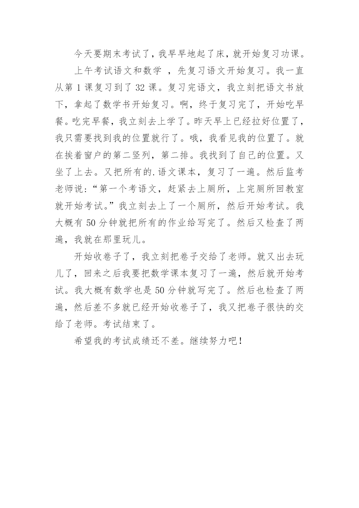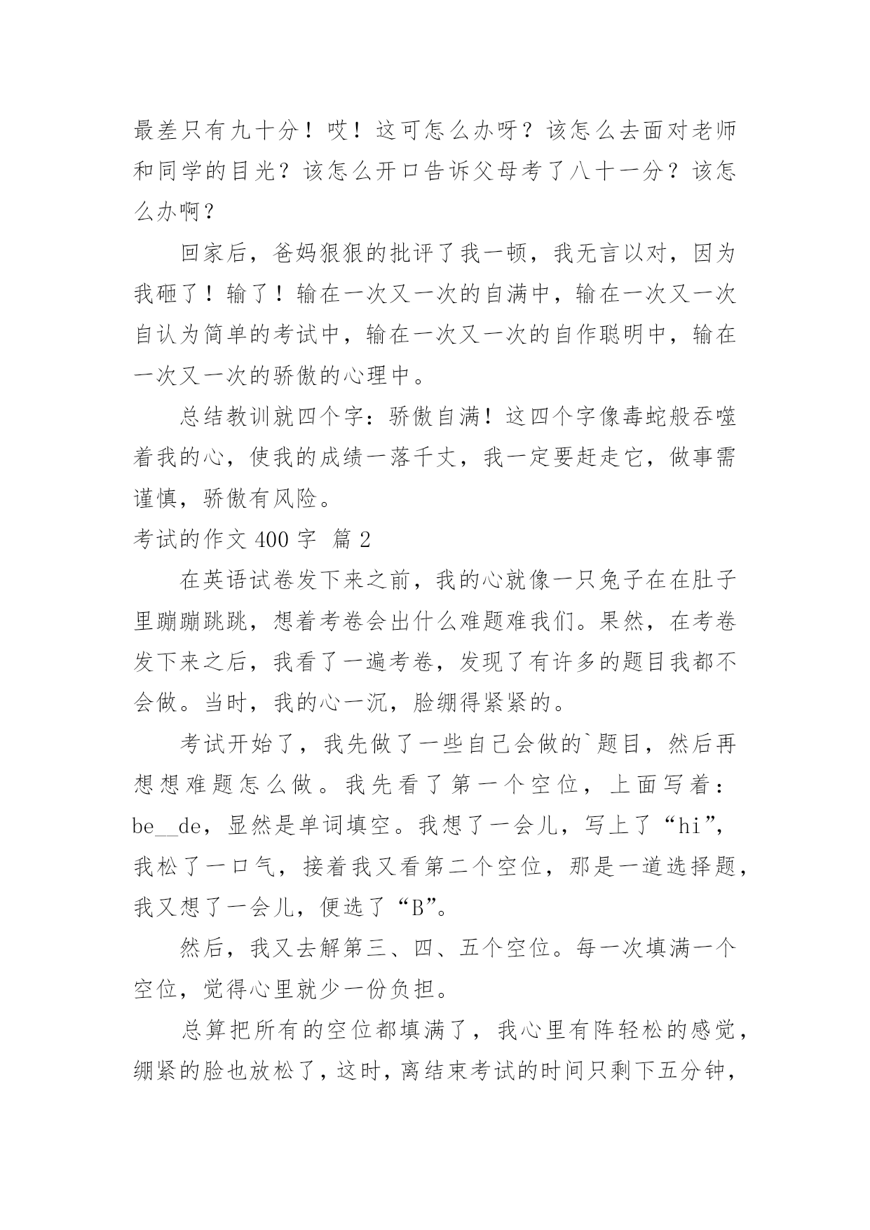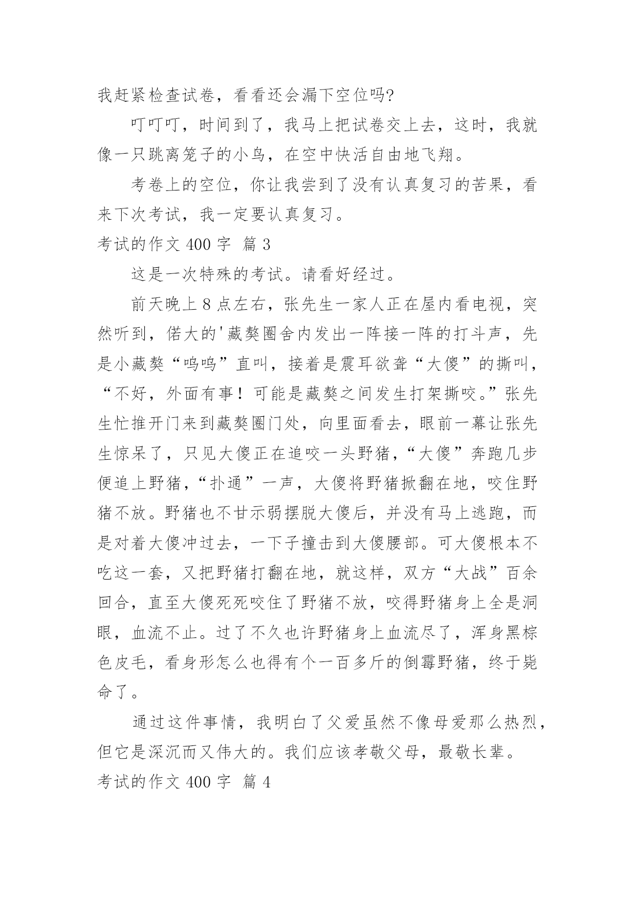 考试的作文400字【精选】考试的作文400字4篇在生活、工作和学习中,大家都写过作文吧,借助作文人们可以反映客观事物、表达思想感情、传递知识信息。你所见过的作文是什么样的呢?下面是小编为大家收集的考试的作文400字4篇,欢迎阅读与收藏。考试的作文400字篇1也许是成功太宠我了,从一年级到四年级我的语文成绩基本没有下过90分,这使我变得十分骄傲自满,自认为语文学得很好的我把语文考试更是不放在心上,然而那一次,成功却抛弃了我,一次期中考试打破了我的自信。那是五年级上期的一次考试,我又带着骄傲,自满的心情开始语文试卷,呀!好简单的题呀!拿到试卷后我更骄傲了,这样简单的题,还想难住我?哈哈,我不屑一顾的开始做题,考试刚过了三分之一多一点我的卷子就写完了,这么简单的题不检查了,我心想,于是我坐在考场上一直玩到了考试结束。发卷子之前我还一直在做黄粱美梦,想着老师要怎么表扬我,爸妈要怎么奖励我,可卷子发下来的那一刻,我沉默了,一个我想都不敢想的分数用耀眼的红色活生生的写在卷子上,我不敢相信,揉揉眼又看了几遍,但确实是八十一分,不是眼睛的问题,一瞬间,泪水如钱塘江的潮水,一涌而出,势不可挡,八十一分,我从来都没有考过这么底的'分数!最差只有九十分!哎!这可怎么办呀?该怎么去面对老师和同学的目光?该怎么开口告诉父母考了八十一分?该怎么办啊?回家后,爸妈狠狠的批评了我一顿,我无言以对,因为我砸了!输了!输在一次又一次的自满中,输在一次又一次自认为简单的考试中,输在一次又一次的自作聪明中,输在一次又一次的骄傲的心理中。总结教训就四个字:骄傲自满!这四个字像毒蛇般吞噬着我的心,使我的成绩一落千丈,我一定要赶走它,做事需谨慎,骄傲有风险。考试的作文400字篇2在英语试卷发下来之前,我的心就像一只兔子在在肚子里蹦蹦跳跳,想着考卷会出什么难题难我们。果然,在考卷发下来之后,我看了一遍考卷,发现了有许多的题目我都不会做。当时,我的心一沉,脸绷得紧紧的。考试开始了,我先做了一些自己会做的`题目,然后再想想难题怎么做。我先看了第一个空位,上面写着:be__de,显然是单词填空。我想了一会儿,写上了“hi”,我松了一口气,接着我又看第二个空位,那是一道选择题,我又想了一会儿,便选了“B”。然后,我又去解第三、四、五个空位。每一次填满一个空位,觉得心里就少一份负担。总算把所有的空位都填满了,我心里有阵轻松的感觉,绷紧的脸也放松了,这时,离结束考试的时间只剩下五分钟,我赶紧检查试卷,看看还会漏下空位吗?叮叮叮,时间到了,我马上把试卷交上去,这时,我就像一只跳离笼子的小鸟,在空中快活自由地飞翔。考卷上的空位,你让我尝到了没有认真复习的苦果,看来下次考试,我一定要认真复习。考试的作文400字篇3这是一次特殊的考试。请看好经过。前天晚上8点左右,张先生一家人正在屋内看电视,突然听到,偌大的'藏獒圈舍内发出一阵接一阵的打斗声,先是小藏獒“呜呜”直叫,接着是震耳欲聋“大傻”的撕叫,“不好,外面有事!可能是藏獒之间发生打架撕咬。”张先生忙推开门来到藏獒圈门处,向里面看去,眼前一幕让张先生惊呆了,只见大傻正在追咬一头野猪,“大傻”奔跑几步便追上野猪,“扑通”一声,大傻将野猪掀翻在地,咬住野猪不放。野猪也不甘示弱摆脱大傻后,并没有马上逃跑,而是对着大傻冲过去,一下子撞击到大傻腰部。可大傻根本不吃这一套,又把野猪打翻在地,就这样,双方“大战”百余回合,直至大傻死死咬住了野猪不放,咬得野猪身上全是洞眼,血流不止。过了不久也许野猪身上血流尽了,浑身黑棕色皮毛,看身形怎么也得有个一百多斤的倒霉野猪,终于毙命了。通过这件事情,我明白了父爱虽然不像母爱那么热烈,但它是深沉而又伟大的。我们应该孝敬父母,最敬长辈。考试的作文400字篇4今天要期末考试了,我早早地起了床,就开始复习功课。上午考试语文和数学,先复习语文开始复习。我一直从第1课复习到了32课。复习完语文,我立刻把语文书放下,拿起了数学书开始复习。啊,终于复习完了,开始吃早餐。吃完早餐,我立刻去上学了。昨天早上已经拉好位置了,我只需要找到我的位置就行了。哦,我看见我的位置了。就在挨着窗户的第二竖列,第二排。我找到了自己的位置。又坐了上去。又把所有的.语文课本,复习了一遍。然后监考老师说:“第一个考语文,赶紧去上厕所,上完厕所回教室就开始考试。”我立刻去上了一个厕所,然后开始考试。我大概有50分钟就把所有的作业给写完了。然后又检查了两遍,我就在那里玩儿。开始收卷子了,我立刻把卷子交给了老师。就又出去玩儿了,回来之后我要把数学课本复习了一遍,然后就开始考试。我大概有数学也是50分钟就写完了。然后也检查了两遍,然后差不多就已经开始收卷子了,我又把卷子很快的交给了老师。考试结束了。希望我的考试成绩还不差。继续努力吧!