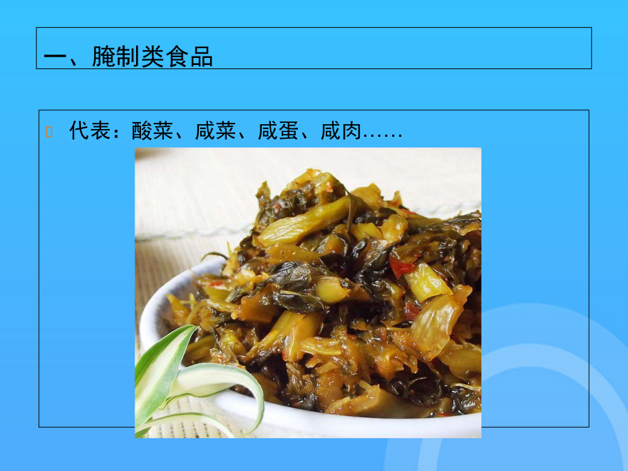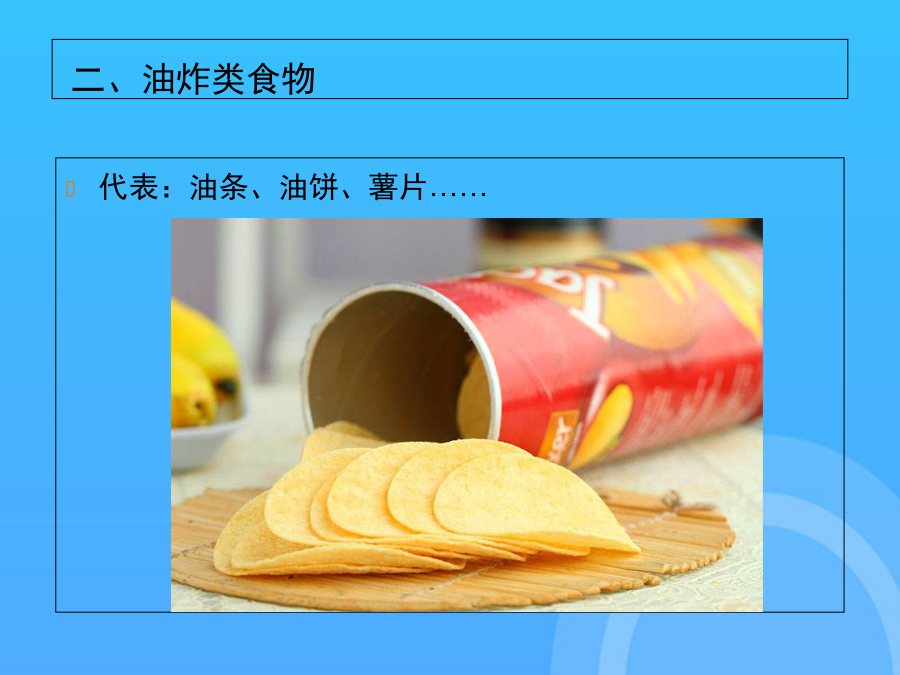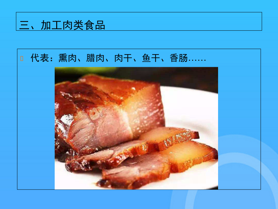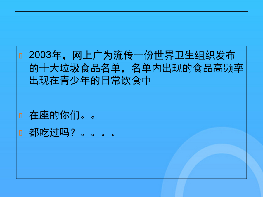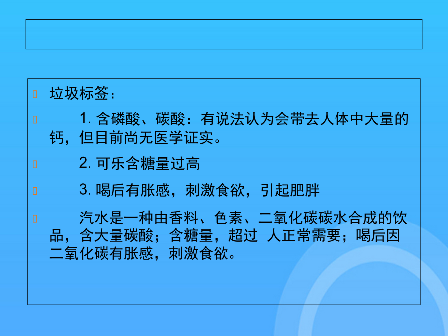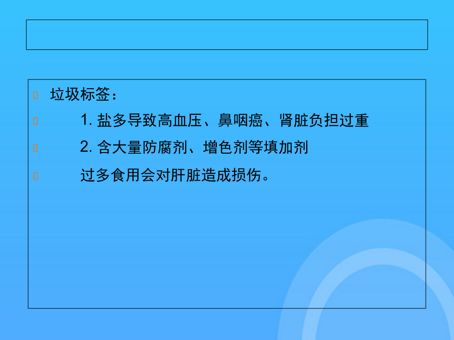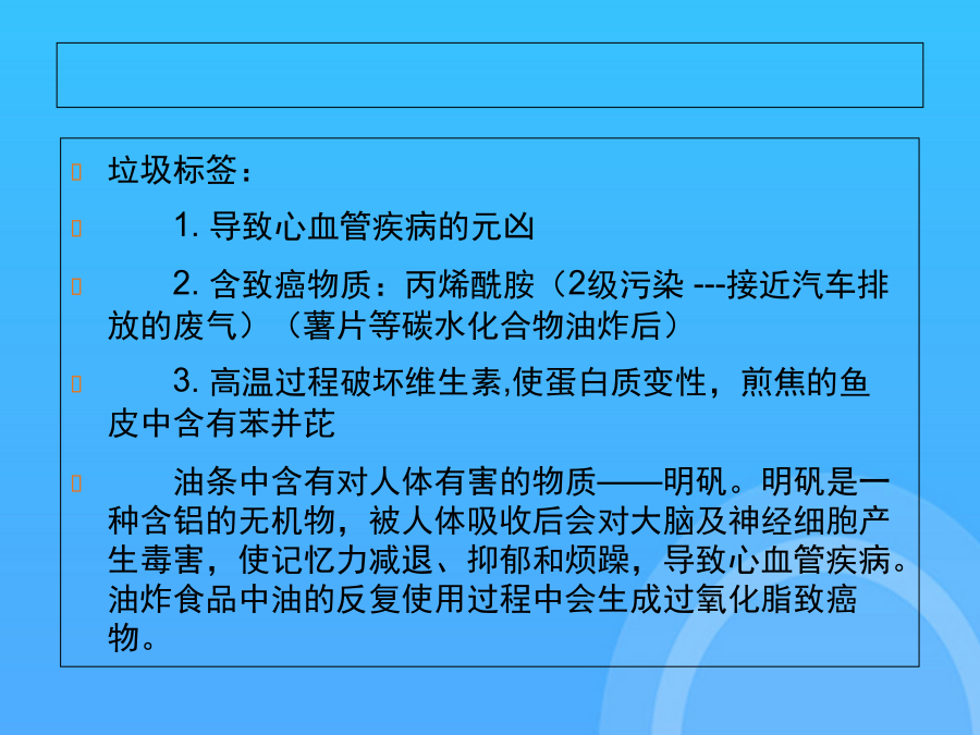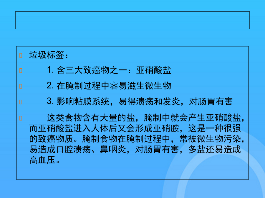 食品安全与健康喝后有胀感,刺激食欲,引起肥胖含大量防腐剂、增色剂等填加剂话梅含盐过高,长期摄入会诱发高血压。含奶油极易引起肥胖代表:羊肉串、铁板烧……过多摄入糖会使胰脏负担过重,易导致糖尿病导致心血管疾病的元凶添加大量香精、防腐剂,对健康不利。罐头加工中维生素几乎完全破坏,含糖、盐过高,热量过多,没有营养。盐多导致高血压、鼻咽癌、肾脏负担过重高温过程破坏维生素,使蛋白质变性,煎焦的鱼皮中含有苯并芘含致癌物质:丙烯酰胺(2级污染---接近汽车排放的废气)(薯片等碳水化合物油炸后)一只烤鸡腿等于60支香烟的毒