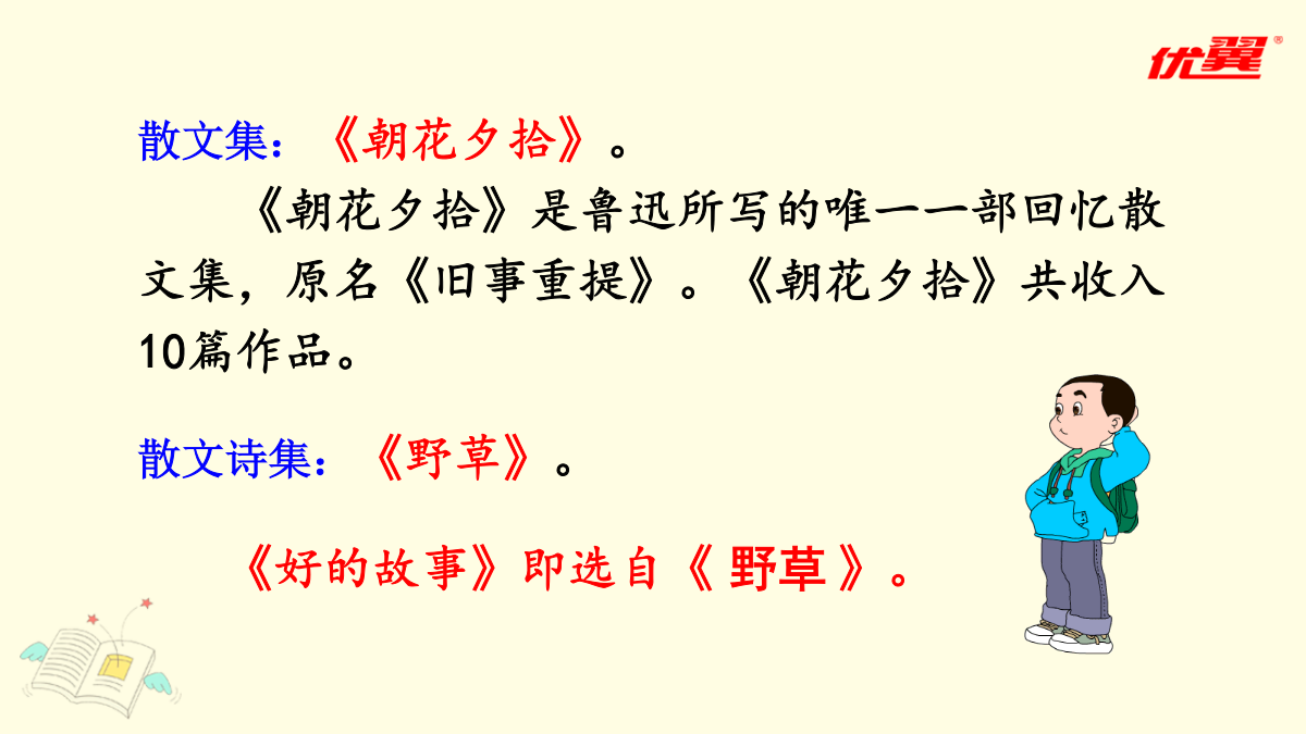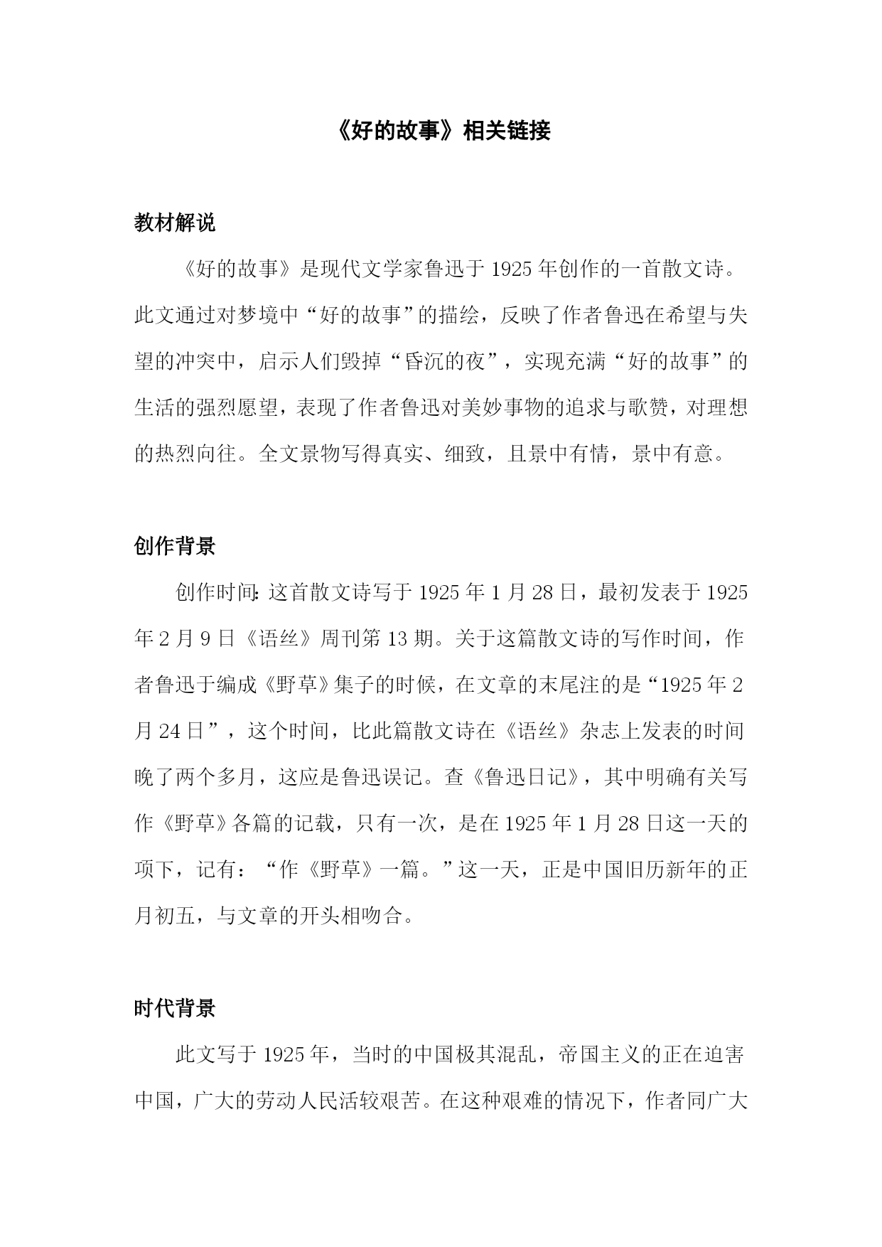 《好的故事》相关链接教材解说《好的故事》是现代文学家鲁迅于1925年创作的一首散文诗。此文通过对梦境中“好的故事”的描绘,反映了作者鲁迅在希望与失望的冲突中,启示人们毁掉“昏沉的夜”,实现充满“好的故事”的生活的强烈愿望,表现了作者鲁迅对美妙事物的追求与歌赞,对理想的热烈向往。全文景物写得真实、细致,且景中有情,景中有意。创作背景创作时间:这首散文诗写于1925年1月28日,最初发表于1925年2月9日《语丝》周刊笫13期。关于这篇散文诗的写作时间,作者鲁迅于编成《野草》集子的时候,在文章的末尾注的是“1