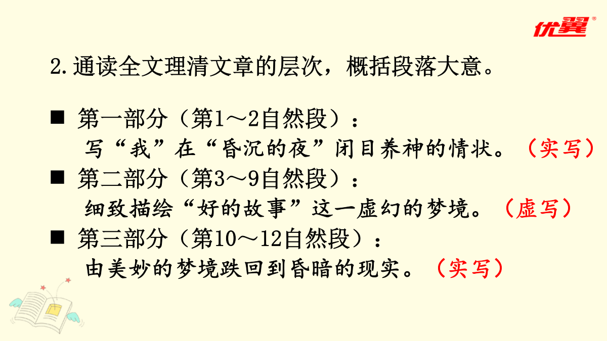 26好的故事[教学目标]1.会写11个生字,能正确读写词语表中的词语。2.能联系上下文,借助资料理解难懂的词语,在此基础上正确、流利地朗读课文。3.能抓住关键词句,体会梦境的美妙。【语文要素】4.能结合“阅读链接”中的资料,进一步读懂课文。【语文要素】[教学重难点]1.能抓住重点语段中的关键词句,体会梦境的美妙。2.能结合资料,体会象征手法的表达作用。[教学课时]2课时第1课时◆课时目标1.会写11个生字,能正确读写词语表中的词语。2.知道“好的故事”是指“我”的梦境。3.能读懂第1自然段,了解“我”的现