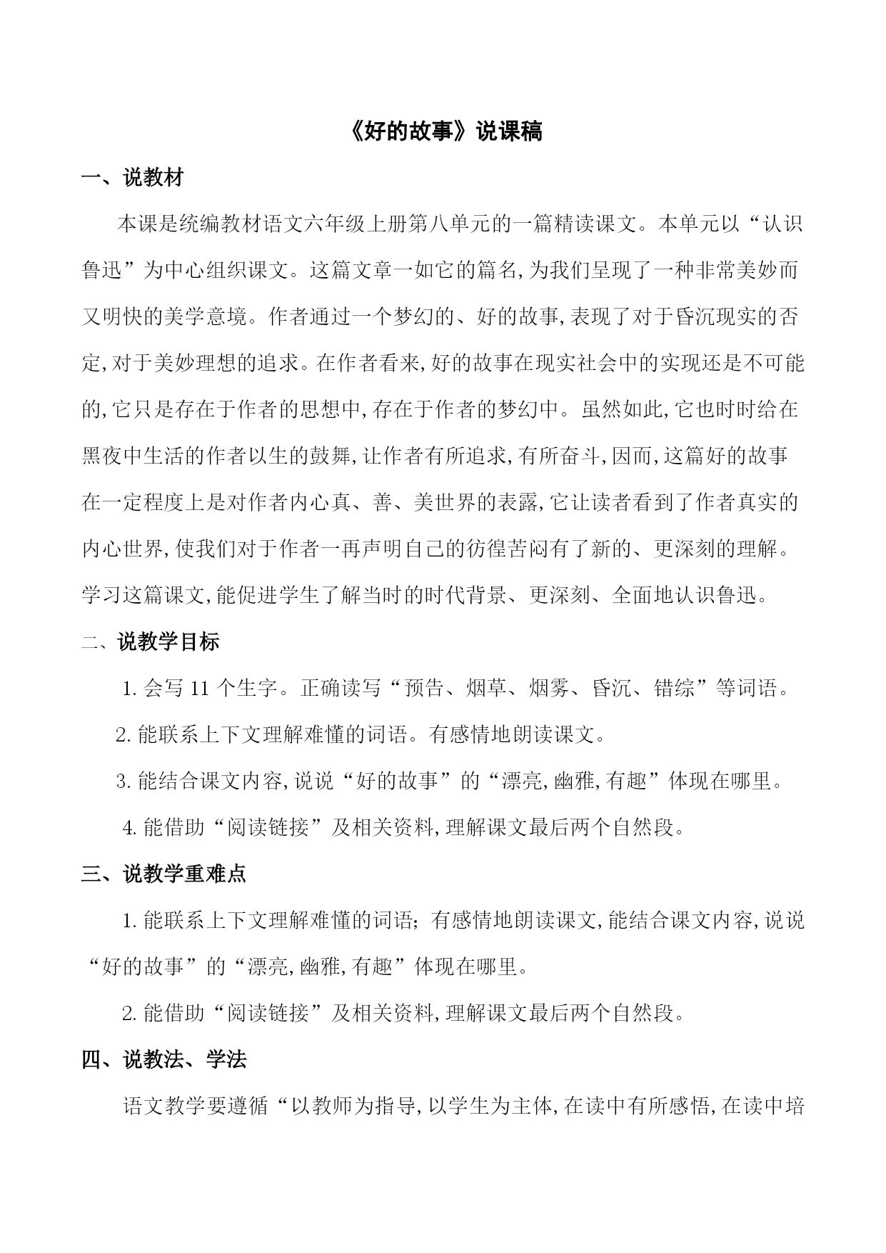 《好的故事》说课稿一、说教材 本课是统编教材语文六年级上册第八单元的一篇精读课文。本单元以“认识鲁迅”为中心组织课文。这篇文章一如它的篇名,为我们呈现了一种非常美妙而又明快的美学意境。作者通过一个梦幻的、好的故事,表现了对于昏沉现实的否定,对于美妙理想的追求。在作者看来,好的故事在现实社会中的实现还是不可能的,它只是存在于作者的思想中,存在于作者的梦幻中。虽然如此,它也时时给在黑夜中生活的作者以生的鼓舞,让作者有所追求,有所奋斗,因而,这篇好的故事在一定程度上是对作者内心真、善、美世界的表露,它让读者看到