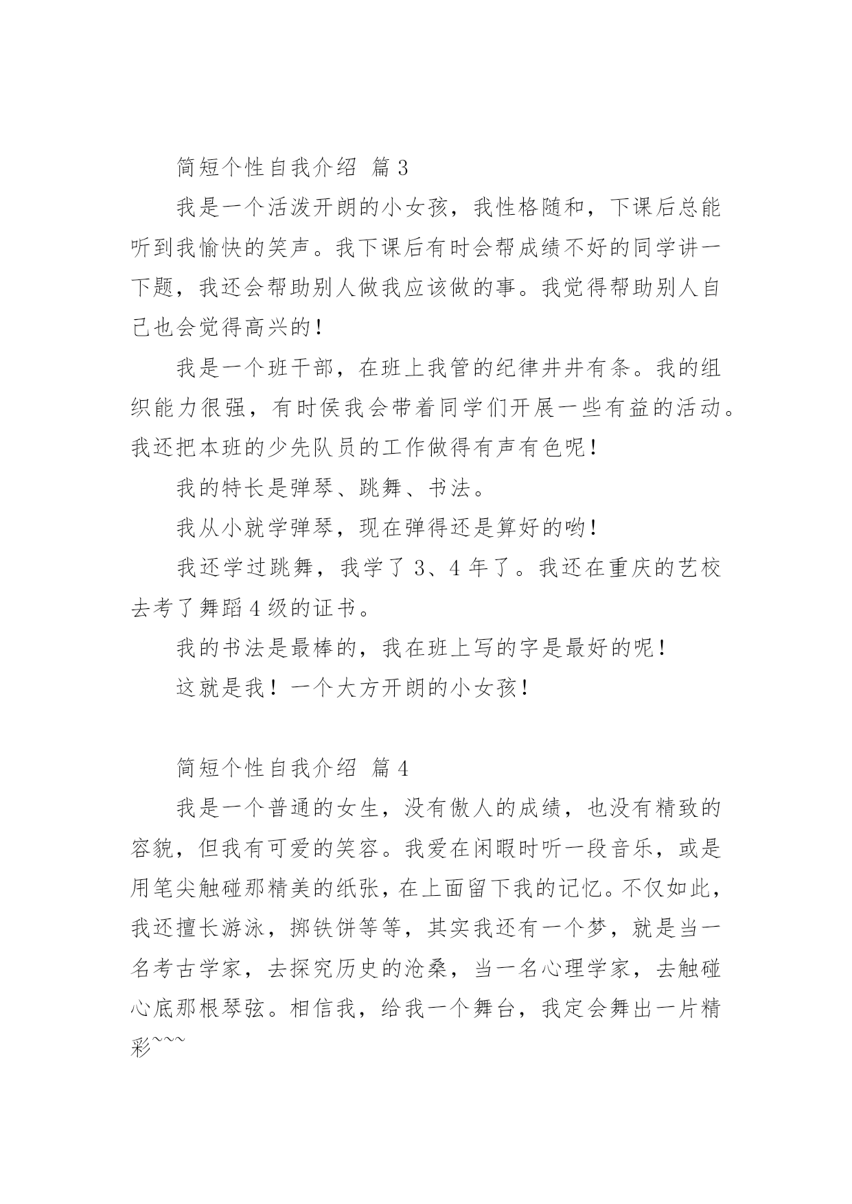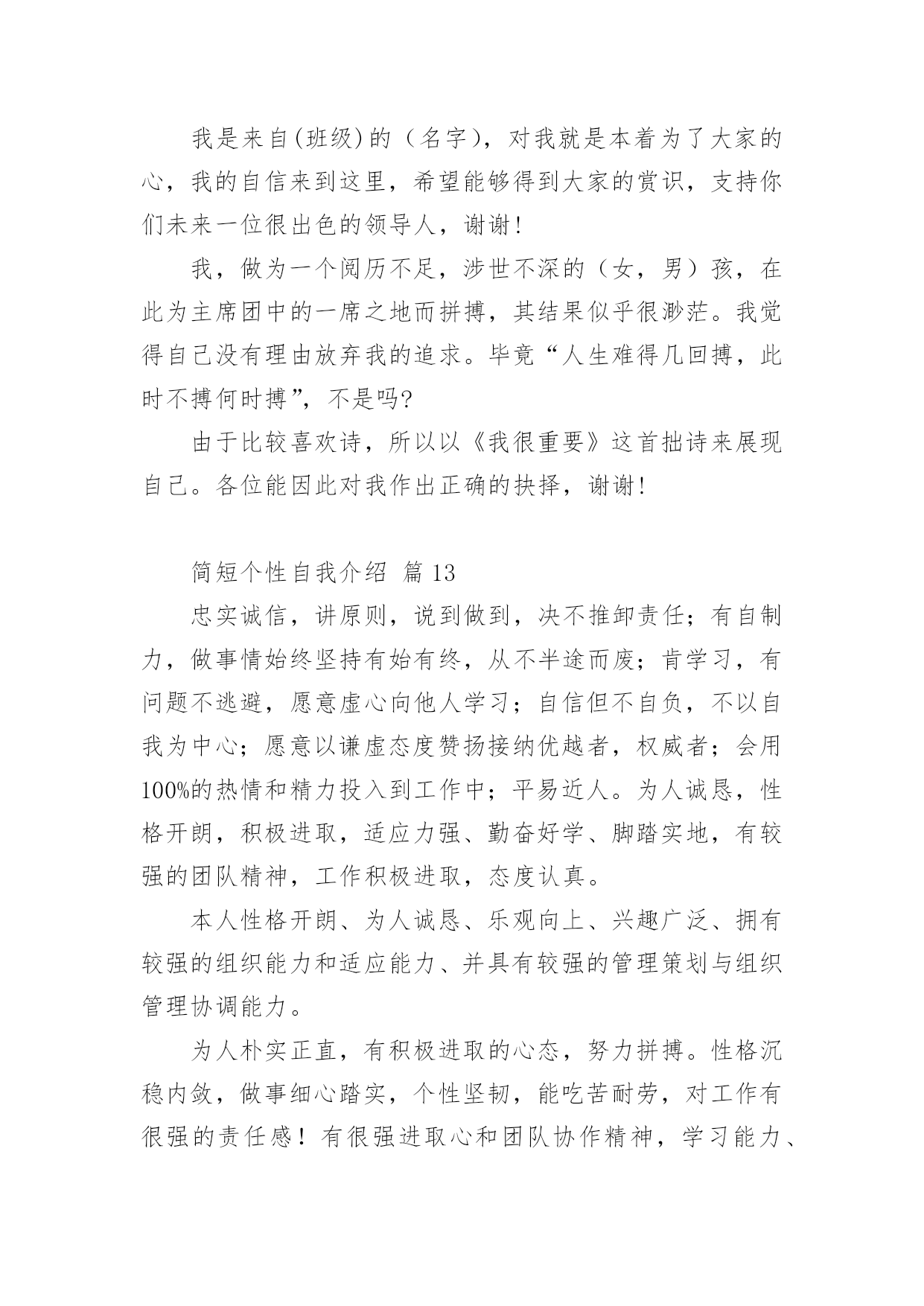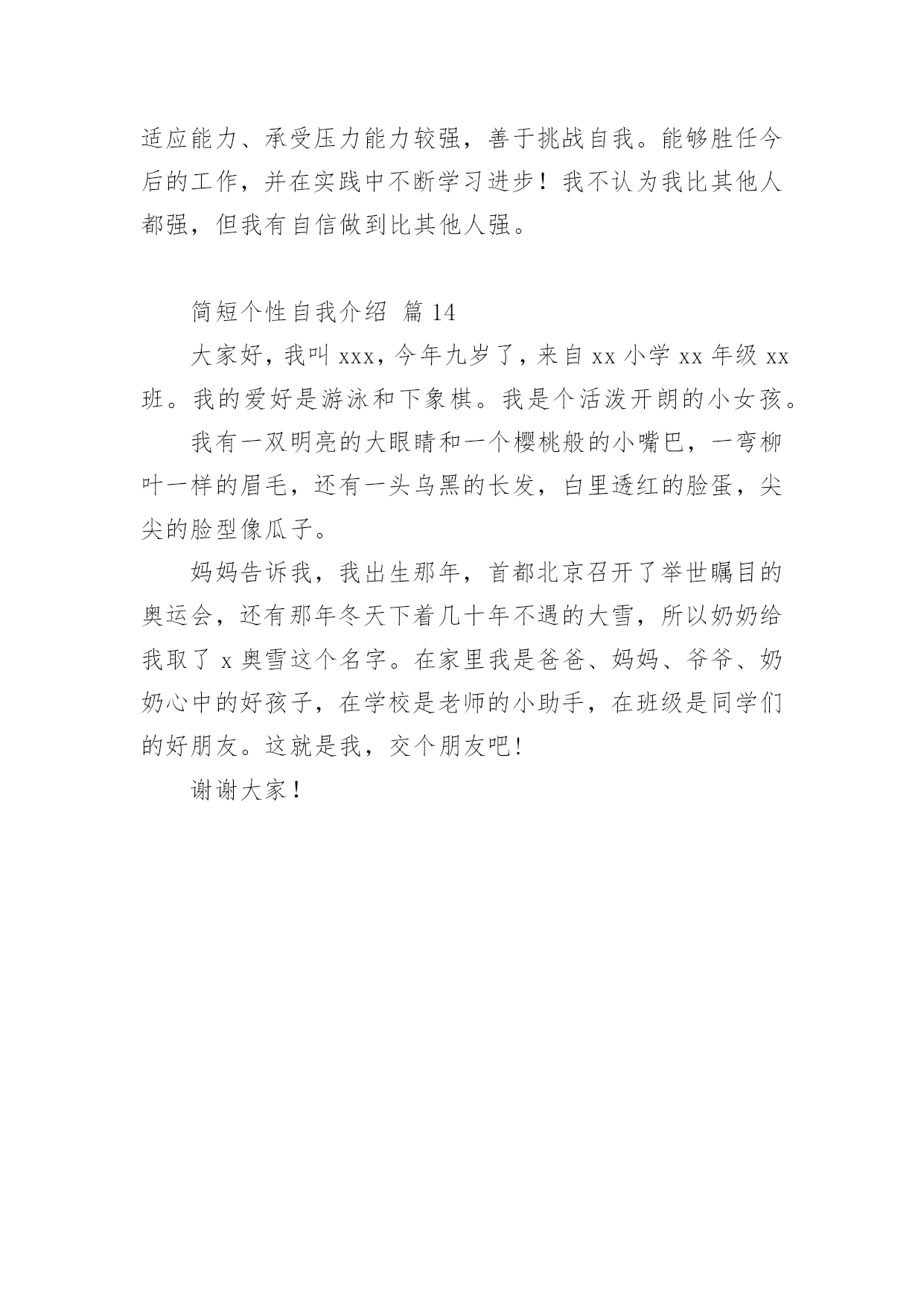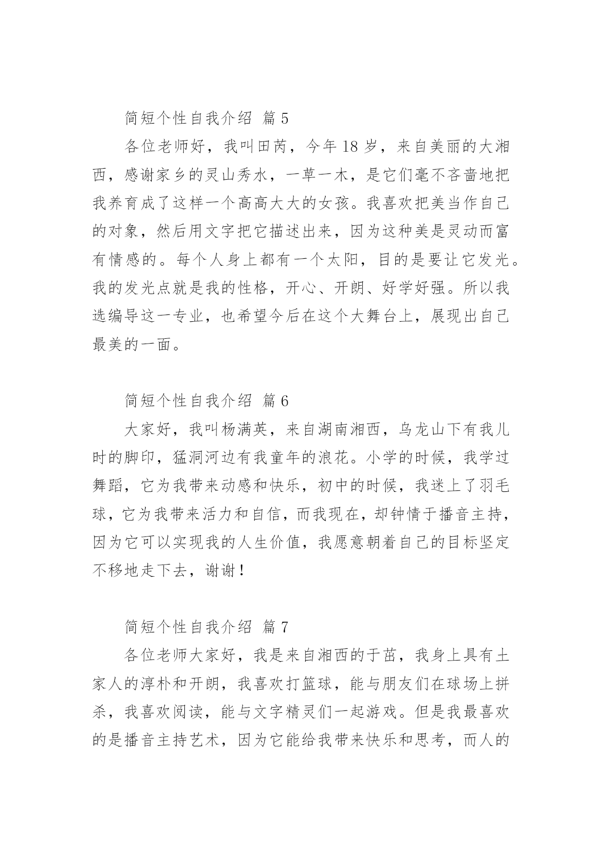 简短个性自我介绍简短个性自我介绍(通用14篇)初到一个新的环境,通常需要我们进行自我介绍,自我介绍是人与人进行沟通的出发点。那要怎么写好自我介绍呢?下面是小编精心整理的简短个性自我介绍,希望能够帮助到大家。简短个性自我介绍篇1大家好!此刻站在你们面前的女孩是不是让大家有眼前一亮的感觉呢?没错,不要怀疑你们的眼光,这就是我——王畅,三横一竖的“王”,“天朗气清,惠风和畅”的“畅”。我来自大湘西。别看我嘴皮子厚,但我却擅长言论,喜欢在各种场合表达自己的观点和思想,就像一部电影里的对白:“你想要什么,想干什么要说出来,你不说我们怎么知道呢?”所以选择主持人这一行业,是我一直以来的梦想,希望大家喜欢我认可我。谢谢!简短个性自我介绍篇2我是来自山东的xxx,大家所看到的我的内在就像我的外表一样,敦厚和实在是我对自己最好的概括。我不飘,不浮,不躁,不懒。我内心充实,物质享乐和精神刺激都不是我的嗜好。我待人诚实,从没有花言巧语,但真诚和厚道使我总能赢得朋友的信赖。我专业扎实,看书是我最大的享受,钻研电脑让我感觉其乐无穷。我做事踏实,再小的事情我也要一丝不苟地完成。我会修电脑,能管网络,网络经营和网上销售也没问题。重要的是,我有一种执著钻研的精神,一种不弄明白绝不罢休的颈头。我叫春雨,春天的雨润物细无声,我希望我能默默无闻地、悄无声息地给我的团队装一点点绿色。给我一个机会,我会给您一个惊喜。我叫xx,今年十三岁,刚上初二。我个子中等,1,66,再班里排第十个,长脸短鼻子,手大脚也大,一双眼睛不大也不小,眼珠子特别有神,一张大嘴巴特别能说,只要一说起来,说上一个小时也没问题,个子不高不矮,身体不胖不瘦。总的来说还是比较帅的。我在北京市xx中上学,我们的校服不好看,全是兰色,所以特别好认,一看就是中学生。我的优点就是爱动,每天早上我都到外面锻炼,跑跑步,玩玩单杠等,所以,我在学校的体育特别好,我的学习也是不可质疑的,数学考试从来没下过90分,我的英语也不错。所以,我的脸上总是洋溢者喜悦的表情。我的缺点就是不会打篮球,也不知到是怎么一回事,就是不喜欢,而且,我上课还总走神,不注意听讲。所以,老师叫我后,我还满有信心的站起来,百分之八十都是对的,害的老师又气又笑。这就是我,只要一见到我,我总是笑,我会热情的和你打招呼,来吧!简短个性自我介绍篇3我是一个活泼开朗的小女孩,我性格随和,下课后总能听到我愉快的笑声。我下课后有时会帮成绩不好的同学讲一下题,我还会帮助别人做我应该做的事。我觉得帮助别人自己也会觉得高兴的!我是一个班干部,在班上我管的纪律井井有条。我的组织能力很强,有时侯我会带着同学们开展一些有益的活动。我还把本班的少先队员的工作做得有声有色呢!我的特长是弹琴、跳舞、书法。我从小就学弹琴,现在弹得还是算好的哟!我还学过跳舞,我学了3、4年了。我还在重庆的艺校去考了舞蹈4级的证书。我的书法是最棒的,我在班上写的字是最好的呢!这就是我!一个大方开朗的小女孩!简短个性自我介绍篇4我是一个普通的女生,没有傲人的成绩,也没有精致的容貌,但我有可爱的笑容。我爱在闲暇时听一段音乐,或是用笔尖触碰那精美的纸张,在上面留下我的记忆。不仅如此,我还擅长游泳,掷铁饼等等,其实我还有一个梦,就是当一名考古学家,去探究历史的沧桑,当一名心理学家,去触碰心底那根琴弦。相信我,给我一个舞台,我定会舞出一片精彩~~~简短个性自我介绍篇5各位老师好,我叫田芮,今年l8岁,来自美丽的大湘西,感谢家乡的灵山秀水,一草一木,是它们毫不吝啬地把我养育成了这样一个高高大大的女孩。我喜欢把美当作自己的对象,然后用文字把它描述出来,因为这种美是灵动而富有情感的。每个人身上都有一个太阳,目的是要让它发光。我的发光点就是我的性格,开心、开朗、好学好强。所以我选编导这一专业,也希望今后在这个大舞台上,展现出自己最美的一面。简短个性自我介绍篇6大家好,我叫杨满英,来自湖南湘西,乌龙山下有我儿时的脚印,猛洞河边有我童年的浪花。小学的时候,我学过舞蹈,它为我带来动感和快乐,初中的时候,我迷上了羽毛球,它为我带来活力和自信,而我现在,却钟情于播音主持,因为它可以实现我的人生价值,我愿意朝着自己的目标坚定不移地走下去,谢谢!简短个性自我介绍篇7各位老师大家好,我是来自湘西的于茁,我身上具有土家人的淳朴和开朗,我喜欢打篮球,能与朋友们在球场上拼杀,我喜欢阅读,能与文字精灵们一起游戏。但是我最喜欢的是播音主持艺术,因为它能给我带来快乐和思考,而人的一生不能没有快乐,也不能没有思考,所以我决定选择这个专业,我愿意接受各位老师的检阅和评判。谢谢!简短个性自我介绍篇8我叫xx,毕业于xx大学。在学校期间,主修的专业课是xx。根据所学的知识,参加过一些具体项目,比如学院独有的精品课xx,在其中负责xx主模块,担任xx