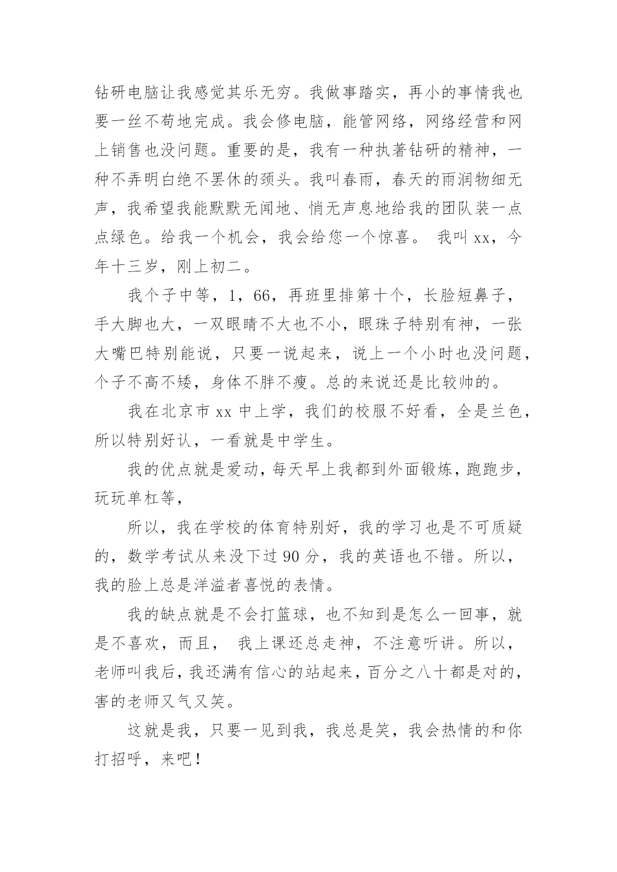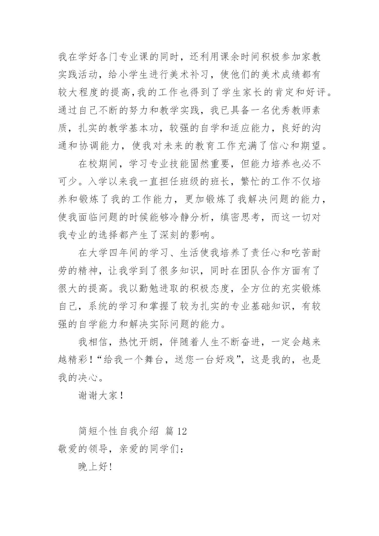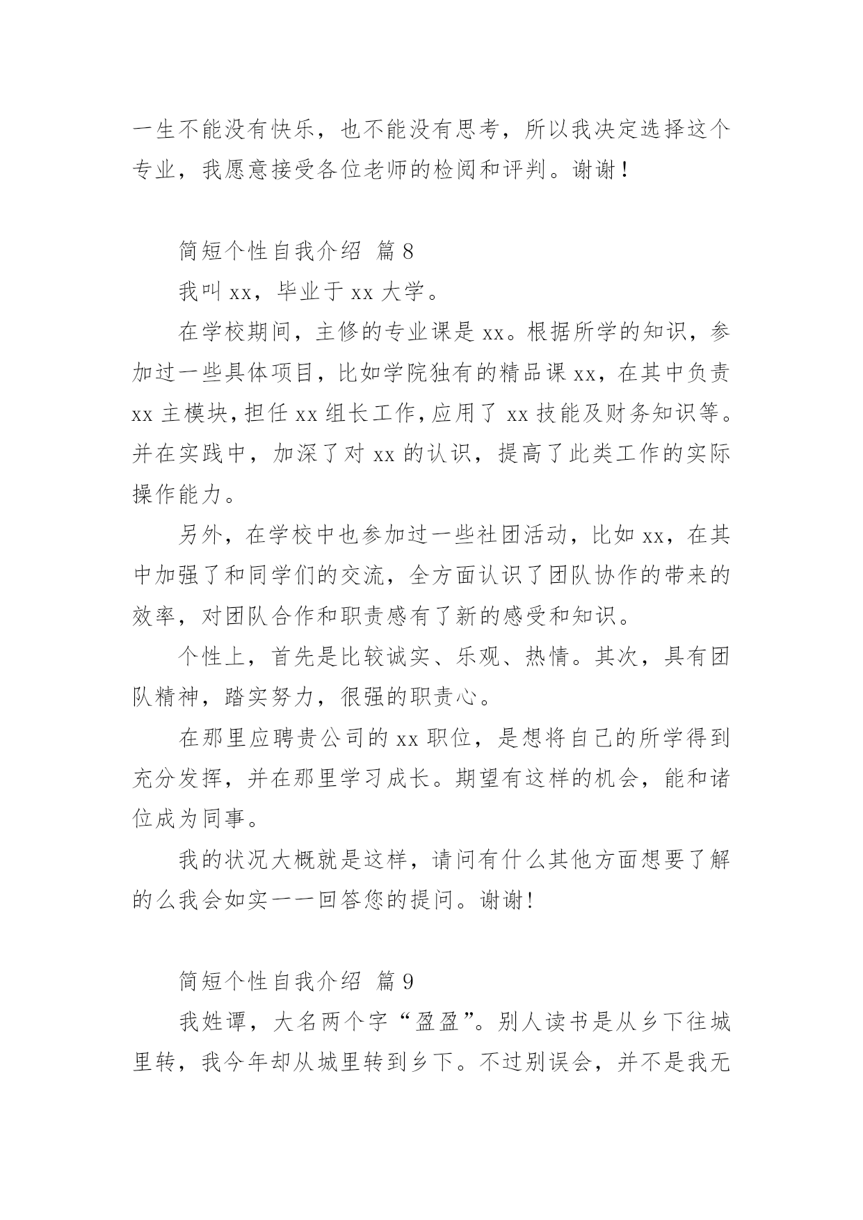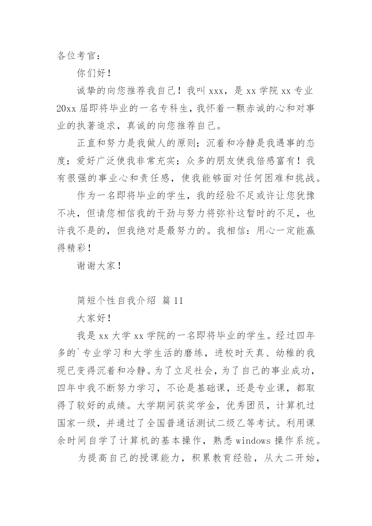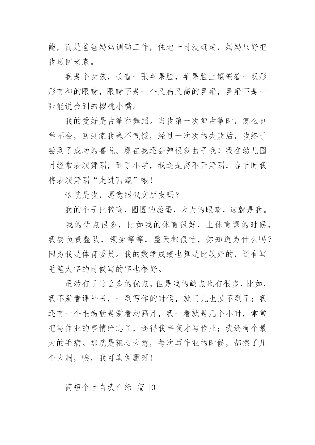 简短个性自我介绍简短个性自我介绍(通用14篇)初到一个新的环境,通常需要我们进行自我介绍,自我介绍是人与人进行沟通的出发点。那要怎么写好自我介绍呢?下面是小编精心整理的简短个性自我介绍,希望能够帮助到大家。简短个性自我介绍篇1大家好!此刻站在你们面前的女孩是不是让大家有眼前一亮的感觉呢?没错,不要怀疑你们的眼光,这就是我——王畅,三横一竖的“王”,“天朗气清,惠风和畅”的“畅”。我来自大湘西。别看我嘴皮子厚,但我却擅长言论,喜欢在各种场合表达自己的观点和思想,就像一部电影里的对白:“你想要什么,想干什么要说出来,你不说我们怎么知道呢?”所以选择主持人这一行业,是我一直以来的梦想,希望大家喜欢我认可我。谢谢!简短个性自我介绍篇2我是来自山东的xxx,大家所看到的我的内在就像我的外表一样,敦厚和实在是我对自己最好的概括。我不飘,不浮,不躁,不懒。我内心充实,物质享乐和精神刺激都不是我的嗜好。我待人诚实,从没有花言巧语,但真诚和厚道使我总能赢得朋友的信赖。我专业扎实,看书是我最大的享受,钻研电脑让我感觉其乐无穷。我做事踏实,再小的事情我也要一丝不苟地完成。我会修电脑,能管网络,网络经营和网上销售也没问题。重要的是,我有一种执著钻研的精神,一种不弄明白绝不罢休的颈头。我叫春雨,春天的雨润物细无声,我希望我能默默无闻地、悄无声息地给我的团队装一点点绿色。给我一个机会,我会给您一个惊喜。我叫xx,今年十三岁,刚上初二。我个子中等,1,66,再班里排第十个,长脸短鼻子,手大脚也大,一双眼睛不大也不小,眼珠子特别有神,一张大嘴巴特别能说,只要一说起来,说上一个小时也没问题,个子不高不矮,身体不胖不瘦。总的来说还是比较帅的。我在北京市xx中上学,我们的校服不好看,全是兰色,所以特别好认,一看就是中学生。我的优点就是爱动,每天早上我都到外面锻炼,跑跑步,玩玩单杠等,所以,我在学校的体育特别好,我的学习也是不可质疑的,数学考试从来没下过90分,我的英语也不错。所以,我的脸上总是洋溢者喜悦的表情。我的缺点就是不会打篮球,也不知到是怎么一回事,就是不喜欢,而且,我上课还总走神,不注意听讲。所以,老师叫我后,我还满有信心的站起来,百分之八十都是对的,害的老师又气又笑。这就是我,只要一见到我,我总是笑,我会热情的和你打招呼,来吧!简短个性自我介绍篇3我是一个活泼开朗的小女孩,我性格随和,下课后总能听到我愉快的笑声。我下课后有时会帮成绩不好的同学讲一下题,我还会帮助别人做我应该做的事。我觉得帮助别人自己也会觉得高兴的!我是一个班干部,在班上我管的纪律井井有条。我的组织能力很强,有时侯我会带着同学们开展一些有益的活动。我还把本班的少先队员的工作做得有声有色呢!我的特长是弹琴、跳舞、书法。我从小就学弹琴,现在弹得还是算好的哟!我还学过跳舞,我学了3、4年了。我还在重庆的艺校去考了舞蹈4级的证书。我的书法是最棒的,我在班上写的字是最好的呢!这就是我!一个大方开朗的小女孩!简短个性自我介绍篇4我是一个普通的女生,没有傲人的成绩,也没有精致的容貌,但我有可爱的笑容。我爱在闲暇时听一段音乐,或是用笔尖触碰那精美的纸张,在上面留下我的记忆。不仅如此,我还擅长游泳,掷铁饼等等,其实我还有一个梦,就是当一名考古学家,去探究历史的沧桑,当一名心理学家,去触碰心底那根琴弦。相信我,给我一个舞台,我定会舞出一片精彩~~~简短个性自我介绍篇5各位老师好,我叫田芮,今年l8岁,来自美丽的大湘西,感谢家乡的灵山秀水,一草一木,是它们毫不吝啬地把我养育成了这样一个高高大大的女孩。我喜欢把美当作自己的对象,然后用文字把它描述出来,因为这种美是灵动而富有情感的。每个人身上都有一个太阳,目的是要让它发光。我的发光点就是我的性格,开心、开朗、好学好强。所以我选编导这一专业,也希望今后在这个大舞台上,展现出自己最美的一面。简短个性自我介绍篇6大家好,我叫杨满英,来自湖南湘西,乌龙山下有我儿时的脚印,猛洞河边有我童年的浪花。小学的时候,我学过舞蹈,它为我带来动感和快乐,初中的时候,我迷上了羽毛球,它为我带来活力和自信,而我现在,却钟情于播音主持,因为它可以实现我的人生价值,我愿意朝着自己的目标坚定不移地走下去,谢谢!简短个性自我介绍篇7各位老师大家好,我是来自湘西的于茁,我身上具有土家人的淳朴和开朗,我喜欢打篮球,能与朋友们在球场上拼杀,我喜欢阅读,能与文字精灵们一起游戏。但是我最喜欢的是播音主持艺术,因为它能给我带来快乐和思考,而人的一生不能没有快乐,也不能没有思考,所以我决定选择这个专业,我愿意接受各位老师的检阅和评判。谢谢!简短个性自我介绍篇8我叫xx,毕业于xx大学。在学校期间,主修的专业课是xx。根据所学的知识,参加过一些具体项目,比如学院独有的精品课xx,在其中负责xx主模块,担任xx