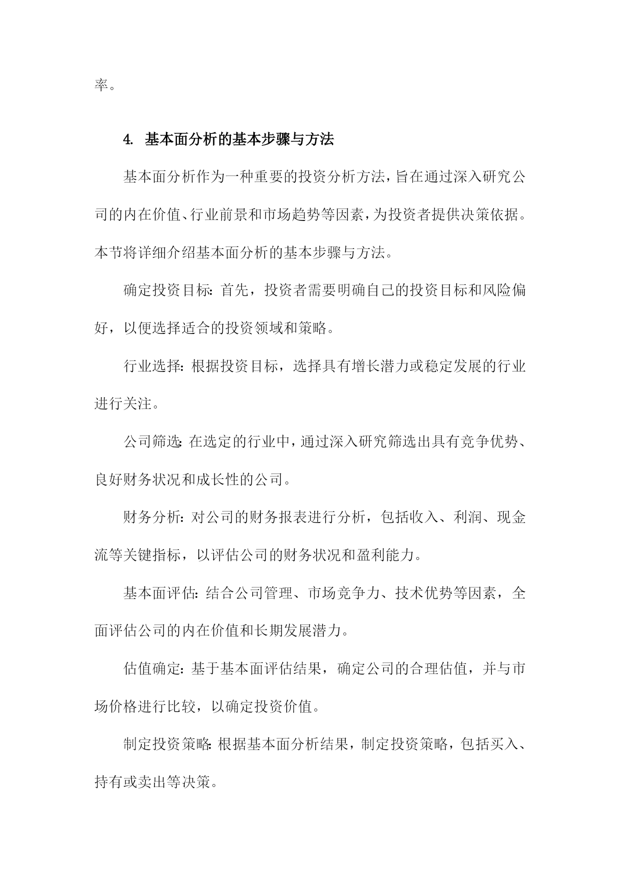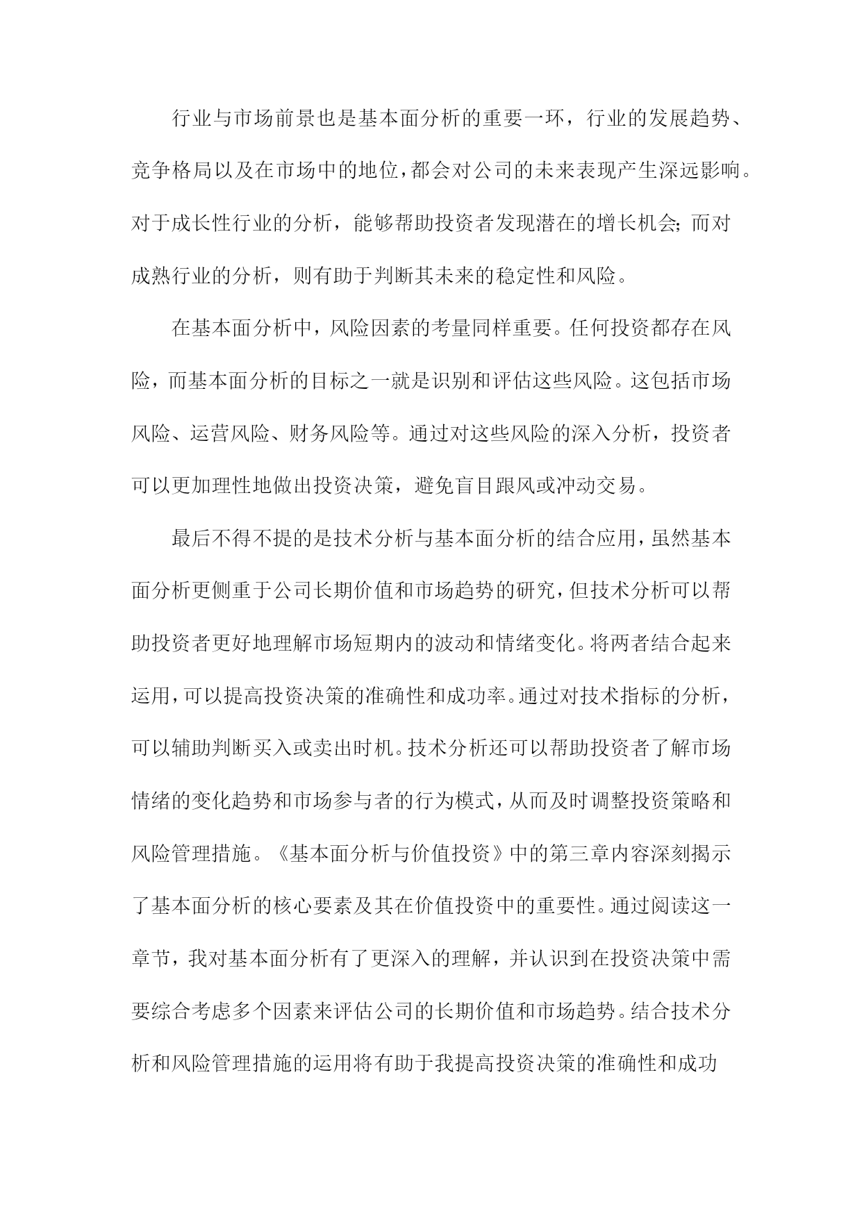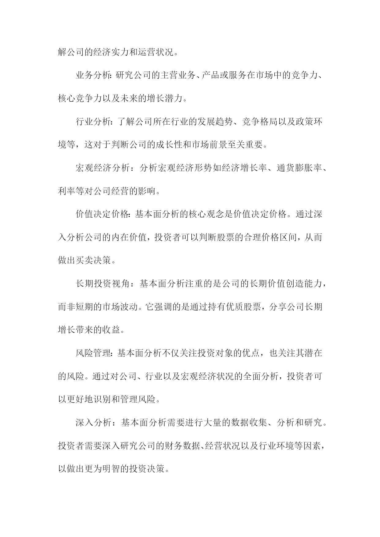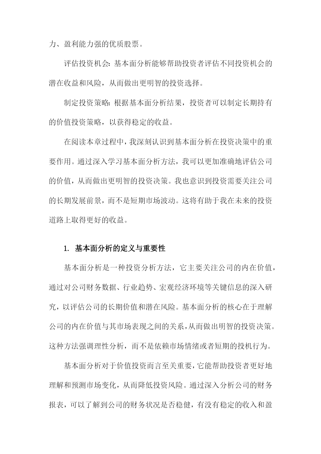 《基本面分析与价值投资》读书记录一、书籍基本信息书籍简介:《基本面分析与价值投资》是一本关于投资领域的专业书籍,主要介绍了基本面分析的基本概念、方法和技巧,以及价值投资的理念和策略。本书旨在帮助投资者提高投资决策的准确性和成功率,通过深入分析公司的基本面,寻找具有长期增长潜力的优质股票,以实现资产增值。书中内容丰富,涵盖了基本面分析的基础理论知识,以及实际案例分析,适合投资者、金融从业者、经济学者等专业人士阅读和学习。1.书籍名称:《基本面分析与价值投资》在我探索投资世界的旅程中,我选择了阅读《基本面分析与价值投资》以期更深入地理解价值投资的理念和方法。这本书详细阐述了基本面分析的重要性以及其在投资决策中的应用,帮助我对价值投资有了更为清晰的认识。在阅读这本书的过程中,我收获颇丰,对投资有了全新的理解。我将记录我的读书感受和学习心得。2.作者信息:包括作者姓名、职务及主要成就等职务:资深金融分析师和投资顾问。张三先生拥有多年的金融行业从业经验,曾在国内外知名投资机构担任核心职位,专注于基本面分析与价值投资策略的研究和实践。他在投资领域的成果丰富,不仅撰写了众多专业论文,更是取得了不少卓越的实战业绩。凭借着扎实的理论功底和丰富的实战经验,张三先生在投资领域备受瞩目。他不仅对价值投资有深入的研究和理解,同时对于宏观经济、政策环境等方面也有独到的见解。他不仅注重个人投资的精细化分析,还擅长团队管理和人才培养,曾多次带领投资团队取得骄人的业绩。在业内享有极高的声誉和影响力,其主要成就包括撰写多本关于基本面分析与价值投资的著作,引领无数投资者在股市投资中获得稳定回报,为中国价值投资理念的发展和普及做出了巨大贡献。他还担任国内外多家知名高校金融学院的客座教授或特邀讲师,分享自己的投资经验和理念,帮助更多投资者掌握基本面分析与价值投资的方法和技巧。3.出版信息:包括出版社名称、出版年份等出版信息:包括出版社名称、出版年份等。这本书由XX出版社出版,于年发行。XX出版社是国内知名的财经类图书出版机构,多年来致力于金融投资领域的书籍出版,拥有丰富的出版经验和广泛的读者群体。而此书作为该出版社推出的力作,以其系统的基本面分析理论和对价值投资的深入解读,吸引了广大投资者的关注,成为了金融投资领域的热门读物之一。出版年份较新,体现了该书的时效性和前沿性,反映了当前市场环境和投资趋势的最新变化。二、第一章:基本面分析概述在阅读《基本面分析与价值投资》的第一章时,我对基本面分析有了更深入的了解。这一章节主要介绍了基本面分析的基本概念、重要性及其在投资决策中的应用。基本面分析是一种长期投资分析方法,主要关注公司的内在价值。它强调通过研究公司的财务状况、市场定位、管理团队、竞争优势和行业趋势等因素来评估公司的价值。基本面分析旨在寻找被市场低估的优质股票,并长期持有,以获取稳定的收益。评估公司真实价值:通过深入分析公司的财务数据、业务模式和市场环境等因素,基本面分析能够帮助投资者更准确地评估公司的真实价值,从而做出更明智的投资决策。预测公司未来发展:基本面分析不仅关注公司的历史表现,还注重对其未来的预测。通过对行业趋势、竞争格局和管理团队的能力等因素的分析,投资者可以预测公司未来的发展前景。降低投资风险:基本面分析能够帮助投资者识别潜在的风险因素,从而避免投资陷阱。通过对公司的财务状况、债务水平、管理层诚信等因素的深入调查,投资者可以更加谨慎地选择投资标的,降低投资风险。筛选投资标的:通过基本面分析,投资者可以筛选出具有成长潜力、盈利能力强的优质股票。评估投资机会:基本面分析能够帮助投资者评估不同投资机会的潜在收益和风险,从而做出更明智的投资选择。制定投资策略:根据基本面分析结果,投资者可以制定长期持有的价值投资策略,以获得稳定的收益。在阅读本章过程中,我深刻认识到基本面分析在投资决策中的重要作用。通过深入学习基本面分析方法,我可以更加准确地评估公司的价值,从而做出更明智的投资决策。我也意识到投资需要关注公司的长期发展前景,而不是短期市场波动。这将有助于我在未来的投资道路上取得更好的收益。1.基本面分析的定义与重要性基本面分析是一种投资分析方法,它主要关注公司的内在价值,通过对公司财务数据、行业趋势、宏观经济环境等关键信息的深入研究,以评估公司的长期价值和潜在风险。基本面分析的核心在于理解公司的内在价值与其市场表现之间的关系,从而做出明智的投资决策。这种方法强调理性分析,而不是依赖市场情绪或者短期的投机行为。基本面分析对于价值投资而言至关重要,它能帮助投资者更好地理解和预测市场变化,从而降低投资风险。通过深入分析公司的财务报表,可以了解到公司的财务状况是否稳健,有没有稳定的收入和盈利能力,以及负债水平是否合理等。这些因