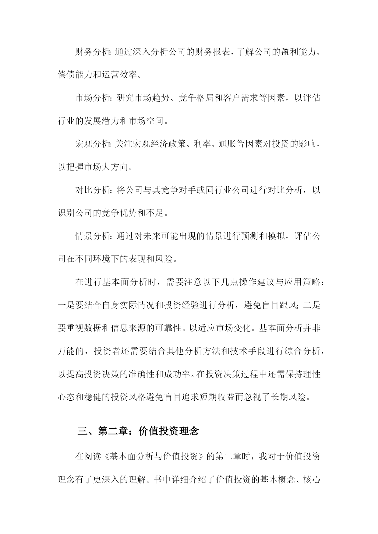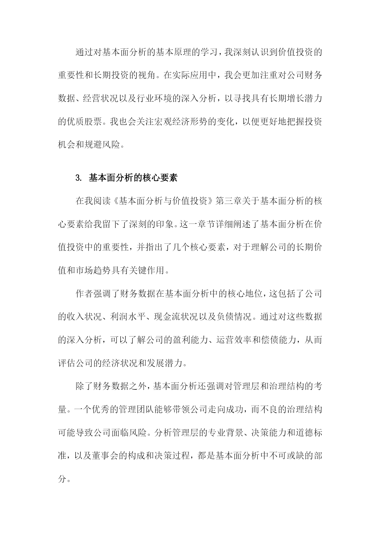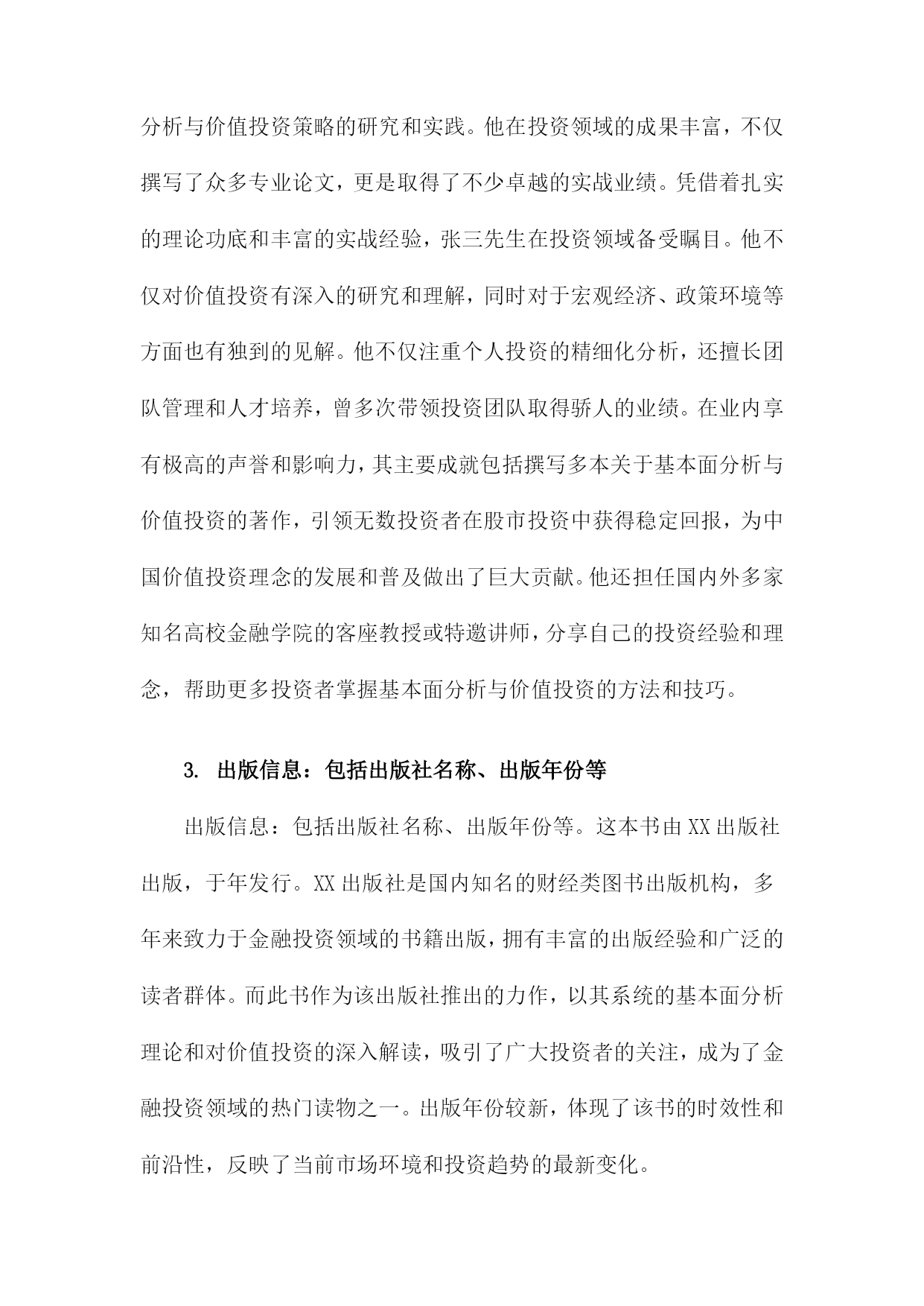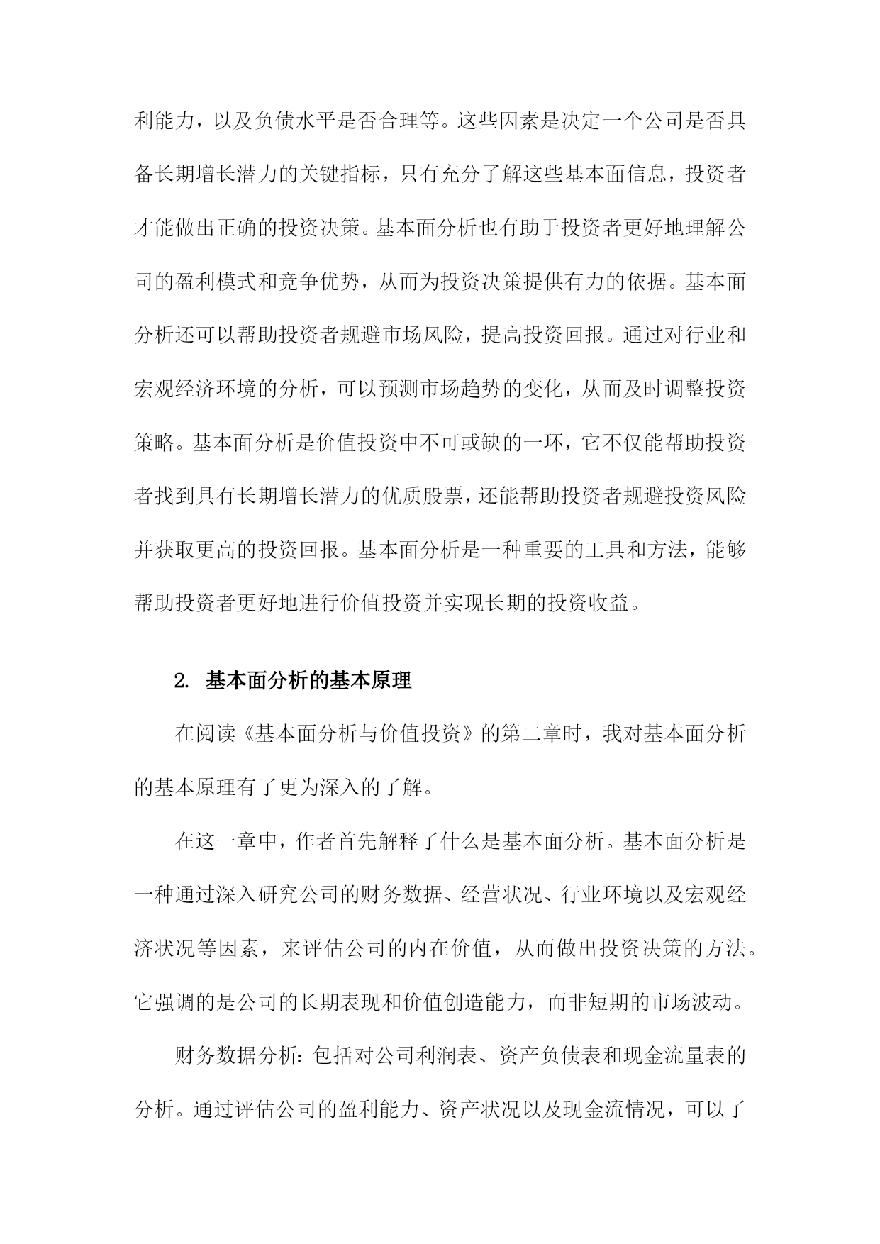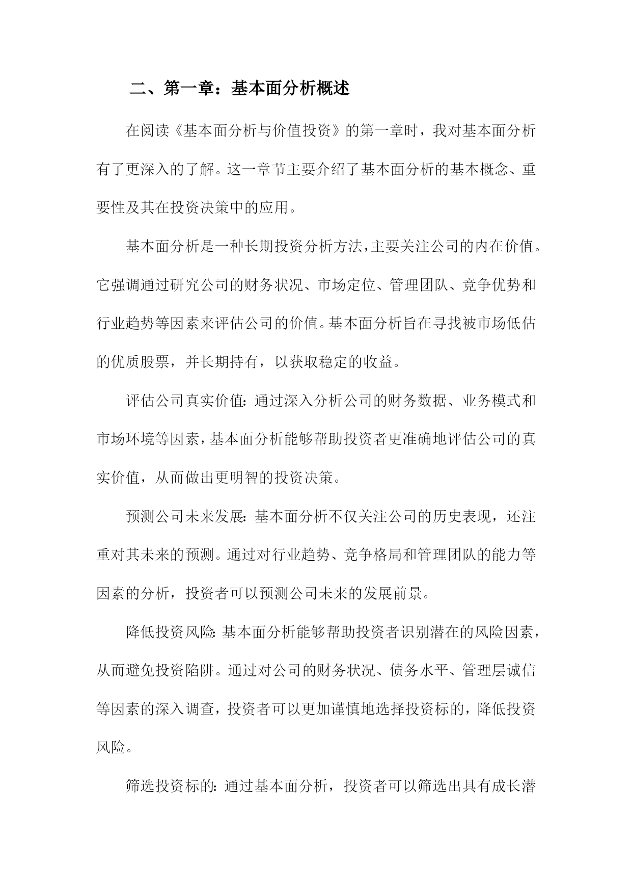 《基本面分析与价值投资》读书记录一、书籍基本信息书籍简介:《基本面分析与价值投资》是一本关于投资领域的专业书籍,主要介绍了基本面分析的基本概念、方法和技巧,以及价值投资的理念和策略。本书旨在帮助投资者提高投资决策的准确性和成功率,通过深入分析公司的基本面,寻找具有长期增长潜力的优质股票,以实现资产增值。书中内容丰富,涵盖了基本面分析的基础理论知识,以及实际案例分析,适合投资者、金融从业者、经济学者等专业人士阅读和学习。1.书籍名称:《基本面分析与价值投资》在我探索投资世界的旅程中,我选择了阅读《基本面分析与价值投资》以期更深入地理解价值投资的理念和方法。这本书详细阐述了基本面分析的重要性以及其在投资决策中的应用,帮助我对价值投资有了更为清晰的认识。在阅读这本书的过程中,我收获颇丰,对投资有了全新的理解。我将记录我的读书感受和学习心得。2.作者信息:包括作者姓名、职务及主要成就等职务:资深金融分析师和投资顾问。张三先生拥有多年的金融行业从业经验,曾在国内外知名投资机构担任核心职位,专注于基本面分析与价值投资策略的研究和实践。他在投资领域的成果丰富,不仅撰写了众多专业论文,更是取得了不少卓越的实战业绩。凭借着扎实的理论功底和丰富的实战经验,张三先生在投资领域备受瞩目。他不仅对价值投资有深入的研究和理解,同时对于宏观经济、政策环境等方面也有独到的见解。他不仅注重个人投资的精细化分析,还擅长团队管理和人才培养,曾多次带领投资团队取得骄人的业绩。在业内享有极高的声誉和影响力,其主要成就包括撰写多本关于基本面分析与价值投资的著作,引领无数投资者在股市投资中获得稳定回报,为中国价值投资理念的发展和普及做出了巨大贡献。他还担任国内外多家知名高校金融学院的客座教授或特邀讲师,分享自己的投资经验和理念,帮助更多投资者掌握基本面分析与价值投资的方法和技巧。3.出版信息:包括出版社名称、出版年份等出版信息:包括出版社名称、出版年份等。这本书由XX出版社出版,于年发行。XX出版社是国内知名的财经类图书出版机构,多年来致力于金融投资领域的书籍出版,拥有丰富的出版经验和广泛的读者群体。而此书作为该出版社推出的力作,以其系统的基本面分析理论和对价值投资的深入解读,吸引了广大投资者的关注,成为了金融投资领域的热门读物之一。出版年份较新,体现了该书的时效性和前沿性,反映了当前市场环境和投资趋势的最新变化。二、第一章:基本面分析概述在阅读《基本面分析与价值投资》的第一章时,我对基本面分析有了更深入的了解。这一章节主要介绍了基本面分析的基本概念、重要性及其在投资决策中的应用。基本面分析是一种长期投资分析方法,主要关注公司的内在价值。它强调通过研究公司的财务状况、市场定位、管理团队、竞争优势和行业趋势等因素来评估公司的价值。基本面分析旨在寻找被市场低估的优质股票,并长期持有,以获取稳定的收益。评估公司真实价值:通过深入分析公司的财务数据、业务模式和市场环境等因素,基本面分析能够帮助投资者更准确地评估公司的真实价值,从而做出更明智的投资决策。预测公司未来发展:基本面分析不仅关注公司的历史表现,还注重对其未来的预测。通过对行业趋势、竞争格局和管理团队的能力等因素的分析,投资者可以预测公司未来的发展前景。降低投资风险:基本面分析能够帮助投资者识别潜在的风险因素,从而避免投资陷阱。通过对公司的财务状况、债务水平、管理层诚信等因素的深入调查,投资者可以更加谨慎地选择投资标的,降低投资风险。筛选投资标的:通过基本面分析,投资者可以筛选出具有成长潜力、盈利能力强的优质股票。评估投资机会:基本面分析能够帮助投资者评估不同投资机会的潜在收益和风险,从而做出更明智的投资选择。制定投资策略:根据基本面分析结果,投资者可以制定长期持有的价值投资策略,以获得稳定的收益。在阅读本章过程中,我深刻认识到基本面分析在投资决策中的重要作用。通过深入学习基本面分析方法,我可以更加准确地评估公司的价值,从而做出更明智的投资决策。我也意识到投资需要关注公司的长期发展前景,而不是短期市场波动。这将有助于我在未来的投资道路上取得更好的收益。1.基本面分析的定义与重要性基本面分析是一种投资分析方法,它主要关注公司的内在价值,通过对公司财务数据、行业趋势、宏观经济环境等关键信息的深入研究,以评估公司的长期价值和潜在风险。基本面分析的核心在于理解公司的内在价值与其市场表现之间的关系,从而做出明智的投资决策。这种方法强调理性分析,而不是依赖市场情绪或者短期的投机行为。基本面分析对于价值投资而言至关重要,它能帮助投资者更好地理解和预测市场变化,从而降低投资风险。通过深入分析公司的财务报表,可以了解到公司的财务状况是否稳健,有没有稳定的收入和盈利能力,以及负债水平是否合理等。这些因