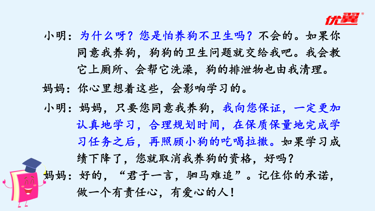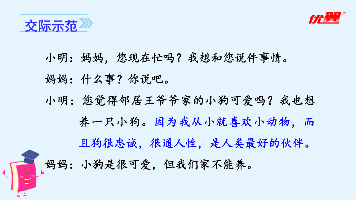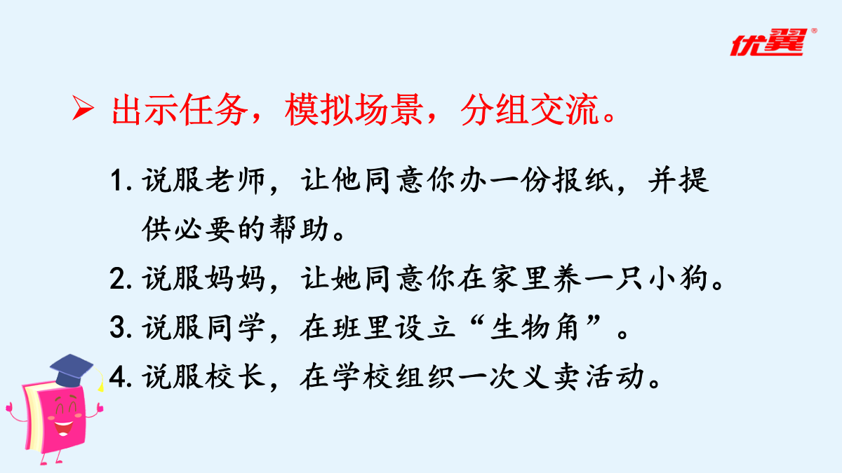 请你支持我大千世界中,没有一个人是孤立存在的,我们每个人都和周围的环境有着千丝万缕的联系。我们的想法、我们的言行举止会影响着周围的人,也会受周围人的影响。本次口语交际的内容是如何说服别人,支持我们去做一件事情。第一步“说服别人”,把自己的想法明确传递给对方。礼貌而诚恳地说明来意。如:请问您(你)现在有时间吗?我想和您(你)谈一件事情。把自己关于这件事情的设想讲清楚。说清楚这件事的起因、目的以及带来的好处。设想可能出现的问题,提供解决的方案,打消对方的疑虑。出示任务,模拟场景,分组交流。小明:妈妈,您现在忙