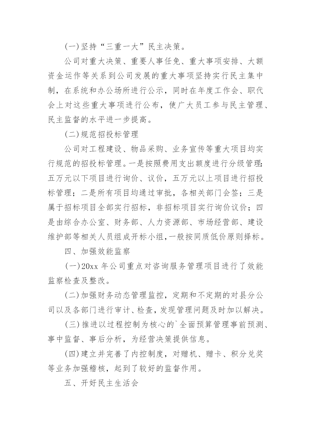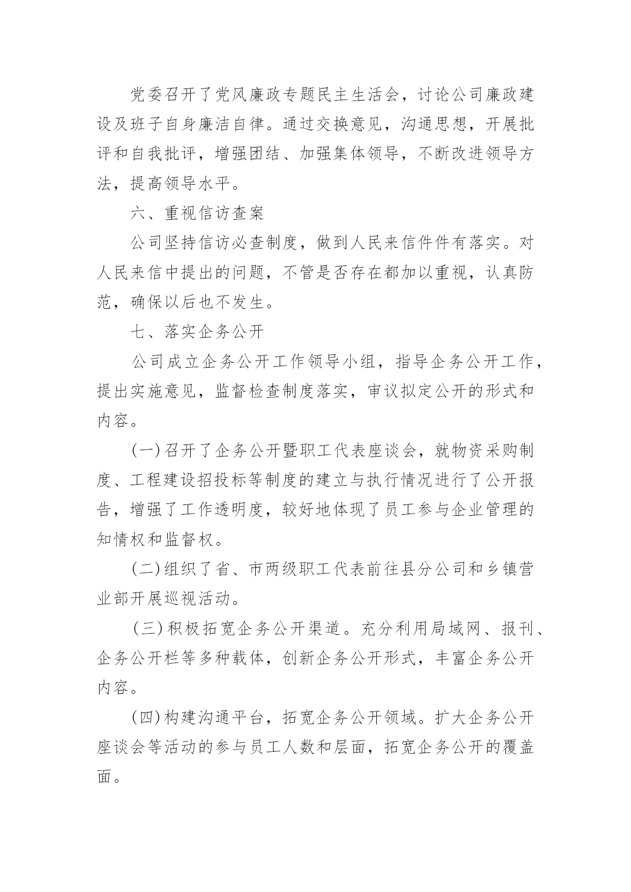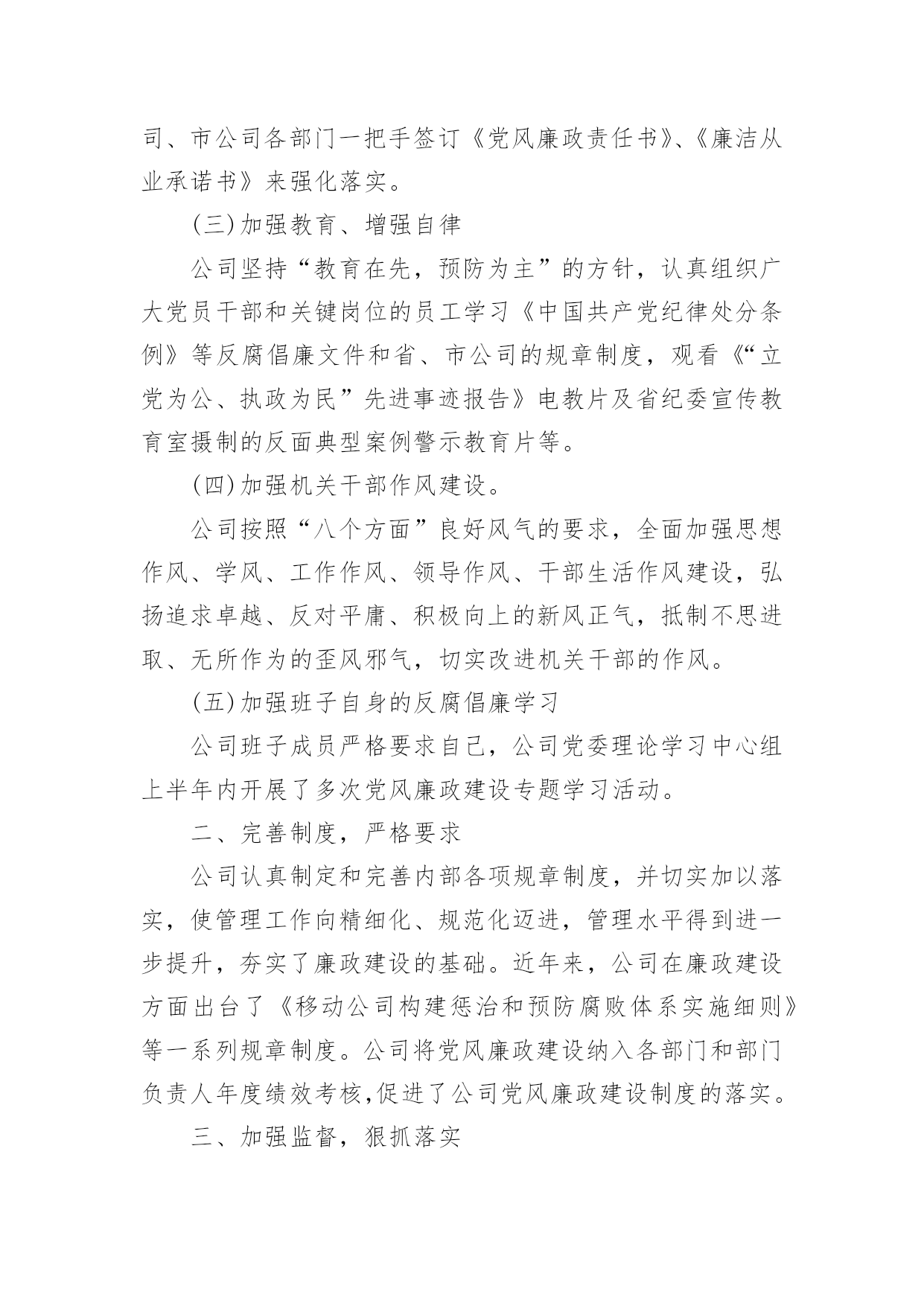 公司工作总结总结是对某一特定时间段内的学习和工作生活等表现情况加以回顾和分析的一种书面材料,它可使零星的、肤浅的、表面的感性认知上升到全面的、系统的、本质的理性认识上来,为此我们要做好回顾,写好总结。那么我们该怎么去写总结呢?以下是小编为大家整理的公司工作总结,欢迎阅读,希望大家能够喜欢。公司工作总结1一、领导重视,责任落实上半年来,移动公司从点滴抓起,从制度建设和思想建设入手,防微杜渐,为公司的改革发展保驾护航。公司领导班子高度重视廉政建设工作,通过开展健全组织机构,加强警示教育、制度建设和监督检查等工作,构建了长效的惩防体系。(一)高度重视、机构健全、人员到位成立了以公司领导为组长、副组长,各部门负责人为成员的党风廉政建设领导小组。公司纪检监察机构健全,人员配备到位。(二)分工明确、责任落实20xx年年初,公司在布置生产经营工作的同时,对党风廉政建设和反腐败工作做出专门部署,明确领导班子和各级领导干部的责任范围和责任内容,市公司总经理和各县分公司、市公司各部门一把手签订《党风廉政责任书》、《廉洁从业承诺书》来强化落实。(三)加强教育、增强自律公司坚持“教育在先,预防为主”的方针,认真组织广大党员干部和关键岗位的员工学习《中国共产党纪律处分条例》等反腐倡廉文件和省、市公司的规章制度,观看《“立党为公、执政为民”先进事迹报告》电教片及省纪委宣传教育室摄制的反面典型案例警示教育片等。(四)加强机关干部作风建设。公司按照“八个方面”良好风气的要求,全面加强思想作风、学风、工作作风、领导作风、干部生活作风建设,弘扬追求卓越、反对平庸、积极向上的新风正气,抵制不思进取、无所作为的歪风邪气,切实改进机关干部的作风。(五)加强班子自身的反腐倡廉学习公司班子成员严格要求自己,公司党委理论学习中心组上半年内开展了多次党风廉政建设专题学习活动。二、完善制度,严格要求公司认真制定和完善内部各项规章制度,并切实加以落实,使管理工作向精细化、规范化迈进,管理水平得到进一步提升,夯实了廉政建设的基础。近年来,公司在廉政建设方面出台了《移动公司构建惩治和预防腐败体系实施细则》等一系列规章制度。公司将党风廉政建设纳入各部门和部门负责人年度绩效考核,促进了公司党风廉政建设制度的落实。三、加强监督,狠抓落实(一)坚持“三重一大”民主决策。公司对重大决策、重要人事任免、重大事项安排、大额资金运作等关系到公司发展的重大事项坚持实行民主集中制,在系统和办公场所进行公示,同时在年度工作会、职代会上对这些重大事项进行公布,使广大员工参与民主管理、民主监督的水平进一步提高。(二)规范招投标管理公司对工程建设、物品采购、业务宣传等重大项目均实行规范的招投标管理。一是按照费用支出额度进行分级管理:五万元以下项目进行询价、议价,五万元以上项目进行招投标管理;二是所有项目均通过审批,各相关部门会签;三是属于招标项目全部实行招标,非招标项目实行询价议价;四是由综合办公室、财务部、人力资源部、市场经营部、建设维护部等相关人员组成开标小组,一般按同质低价原则择标。四、加强效能监察(一)20xx年公司重点对咨询服务管理项目进行了效能监察检查及整改。(二)加强财务动态管理监控,定期和不定期的对县分公司以及各部门进行审计、检查,发现管理问题及时加以解决。(三)推进以过程控制为核心的`全面预算管理事前预测、事中监督、事后分析,为经营决策提供信息。(四)建立并完善了内控制度,对赠机、赠卡、积分兑奖等业务加强稽核,起到了较好的监督作用。五、开好民主生活会党委召开了党风廉政专题民主生活会,讨论公司廉政建设及班子自身廉洁自律。通过交换意见,沟通思想,开展批评和自我批评,增强团结、加强集体领导,不断改进领导方法,提高领导水平。六、重视信访查案公司坚持信访必查制度,做到人民来信件件有落实。对人民来信中提出的问题,不管是否存在都加以重视,认真防范,确保以后也不发生。七、落实企务公开公司成立企务公开工作领导小组,指导企务公开工作,提出实施意见,监督检查制度落实,审议拟定公开的形式和内容。(一)召开了企务公开暨职工代表座谈会,就物资采购制度、工程建设招投标等制度的建立与执行情况进行了公开报告,增强了工作透明度,较好地体现了员工参与企业管理的知情权和监督权。(二)组织了省、市两级职工代表前往县分公司和乡镇营业部开展巡视活动。(三)积极拓宽企务公开渠道。充分利用局域网、报刊、企务公开栏等多种载体,创新企务公开形式,丰富企务公开内容。(四)构建沟通平台,拓宽企务公开领域。扩大企务公开座谈会等活动的参与员工人数和层面,拓宽企务公开的覆盖面。(五)以职代会为主要载体,完善职代会制度。组织职工代表述职,提高职工代表参政议政水平。八、开展廉政建设责任制检查移动公司制定了廉政建设责任制检查办法,严格按照党风党建考核要求对各
