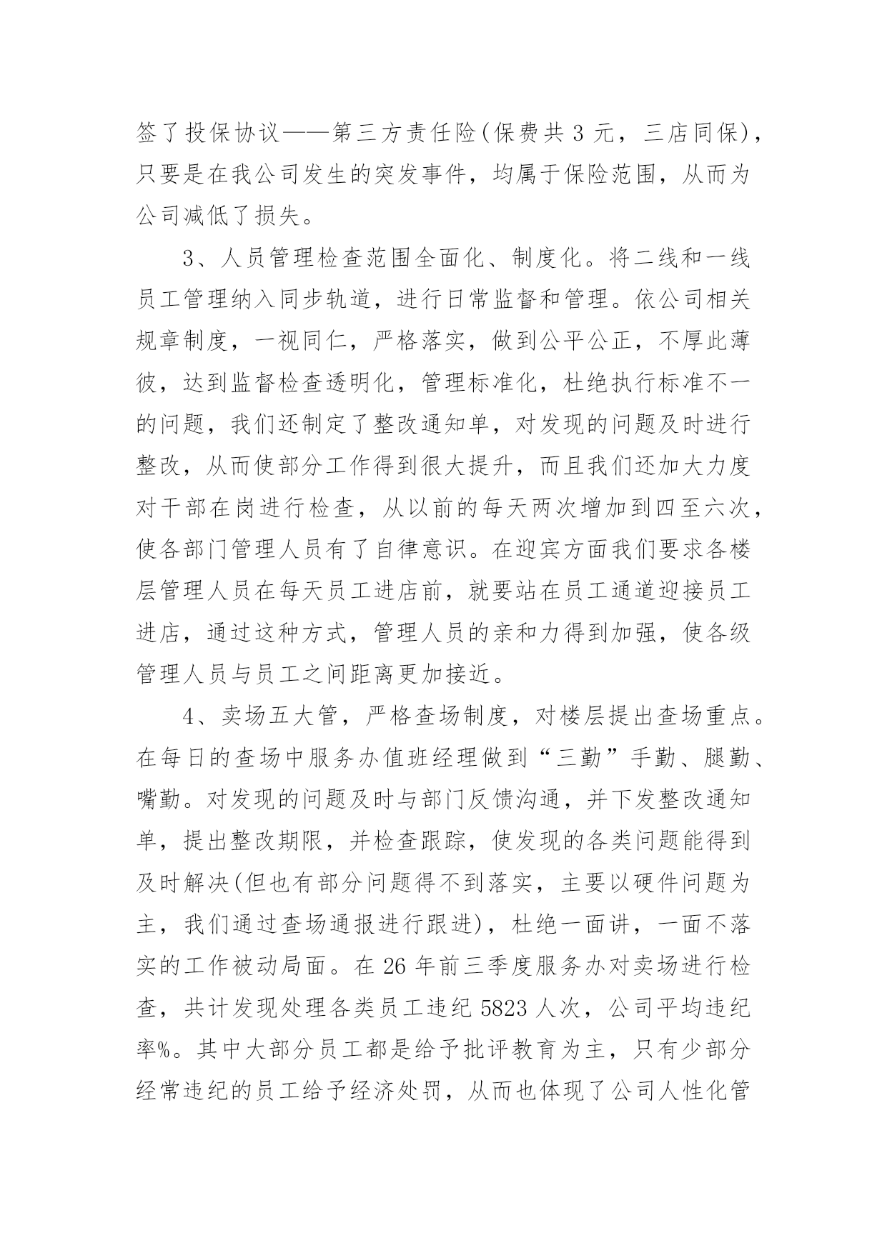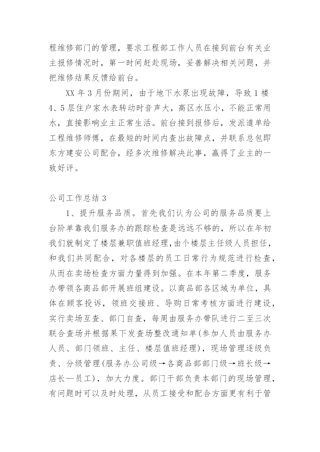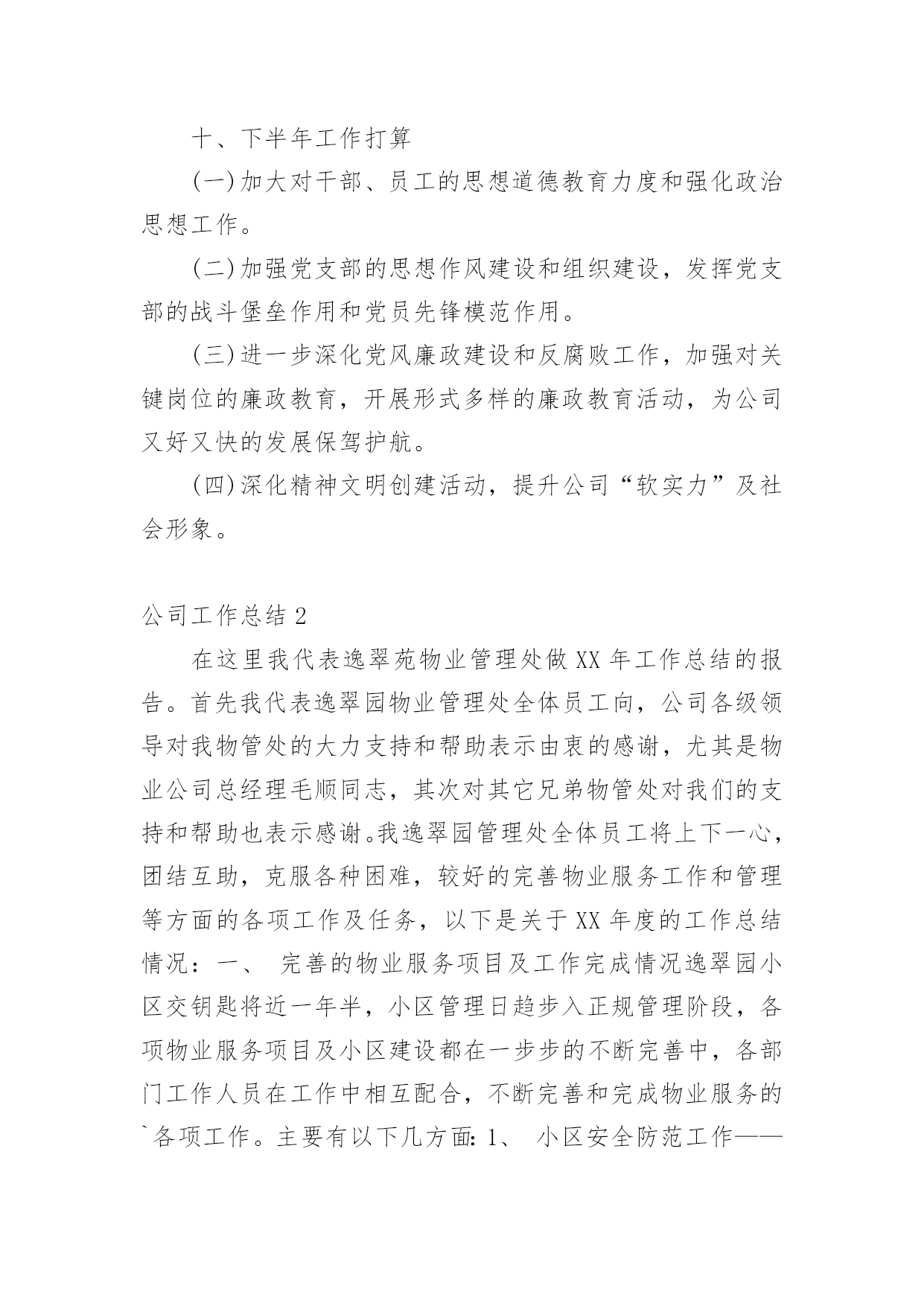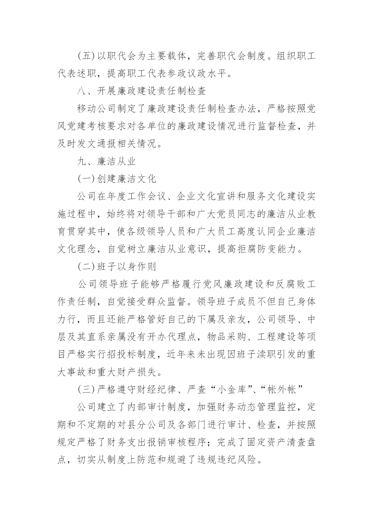 公司工作总结总结是对某一特定时间段内的学习和工作生活等表现情况加以回顾和分析的一种书面材料,它可使零星的、肤浅的、表面的感性认知上升到全面的、系统的、本质的理性认识上来,为此我们要做好回顾,写好总结。那么我们该怎么去写总结呢?以下是小编为大家整理的公司工作总结,欢迎阅读,希望大家能够喜欢。公司工作总结1一、领导重视,责任落实上半年来,移动公司从点滴抓起,从制度建设和思想建设入手,防微杜渐,为公司的改革发展保驾护航。公司领导班子高度重视廉政建设工作,通过开展健全组织机构,加强警示教育、制度建设和监督检查等工作,构建了长效的惩防体系。(一)高度重视、机构健全、人员到位成立了以公司领导为组长、副组长,各部门负责人为成员的党风廉政建设领导小组。公司纪检监察机构健全,人员配备到位。(二)分工明确、责任落实20xx年年初,公司在布置生产经营工作的同时,对党风廉政建设和反腐败工作做出专门部署,明确领导班子和各级领导干部的责任范围和责任内容,市公司总经理和各县分公司、市公司各部门一把手签订《党风廉政责任书》、《廉洁从业承诺书》来强化落实。(三)加强教育、增强自律公司坚持“教育在先,预防为主”的方针,认真组织广大党员干部和关键岗位的员工学习《中国共产党纪律处分条例》等反腐倡廉文件和省、市公司的规章制度,观看《“立党为公、执政为民”先进事迹报告》电教片及省纪委宣传教育室摄制的反面典型案例警示教育片等。(四)加强机关干部作风建设。公司按照“八个方面”良好风气的要求,全面加强思想作风、学风、工作作风、领导作风、干部生活作风建设,弘扬追求卓越、反对平庸、积极向上的新风正气,抵制不思进取、无所作为的歪风邪气,切实改进机关干部的作风。(五)加强班子自身的反腐倡廉学习公司班子成员严格要求自己,公司党委理论学习中心组上半年内开展了多次党风廉政建设专题学习活动。二、完善制度,严格要求公司认真制定和完善内部各项规章制度,并切实加以落实,使管理工作向精细化、规范化迈进,管理水平得到进一步提升,夯实了廉政建设的基础。近年来,公司在廉政建设方面出台了《移动公司构建惩治和预防腐败体系实施细则》等一系列规章制度。公司将党风廉政建设纳入各部门和部门负责人年度绩效考核,促进了公司党风廉政建设制度的落实。三、加强监督,狠抓落实(一)坚持“三重一大”民主决策。公司对重大决策、重要人事任免、重大事项安排、大额资金运作等关系到公司发展的重大事项坚持实行民主集中制,在系统和办公场所进行公示,同时在年度工作会、职代会上对这些重大事项进行公布,使广大员工参与民主管理、民主监督的水平进一步提高。(二)规范招投标管理公司对工程建设、物品采购、业务宣传等重大项目均实行规范的招投标管理。一是按照费用支出额度进行分级管理:五万元以下项目进行询价、议价,五万元以上项目进行招投标管理;二是所有项目均通过审批,各相关部门会签;三是属于招标项目全部实行招标,非招标项目实行询价议价;四是由综合办公室、财务部、人力资源部、市场经营部、建设维护部等相关人员组成开标小组,一般按同质低价原则择标。四、加强效能监察(一)20xx年公司重点对咨询服务管理项目进行了效能监察检查及整改。(二)加强财务动态管理监控,定期和不定期的对县分公司以及各部门进行审计、检查,发现管理问题及时加以解决。(三)推进以过程控制为核心的`全面预算管理事前预测、事中监督、事后分析,为经营决策提供信息。(四)建立并完善了内控制度,对赠机、赠卡、积分兑奖等业务加强稽核,起到了较好的监督作用。五、开好民主生活会党委召开了党风廉政专题民主生活会,讨论公司廉政建设及班子自身廉洁自律。通过交换意见,沟通思想,开展批评和自我批评,增强团结、加强集体领导,不断改进领导方法,提高领导水平。六、重视信访查案公司坚持信访必查制度,做到人民来信件件有落实。对人民来信中提出的问题,不管是否存在都加以重视,认真防范,确保以后也不发生。七、落实企务公开公司成立企务公开工作领导小组,指导企务公开工作,提出实施意见,监督检查制度落实,审议拟定公开的形式和内容。(一)召开了企务公开暨职工代表座谈会,就物资采购制度、工程建设招投标等制度的建立与执行情况进行了公开报告,增强了工作透明度,较好地体现了员工参与企业管理的知情权和监督权。(二)组织了省、市两级职工代表前往县分公司和乡镇营业部开展巡视活动。(三)积极拓宽企务公开渠道。充分利用局域网、报刊、企务公开栏等多种载体,创新企务公开形式,丰富企务公开内容。(四)构建沟通平台,拓宽企务公开领域。扩大企务公开座谈会等活动的参与员工人数和层面,拓宽企务公开的覆盖面。(五)以职代会为主要载体,完善职代会制度。组织职工代表述职,提高职工代表参政议政水平。八、开展廉政建设责任制检查移动公司制定了廉政建设责任制检查办法,严格按照党风党建考核要求对各