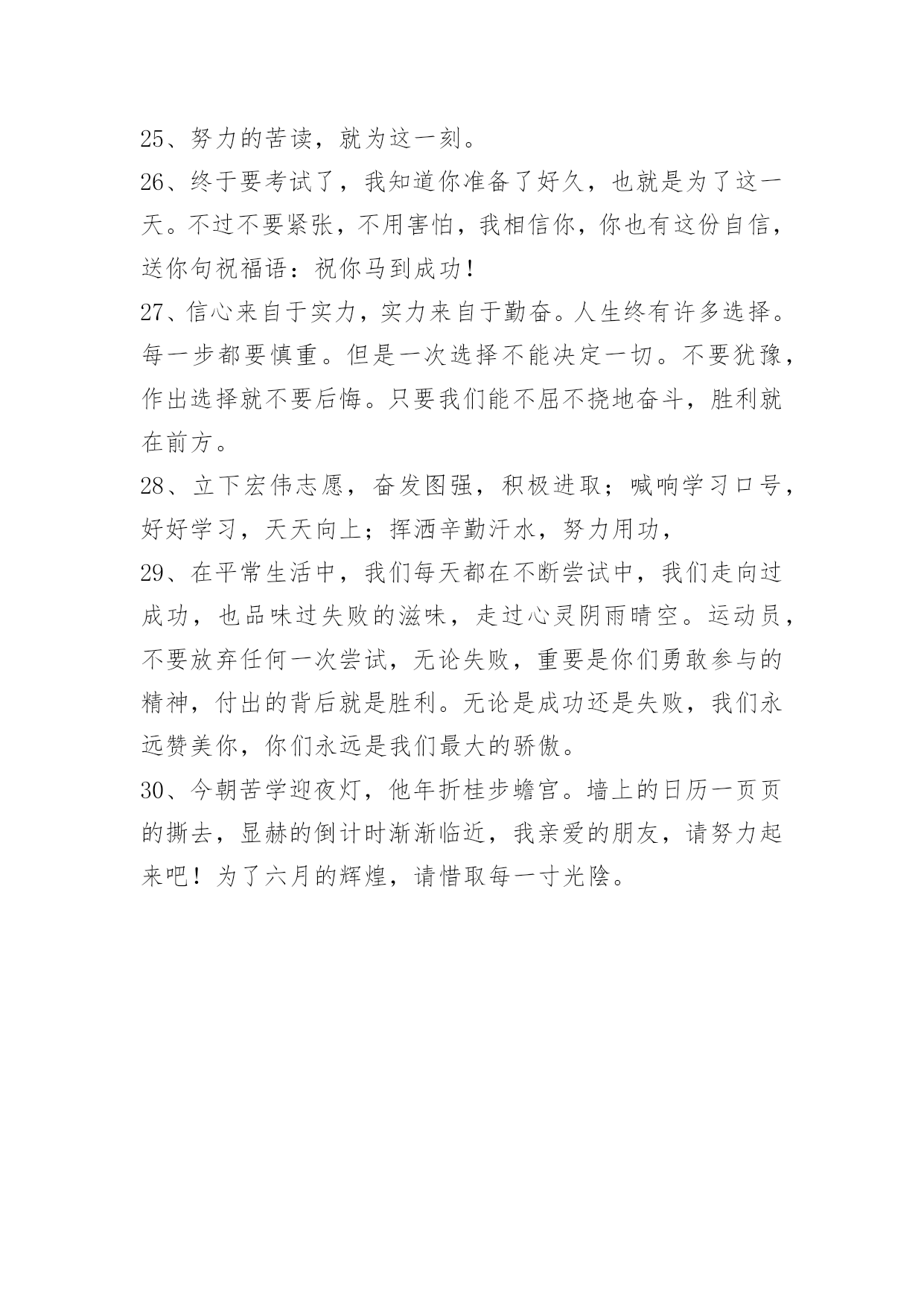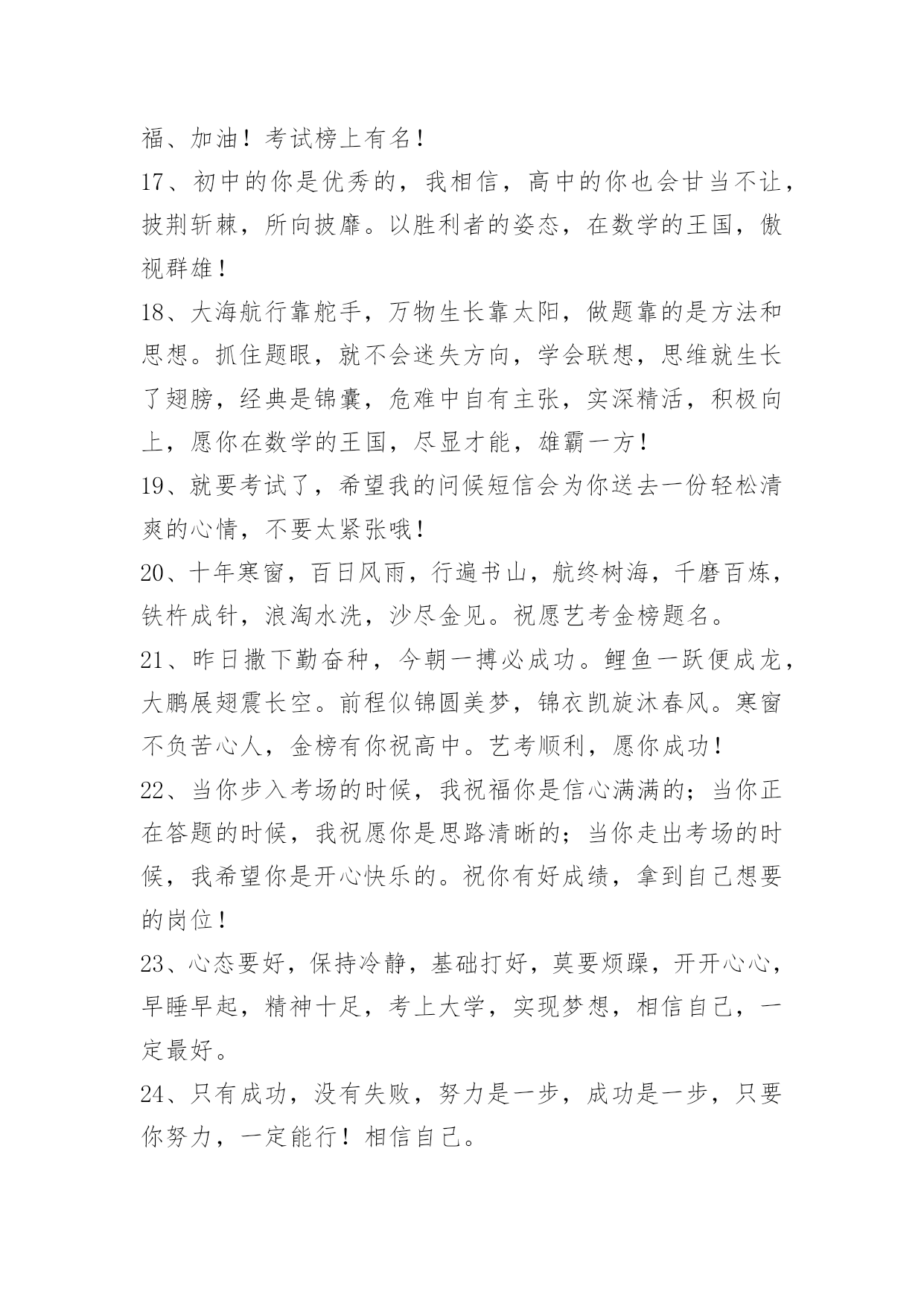 经典考试顺利祝福短信经典考试顺利祝福短信(精选30句)祝愿天下所有考生开心度过期中考试。祝福你们旗开得胜,取得美好佳绩。平心对待,你们是最棒的!仁慈的上帝会祝福你们的,相信自己,一定能行!以下是小编为大家提供的考试顺利祝福短信,仅供参考,欢迎大家阅读。1、生命中的一切美好需要我们去追寻,愿师弟师妹把握好自己!2、一年一考年年考,考试并非华容道。人生大考多在后,全力拼搏有精彩!3、付出终有回报,信心绝对重要。现在就到期中,别忘面带微笑。抽空睡个好觉,不必紧张煎熬。敞开鲲鹏怀抱,直上青云九霄。4、兄弟你今天就要参加考试了,送你一条幸运短信,据说在考试当天能收到这样一条短信,就会考出自己满意的成绩,祝你考试好运气啊!5、告别炎夏日,离开家乡故土,走进大学校门,开始新的生活,加入社团组织,认识更多朋友,拥有好的人气,帮助更多学生,好运带来福运,克服更多困难,盼望学业有成,指点祖国河山。6、别想分数高低,放松最为重要。老妈最近很累,别忘对她笑笑,老爸场场接送,给他一个拥抱。穿得漂漂亮亮,誓把监考迷倒。最后提醒一遍,一定要检查哦!7、十年寒窗,百日风雨,行遍书山,航终树海,千磨百炼,铁杵成针,浪淘水洗,沙尽金见。祝愿考试金榜题名。8、考试没有什么大不了的,我能做得出的标题题目别人不一定能做出来,我做不出的标题题目别人同样做不出,我所做的就是对的,我就是最棒的!9、明天你就要高考了,要相信自己,发挥出自己的水平。妈妈相信你一定能行!祝你心想事成,高考发挥出色,考上最理想的大学!10、考试是比知识、比能力、比心理、比信心、比体力的一场综合考试。11、你现在加油,未来十年你会感激十年前那个为梦想努力的小小的自己,加油!12、祝福考研战线友人旗开得胜,相信自己,你是最棒的!再过几天就考试了,好好准备,靠个好成绩,好久没唱歌给你听了,等考研结束了,我唱给你听。13、新年里我最大的愿望就是:祝愿你能顺利考上今年的研究生,多少个日日夜夜,多少天风风雨雨,多少次挑灯夜读,相信辛勤耕耘终会有回报,相信你考研成功,相信你是我的骄傲,加油啊!14、遇到会做的题:仔细;遇到不会做的题:冷静。15、如果你想获得甜美,就将本身变成工蜂,到花芯中去采撷,若是你想变得聪慧,就将自己酿成一尾鱼,遨游于书的海洋。16、加油呀!兄弟姐妹们,别忘了还有我们在远方为你们祝福、加油!考试榜上有名!17、初中的你是优秀的,我相信,高中的你也会甘当不让,披荆斩棘,所向披靡。以胜利者的姿态,在数学的王国,傲视群雄!18、大海航行靠舵手,万物生长靠太阳,做题靠的是方法和思想。抓住题眼,就不会迷失方向,学会联想,思维就生长了翅膀,经典是锦囊,危难中自有主张,实深精活,积极向上,愿你在数学的王国,尽显才能,雄霸一方!19、就要考试了,希望我的问候短信会为你送去一份轻松清爽的心情,不要太紧张哦!20、十年寒窗,百日风雨,行遍书山,航终树海,千磨百炼,铁杵成针,浪淘水洗,沙尽金见。祝愿艺考金榜题名。21、昨日撒下勤奋种,今朝一搏必成功。鲤鱼一跃便成龙,大鹏展翅震长空。前程似锦圆美梦,锦衣凯旋沐春风。寒窗不负苦心人,金榜有你祝高中。艺考顺利,愿你成功!22、当你步入考场的时候,我祝福你是信心满满的;当你正在答题的时候,我祝愿你是思路清晰的;当你走出考场的时候,我希望你是开心快乐的。祝你有好成绩,拿到自己想要的岗位!23、心态要好,保持冷静,基础打好,莫要烦躁,开开心心,早睡早起,精神十足,考上大学,实现梦想,相信自己,一定最好。24、只有成功,没有失败,努力是一步,成功是一步,只要你努力,一定能行!相信自己。25、努力的苦读,就为这一刻。26、终于要考试了,我知道你准备了好久,也就是为了这一天。不过不要紧张,不用害怕,我相信你,你也有这份自信,送你句祝福语:祝你马到成功!27、信心来自于实力,实力来自于勤奋。人生终有许多选择。每一步都要慎重。但是一次选择不能决定一切。不要犹豫,作出选择就不要后悔。只要我们能不屈不挠地奋斗,胜利就在前方。28、立下宏伟志愿,奋发图强,积极进取;喊响学习口号,好好学习,天天向上;挥洒辛勤汗水,努力用功,29、在平常生活中,我们每天都在不断尝试中,我们走向过成功,也品味过失败的滋味,走过心灵阴雨晴空。运动员,不要放弃任何一次尝试,无论失败,重要是你们勇敢参与的精神,付出的背后就是胜利。无论是成功还是失败,我们永远赞美你,你们永远是我们最大的骄傲。30、今朝苦学迎夜灯,他年折桂步蟾宫。墙上的日历一页页的撕去,显赫的倒计时渐渐临近,我亲爱的朋友,请努力起来吧!为了六月的辉煌,请惜取每一寸光陰。