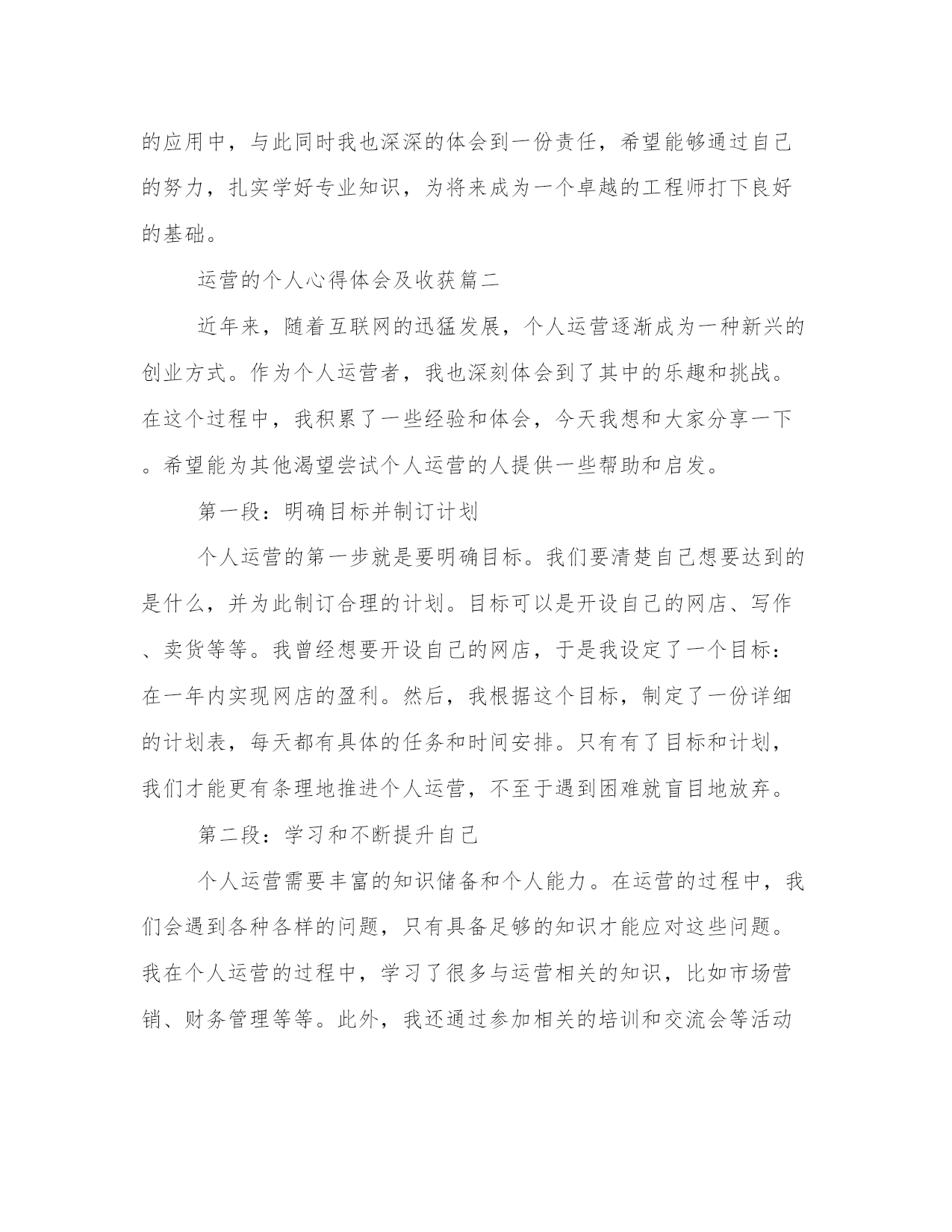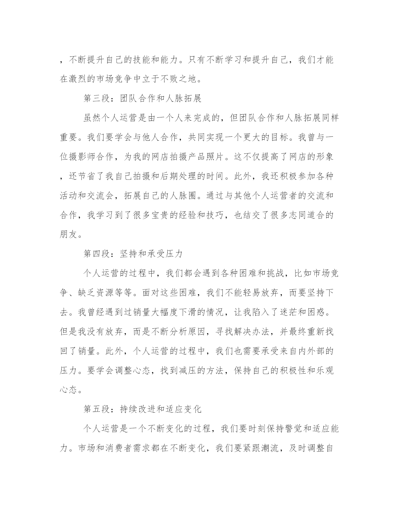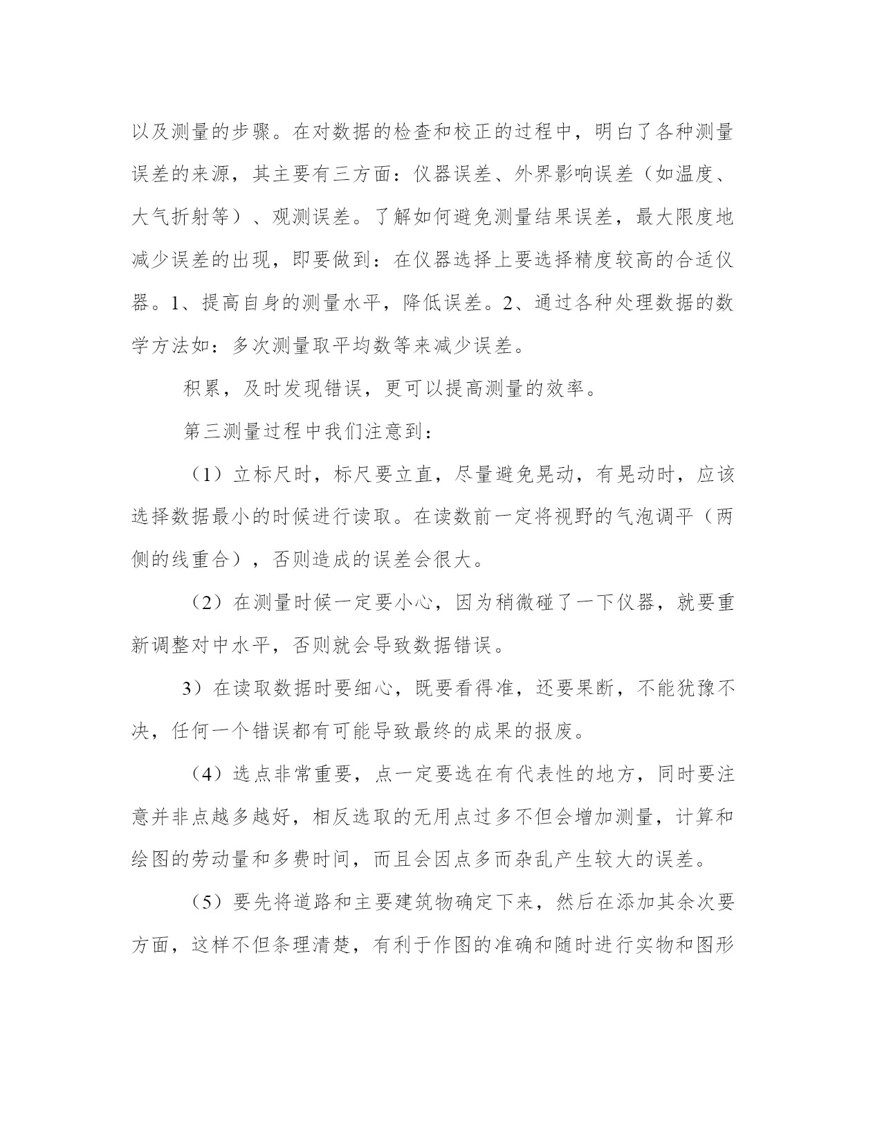 2023年运营的个人心得体会及收获大全(18篇)每个人的心得体会都是独特的,可以从不同的角度和层面来进行思考和归纳。写心得体会时,要注意语言简练、条理清晰,便于读者理解和吸收。小编特意搜集了一些精彩的心得体会范文,供大家参考和借鉴。运营的个人心得体会及收获篇一两周以来的测量实训,我得到了一次较全面的、系统的锻炼,也学到了许多书本上所学不到的知识和技能。通过这次测量实训,我从中学习到了好多实实在在的东西,很多在课本上不可能学到的知识。在实践操作中,巩固、扩大和加深我们从课堂上所学的理论知识。对水准仪、经纬仪的操作也更加熟练,还有对图纸的熟悉程度也大有提高,获得了一些测量实际工作的宝贵经验和重要技能。进一步熟练了测量仪器的操作技能,提高了快速计算和绘图能力,在一些细节小处培养了我们的工作能力。这些知识往往是我在学校很少接触、注意的,但又是十分重要、十分基础的知识。从而积累了许多经验,使我学到了很多实践知识。实训既培养了我们的独立工作能力,又发挥了我们的团队合作精神。测量工作不可能靠一个人完成,只有与同学团结合作才能快速而高效的完成测量工作。在此次测量实训过程中我总结出了一些经验第一:我们学到了测量的实际能力,更有面对困难的忍耐力,同时也认识到小组团结的重要性以及测量的步骤。在对数据的检查和校正的过程中,明白了各种测量误差的来源,其主要有三方面:仪器误差、外界影响误差(如温度、大气折射等)、观测误差。了解如何避免测量结果误差,最大限度地减少误差的出现,即要做到:在仪器选择上要选择精度较高的合适仪器。1、提高自身的测量水平,降低误差。2、通过各种处理数据的数学方法如:多次测量取平均数等来减少误差。积累,及时发现错误,更可以提高测量的效率。第三测量过程中我们注意到:(1)立标尺时,标尺要立直,尽量避免晃动,有晃动时,应该选择数据最小的时候进行读取。在读数前一定将视野的气泡调平(两侧的线重合),否则造成的误差会很大。(2)在测量时候一定要小心,因为稍微碰了一下仪器,就要重新调整对中水平,否则就会导致数据错误。3)在读取数据时要细心,既要看得准,还要果断,不能犹豫不决,任何一个错误都有可能导致最终的成果的报废。(4)选点非常重要,点一定要选在有代表性的地方,同时要注意并非点越多越好,相反选取的无用点过多不但会增加测量,计算和绘图的劳动量和多费时间,而且会因点多而杂乱产生较大的误差。(5)要先将道路和主要建筑物确定下来,然后在添加其余次要方面,这样不但条理清楚,有利于作图的准确和随时进行实物和图形的对比从而检验测量数据的准确与否。我们还要对所测过得范围能够做到胸中有数,避免漏测、重测。(6)计算至少要由两个或人完成,一个初步的计算,一个检验,不断的重复检验,尽量让误差减少到了最少。经常因采的碎部点疏忽或者重复影响了绘图的进度,从而影响了怎个组的效率,但后来经过多次操作渐渐地熟悉了这项工作,不需用观看图纸就能知道那些事所需测得碎部点。从这,我也明白了,以后如果再从事测量工作时,一定要提前熟悉所使用的仪器,这将会很大的提高办事效率。不得不重测。通过这,我认识到凡事该认真时一定要认真,来不得半点虚假。第六,测量中我们遇到了将理论知识运用到实际当中的种种麻烦,但我们都顺利的解决了,这不仅锻炼我们遇到困难要独自解决的能力,还凝练了我们在劳而无获的情况下心态平静的能力。让我们把事情完成得更好,让我们的效率得到更大的提高。再次,大家都任劳任怨地出色的完成了每天制定的任务。最后,我想感谢学校提供了这次实训实践课,让我们有这么好的学习环境,更要感谢我的老师,对我的指导,让我们懂得的很多很多,不仅学到了专业知识,也让我的吃苦耐劳,团结的精神得到了提高。在实训中所见所闻,更加激发了我对土木工程的热爱和憧憬,也深深体会到要在这个行业上有所作为必须付出更多的努力,不仅仅是在理论上,更是在实际的应用中,与此同时我也深深的体会到一份责任,希望能够通过自己的努力,扎实学好专业知识,为将来成为一个卓越的工程师打下良好的基础。运营的个人心得体会及收获篇二近年来,随着互联网的迅猛发展,个人运营逐渐成为一种新兴的创业方式。作为个人运营者,我也深刻体会到了其中的乐趣和挑战。在这个过程中,我积累了一些经验和体会,今天我想和大家分享一下。希望能为其他渴望尝试个人运营的人提供一些帮助和启发。第一段:明确目标并制订计划个人运营的第一步就是要明确目标。我们要清楚自己想要达到的是什么,并为此制订合理的计划。目标可以是开设自己的网店、写作、卖货等等。我曾经想要开设自己的网店,于是我设定了一个目标:在一年内实现网店的盈利。然后,我根据这个目标,制定了一份详细的计划表,每天都有具体的任务和时间安排。只有有了目标和计划,我们才能更有条理地推进个人运营,不至于遇到