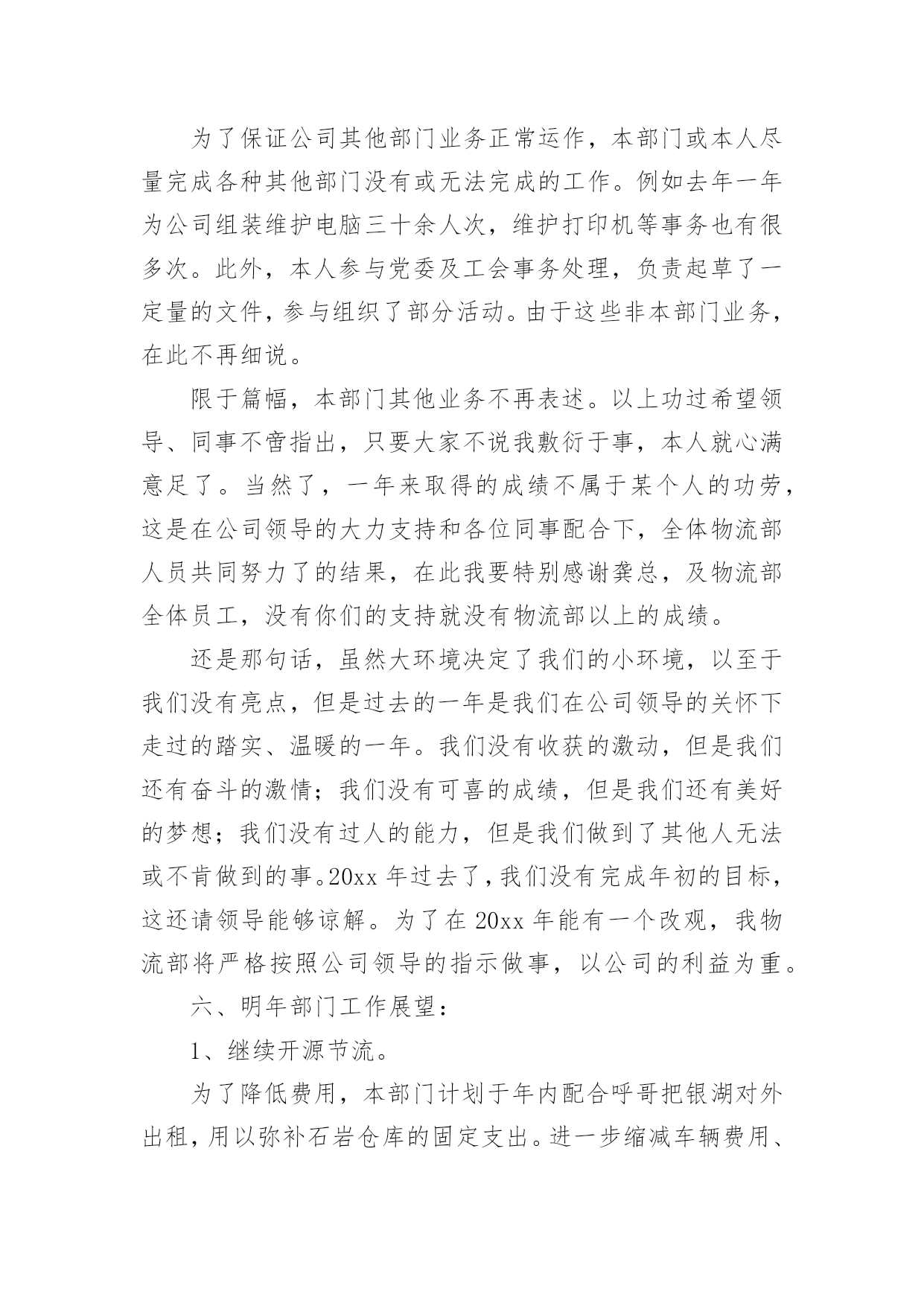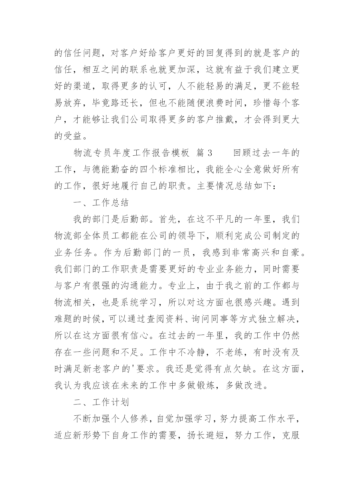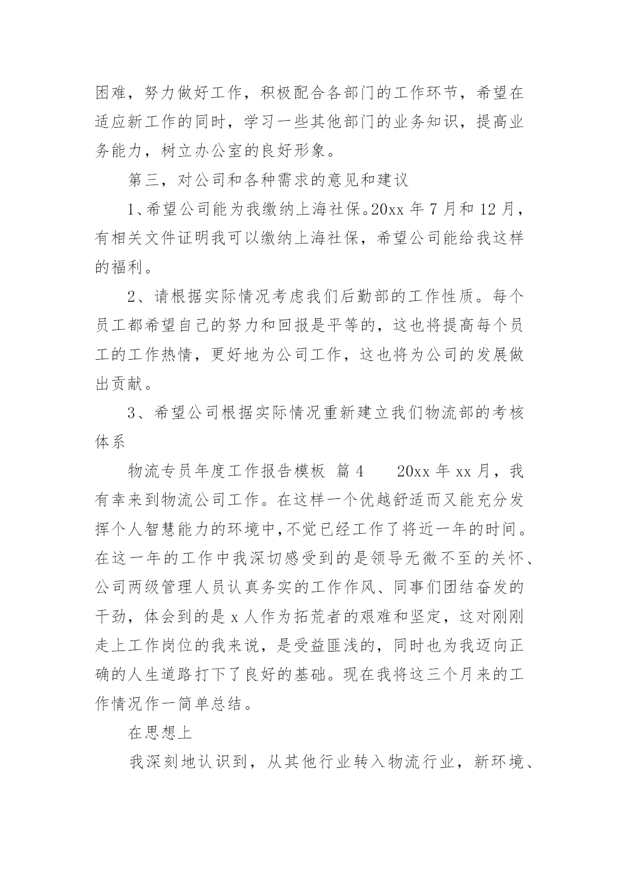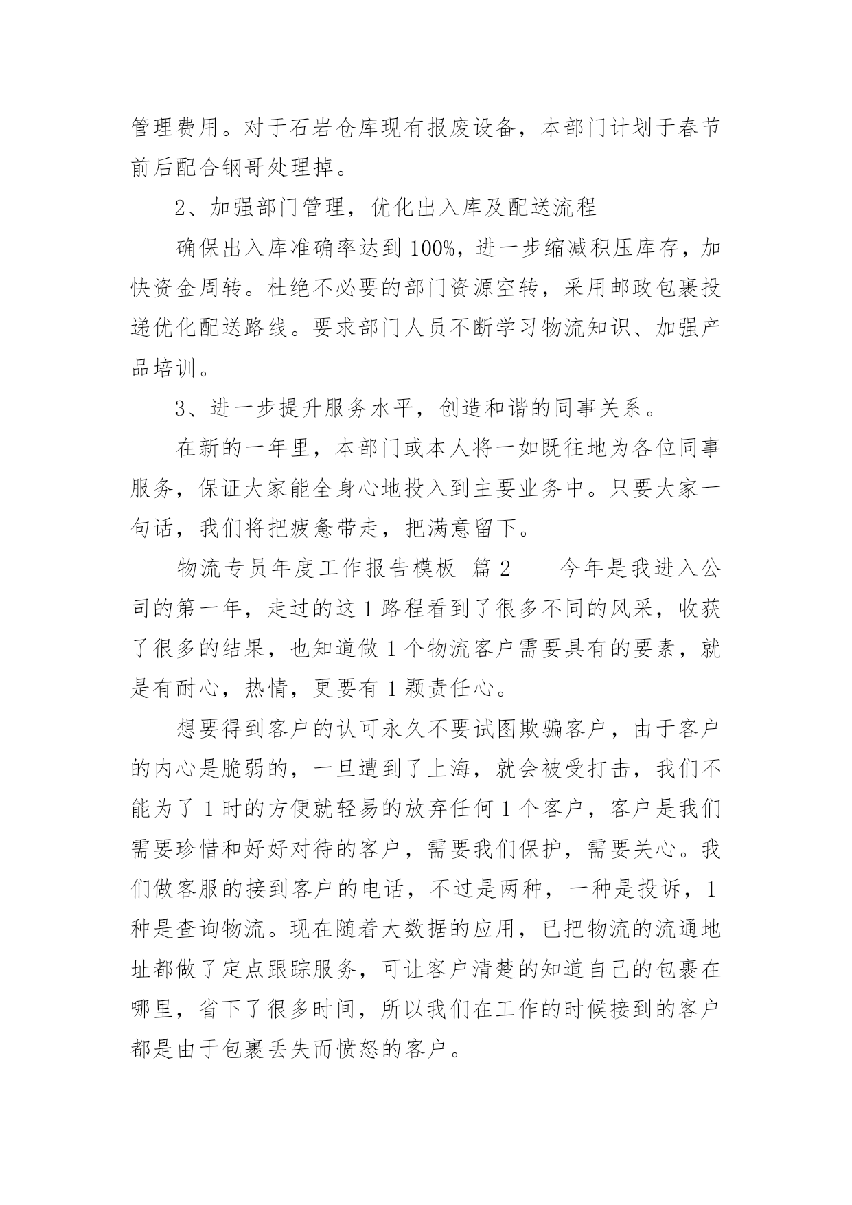 物流专员年度工作报告物流专员年度工作报告模板在人们素养不断提高的今天,报告的适用范围越来越广泛,报告中涉及到专业性术语要解释清楚。其实写报告并没有想象中那么难,下面是小编收集整理的物流专员年度工作报告模板,仅供参考,大家一起来看看吧。物流专员年度工作报告模板篇120xx年,是公司领导克服各种困难,带领大家开源节流,想方设法扩大业务收入,平稳发展的一年;也是我物流部根据公司领导的指示,精益管理、严格控制成本,谋求突破的一年;同时,也是本人在各位同事关心支持下持续改进、不断成长的一年。为获得公司领导和在座各位的可贵意见,现就本部门及本人各项具体工作汇报如下:一、严格控制各项费用,开源为副,节流为主。根据我物流部的情况,开源可能性较小,而节流确实是本部门重中之重,这在今年的财务费用明细中能看得出来。1、物流部费用现状。本部门今年所发生费用占公司费用比率有上升的趋势,现进行说明。物流费用可以分为固定和变动两部分,固定费用不随公司业务变化变化,变动部分随公司业务增加而增加。当变动部分随公司其他部门费用降低变得越小时,固定部分分摊就会越大,而物流部短期能够降低的只有变动部分,这就造成整个物流费用占公司费用比率具有上升趋势。2、控制费用不拘小节。严格控制必须发生的费用,杜绝没用必要的.费用。对于配送费用,我物流部严格按照最优化路线,最少路费、停车费,罗选成主动节省停车费成了大家的共识。从公明拉设备回石岩,货运公司报价5000元,我们实际节省80%。对于各种设备的保养,我们也是价比三家。例如粤Bxxx油泵问题,罗xx咨询好几家,费用都在1000元左右,但是我们实际只花费三百余元,节省60%以上。对于一些小事情,我们也是尽量节省,例如为石岩仓库窗户刷油漆,我们都是自己买油漆,不请物业代为刷。凡此种种,不胜枚举,变动费用节省达60%以上,虽然没有为公司做出突出贡献,但是也尽了自己的努力。3、固定费用控制。根据公司领导对物流部下属仓库指示,把原珠海仓库库存龙骨一次性转移到石岩,为公司节省一定的仓储费用。另外,我们配合呼哥拟把银湖仓库对外出租,进一步降低部门管理的固定费用。二、以学习科学发展为契机,进一步加强部门管理。1、完善部门管理制度。按照领导意见,对各项管理制度进行修改。在保持原有流程不变的基础上,加入了财务监督等条款,进一步规范出入库流程。2、提升部门人员服务意识、安全意识。本部门在强调多创效益的同时,必须确保服务质量、操作安全,要求部门人员既要节省费用,更要对业务部门、客户提供服务和保障,支持业务部门多创效益。认真贯彻落实安全第一、预防为主、综合治理的方针。一年来,本部门无一例投诉、无一例安全事故。3、加强部门人员知识技能自我培训。由于公司业务不饱和,本部门人员经常利用空闲进行自我培训、自我提升,为公司未来发展储备力量。三、降低呆滞库存、运回矿面板。过去一年中,经过领导的支持和各相关部门配合,富林木地板和瓷砖清货,并处理了银湖仓库部分精品、壁布样品。此外,中建投南头仓库取消时,其尚有部分矿面板确定作废品处理。我部门罗xx转告本人后,决定暂时先运回石岩仓库,已备公司将来使用。四、提高出入库数据准确率,确保财务原始数据可靠性。为了确保财物各项工作及时完成,保证财务数据与业务数据的有效衔接,为公司决策提供更加充分的依据。在出入库时,本部门所有人员亲自上阵。例如岩棉卸货时,本人爬上爬下对数据,之后连续几天脖子手臂发痒。此外,本部门或本人为了及时、准确地向财务提供所需的各项报告的数据,不间断工作十几个小时是常事。例如最近一次数据整理,近一千项数据,要逐一注明原始单据,时间紧任务重。在牺牲了午饭的前提下,十多个小时搞定。五、支持其他部门工作,处理关联业务。为了保证公司其他部门业务正常运作,本部门或本人尽量完成各种其他部门没有或无法完成的工作。例如去年一年为公司组装维护电脑三十余人次,维护打印机等事务也有很多次。此外,本人参与党委及工会事务处理,负责起草了一定量的文件,参与组织了部分活动。由于这些非本部门业务,在此不再细说。限于篇幅,本部门其他业务不再表述。以上功过希望领导、同事不啻指出,只要大家不说我敷衍于事,本人就心满意足了。当然了,一年来取得的成绩不属于某个人的功劳,这是在公司领导的大力支持和各位同事配合下,全体物流部人员共同努力了的结果,在此我要特别感谢龚总,及物流部全体员工,没有你们的支持就没有物流部以上的成绩。还是那句话,虽然大环境决定了我们的小环境,以至于我们没有亮点,但是过去的一年是我们在公司领导的关怀下走过的踏实、温暖的一年。我们没有收获的激动,但是我们还有奋斗的激情;我们没有可喜的成绩,但是我们还有美好的梦想;我们没有过人的能力,但是我们做到了其他人无法或不肯做到的事。20xx年过去了,我们没有完成年初的目标,这还请领导能够谅解。