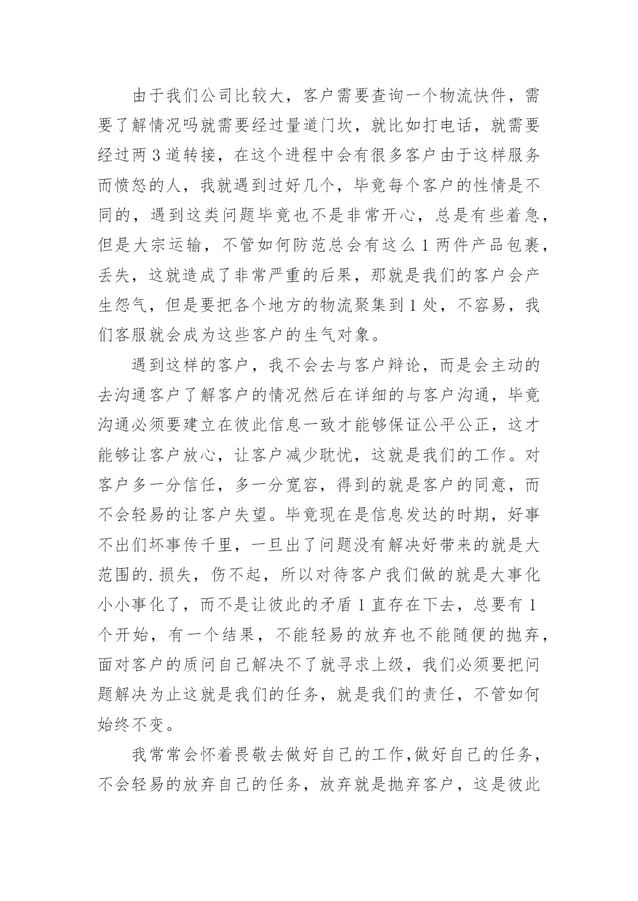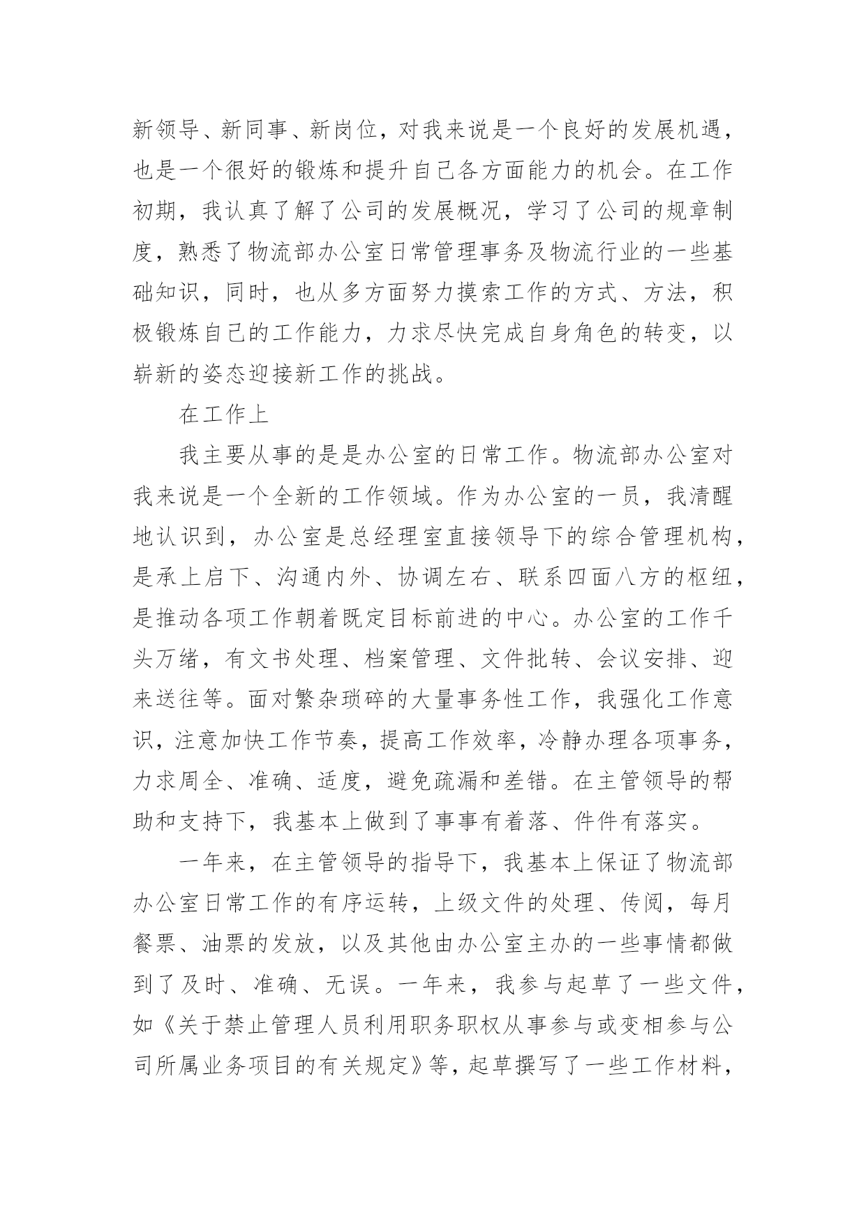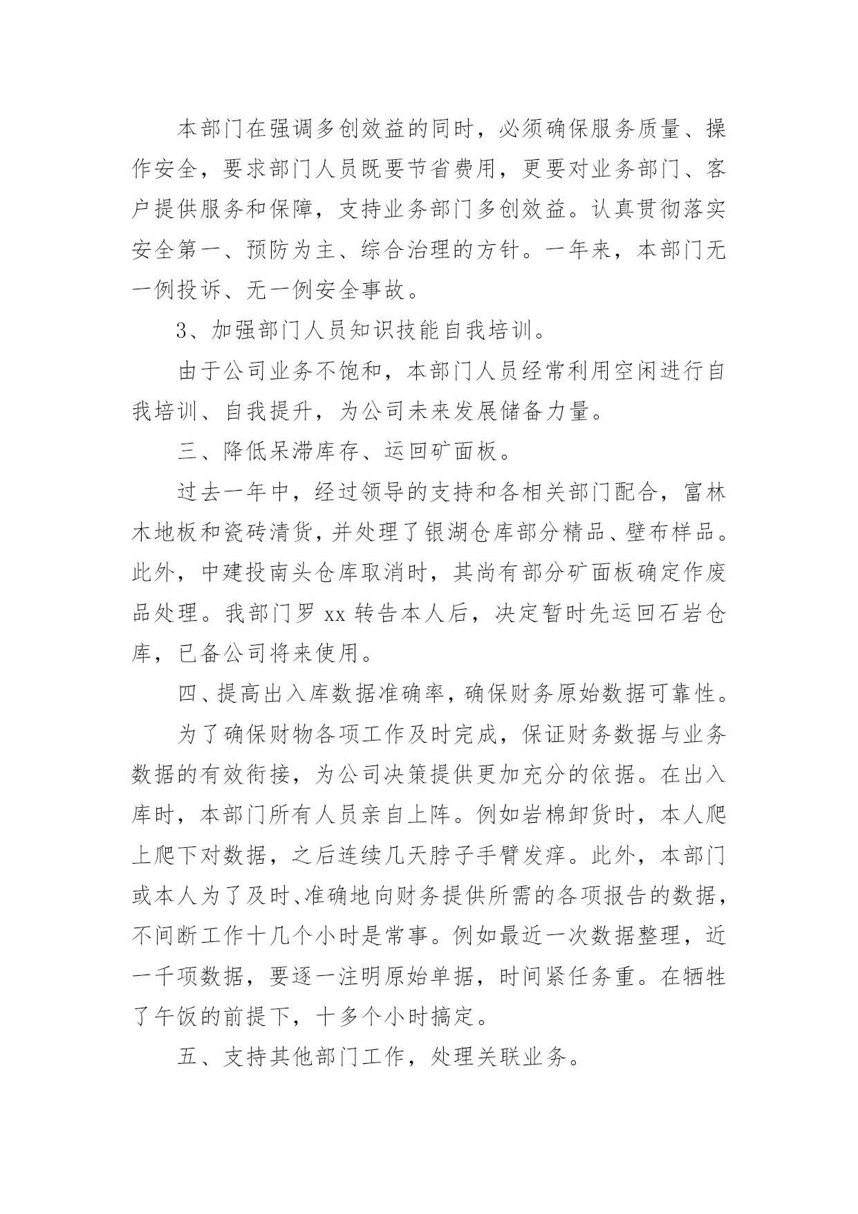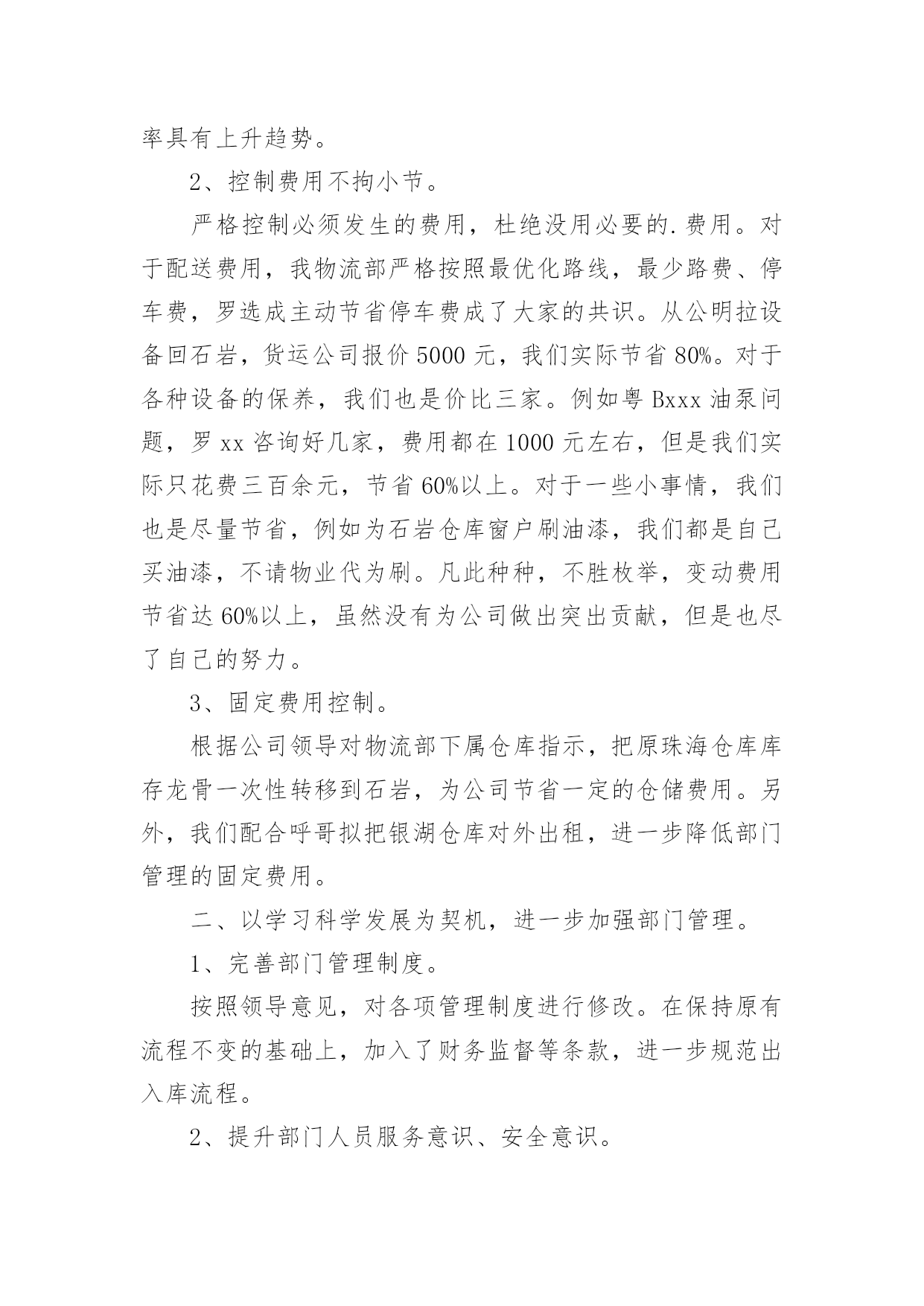 物流专员年度工作报告物流专员年度工作报告模板在人们素养不断提高的今天,报告的适用范围越来越广泛,报告中涉及到专业性术语要解释清楚。其实写报告并没有想象中那么难,下面是小编收集整理的物流专员年度工作报告模板,仅供参考,大家一起来看看吧。物流专员年度工作报告模板篇120xx年,是公司领导克服各种困难,带领大家开源节流,想方设法扩大业务收入,平稳发展的一年;也是我物流部根据公司领导的指示,精益管理、严格控制成本,谋求突破的一年;同时,也是本人在各位同事关心支持下持续改进、不断成长的一年。为获得公司领导和在座各位的可贵意见,现就本部门及本人各项具体工作汇报如下:一、严格控制各项费用,开源为副,节流为主。根据我物流部的情况,开源可能性较小,而节流确实是本部门重中之重,这在今年的财务费用明细中能看得出来。1、物流部费用现状。本部门今年所发生费用占公司费用比率有上升的趋势,现进行说明。物流费用可以分为固定和变动两部分,固定费用不随公司业务变化变化,变动部分随公司业务增加而增加。当变动部分随公司其他部门费用降低变得越小时,固定部分分摊就会越大,而物流部短期能够降低的只有变动部分,这就造成整个物流费用占公司费用比率具有上升趋势。2、控制费用不拘小节。严格控制必须发生的费用,杜绝没用必要的.费用。对于配送费用,我物流部严格按照最优化路线,最少路费、停车费,罗选成主动节省停车费成了大家的共识。从公明拉设备回石岩,货运公司报价5000元,我们实际节省80%。对于各种设备的保养,我们也是价比三家。例如粤Bxxx油泵问题,罗xx咨询好几家,费用都在1000元左右,但是我们实际只花费三百余元,节省60%以上。对于一些小事情,我们也是尽量节省,例如为石岩仓库窗户刷油漆,我们都是自己买油漆,不请物业代为刷。凡此种种,不胜枚举,变动费用节省达60%以上,虽然没有为公司做出突出贡献,但是也尽了自己的努力。3、固定费用控制。根据公司领导对物流部下属仓库指示,把原珠海仓库库存龙骨一次性转移到石岩,为公司节省一定的仓储费用。另外,我们配合呼哥拟把银湖仓库对外出租,进一步降低部门管理的固定费用。二、以学习科学发展为契机,进一步加强部门管理。1、完善部门管理制度。按照领导意见,对各项管理制度进行修改。在保持原有流程不变的基础上,加入了财务监督等条款,进一步规范出入库流程。2、提升部门人员服务意识、安全意识。本部门在强调多创效益的同时,必须确保服务质量、操作安全,要求部门人员既要节省费用,更要对业务部门、客户提供服务和保障,支持业务部门多创效益。认真贯彻落实安全第一、预防为主、综合治理的方针。一年来,本部门无一例投诉、无一例安全事故。3、加强部门人员知识技能自我培训。由于公司业务不饱和,本部门人员经常利用空闲进行自我培训、自我提升,为公司未来发展储备力量。三、降低呆滞库存、运回矿面板。过去一年中,经过领导的支持和各相关部门配合,富林木地板和瓷砖清货,并处理了银湖仓库部分精品、壁布样品。此外,中建投南头仓库取消时,其尚有部分矿面板确定作废品处理。我部门罗xx转告本人后,决定暂时先运回石岩仓库,已备公司将来使用。四、提高出入库数据准确率,确保财务原始数据可靠性。为了确保财物各项工作及时完成,保证财务数据与业务数据的有效衔接,为公司决策提供更加充分的依据。在出入库时,本部门所有人员亲自上阵。例如岩棉卸货时,本人爬上爬下对数据,之后连续几天脖子手臂发痒。此外,本部门或本人为了及时、准确地向财务提供所需的各项报告的数据,不间断工作十几个小时是常事。例如最近一次数据整理,近一千项数据,要逐一注明原始单据,时间紧任务重。在牺牲了午饭的前提下,十多个小时搞定。五、支持其他部门工作,处理关联业务。为了保证公司其他部门业务正常运作,本部门或本人尽量完成各种其他部门没有或无法完成的工作。例如去年一年为公司组装维护电脑三十余人次,维护打印机等事务也有很多次。此外,本人参与党委及工会事务处理,负责起草了一定量的文件,参与组织了部分活动。由于这些非本部门业务,在此不再细说。限于篇幅,本部门其他业务不再表述。以上功过希望领导、同事不啻指出,只要大家不说我敷衍于事,本人就心满意足了。当然了,一年来取得的成绩不属于某个人的功劳,这是在公司领导的大力支持和各位同事配合下,全体物流部人员共同努力了的结果,在此我要特别感谢龚总,及物流部全体员工,没有你们的支持就没有物流部以上的成绩。还是那句话,虽然大环境决定了我们的小环境,以至于我们没有亮点,但是过去的一年是我们在公司领导的关怀下走过的踏实、温暖的一年。我们没有收获的激动,但是我们还有奋斗的激情;我们没有可喜的成绩,但是我们还有美好的梦想;我们没有过人的能力,但是我们做到了其他人无法或不肯做到的事。20xx年过去了,我们没有完成年初的目标,这还请领导能够谅解。