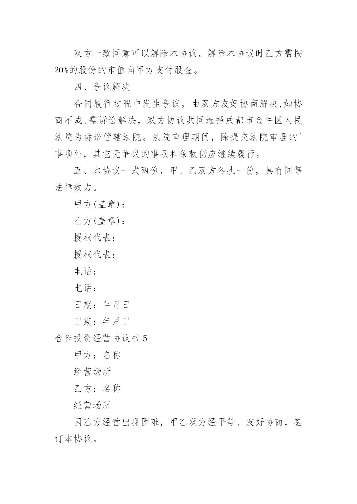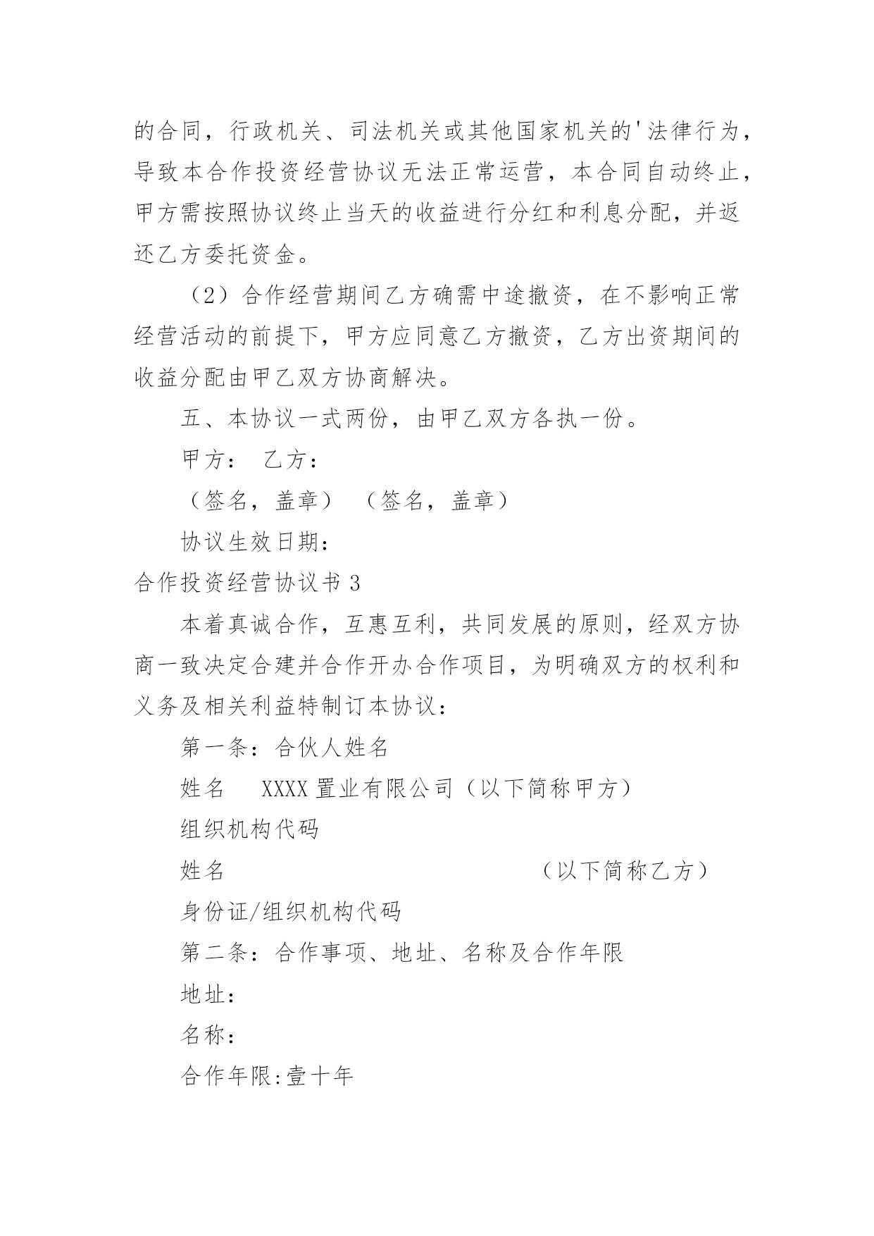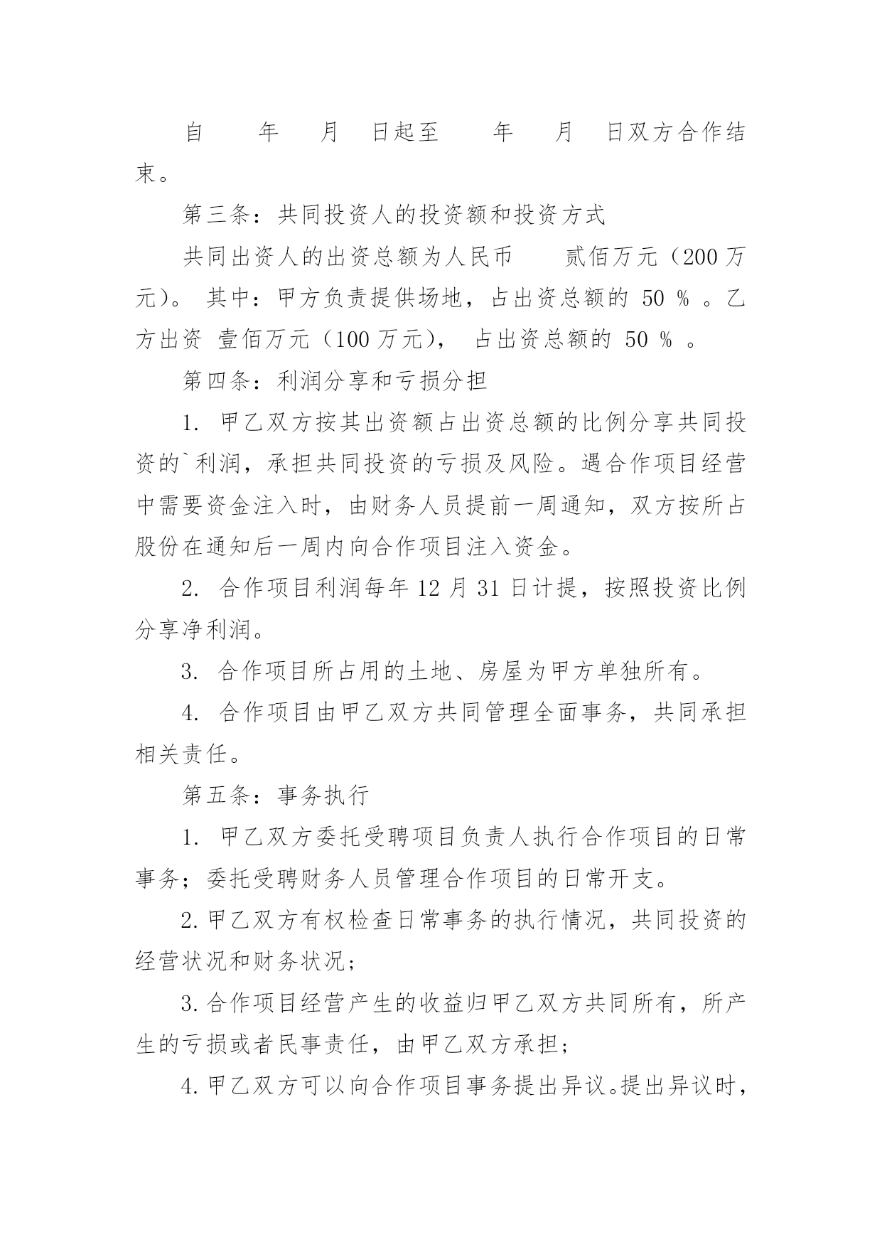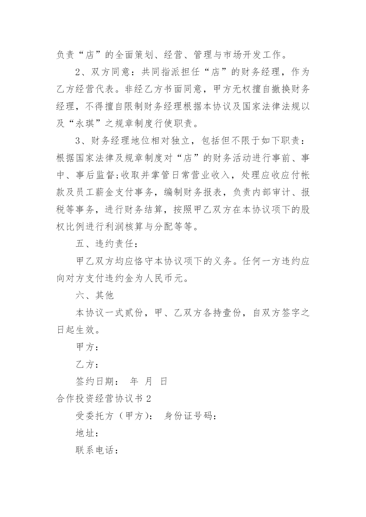 合作投资经营协议书合作投资经营协议书合集13篇在我们平凡的日常里,我们都跟协议有着直接或间接的联系,签订协议是解决纠纷的保障。我敢肯定,大部分人都对拟定协议很是头疼的,以下是小编为大家整理的合作投资经营协议书,供大家参考借鉴,希望可以帮助到有需要的朋友。合作投资经营协议书1甲方:乙方:甲方双方经充分协商,现就双方合作开办位于的“上海店”(以下简称“店”)的有关事宜达成如下协议,以资遵照履行:一、投资开办事项:1、名称:2、地址:3、经营范围:保健服务,形象设计,(涉及行政许可的,凭许可证经营)。4、合作期限:自年月日起至年月日止。期限届满时,如“店”经营状况正常或良好,任何一方均未书面提出停止合作意向,则视为双方同意继续合作,继续合作期间双方仍应接受本协议约束。二、投资结构及责任分担:1、“店”全部投资资金人民币万元(均由乙方实际投入,用于“店”之门店装修、门面受让、前期房屋租金、押金以及设备采购等。乙方根据“店”的开办进度及甲方通知将前述所需资金交给甲方,则视为乙方在本协议项下的投资款已实际到位。2、甲方收到乙方投资款后,应出具相应收款凭证,并保证专款专用,不得将乙方投资资金滥用或挪用。3、甲方负责办妥“店”开业手续。包括但不限于如下事务:出面与上海有限公司进行磋商,取得上海有限公司关于“”的名称使用及其“连锁直营管理”的`授权许可,进行有关工商、税务登记,进行门店装修,负责承租门面,采购设备,招聘员工等等。4、“店”正式对外营业后,每个月进行一次结算,结算周期内因营业产生的支出从营业收入中先行支付,剩余利润按股权比例进行分配。如当期营业收入不足支付营业支出的,应从下一结算周期内营业利润中先行支付。三、股权比例:1、乙方对“店”享有百分之五十五(55%)的股份;2、甲方对“永店”享有百分之四十五(45%)的股份。3、协议各方按各自所持股份分配利润、分担责任。四、经营管理职责划分:1、双方同意:甲方应本着对合作事业的最大善意与诚信,根据自已的行业经验,恪尽最大注意义务,担任职务,负责“店”的全面策划、经营、管理与市场开发工作。2、双方同意:共同指派担任“店”的财务经理,作为乙方经营代表。非经乙方书面同意,甲方无权擅自撤换财务经理,不得擅自限制财务经理根据本协议及国家法律法规以及“永琪”之规章制度行使职责。3、财务经理地位相对独立,包括但不限于如下职责:根据国家法律及规章制度对“店”的财务活动进行事前、事中、事后监督;收取并掌管日常营业收入,处理应收应付帐款及员工薪金支付事务,编制财务报表,负责内部审计、报税等事务,进行财务结算,按照甲乙双方在本协议项下的股权比例进行利润核算与分配等等。五、违约责任:甲乙双方均应恪守本协议项下的义务。任何一方违约应向对方支付违约金为人民币元。六、其他本协议一式贰份,甲、乙双方各持壹份,自双方签字之日起生效。甲方:乙方:签约日期:年月日合作投资经营协议书2受委托方(甲方):身份证号码:地址:联系电话:委托人(乙方):身份证号码:地址:联系电话:甲乙双方本着自愿、平等、公平、诚实、信用、风险共担,利益共享的原则,根据国家有关法律、法规的规定,由甲方作为合作经营方代表与“曲沃绿恒农业发展有限公司”签订养殖场承包合同。本协议作为补充协议规定出资方的出资方案和利益分配原则,由甲乙双方共同遵守。一、出资:乙方需以人民币现金的形式出资。乙方委托资产金额人民币共_________元,大写:。乙方应于签订本协议当日内将款项全额付至甲方。二、合作经营期限:自年月日起,至年月日止,共计年月。三、收益及分配:1、利息:按照甲方同曲沃绿恒农业发展有限公司的协议结算方式进行结算。2、分红:以50万的总承包担保费用,出资方按照所占总承包担保费用额的比例进行红利分配。四、清算及中途撤资:1、协议到期时清算:甲方按合约结算给乙方应得分红及利息,并退还乙方的委托资金。2、中途撤资:(1)如因甲方中途终止与曲沃绿恒农业发展有限公司的合同,行政机关、司法机关或其他国家机关的'法律行为,导致本合作投资经营协议无法正常运营,本合同自动终止,甲方需按照协议终止当天的收益进行分红和利息分配,并返还乙方委托资金。(2)合作经营期间乙方确需中途撤资,在不影响正常经营活动的前提下,甲方应同意乙方撤资,乙方出资期间的收益分配由甲乙双方协商解决。五、本协议一式两份,由甲乙双方各执一份。甲方:乙方:(签名,盖章)(签名,盖章)协议生效日期:合作投资经营协议书3本着真诚合作,互惠互利,共同发展的原则,经双方协商一致决定合建并合作开办合作项目,为明确双方的权利和义务及相关利益特制订本协议:第一条:合伙人姓名姓名XXXX置业有限公司(以下简称甲方)组织机构代码姓名(以下简称乙方)身份证/组织机构代码第二条:合作事项、地址、名称及合作年限地址:名称:合作年限
