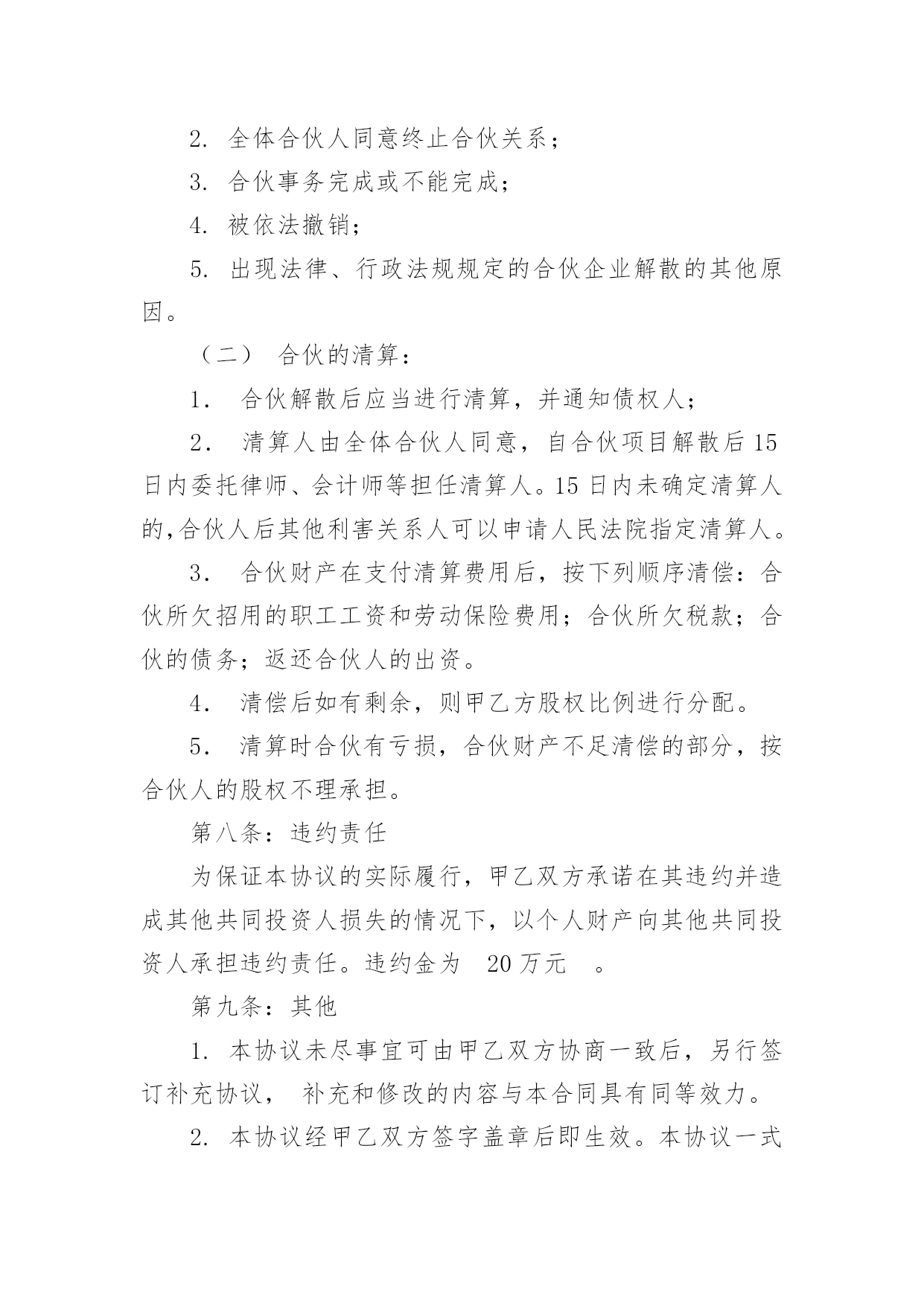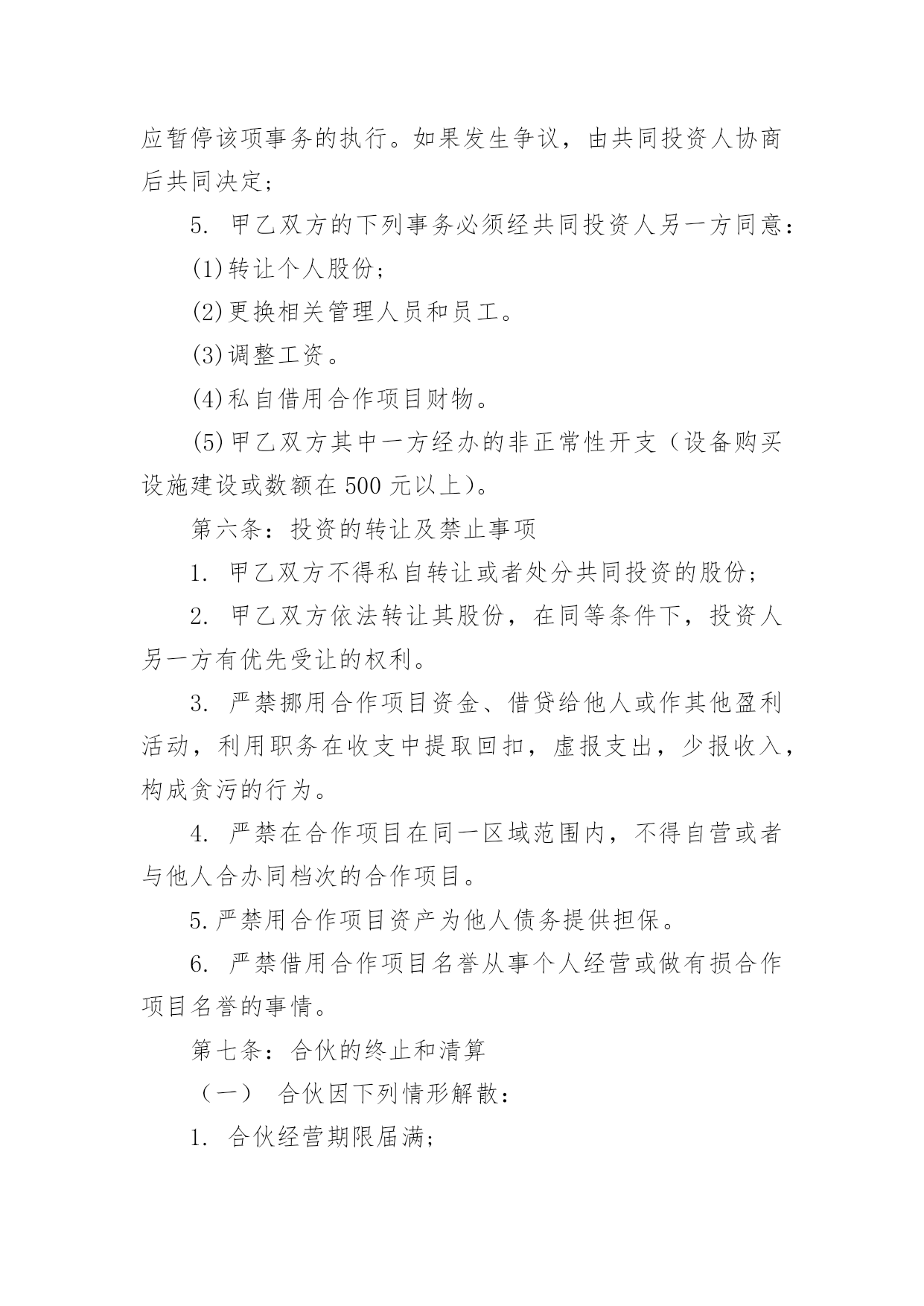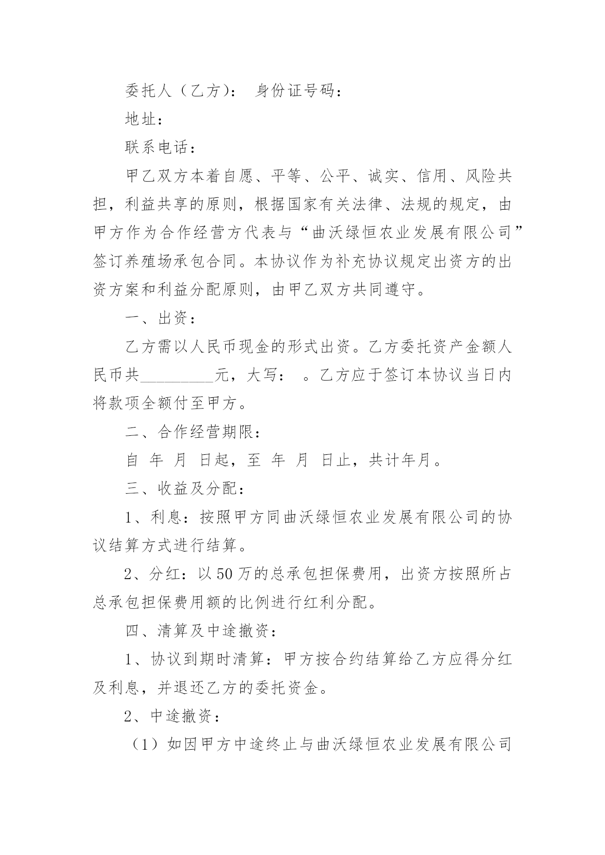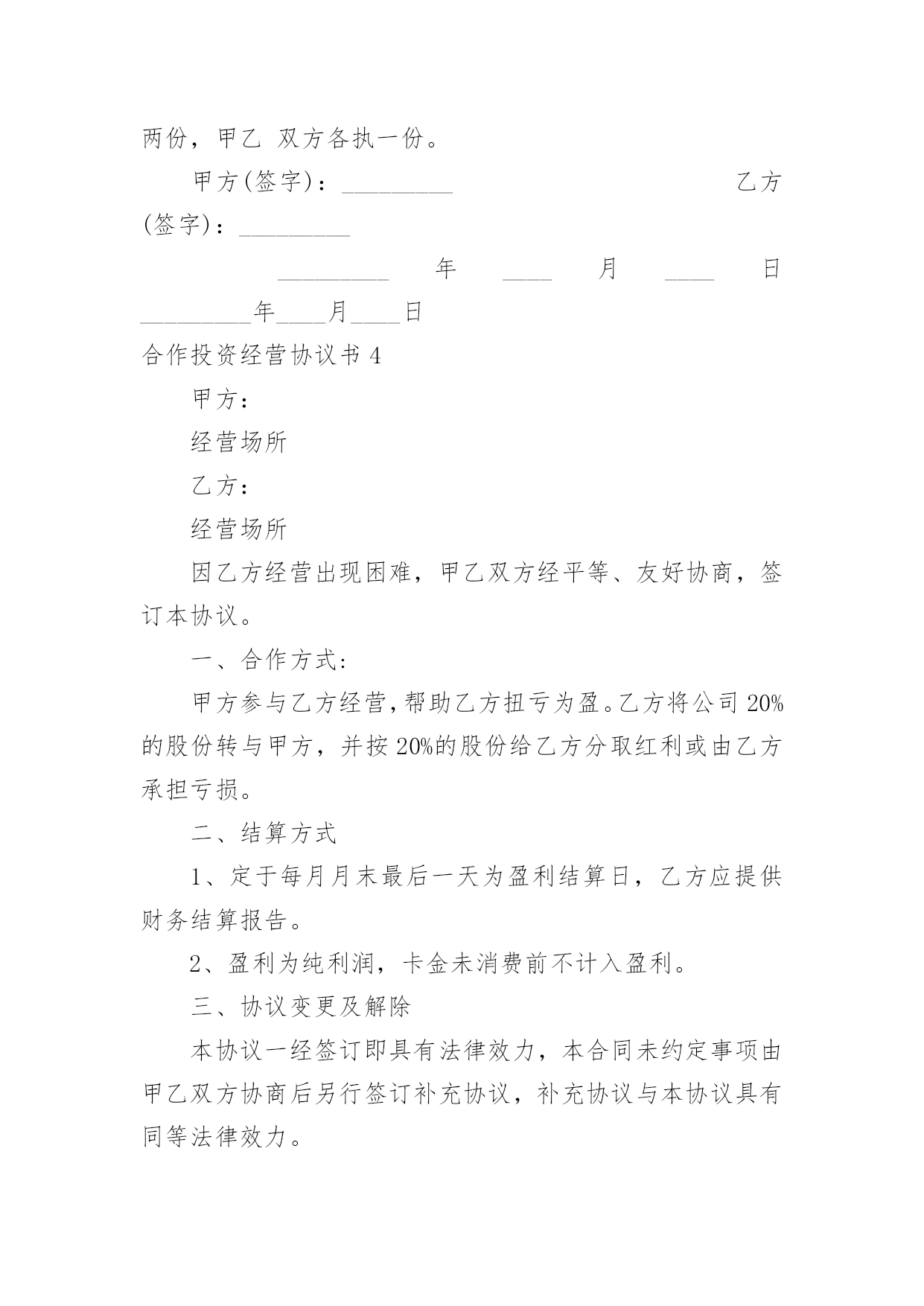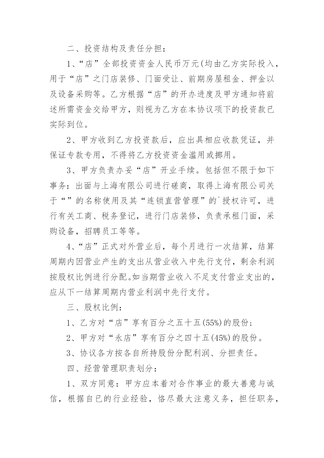 合作投资经营协议书合作投资经营协议书合集13篇在我们平凡的日常里,我们都跟协议有着直接或间接的联系,签订协议是解决纠纷的保障。我敢肯定,大部分人都对拟定协议很是头疼的,以下是小编为大家整理的合作投资经营协议书,供大家参考借鉴,希望可以帮助到有需要的朋友。合作投资经营协议书1甲方:乙方:甲方双方经充分协商,现就双方合作开办位于的“上海店”(以下简称“店”)的有关事宜达成如下协议,以资遵照履行:一、投资开办事项:1、名称:2、地址:3、经营范围:保健服务,形象设计,(涉及行政许可的,凭许可证经营)。4、合作期限:自年月日起至年月日止。期限届满时,如“店”经营状况正常或良好,任何一方均未书面提出停止合作意向,则视为双方同意继续合作,继续合作期间双方仍应接受本协议约束。二、投资结构及责任分担:1、“店”全部投资资金人民币万元(均由乙方实际投入,用于“店”之门店装修、门面受让、前期房屋租金、押金以及设备采购等。乙方根据“店”的开办进度及甲方通知将前述所需资金交给甲方,则视为乙方在本协议项下的投资款已实际到位。2、甲方收到乙方投资款后,应出具相应收款凭证,并保证专款专用,不得将乙方投资资金滥用或挪用。3、甲方负责办妥“店”开业手续。包括但不限于如下事务:出面与上海有限公司进行磋商,取得上海有限公司关于“”的名称使用及其“连锁直营管理”的`授权许可,进行有关工商、税务登记,进行门店装修,负责承租门面,采购设备,招聘员工等等。4、“店”正式对外营业后,每个月进行一次结算,结算周期内因营业产生的支出从营业收入中先行支付,剩余利润按股权比例进行分配。如当期营业收入不足支付营业支出的,应从下一结算周期内营业利润中先行支付。三、股权比例:1、乙方对“店”享有百分之五十五(55%)的股份;2、甲方对“永店”享有百分之四十五(45%)的股份。3、协议各方按各自所持股份分配利润、分担责任。四、经营管理职责划分:1、双方同意:甲方应本着对合作事业的最大善意与诚信,根据自已的行业经验,恪尽最大注意义务,担任职务,负责“店”的全面策划、经营、管理与市场开发工作。2、双方同意:共同指派担任“店”的财务经理,作为乙方经营代表。非经乙方书面同意,甲方无权擅自撤换财务经理,不得擅自限制财务经理根据本协议及国家法律法规以及“永琪”之规章制度行使职责。3、财务经理地位相对独立,包括但不限于如下职责:根据国家法律及规章制度对“店”的财务活动进行事前、事中、事后监督;收取并掌管日常营业收入,处理应收应付帐款及员工薪金支付事务,编制财务报表,负责内部审计、报税等事务,进行财务结算,按照甲乙双方在本协议项下的股权比例进行利润核算与分配等等。五、违约责任:甲乙双方均应恪守本协议项下的义务。任何一方违约应向对方支付违约金为人民币元。六、其他本协议一式贰份,甲、乙双方各持壹份,自双方签字之日起生效。甲方:乙方:签约日期:年月日合作投资经营协议书2受委托方(甲方):身份证号码:地址:联系电话:委托人(乙方):身份证号码:地址:联系电话:甲乙双方本着自愿、平等、公平、诚实、信用、风险共担,利益共享的原则,根据国家有关法律、法规的规定,由甲方作为合作经营方代表与“曲沃绿恒农业发展有限公司”签订养殖场承包合同。本协议作为补充协议规定出资方的出资方案和利益分配原则,由甲乙双方共同遵守。一、出资:乙方需以人民币现金的形式出资。乙方委托资产金额人民币共_________元,大写:。乙方应于签订本协议当日内将款项全额付至甲方。二、合作经营期限:自年月日起,至年月日止,共计年月。三、收益及分配:1、利息:按照甲方同曲沃绿恒农业发展有限公司的协议结算方式进行结算。2、分红:以50万的总承包担保费用,出资方按照所占总承包担保费用额的比例进行红利分配。四、清算及中途撤资:1、协议到期时清算:甲方按合约结算给乙方应得分红及利息,并退还乙方的委托资金。2、中途撤资:(1)如因甲方中途终止与曲沃绿恒农业发展有限公司的合同,行政机关、司法机关或其他国家机关的'法律行为,导致本合作投资经营协议无法正常运营,本合同自动终止,甲方需按照协议终止当天的收益进行分红和利息分配,并返还乙方委托资金。(2)合作经营期间乙方确需中途撤资,在不影响正常经营活动的前提下,甲方应同意乙方撤资,乙方出资期间的收益分配由甲乙双方协商解决。五、本协议一式两份,由甲乙双方各执一份。甲方:乙方:(签名,盖章)(签名,盖章)协议生效日期:合作投资经营协议书3本着真诚合作,互惠互利,共同发展的原则,经双方协商一致决定合建并合作开办合作项目,为明确双方的权利和义务及相关利益特制订本协议:第一条:合伙人姓名姓名XXXX置业有限公司(以下简称甲方)组织机构代码姓名(以下简称乙方)身份证/组织机构代码第二条:合作事项、地址、名称及合作年限地址:名称:合作年限