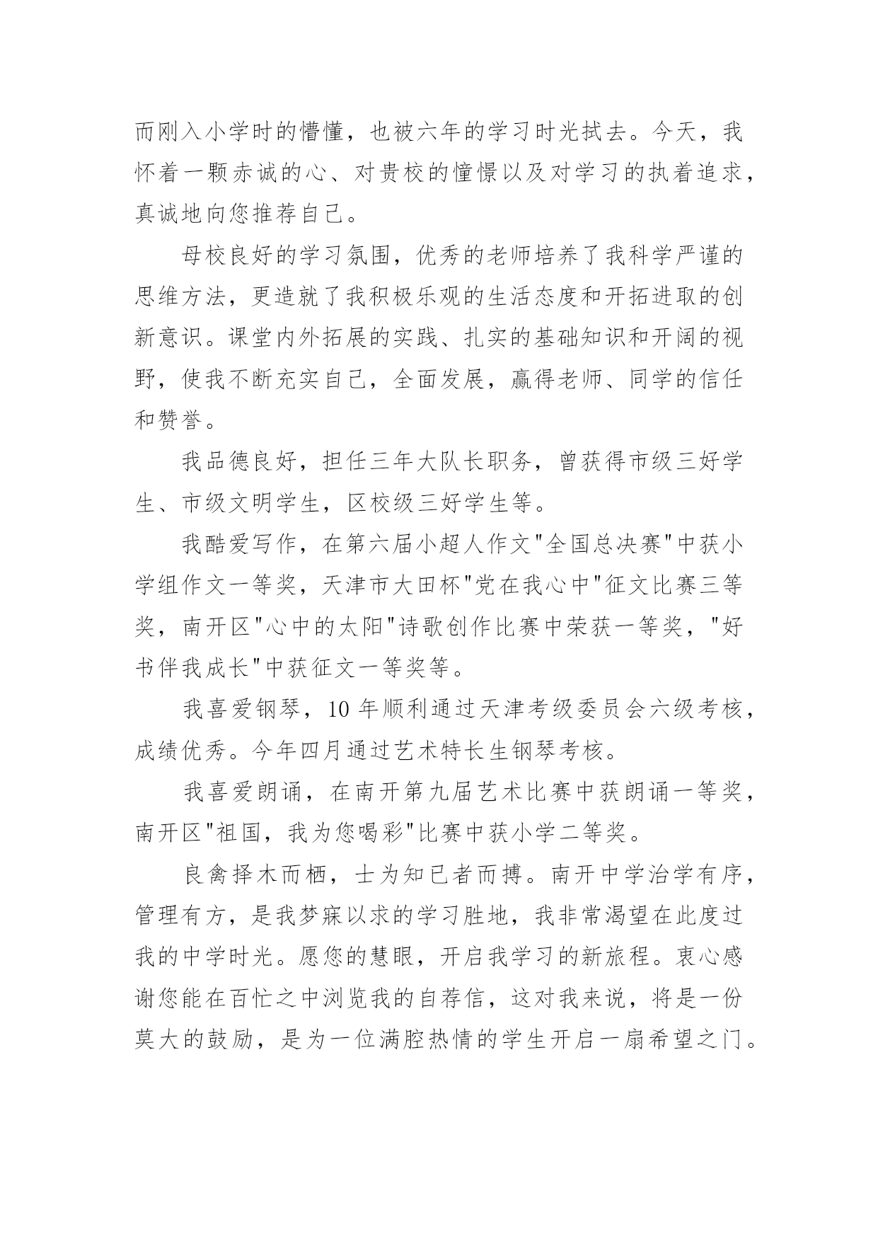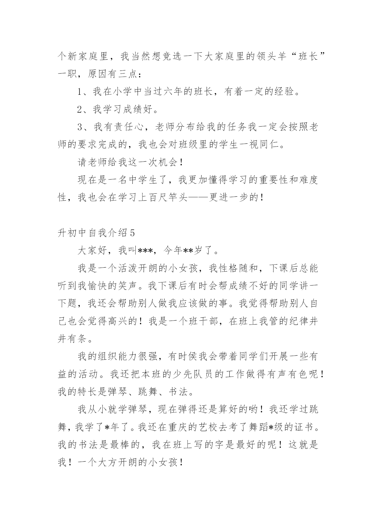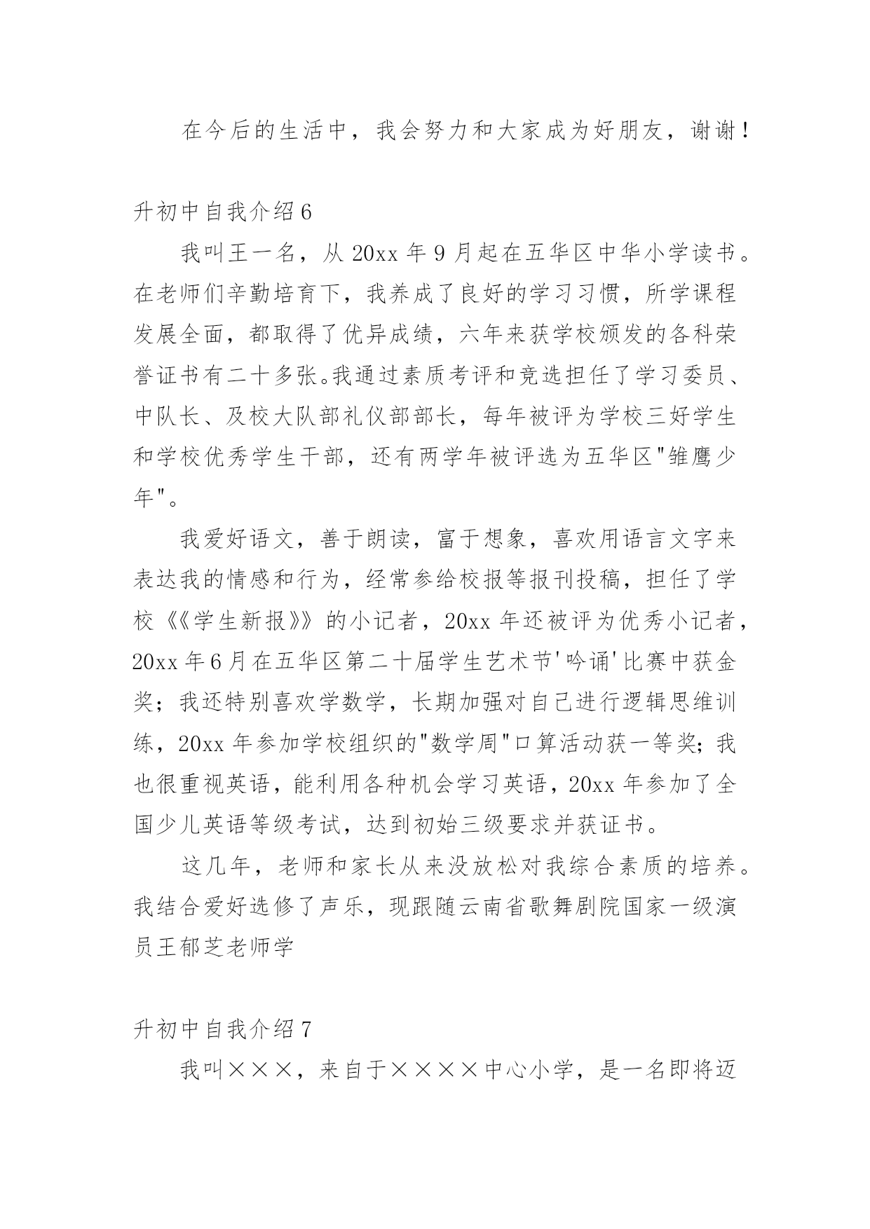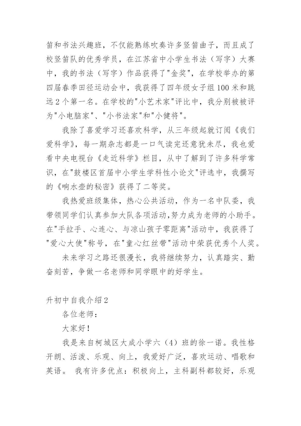 升初中自我介绍升初中自我介绍10篇升初中自我介绍1我叫XXX,今年X岁,是XXXXXXXX学校的学生。在老师心目中,我是一个思维敏捷、领悟力强和爱动脑筋的学生,也是一个学习勤奋、做事认真的学生。我的学习成绩一直在班级中名列前茅,而且对数学学习特别感兴趣。在老师和家长的帮助下,我养成了良好的学习习惯,每天坚持预习,上课时认真听讲、积极发言,家庭作业既整齐又正确。良好的学习习惯和一丝不苟的学习态度,使我成为老师们眼中的优秀学生。在近六年的学习中,我多次获得单科免考并在各类评比中获得了优异成绩:每学期都被评为学校"三好学生",在南京数学学会组织的"智力数学大比拼"和"南京市第九届小学智力数学冬令营竞赛"中均获得了二等奖,在江苏现代教育培训中心和《小学生报》组织的第五届"现代杯小学生学习能力测试"语文学科和数学学科中分别获得二等奖,在校英语百词竞赛中荣获一等奖,在校数学竞赛和英语故事演讲比赛中分别获得二等奖,被鼓楼区教育局评为20xx年度和20xx年度鼓楼区"学习之星",获得20xx年度鼓楼区"优秀少先队员"称号。我的爱好十分广泛,课外时间学习了民族乐器二胡,取得了江苏省音乐家协会组织的二胡水平考级玖级良好的成绩,我还对竖笛和书法着迷,课余时间参加了学校组织的竖笛和书法兴趣班,不仅能熟练吹奏许多竖笛曲子,而且成了校竖笛队的优秀学员,在江苏省中小学生书法(写字)大赛中,我的书法(写字)作品获得了"金奖",在学校举办的第四届春季田径运动会中,我获得了四年级女子组100米和跳远2个第一名。在学校的"小艺术家"评比中,我分别被被评为"小电脑家"、"小书法家"和"小健将"。我除了喜爱学习还喜欢科学,从三年级起就订阅《我们爱科学》,每一期杂志都是一口气读完还意犹未尽,我也爱看中央电视台《走近科学》栏目,从中了解到了许多科学常识,在"鼓楼区首届中小学生学科性小论文"评选中,我撰写的《响水壶的秘密》获得了二等奖。我热爱班级集体,热心公共活动,作为一名中队委,我带领同学们认真参加大队各项活动,努力成为老师的小助手。在"手拉手、心连心、与凉山孩子零距离"活动中,我获得了"爱心大使"称号,在"童心红丝带"活动中荣获优秀个人奖。未来学习之路还很漫长,我将继续努力,认真踏实、勤奋刻苦,争做一名老师和同学眼中的好学生。升初中自我介绍2各位老师:大家好!我是来自柯城区大成小学六(4)班的徐一诺。我性格开朗、活泼、乐观、向上,我爱好广泛,喜欢运动、唱歌和英语。我有许多优点:积极向上,主科副科都较好,乐观自信,作文比较突出,上课认真听讲守纪律。当然,我也有缺点:在众大场合有些怯场,在与人英语交流方面还有待提高等。但我有决心改正,如果我成为了这个学校的一分子,我会积极参加各种活动,多用英文与人交流,上课多发言……我品德端正,挺爱帮助人,有毅力、坚强好胜。当我来到这个学校的时候,我会发挥自己的各类优点,在这片辽阔的天空中创造一片辉煌!希望老师们可以给予我这个机会,让我有机会成为这个学校的一分子,让我可以为自己的理想而努力!谢谢大家!升初中自我介绍3她小小的耳朵,水汪汪的眼睛,长长的头发扎成马尾巴一样高坚着,不大不小的嘴巴。同学们你们猜猜她是谁?她就是活泼开朗的——我。我很喜欢看书,特别是作文书。有一次,我放学回家,我看见沙发上有一本作文书,我眼前一亮就马上走过去放下书包坐在沙发上津津有味地看着,妈妈叫我也一声不吭,书的确很好看,书是打开知识大门的金钥匙,带我在知识的海洋中遨游;书是我的老师,用无声的语言教给我无穷的知识与智慧;书是我的朋友,在我无聊时,给予我慰藉。我也很贪玩,只要朋友来我家叫我去玩,我就立刻走出去跟朋友玩,玩到快晚上了,我还舍不得回家,朋友都回家了,我就没办法,只好唉声叹气地跟着朋友一起回家,这就是爱贪玩的我。我爱看书,也爱贪玩。同学们你们听完我的详细介绍,你们喜欢我吗?升初中自我介绍4大家好!我叫张筱琳,曾是黎明小学的一名学生。我性格开朗,待人热情,很好相处!在小学,我的成绩在班里一直数一数二,。我平常主动学习从来不用父母督促,并且能做到:作业按质按量的完成,做好课前预习,上课认真听讲,下课做好复习。我还曾经在学校举办的两届作文比赛中拿过两次一等奖,在两届计算比赛中拿过一次三等奖和二等奖。最让我引以为傲的是我的朗诵,在每年的朗诵比赛中,一等奖非我莫属,所以,自然而然,朗诵,也是我最大的爱好。我经常觉得,在朗诵中,能完完整整的展现出诗的韵律与其中掺杂的感情色彩,假如,你真正的用心去朗读了,你会身临其境,顿感心旷神怡!就因为这种感受,我才真真正正的喜欢上了朗诵!要说起我在小学里担任过什么职业,我可以骄傲的告诉你,我在小学里担任过六年的班长,两年的大队委,三年的英语课代表,还每年被学校评为“三好学生”和“优秀班干部”。在20xx年的时候,还被学校评为“黎明