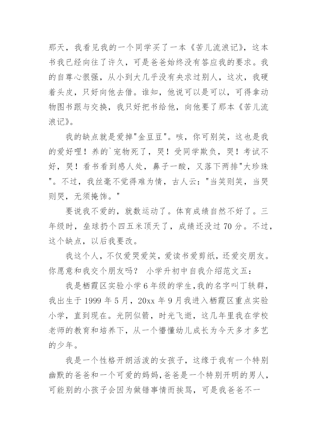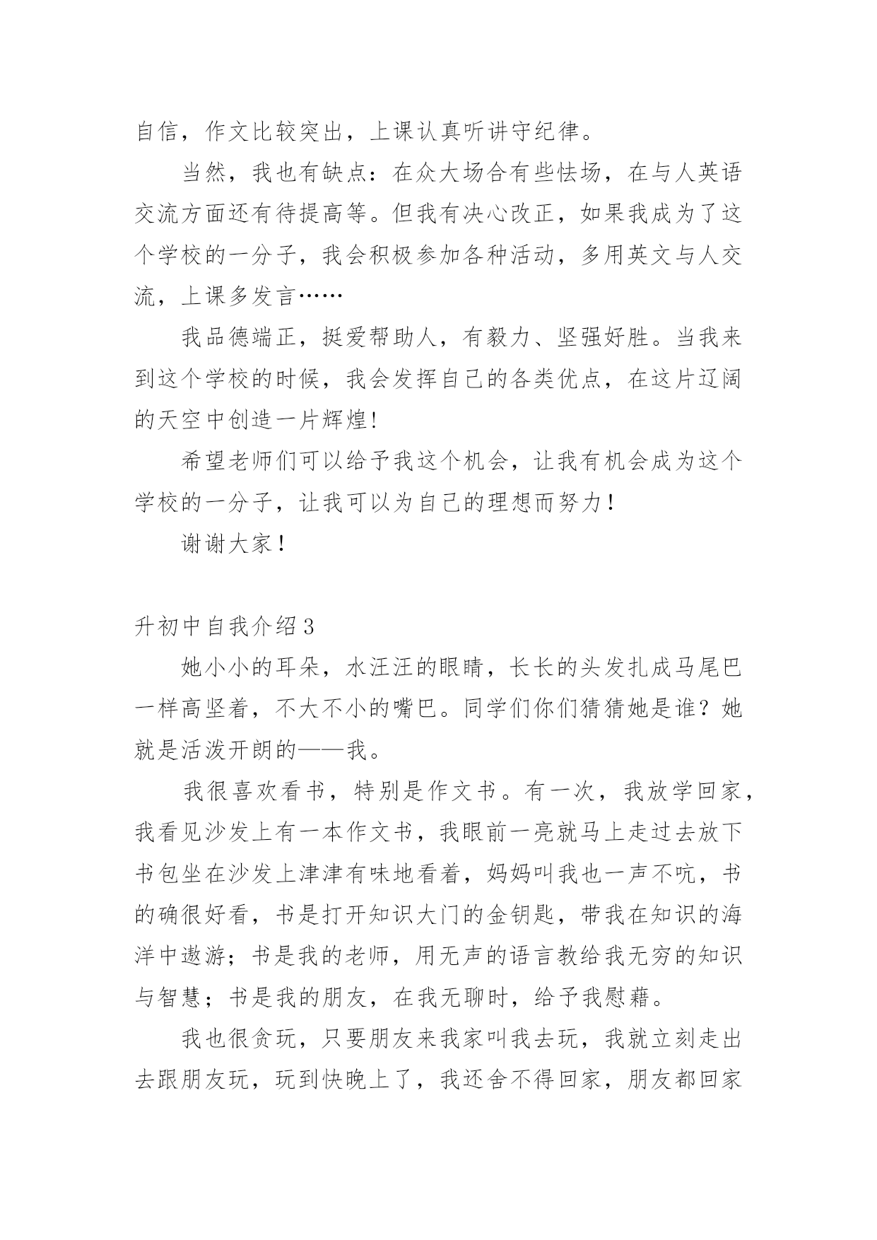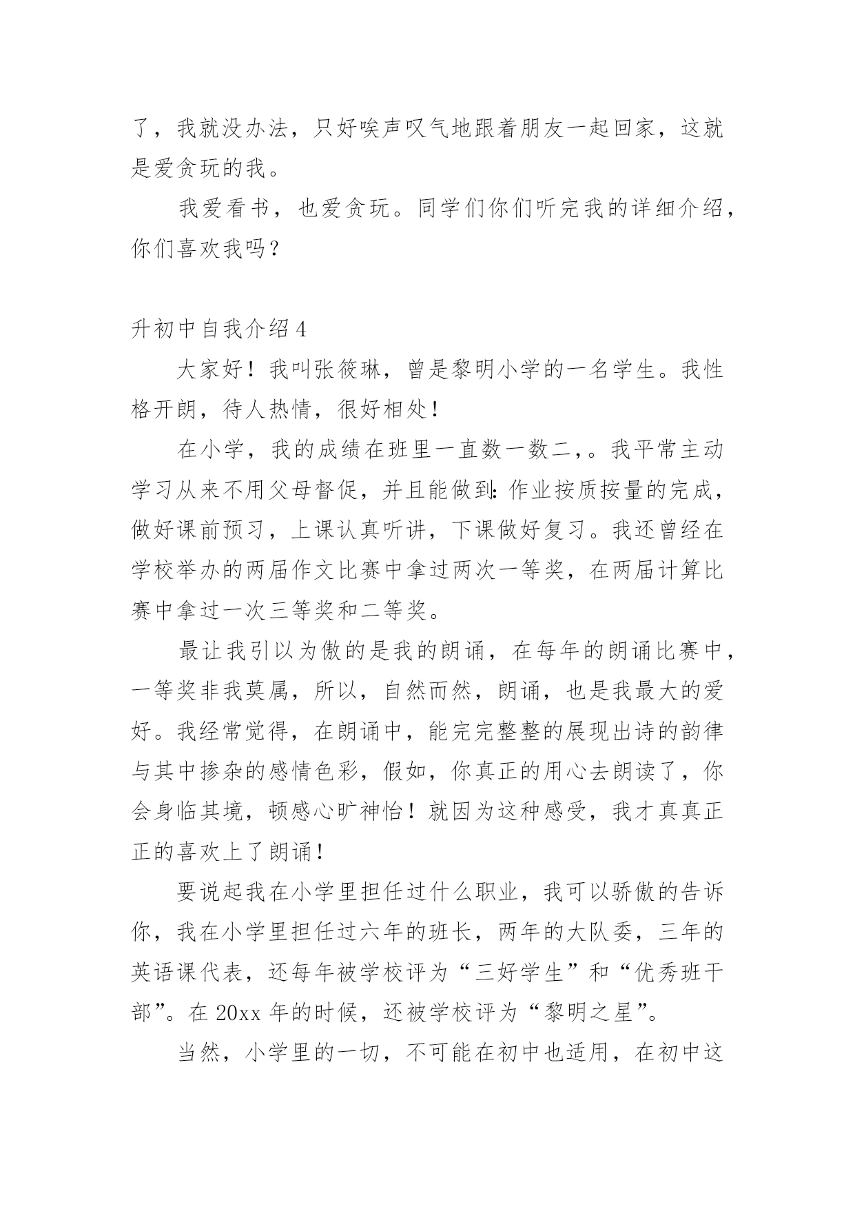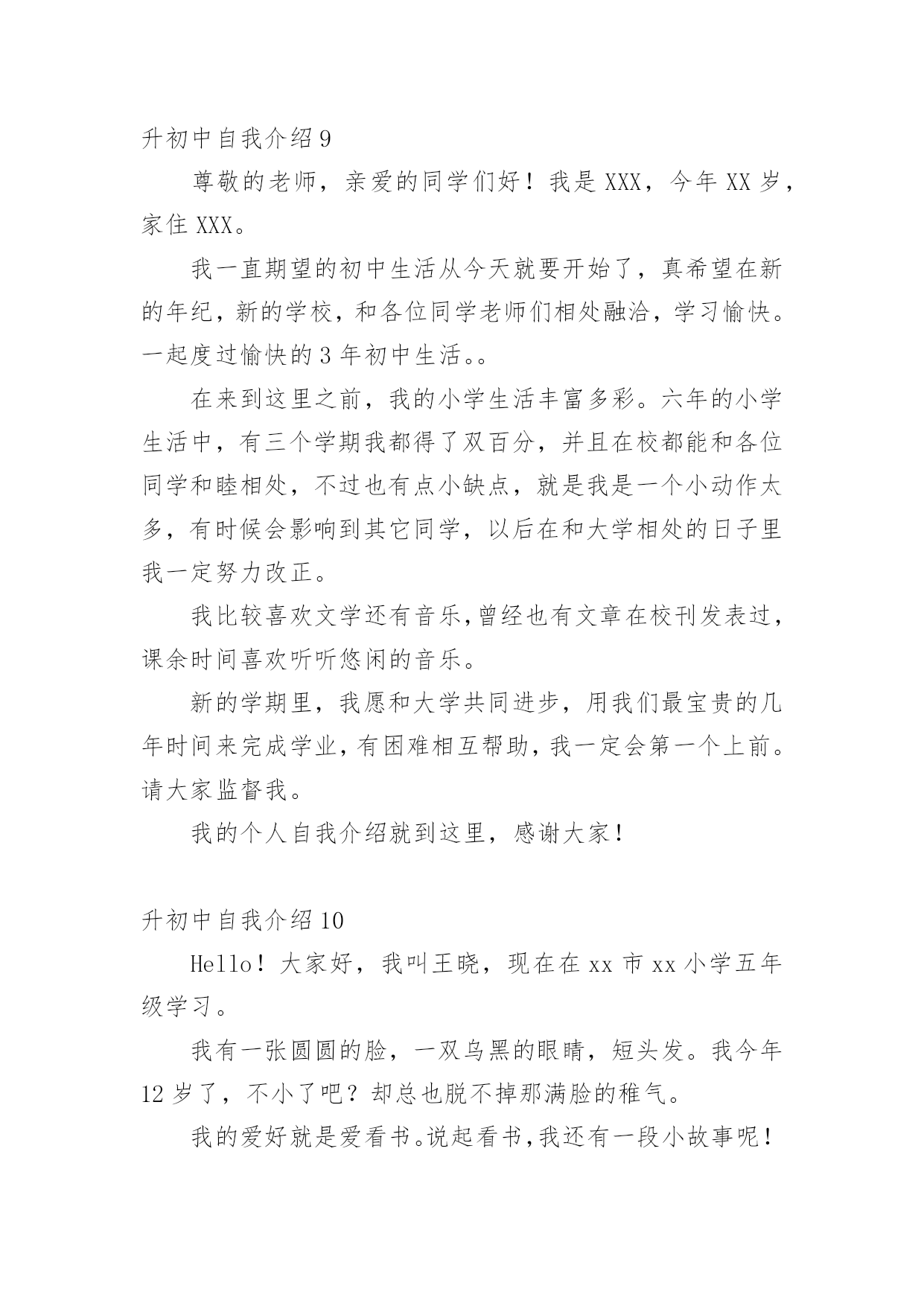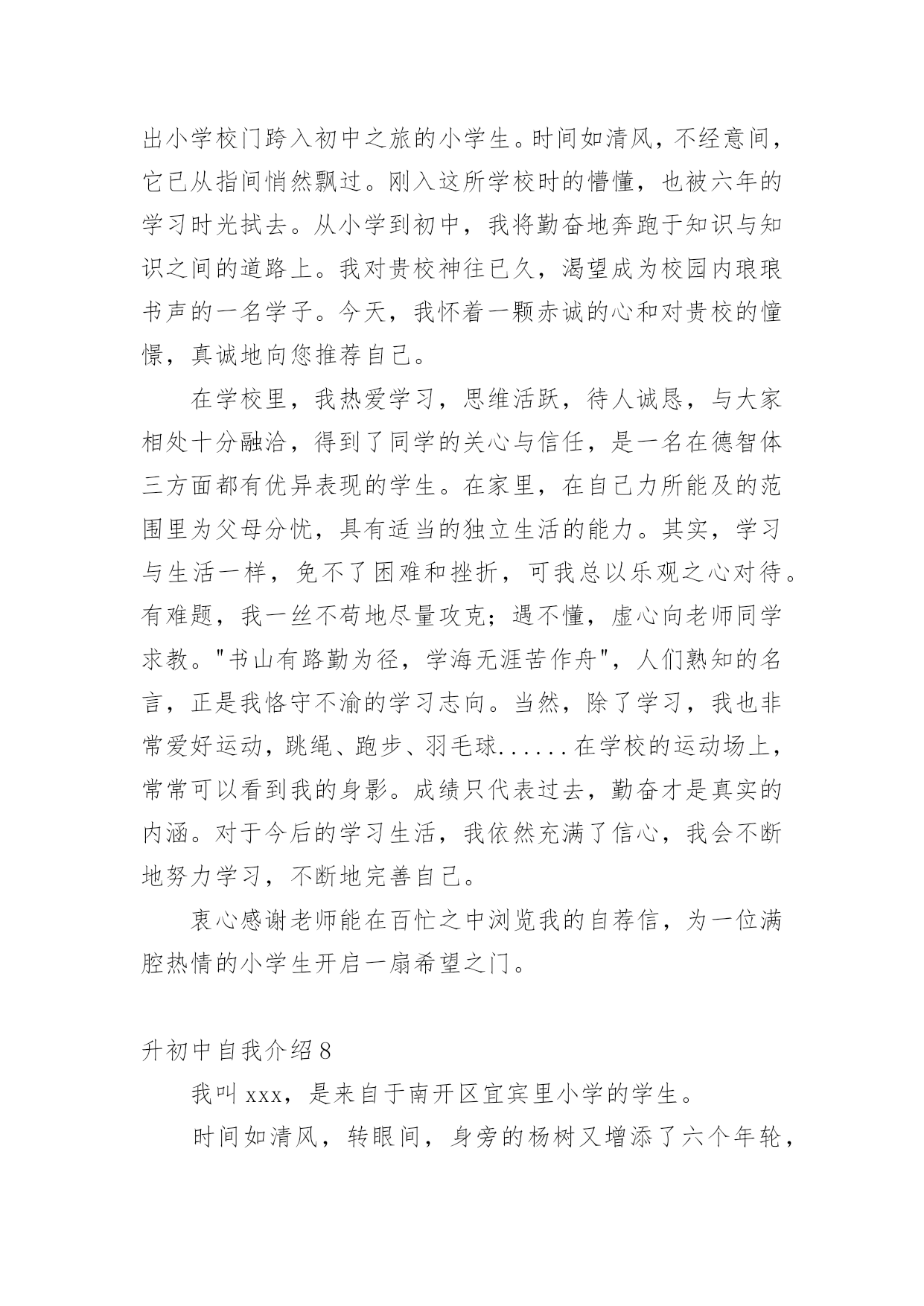 升初中自我介绍升初中自我介绍10篇升初中自我介绍1我叫XXX,今年X岁,是XXXXXXXX学校的学生。在老师心目中,我是一个思维敏捷、领悟力强和爱动脑筋的学生,也是一个学习勤奋、做事认真的学生。我的学习成绩一直在班级中名列前茅,而且对数学学习特别感兴趣。在老师和家长的帮助下,我养成了良好的学习习惯,每天坚持预习,上课时认真听讲、积极发言,家庭作业既整齐又正确。良好的学习习惯和一丝不苟的学习态度,使我成为老师们眼中的优秀学生。在近六年的学习中,我多次获得单科免考并在各类评比中获得了优异成绩:每学期都被评为学校"三好学生",在南京数学学会组织的"智力数学大比拼"和"南京市第九届小学智力数学冬令营竞赛"中均获得了二等奖,在江苏现代教育培训中心和《小学生报》组织的第五届"现代杯小学生学习能力测试"语文学科和数学学科中分别获得二等奖,在校英语百词竞赛中荣获一等奖,在校数学竞赛和英语故事演讲比赛中分别获得二等奖,被鼓楼区教育局评为20xx年度和20xx年度鼓楼区"学习之星",获得20xx年度鼓楼区"优秀少先队员"称号。我的爱好十分广泛,课外时间学习了民族乐器二胡,取得了江苏省音乐家协会组织的二胡水平考级玖级良好的成绩,我还对竖笛和书法着迷,课余时间参加了学校组织的竖笛和书法兴趣班,不仅能熟练吹奏许多竖笛曲子,而且成了校竖笛队的优秀学员,在江苏省中小学生书法(写字)大赛中,我的书法(写字)作品获得了"金奖",在学校举办的第四届春季田径运动会中,我获得了四年级女子组100米和跳远2个第一名。在学校的"小艺术家"评比中,我分别被被评为"小电脑家"、"小书法家"和"小健将"。我除了喜爱学习还喜欢科学,从三年级起就订阅《我们爱科学》,每一期杂志都是一口气读完还意犹未尽,我也爱看中央电视台《走近科学》栏目,从中了解到了许多科学常识,在"鼓楼区首届中小学生学科性小论文"评选中,我撰写的《响水壶的秘密》获得了二等奖。我热爱班级集体,热心公共活动,作为一名中队委,我带领同学们认真参加大队各项活动,努力成为老师的小助手。在"手拉手、心连心、与凉山孩子零距离"活动中,我获得了"爱心大使"称号,在"童心红丝带"活动中荣获优秀个人奖。未来学习之路还很漫长,我将继续努力,认真踏实、勤奋刻苦,争做一名老师和同学眼中的好学生。升初中自我介绍2各位老师:大家好!我是来自柯城区大成小学六(4)班的徐一诺。我性格开朗、活泼、乐观、向上,我爱好广泛,喜欢运动、唱歌和英语。我有许多优点:积极向上,主科副科都较好,乐观自信,作文比较突出,上课认真听讲守纪律。当然,我也有缺点:在众大场合有些怯场,在与人英语交流方面还有待提高等。但我有决心改正,如果我成为了这个学校的一分子,我会积极参加各种活动,多用英文与人交流,上课多发言……我品德端正,挺爱帮助人,有毅力、坚强好胜。当我来到这个学校的时候,我会发挥自己的各类优点,在这片辽阔的天空中创造一片辉煌!希望老师们可以给予我这个机会,让我有机会成为这个学校的一分子,让我可以为自己的理想而努力!谢谢大家!升初中自我介绍3她小小的耳朵,水汪汪的眼睛,长长的头发扎成马尾巴一样高坚着,不大不小的嘴巴。同学们你们猜猜她是谁?她就是活泼开朗的——我。我很喜欢看书,特别是作文书。有一次,我放学回家,我看见沙发上有一本作文书,我眼前一亮就马上走过去放下书包坐在沙发上津津有味地看着,妈妈叫我也一声不吭,书的确很好看,书是打开知识大门的金钥匙,带我在知识的海洋中遨游;书是我的老师,用无声的语言教给我无穷的知识与智慧;书是我的朋友,在我无聊时,给予我慰藉。我也很贪玩,只要朋友来我家叫我去玩,我就立刻走出去跟朋友玩,玩到快晚上了,我还舍不得回家,朋友都回家了,我就没办法,只好唉声叹气地跟着朋友一起回家,这就是爱贪玩的我。我爱看书,也爱贪玩。同学们你们听完我的详细介绍,你们喜欢我吗?升初中自我介绍4大家好!我叫张筱琳,曾是黎明小学的一名学生。我性格开朗,待人热情,很好相处!在小学,我的成绩在班里一直数一数二,。我平常主动学习从来不用父母督促,并且能做到:作业按质按量的完成,做好课前预习,上课认真听讲,下课做好复习。我还曾经在学校举办的两届作文比赛中拿过两次一等奖,在两届计算比赛中拿过一次三等奖和二等奖。最让我引以为傲的是我的朗诵,在每年的朗诵比赛中,一等奖非我莫属,所以,自然而然,朗诵,也是我最大的爱好。我经常觉得,在朗诵中,能完完整整的展现出诗的韵律与其中掺杂的感情色彩,假如,你真正的用心去朗读了,你会身临其境,顿感心旷神怡!就因为这种感受,我才真真正正的喜欢上了朗诵!要说起我在小学里担任过什么职业,我可以骄傲的告诉你,我在小学里担任过六年的班长,两年的大队委,三年的英语课代表,还每年被学校评为“三好学生”和“优秀班干部”。在20xx年的时候,还被学校评为“黎明