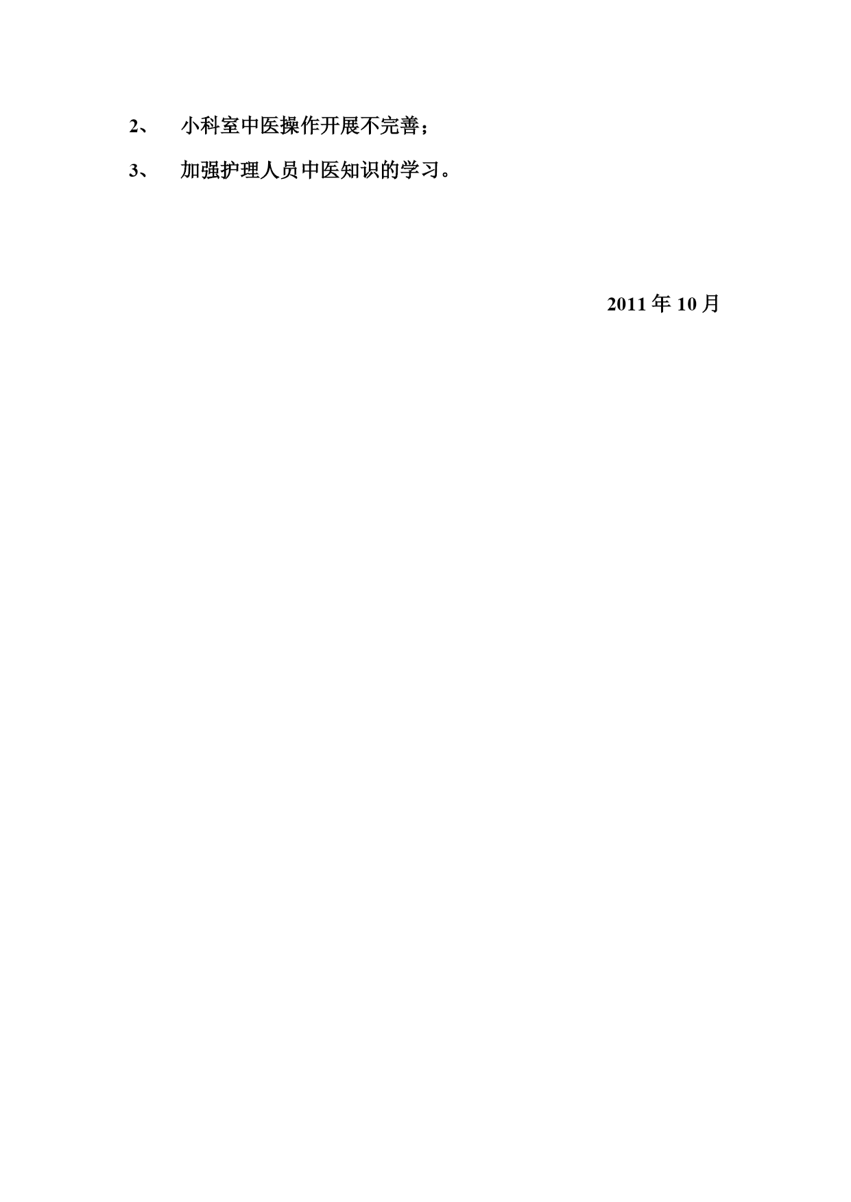 2011年中医护理技术操作培训总结中医护理工作,是中医医院护理工作的重要内容,,是体现中医特色优势的重要一方面,为更好推动我院中医护理工作的扎实开展,更好地服务于广大人民群众,按照年初的护理工作计划,结合我院实际,现将2011年护理人员中医培训总结如下:中医基础知识学习方面认真学习了《中医医院中医护理工作指南》;为科室护理人员购买了《中医基础理论》和《中医护理学基础》;组织两次中医基础理论知识考试,人人掌握,人人过关。中医护理技术操作培训方面按照护理部制定的《中医护理八项技术操作培训计划》内容,邀请院内资深中医人士对全院护理人员进行讲解和现场演示,包括拔罐、刮痧、涂药、湿敷、熏蒸等八项中医技术操作的适应症、禁忌症、操作方法等;邀请院内3名高年资中医护理人员对我院开展的中医护理操作进行现场演示,让全院护理人员掌握操作的步骤及方法;对全院护理人员进行中医操作考试。存在不足低年资的护士对中医特色的整体护理落实不到位,中医知识有待提高;小科室中医操作开展不完善;加强护理人员中医知识的学习。2011年10月