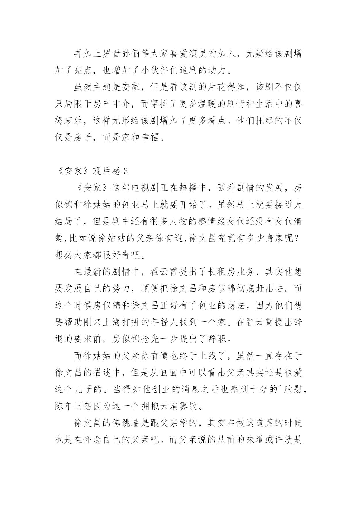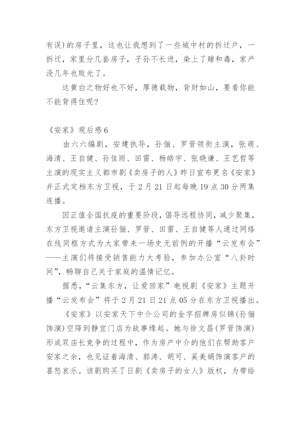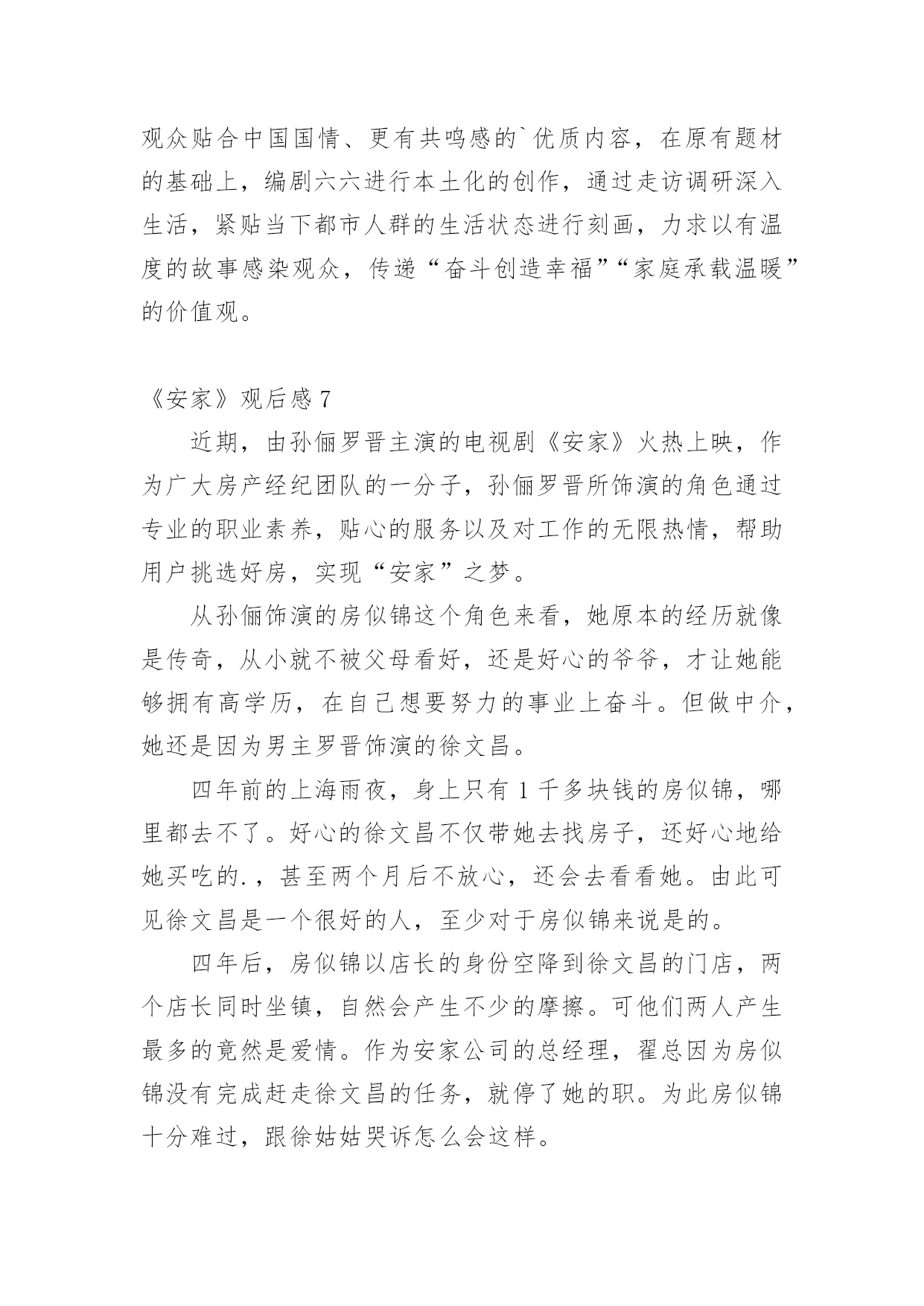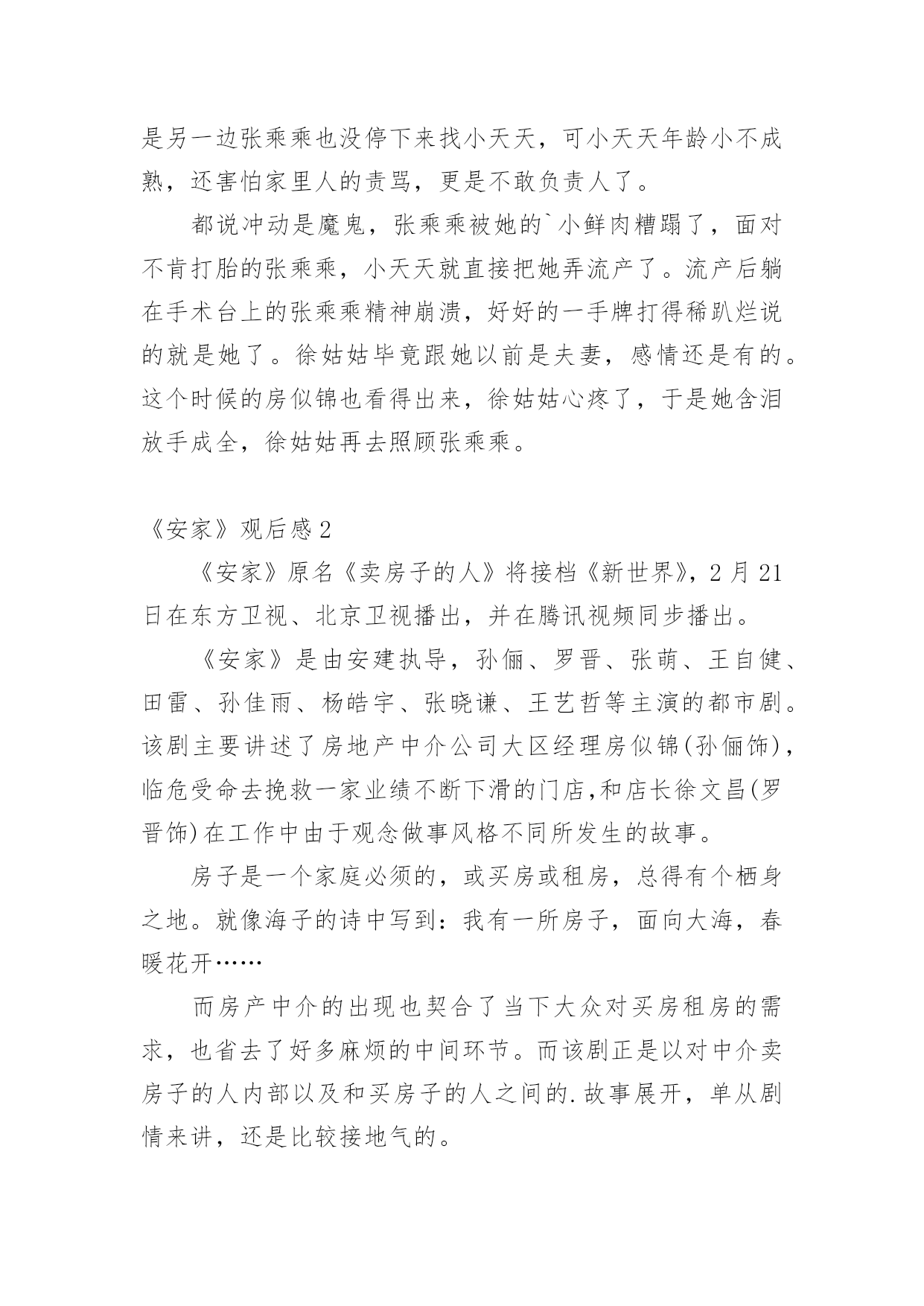 《安家》观后感当观看完一部影视作品后,相信大家的收获肯定不少吧,不能光会看哦,写一篇观后感吧。那要怎么写好观后感呢?以下是小编整理的《安家》观后感,希望能够帮助到大家。《安家》观后感1由六六编剧,安建执导,孙俪、罗晋领衔主演,张萌、海清、王自健、孙佳雨、田雷、杨皓宇、张晓谦、王艺哲等主演的现实主义都市剧《安家》正在热播。张萌饰演的徐姑姑的前妻张乘乘,真的是气到观众了,被张乘乘气死了也登上了微博热搜。据了解,张乘乘这个觉得十分惹人厌,很多演员对于这样的角色都十分的抵触。到后来作为耀客的老板娘,张萌决定亲自上,不仅省钱演技上也有保障。于是,我们就看到了这样一个张乘乘,虽然讨厌,但还有那么点可爱,你们觉得呢?张乘乘和徐姑姑原本是夫妻,张乘乘一嘴一个哥哥的叫着,想必把徐姑姑的心都化掉了。两人的生活越来越好了,可张乘乘想要买第二套房子,于是他们就想到了假离婚。但是张乘乘出轨小鲜肉,假离婚变成了真离婚。可是,徐姑姑再给张乘乘几次说明白之后,她依旧纠缠不清。这次竟然说自己怀孕了,孩子是姑姑的,其实孩子就是她出轨的小鲜肉小天天的。就是想要套牢徐姑姑而已。但是另一边张乘乘也没停下来找小天天,可小天天年龄小不成熟,还害怕家里人的责骂,更是不敢负责人了。都说冲动是魔鬼,张乘乘被她的`小鲜肉糟蹋了,面对不肯打胎的张乘乘,小天天就直接把她弄流产了。流产后躺在手术台上的张乘乘精神崩溃,好好的一手牌打得稀趴烂说的就是她了。徐姑姑毕竟跟她以前是夫妻,感情还是有的。这个时候的房似锦也看得出来,徐姑姑心疼了,于是她含泪放手成全,徐姑姑再去照顾张乘乘。《安家》观后感2《安家》原名《卖房子的人》将接档《新世界》,2月21日在东方卫视、北京卫视播出,并在腾讯视频同步播出。《安家》是由安建执导,孙俪、罗晋、张萌、王自健、田雷、孙佳雨、杨皓宇、张晓谦、王艺哲等主演的都市剧。该剧主要讲述了房地产中介公司大区经理房似锦(孙俪饰),临危受命去挽救一家业绩不断下滑的门店,和店长徐文昌(罗晋饰)在工作中由于观念做事风格不同所发生的故事。房子是一个家庭必须的,或买房或租房,总得有个栖身之地。就像海子的诗中写到:我有一所房子,面向大海,春暖花开……而房产中介的出现也契合了当下大众对买房租房的需求,也省去了好多麻烦的中间环节。而该剧正是以对中介卖房子的人内部以及和买房子的人之间的.故事展开,单从剧情来讲,还是比较接地气的。再加上罗晋孙俪等大家喜爱演员的加入,无疑给该剧增加了亮点,也增加了小伙伴们追剧的动力。虽然主题是安家,但是看该剧的片花得知,该剧不仅仅只局限于房产中介,而穿插了更多温暖的剧情和生活中的喜怒哀乐,这样无形给该剧增加了更多看点。他们托起的不仅仅是房子,而是家和幸福。《安家》观后感3《安家》这部电视剧正在热播中,随着剧情的发展,房似锦和徐姑姑的创业马上就要开始了。虽然马上就要接近大结局了,但是剧中还有很多人物的感情线交代还没有交代清楚,比如说徐姑姑的父亲徐有道,徐文昌究竟有多少身家呢?想必大家都很好奇吧。在最新的剧情中,翟云霄提出了长租房业务,其实他想要发展自己的势力,顺便把徐文昌和房似锦彻底赶出去。而这个时候房似锦和徐文昌正好有了创业的想法,因为他们想要帮助刚来上海打拼的年轻人找到一个家。在翟云霄提出辞退的要求前,房似锦抢先一步提出了辞职。而徐姑姑的父亲徐有道也终于上线了,虽然一直存在于徐文昌的描述中,但是从画面中可以看出父亲其实还是很爱这个儿子的。当得知他创业的消息之后也感到十分的`欣慰,陈年旧怨因为这一个拥抱云消雾散。徐文昌的佛跳墙是跟父亲学的,其实在做这道菜的时候也是在怀念自己的父亲吧。而父亲说的从前的味道或许就是从前的关系,在徐文昌创业的时候这个老爸站出来助自己儿子一臂之力,徐文昌有了很大的经济后盾。潘贵雨住院之后,弟弟来到了房似锦身边告诉她自己开始打两份工一定可以自己还清房贷的。看着懂事的弟弟和病重的母亲房似锦内心有了一个小裂口,最后终于原谅了母亲并且带着自己的弟弟一起创业了,这样的大结局也算是很美好了吧。《安家》观后感4《安家》这部电视剧反映了城乡差别,是个大主题。有利于推进城乡一体化的社会进步发展。是一部批判现实主义的好剧。没有批评就没有团结,没有批判就没有社会的进步。六六是位批判现实主义的剧作家,很有分量。如果她自己都不知道,那这个现实题材的职场狗血伦理剧就真的糟糕透了!此剧最成功的形象潘贵雨,她贯穿剧目的.始终。她做着一件始终如一的事,向她进了城的亲生女儿房四井要钱,天经地义的要钱。其狠莫过于此。其真也在如此,其希望还在于此。编剧六六是位现实主义的代表作家。小娄,他的母亲是个赌徒,家里欠债,他却没有学坏,努力挣钱帮父亲还钱。房似井,家里对她那么恶劣,她却能以德报怨,开辟出自己的天地,体现出自己的人生价值。徐姑姑,更是以自己的正能量感染着周围的人。《安家