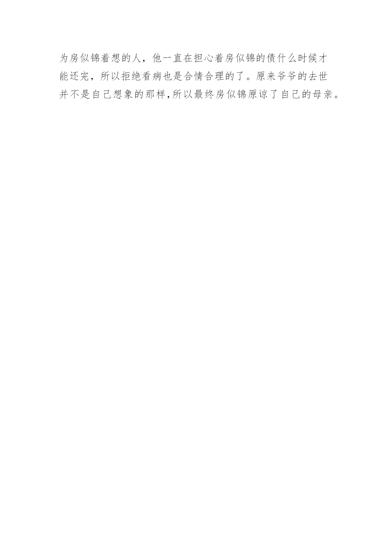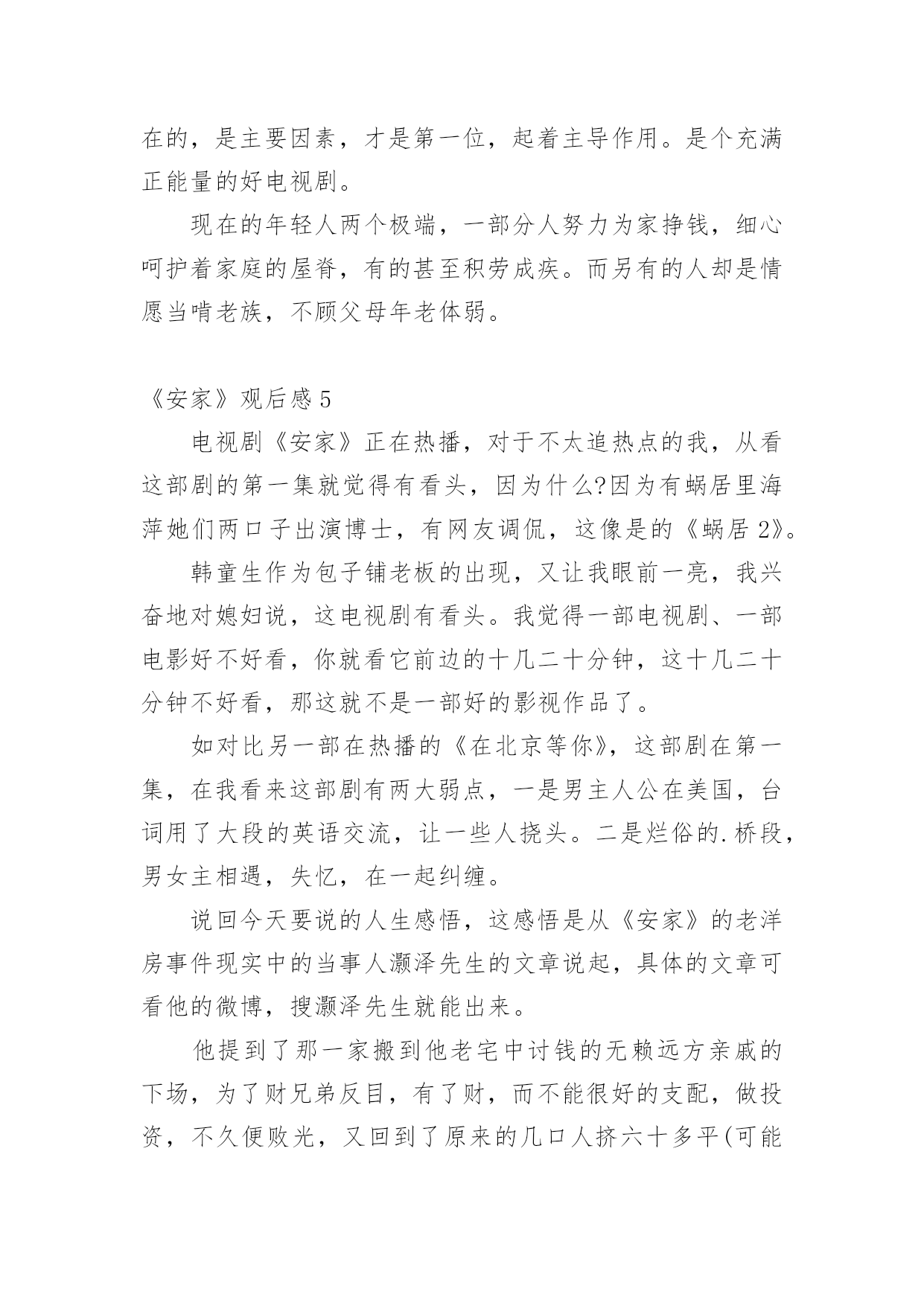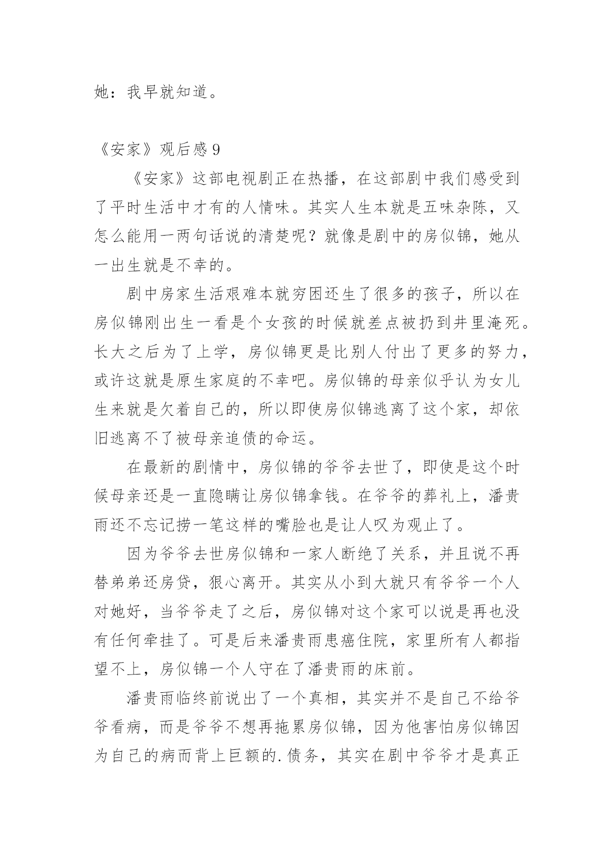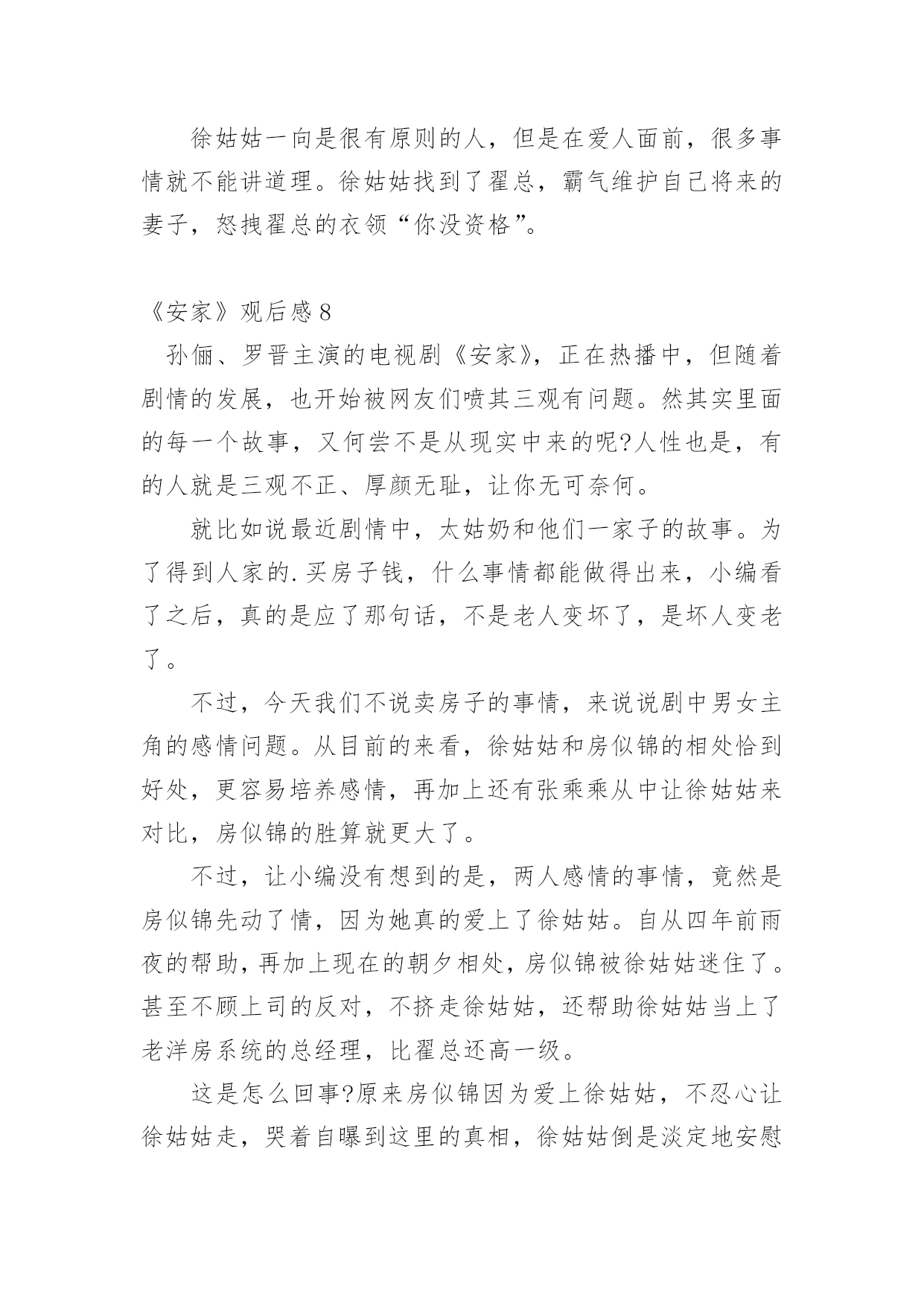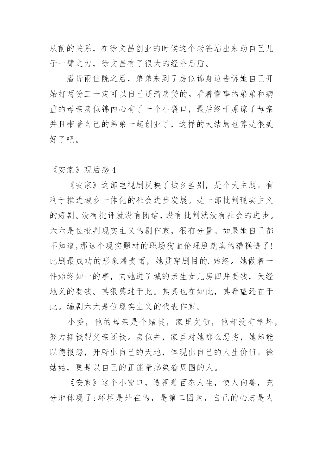 《安家》观后感当观看完一部影视作品后,相信大家的收获肯定不少吧,不能光会看哦,写一篇观后感吧。那要怎么写好观后感呢?以下是小编整理的《安家》观后感,希望能够帮助到大家。《安家》观后感1由六六编剧,安建执导,孙俪、罗晋领衔主演,张萌、海清、王自健、孙佳雨、田雷、杨皓宇、张晓谦、王艺哲等主演的现实主义都市剧《安家》正在热播。张萌饰演的徐姑姑的前妻张乘乘,真的是气到观众了,被张乘乘气死了也登上了微博热搜。据了解,张乘乘这个觉得十分惹人厌,很多演员对于这样的角色都十分的抵触。到后来作为耀客的老板娘,张萌决定亲自上,不仅省钱演技上也有保障。于是,我们就看到了这样一个张乘乘,虽然讨厌,但还有那么点可爱,你们觉得呢?张乘乘和徐姑姑原本是夫妻,张乘乘一嘴一个哥哥的叫着,想必把徐姑姑的心都化掉了。两人的生活越来越好了,可张乘乘想要买第二套房子,于是他们就想到了假离婚。但是张乘乘出轨小鲜肉,假离婚变成了真离婚。可是,徐姑姑再给张乘乘几次说明白之后,她依旧纠缠不清。这次竟然说自己怀孕了,孩子是姑姑的,其实孩子就是她出轨的小鲜肉小天天的。就是想要套牢徐姑姑而已。但是另一边张乘乘也没停下来找小天天,可小天天年龄小不成熟,还害怕家里人的责骂,更是不敢负责人了。都说冲动是魔鬼,张乘乘被她的`小鲜肉糟蹋了,面对不肯打胎的张乘乘,小天天就直接把她弄流产了。流产后躺在手术台上的张乘乘精神崩溃,好好的一手牌打得稀趴烂说的就是她了。徐姑姑毕竟跟她以前是夫妻,感情还是有的。这个时候的房似锦也看得出来,徐姑姑心疼了,于是她含泪放手成全,徐姑姑再去照顾张乘乘。《安家》观后感2《安家》原名《卖房子的人》将接档《新世界》,2月21日在东方卫视、北京卫视播出,并在腾讯视频同步播出。《安家》是由安建执导,孙俪、罗晋、张萌、王自健、田雷、孙佳雨、杨皓宇、张晓谦、王艺哲等主演的都市剧。该剧主要讲述了房地产中介公司大区经理房似锦(孙俪饰),临危受命去挽救一家业绩不断下滑的门店,和店长徐文昌(罗晋饰)在工作中由于观念做事风格不同所发生的故事。房子是一个家庭必须的,或买房或租房,总得有个栖身之地。就像海子的诗中写到:我有一所房子,面向大海,春暖花开……而房产中介的出现也契合了当下大众对买房租房的需求,也省去了好多麻烦的中间环节。而该剧正是以对中介卖房子的人内部以及和买房子的人之间的.故事展开,单从剧情来讲,还是比较接地气的。再加上罗晋孙俪等大家喜爱演员的加入,无疑给该剧增加了亮点,也增加了小伙伴们追剧的动力。虽然主题是安家,但是看该剧的片花得知,该剧不仅仅只局限于房产中介,而穿插了更多温暖的剧情和生活中的喜怒哀乐,这样无形给该剧增加了更多看点。他们托起的不仅仅是房子,而是家和幸福。《安家》观后感3《安家》这部电视剧正在热播中,随着剧情的发展,房似锦和徐姑姑的创业马上就要开始了。虽然马上就要接近大结局了,但是剧中还有很多人物的感情线交代还没有交代清楚,比如说徐姑姑的父亲徐有道,徐文昌究竟有多少身家呢?想必大家都很好奇吧。在最新的剧情中,翟云霄提出了长租房业务,其实他想要发展自己的势力,顺便把徐文昌和房似锦彻底赶出去。而这个时候房似锦和徐文昌正好有了创业的想法,因为他们想要帮助刚来上海打拼的年轻人找到一个家。在翟云霄提出辞退的要求前,房似锦抢先一步提出了辞职。而徐姑姑的父亲徐有道也终于上线了,虽然一直存在于徐文昌的描述中,但是从画面中可以看出父亲其实还是很爱这个儿子的。当得知他创业的消息之后也感到十分的`欣慰,陈年旧怨因为这一个拥抱云消雾散。徐文昌的佛跳墙是跟父亲学的,其实在做这道菜的时候也是在怀念自己的父亲吧。而父亲说的从前的味道或许就是从前的关系,在徐文昌创业的时候这个老爸站出来助自己儿子一臂之力,徐文昌有了很大的经济后盾。潘贵雨住院之后,弟弟来到了房似锦身边告诉她自己开始打两份工一定可以自己还清房贷的。看着懂事的弟弟和病重的母亲房似锦内心有了一个小裂口,最后终于原谅了母亲并且带着自己的弟弟一起创业了,这样的大结局也算是很美好了吧。《安家》观后感4《安家》这部电视剧反映了城乡差别,是个大主题。有利于推进城乡一体化的社会进步发展。是一部批判现实主义的好剧。没有批评就没有团结,没有批判就没有社会的进步。六六是位批判现实主义的剧作家,很有分量。如果她自己都不知道,那这个现实题材的职场狗血伦理剧就真的糟糕透了!此剧最成功的形象潘贵雨,她贯穿剧目的.始终。她做着一件始终如一的事,向她进了城的亲生女儿房四井要钱,天经地义的要钱。其狠莫过于此。其真也在如此,其希望还在于此。编剧六六是位现实主义的代表作家。小娄,他的母亲是个赌徒,家里欠债,他却没有学坏,努力挣钱帮父亲还钱。房似井,家里对她那么恶劣,她却能以德报怨,开辟出自己的天地,体现出自己的人生价值。徐姑姑,更是以自己的正能量感染着周围的人。《安家