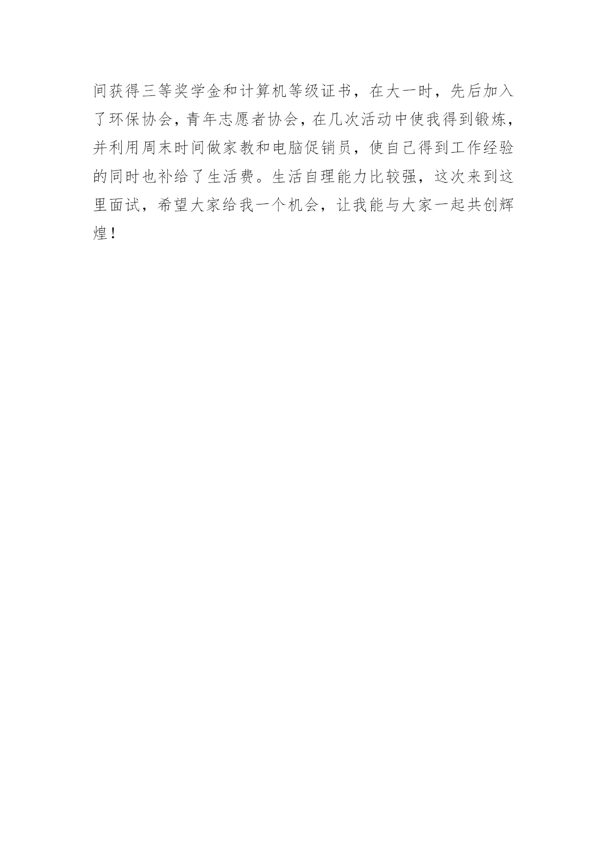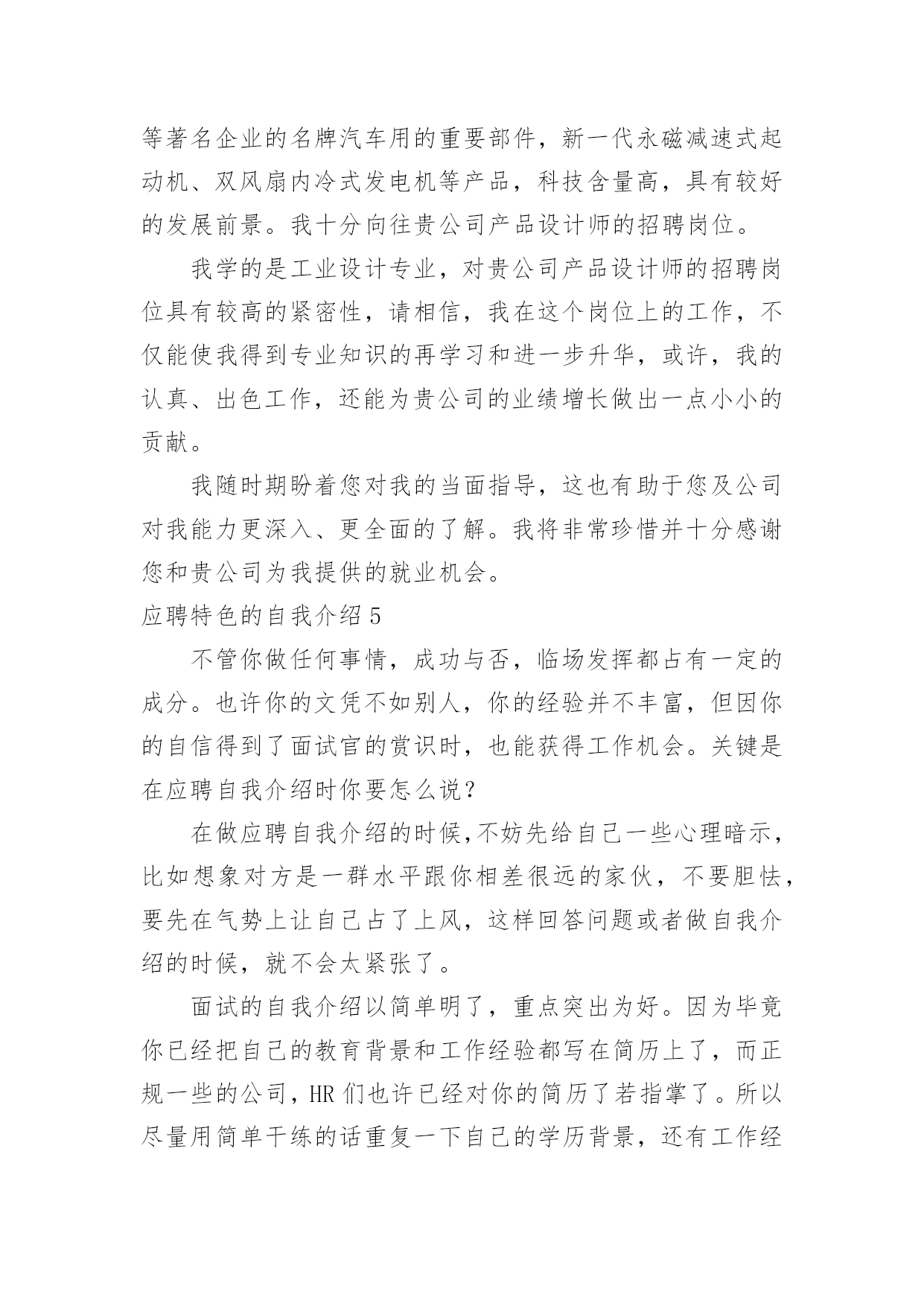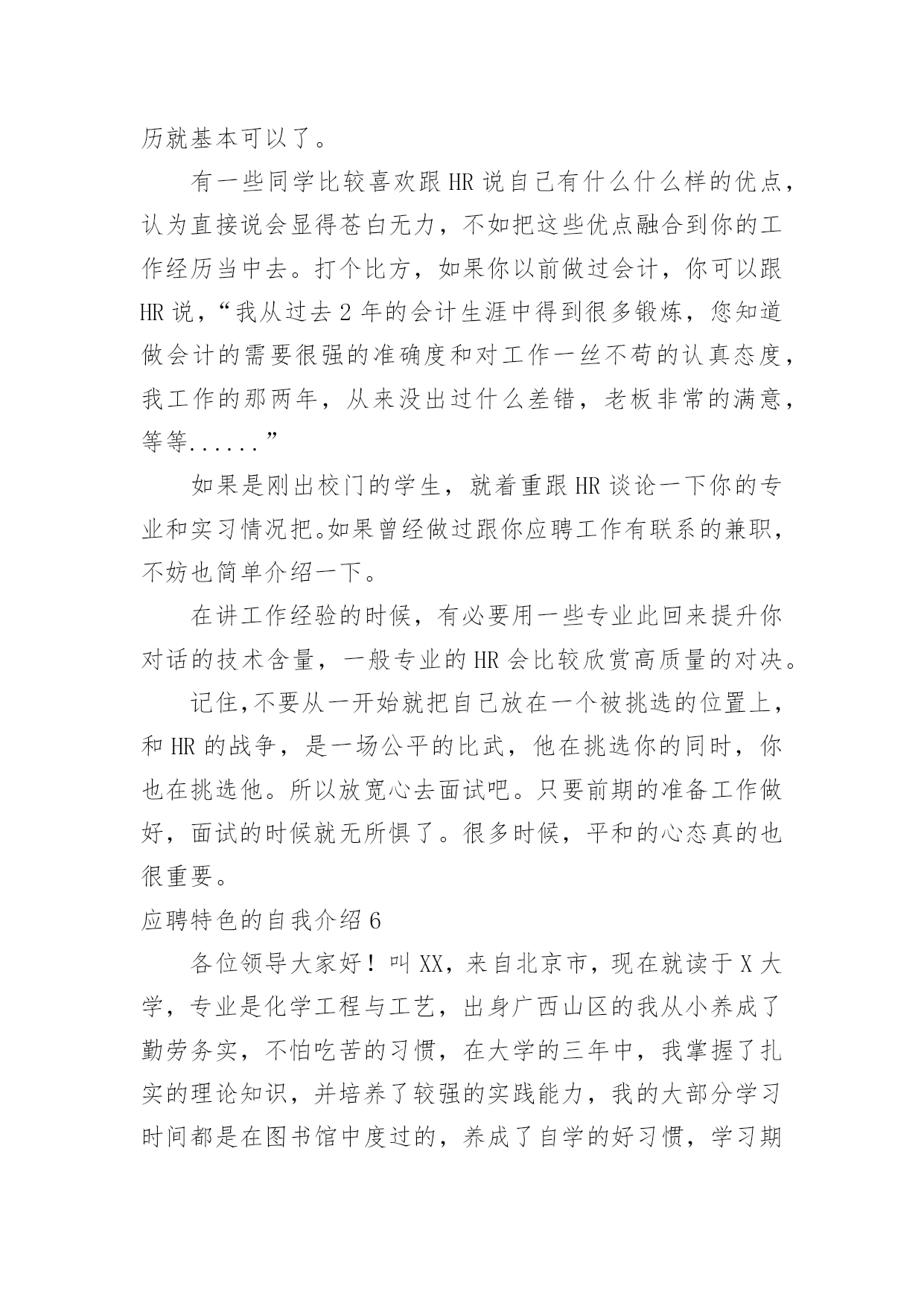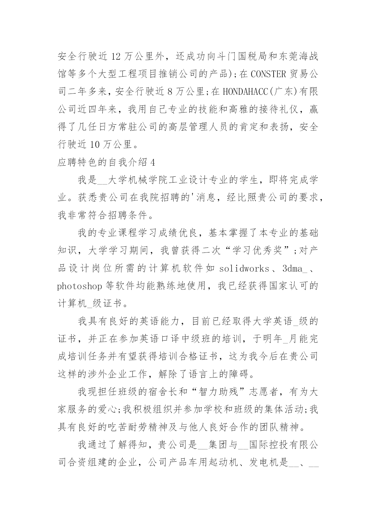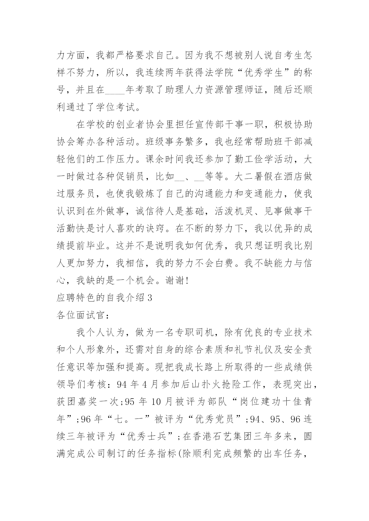 应聘特色的自我介绍应聘特色的自我介绍处在一个陌生场合时,我们时常会需要作自我介绍,用自我介绍往往可以向他人介绍自己。写自我介绍可不能随随便便哦,下面是小编收集整理的应聘特色的自我介绍,仅供参考,欢迎大家阅读。应聘特色的自我介绍1各位领导大家好!叫XX,来自北京市,现在就读于X大学,专业是化学工程与工艺,出身广西山区的我从小养成了勤劳务实,不怕吃苦的习惯,在大学的三年中,我掌握了扎实的理论知识,并培养了较强的实践能力,我的大部分学习时间都是在图书馆中度过的,养成了自学的好习惯,学习期间获得三等奖学金和计算机等级证书,在大一时,先后加入了环保协会,青年志愿者协会,在几次活动中使我得到锻炼,并利用周末时间做家教和电脑促销员,使自己得到工作经验的同时也补给了生活费。生活自理能力比较强,这次来到这里面试,希望大家给我一个机会,让我能与大家一起共创辉煌!应聘特色的自我介绍2我是__人,____年因为高考发挥失常,我选择了__大学自考本科,学的是法律,在读大学的日子里,我一直很注重提高自己的综合素质,不管是从学业上还是在处理事情的能力方面,我都严格要求自己。因为我不想被别人说自考生怎样不努力,所以,我连续两年获得法学院“优秀学生”的称号,并且在____年考取了助理人力资源管理师证,随后还顺利通过了学位考试。在学校的创业者协会里担任宣传部干事一职,积极协助协会筹办各种活动。班级事务繁多,我也经常帮助班干部减轻他们的工作压力。课余时间我还参加了勤工俭学活动,大一时做过各种促销员,比如__、__等等。大二暑假在酒店做过服务员,也使我锻炼了自己的沟通能力和变通能力,使我认识到在外做事,诚信待人是基础,活泼机灵、见事做事干活勤快是讨人喜欢的诀窍。在不断的努力下,我以优异的成绩提前毕业。这并不是说明我如何优秀,我只想证明我比别人更加努力,我相信,我的努力不会白费。我不缺能力与信心,我缺的是一个机会。谢谢!应聘特色的自我介绍3各位面试官:我个人认为,做为一名专职司机,除有优良的专业技术和个人形象外,还需对自身的综合素质和礼节礼仪及安全责任意识等加强和提高。现把我成长路上所取得的一些成绩供领导们考核:94年4月参加后山扑火抢险工作,表现突出,获团嘉奖一次;95年10月被评为部队“岗位建功十佳青年”;96年“七。一”被评为“优秀党员”;94、95、96连续三年被评为“优秀士兵”;在香港石艺集团三年多来,圆满完成公司制订的任务指标(除顺利完成频繁的出车任务,安全行驶近12万公里外,还成功向斗门国税局和东莞海战馆等多个大型工程项目推销公司的产品);在CONSTER贸易公司二年多来,安全行驶近8万公里;在HONDAHACC(广东)有限公司近四年来,我用自己专业的技能和高雅的接待礼仪,赢得了几任日方常驻公司的高层管理人员的肯定和表扬,安全行驶近10万公里。应聘特色的自我介绍4我是__大学机械学院工业设计专业的学生,即将完成学业。获悉贵公司在我院招聘的'消息,经比照贵公司的要求,我非常符合招聘条件。我的专业课程学习成绩优良,基本掌握了本专业的基础知识,大学学习期间,我曾获得二次“学习优秀奖”;对产品设计岗位所需的计算机软件如solidworks、3dma_、photoshop等软件均能熟练地使用,我已经获得国家认可的计算机_级证书。我具有良好的英语能力,目前已经取得大学英语_级的证书,并正在参加英语口译中级班的培训,于明年_月能完成培训任务并有望获得培训合格证书,这为我今后在贵公司这样的涉外企业工作,解除了语言上的障碍。我现担任班级的宿舍长和“智力助残”志愿者,有为大家服务的爱心;我积极组织并参加学校和班级的集体活动;我具有良好的吃苦耐劳精神及与他人良好合作的团队精神。我通过了解得知,贵公司是__集团与__国际控投有限公司合资组建的企业,公司产品车用起动机、发电机是__、__等著名企业的名牌汽车用的重要部件,新一代永磁减速式起动机、双风扇内冷式发电机等产品,科技含量高,具有较好的发展前景。我十分向往贵公司产品设计师的招聘岗位。我学的是工业设计专业,对贵公司产品设计师的招聘岗位具有较高的紧密性,请相信,我在这个岗位上的工作,不仅能使我得到专业知识的再学习和进一步升华,或许,我的认真、出色工作,还能为贵公司的业绩增长做出一点小小的贡献。我随时期盼着您对我的当面指导,这也有助于您及公司对我能力更深入、更全面的了解。我将非常珍惜并十分感谢您和贵公司为我提供的就业机会。应聘特色的自我介绍5不管你做任何事情,成功与否,临场发挥都占有一定的成分。也许你的文凭不如别人,你的经验并不丰富,但因你的自信得到了面试官的赏识时,也能获得工作机会。关键是在应聘自我介绍时你要怎么说?在做应聘自我介绍的时候,不妨先给自己一些心理暗示,比如想象对方是一群水平跟你相差很远的家伙,不要胆怯,要先在气