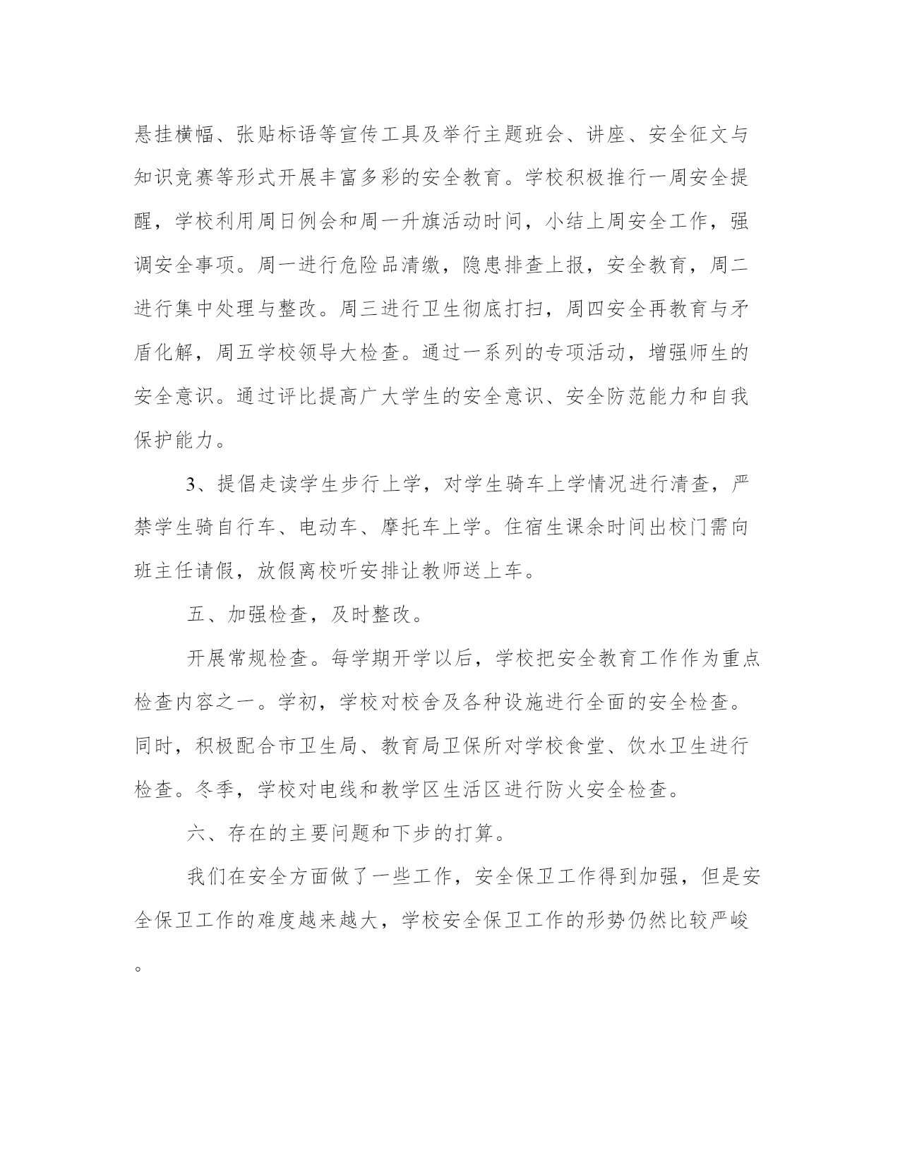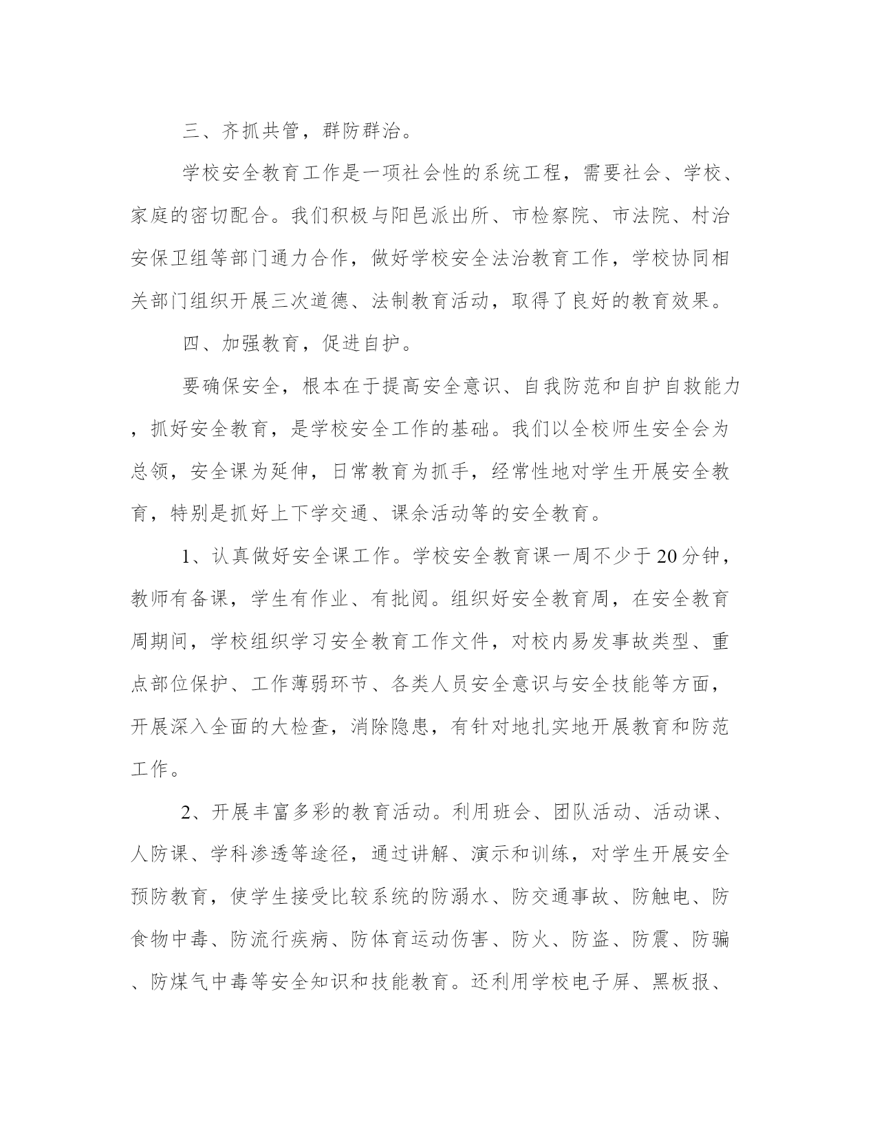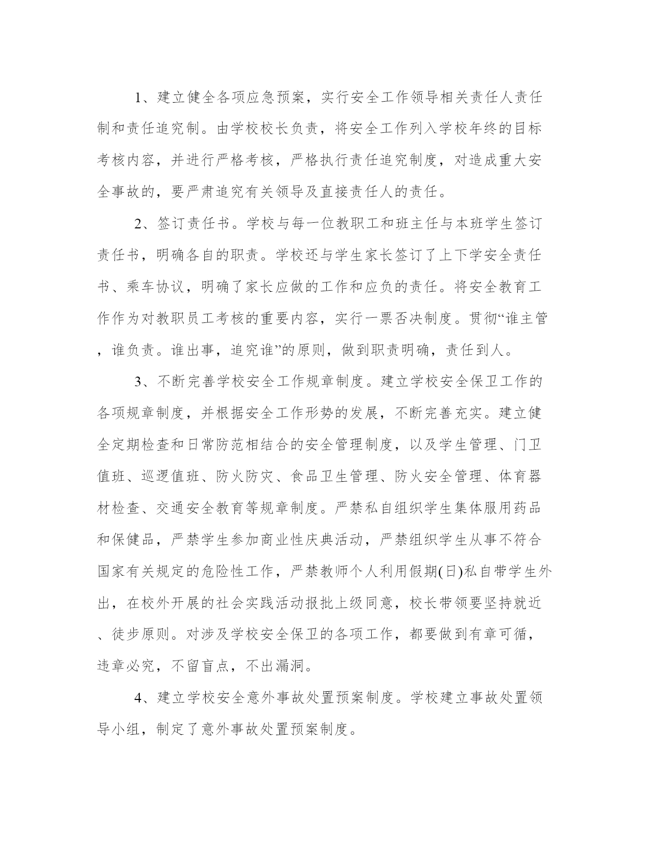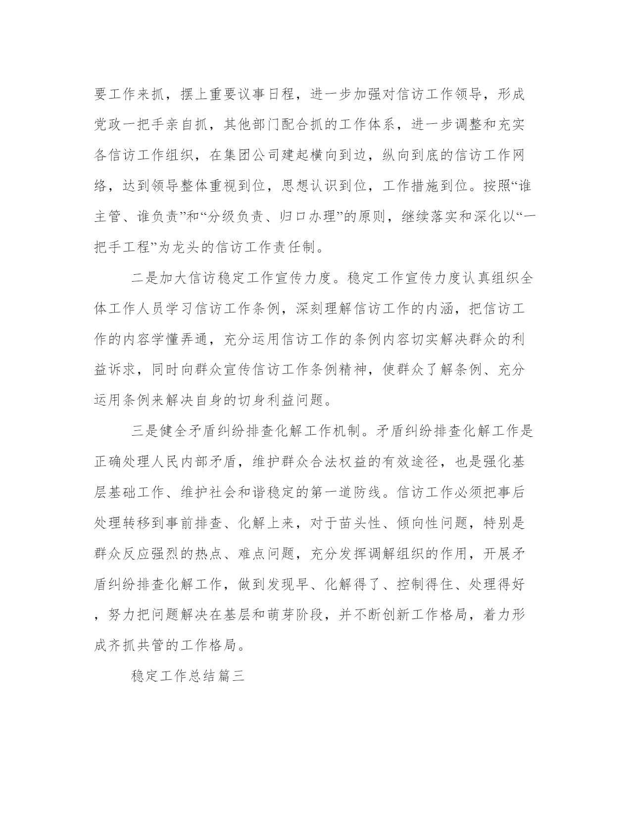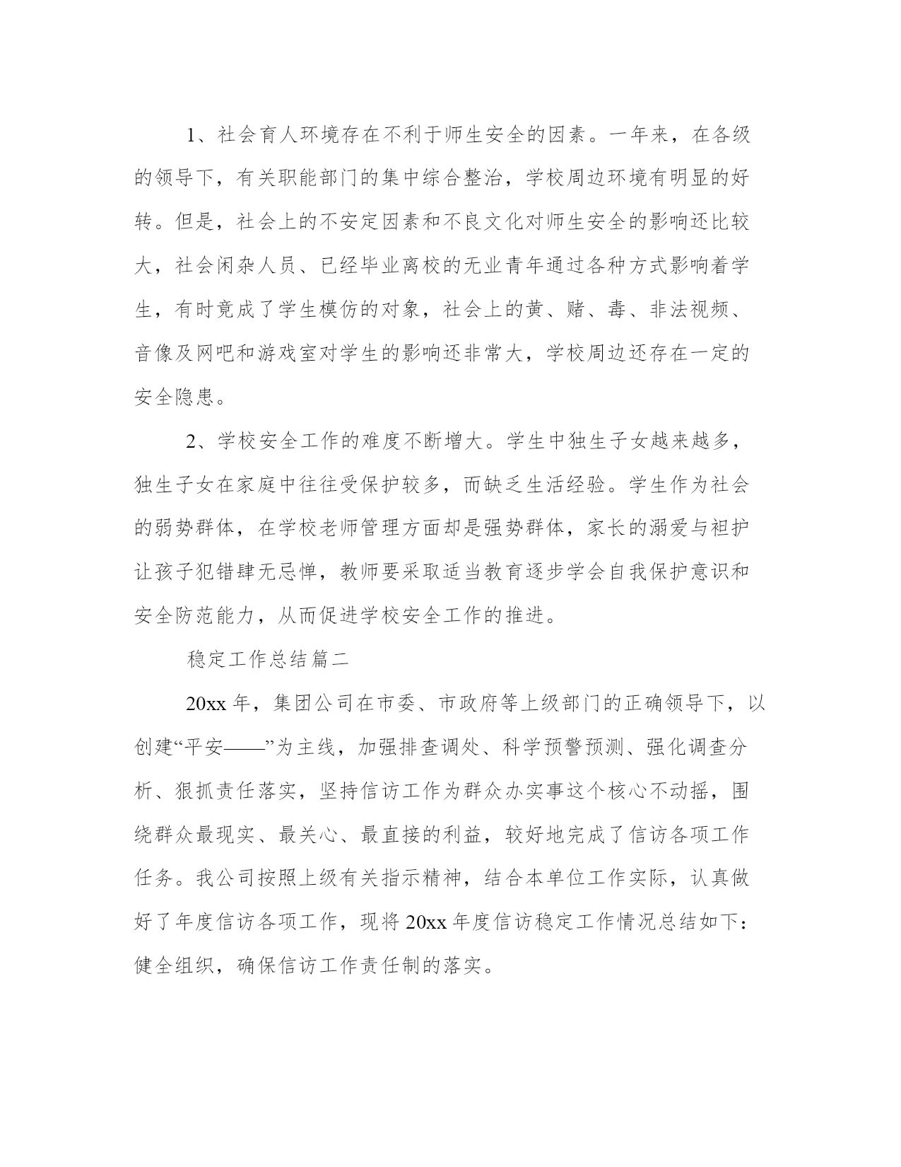 2023年稳定工作总结安全稳定工作总结(通用8篇)总结的选材不能求全贪多、主次不分,要根据实际情况和总结的目的,把那些既能显示本单位、本地区特点,又有一定普遍性的材料作为重点选用,写得详细、具体。写总结的时候需要注意什么呢?有哪些格式需要注意呢?以下我给大家整理了一些优质的总结范文,希望对大家能够有所帮助。稳定工作总结篇一20xx年,我校在市教育在教育办的领导下,认真学习贯彻新安全生产法,落实“一岗双责”,健全管理机构,详实记录安全档案,制定可行的各种预案,坚持预防为主、防治结合、加强教育、群防群治的原则,通过安全教育,增强学生的安全意识和自我防护能力;通过齐抓共管,营造全校教职员工关心和支持学校安全工作的局面,从而切实保障师生安全和财产不受损失,维护学校正常的教育教学秩序。一、领导重视,措施有力。为进一步做好安全教育工作,切实加强对安全教育工作的领导,学校把安全工作列入重要议事日程,坚决贯彻落实上级安全会议精神,学校校长申江伟直接抓,分管副校长陈素刚具体抓,学校各班班主任、各专室负责人具体分工负责组织实施。二、制度保证,措施到位。1、建立健全各项应急预案,实行安全工作领导相关责任人责任制和责任追究制。由学校校长负责,将安全工作列入学校年终的目标考核内容,并进行严格考核,严格执行责任追究制度,对造成重大安全事故的,要严肃追究有关领导及直接责任人的责任。2、签订责任书。学校与每一位教职工和班主任与本班学生签订责任书,明确各自的职责。学校还与学生家长签订了上下学安全责任书、乘车协议,明确了家长应做的工作和应负的责任。将安全教育工作作为对教职员工考核的重要内容,实行一票否决制度。贯彻“谁主管,谁负责。谁出事,追究谁”的原则,做到职责明确,责任到人。3、不断完善学校安全工作规章制度。建立学校安全保卫工作的各项规章制度,并根据安全工作形势的发展,不断完善充实。建立健全定期检查和日常防范相结合的安全管理制度,以及学生管理、门卫值班、巡逻值班、防火防灾、食品卫生管理、防火安全管理、体育器材检查、交通安全教育等规章制度。严禁私自组织学生集体服用药品和保健品,严禁学生参加商业性庆典活动,严禁组织学生从事不符合国家有关规定的危险性工作,严禁教师个人利用假期(日)私自带学生外出,在校外开展的社会实践活动报批上级同意,校长带领要坚持就近、徒步原则。对涉及学校安全保卫的各项工作,都要做到有章可循,违章必究,不留盲点,不出漏洞。4、建立学校安全意外事故处置预案制度。学校建立事故处置领导小组,制定了意外事故处置预案制度。三、齐抓共管,群防群治。学校安全教育工作是一项社会性的系统工程,需要社会、学校、家庭的密切配合。我们积极与阳邑派出所、市检察院、市法院、村治安保卫组等部门通力合作,做好学校安全法治教育工作,学校协同相关部门组织开展三次道德、法制教育活动,取得了良好的教育效果。四、加强教育,促进自护。要确保安全,根本在于提高安全意识、自我防范和自护自救能力,抓好安全教育,是学校安全工作的基础。我们以全校师生安全会为总领,安全课为延伸,日常教育为抓手,经常性地对学生开展安全教育,特别是抓好上下学交通、课余活动等的安全教育。1、认真做好安全课工作。学校安全教育课一周不少于20分钟,教师有备课,学生有作业、有批阅。组织好安全教育周,在安全教育周期间,学校组织学习安全教育工作文件,对校内易发事故类型、重点部位保护、工作薄弱环节、各类人员安全意识与安全技能等方面,开展深入全面的大检查,消除隐患,有针对地扎实地开展教育和防范工作。2、开展丰富多彩的教育活动。利用班会、团队活动、活动课、人防课、学科渗透等途径,通过讲解、演示和训练,对学生开展安全预防教育,使学生接受比较系统的防溺水、防交通事故、防触电、防食物中毒、防流行疾病、防体育运动伤害、防火、防盗、防震、防骗、防煤气中毒等安全知识和技能教育。还利用学校电子屏、黑板报、悬挂横幅、张贴标语等宣传工具及举行主题班会、讲座、安全征文与知识竞赛等形式开展丰富多彩的安全教育。学校积极推行一周安全提醒,学校利用周日例会和周一升旗活动时间,小结上周安全工作,强调安全事项。周一进行危险品清缴,隐患排查上报,安全教育,周二进行集中处理与整改。周三进行卫生彻底打扫,周四安全再教育与矛盾化解,周五学校领导大检查。通过一系列的专项活动,增强师生的安全意识。通过评比提高广大学生的安全意识、安全防范能力和自我保护能力。3、提倡走读学生步行上学,对学生骑车上学情况进行清查,严禁学生骑自行车、电动车、摩托车上学。住宿生课余时间出校门需向班主任请假,放假离校听安排让教师送上车。五、加强检查,及时整改。开展常规检查。每学期开学以后,学校把安全教育工作作为重点检查内容之一。学初,学校对校舍及各种设施进行全面的安全检查