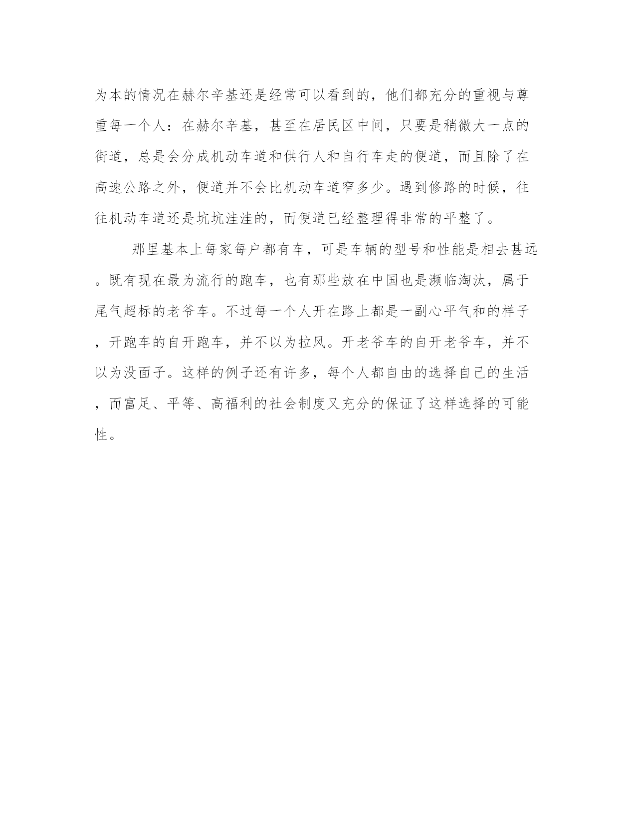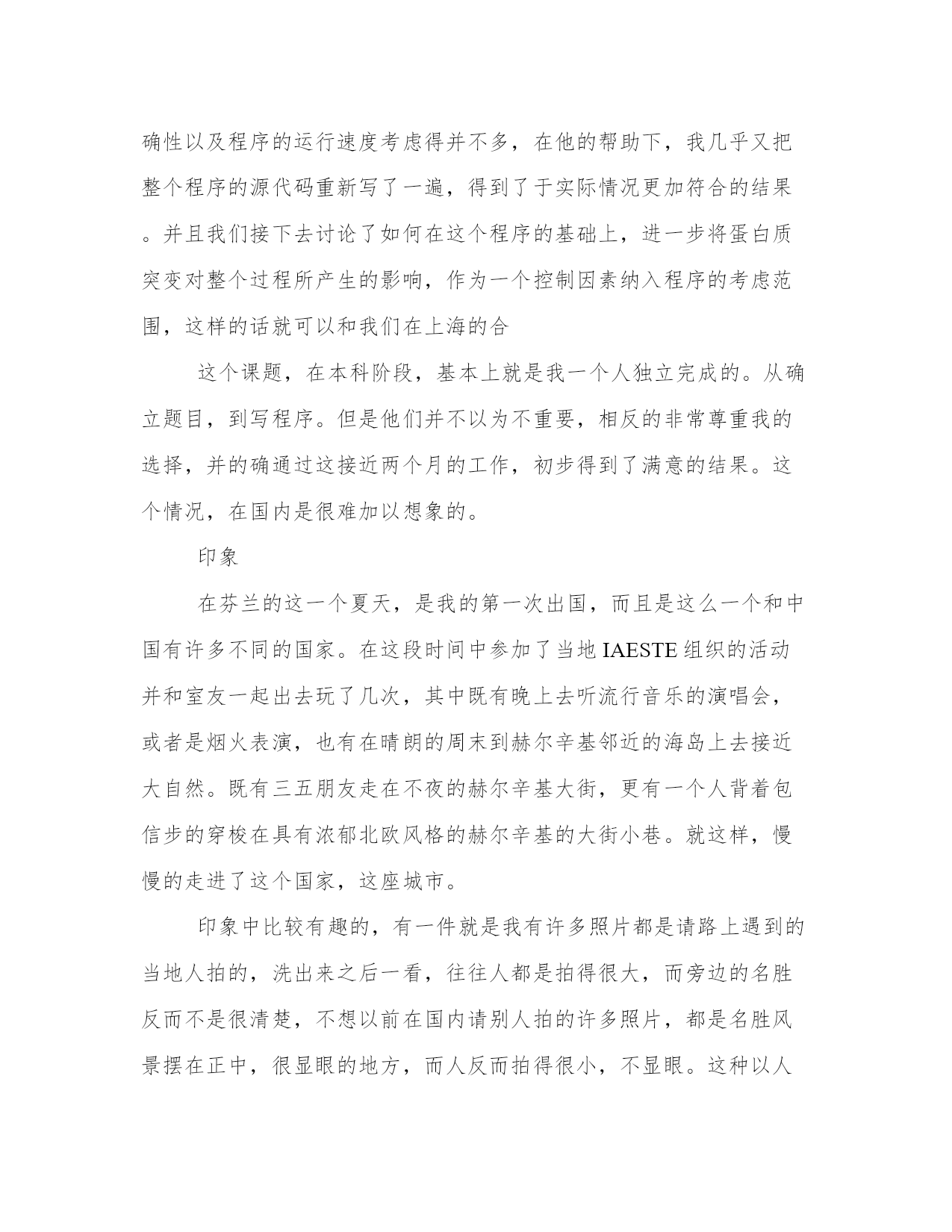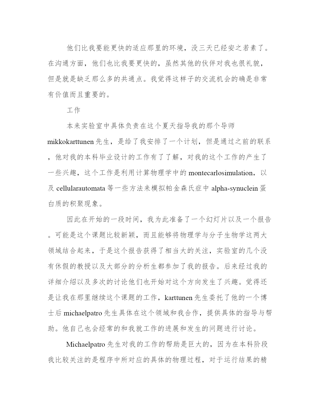 芬兰实习培训报告生活在我刚到芬兰的头几天,对我来说一切都是陌生而新鲜的,所幸得到了实验室秘书eevalampinen女士以及同在实验室的中国留学生赵伟的无微不至的帮助。使我能在最短的时间内,适应这个陌生的环境,并尽早的投入工作。很幸运,在芬兰的日子中,都遇到了一些中国人,虽然大家都很忙,平时也就是在路上匆匆点头致意。但是当你遇到需要帮助的时候,他们都能给予力所能及的帮助。这里的中国人有一个邮件列表,有千余名的中国人与当地人把自己的邮箱加到上面去,大家可以在这里交流一些供求信息、发布看法与提供帮助,功能类似于这里的bbs。另外我在生活中还结识了一些朋友,因为他们的年龄都比我大得多,而且在国外学习了许多年,因此他们对于很多事情的看法都和我所了解的不一样。这样的交流是一件很奇妙的事情。在我的夏天过去接近一半的时候,来了两个人和我合住公寓,一个意大利人,一个德国人。于是原本平静而有些单调的生活变得丰富多彩起来,每晚都和他们喝啤酒聊天聊上许久,聊欧洲与中国的不同、自己的分析方向、个人的生活,文化的差异在这里成了一件兴趣盎然的事情。而喝啤酒是一件如此平常的事情,以至于为数不多的几个我所知道的德语与意大利语都是和敬酒或者酒的用具有关。他们比我要能更快的适应那里的环境,没三天已经安之若素了。在沟通方面,他们也比我要更快的,虽然其他的伙伴对我也很礼貌,但是就是缺乏那么多的共通点。我觉得这样子的交流机会的确是非常有价值而且重要的。工作本来实验室中具体负责在这个夏天指导我的那个导师mikkokarttunen先生,是给了我安排了一个计划,但是通过之前的联系,他对我的本科毕业设计的工作有了了解,对我的这个工作的产生了一些兴趣,这个工作是利用计算物理学中的montecarlosimulation,以及cellularautomata等一些方法来模拟帕金森氏症中alpha-synuclein蛋白质的积聚现象。因此在开始的一段时间,我为此准备了一个幻灯片以及一个报告。可能是这个课题比较新颖,而且能够将物理学与分子生物学这两大领域结合起来,于是这个报告获得了相当大的关注,实验室的几个没有休假的教授以及大部分的分析生都参加了我的报告。后来经过我的详细介绍以及多次的讨论他们也开始对这个方向发生了兴趣。觉得还是让我在那里继续这个课题的工作,karttunen先生委托了他的一个博士后michaelpatro先生具体在这个领域和我合作,提供具体的指导与帮助。他自己也会经常的和我就工作的进展和发生的问题进行讨论。Michaelpatro先生对我的工作的帮助是巨大的,因为在本科阶段我比较关注的是程序中所对应的具体的物理过程,对于运行结果的精确性以及程序的运行速度考虑得并不多,在他的帮助下,我几乎又把整个程序的源代码重新写了一遍,得到了于实际情况更加符合的结果。并且我们接下去讨论了如何在这个程序的基础上,进一步将蛋白质突变对整个过程所产生的影响,作为一个控制因素纳入程序的考虑范围,这样的话就可以和我们在上海的合这个课题,在本科阶段,基本上就是我一个人独立完成的。从确立题目,到写程序。但是他们并不以为不重要,相反的非常尊重我的选择,并的确通过这接近两个月的工作,初步得到了满意的结果。这个情况,在国内是很难加以想象的。印象在芬兰的这一个夏天,是我的第一次出国,而且是这么一个和中国有许多不同的国家。在这段时间中参加了当地IAESTE组织的活动并和室友一起出去玩了几次,其中既有晚上去听流行音乐的演唱会,或者是烟火表演,也有在晴朗的周末到赫尔辛基邻近的海岛上去接近大自然。既有三五朋友走在不夜的赫尔辛基大街,更有一个人背着包信步的穿梭在具有浓郁北欧风格的赫尔辛基的大街小巷。就这样,慢慢的走进了这个国家,这座城市。印象中比较有趣的,有一件就是我有许多照片都是请路上遇到的当地人拍的,洗出来之后一看,往往人都是拍得很大,而旁边的名胜反而不是很清楚,不想以前在国内请别人拍的许多照片,都是名胜风景摆在正中,很显眼的地方,而人反而拍得很小,不显眼。这种以人为本的情况在赫尔辛基还是经常可以看到的,他们都充分的重视与尊重每一个人:在赫尔辛基,甚至在居民区中间,只要是稍微大一点的街道,总是会分成机动车道和供行人和自行车走的便道,而且除了在高速公路之外,便道并不会比机动车道窄多少。遇到修路的时候,往往机动车道还是坑坑洼洼的,而便道已经整理得非常的平整了。那里基本上每家每户都有车,可是车辆的型号和性能是相去甚远。既有现在最为流行的跑车,也有那些放在中国也是濒临淘汰,属于尾气超标的老爷车。不过每一个人开在路上都是一副心平气和的样子,开跑车的自开跑车,并不以为拉风。开老爷车的自开老爷车,并不以为没面子。这样的例子还有许多,每个人都自由的选择自己的生活,而富足、平等、高福利的社会制度