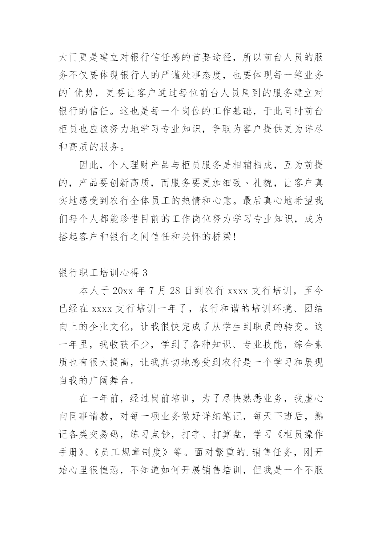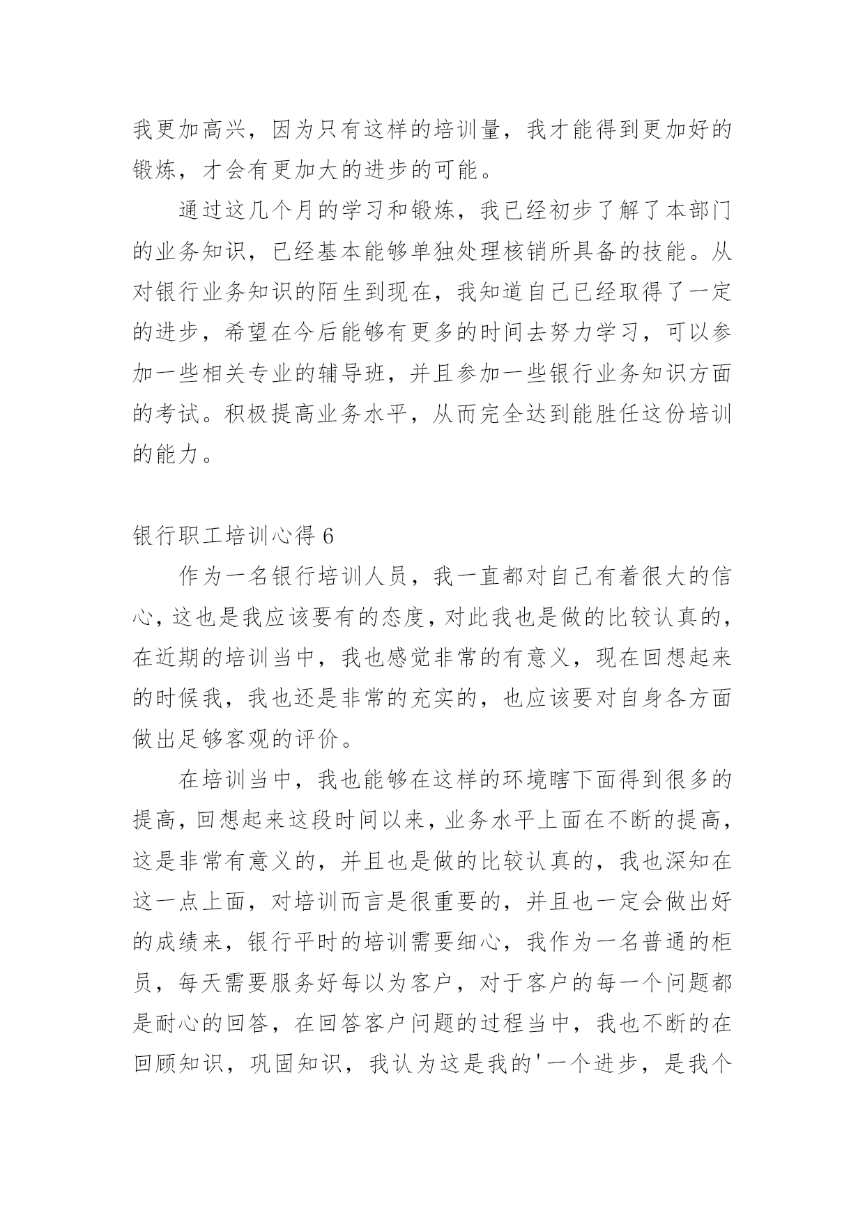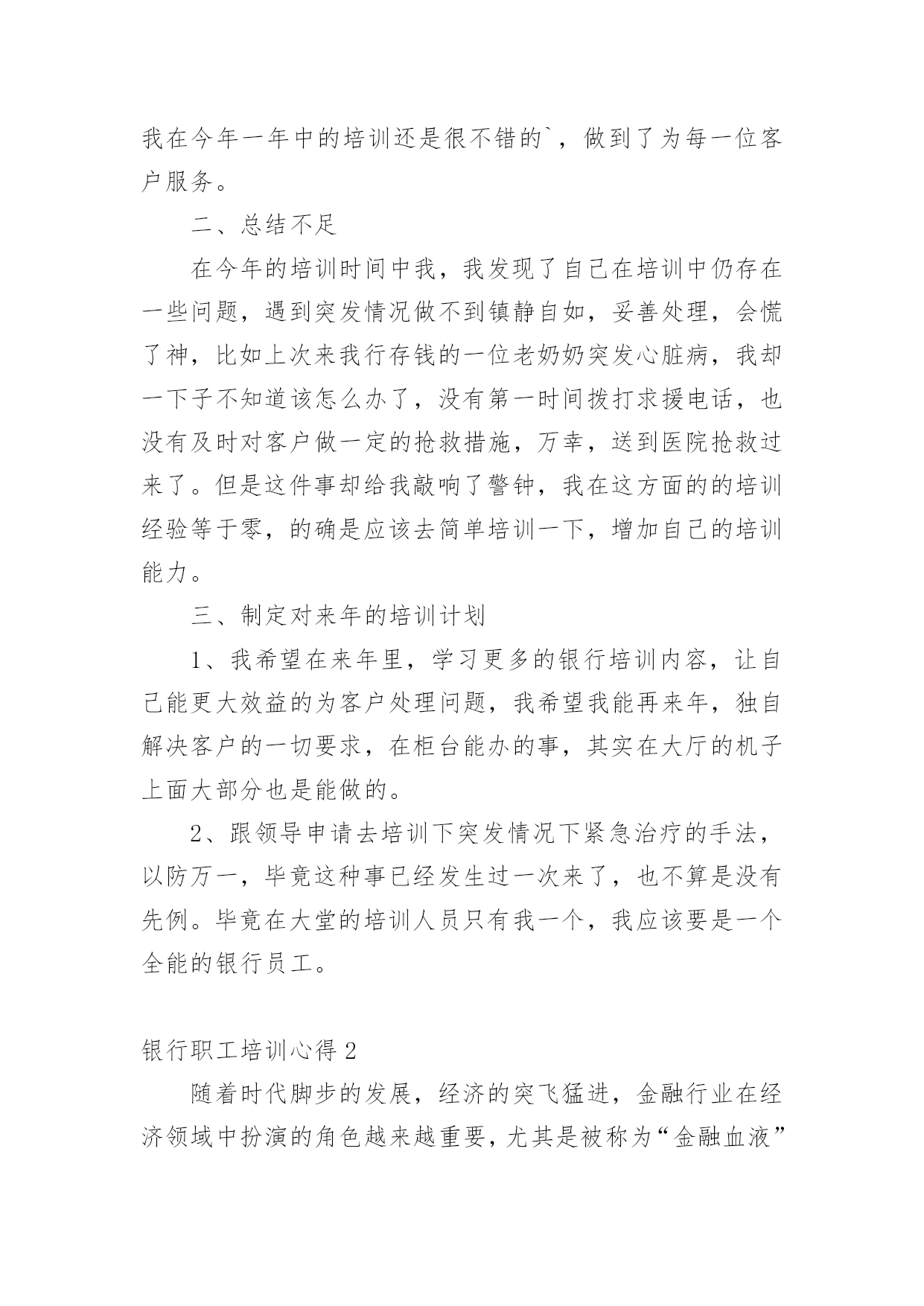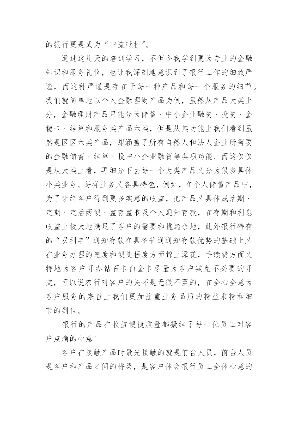 银行职工培训心得我们有一些启发后,可以通过写心得体会的方式将其记录下来,如此可以一直更新迭代自己的想法。怎样写好心得体会呢?下面是小编为大家收集的银行职工培训心得,仅供参考,大家一起来看看吧。银行职工培训心得1一、自我审视我在xxxx银行担任大堂经理的职位,主要是协助来银行的客户办理各种业务,随时接受客户的问题咨询并引导他们去到相应的窗口或者自己柜台机办理业务,这个职位表面看似轻松,但实际上也是要精神时刻处于高度紧张的状态,在一家银行,除了保安人员,就是我这个大堂经理在银行的大堂里站着,真正意义上说只有我这个银行内部人员在大厅培训,我就是每个选择来我们银行办理业务的客户第一个见到的银行培训人员,我给客户的第一印象就是,银行给客户的第一印象,我代表着银行的脸面,我的形象直接影响客户对银行的看法,所以我处于银行极其重要的一个点。我每天秉承着一丝不苟的对培训的态度,每天上班前至少检查三次自己的着装以及姿容仪态。恰当好处的谈吐举止是我必备的技能,时刻懂得看客户的脸色,什么话该说什么话不该说,是应该多说话还是少说话,我能在客户进入银行的那一刻就做好判断。这也是我多年培训总结出来的经验。我在今年一年中的培训还是很不错的`,做到了为每一位客户服务。二、总结不足在今年的培训时间中我,我发现了自己在培训中仍存在一些问题,遇到突发情况做不到镇静自如,妥善处理,会慌了神,比如上次来我行存钱的一位老奶奶突发心脏病,我却一下子不知道该怎么办了,没有第一时间拨打求援电话,也没有及时对客户做一定的抢救措施,万幸,送到医院抢救过来了。但是这件事却给我敲响了警钟,我在这方面的的培训经验等于零,的确是应该去简单培训一下,增加自己的培训能力。三、制定对来年的培训计划1、我希望在来年里,学习更多的银行培训内容,让自己能更大效益的为客户处理问题,我希望我能再来年,独自解决客户的一切要求,在柜台能办的事,其实在大厅的机子上面大部分也是能做的。2、跟领导申请去培训下突发情况下紧急治疗的手法,以防万一,毕竟这种事已经发生过一次来了,也不算是没有先例。毕竟在大堂的培训人员只有我一个,我应该要是一个全能的银行员工。银行职工培训心得2随着时代脚步的发展,经济的突飞猛进,金融行业在经济领域中扮演的角色越来越重要,尤其是被称为“金融血液”的银行更是成为“中流砥柱”。通过这几天的培训学习,不但令我学到更为专业的金融知识和服务礼仪,也让我深刻地意识到了银行工作的细致严谨,而这种严谨是存在于每一种产品和每一个服务的细节。我们就简单地以个人金融理财产品为例,虽然从产品大类上分,金融理财产品只能分为储蓄﹑中小企业融资﹑投资﹑金穗卡﹑结算和服务类产品六类,但是从其功能上我们看到虽然是区区六类产品,却涵盖了所有自然人和法人企业所需要的金融储蓄﹑结算﹑投中小企业融资等各项功能。而这仅仅是从大类上看,再细分下去每一个大类产品又分为很多具体小类业务。每样业务又各具特色,例如,在个人储蓄产品中,为了让给客户得到更多实惠的收益,把产品又具体成活期﹑定期﹑定活两便﹑整存整取及个人通知存款,在存期和利息收益上极大地满足了客户的需要和挑选余地,此外银行特有的“双利丰”通知存款在具备普通通知存款优势的基础上又在业务办理的速度和便捷程度方面锦上添花,手续费方面又特地为客户开办钻石卡白金卡尽量为客户减免不必要的开支,可以说农行对客户的关怀是无微不至的,在全心全意为客户服务的宗旨上我们更加注重业务品质的精益求精和细节的到位。银行的产品在收益便捷质量都凝结了每一位员工对客户点滴的心意!客户在接触产品时最先接触的就是前台人员,前台人员是客户和产品之间的桥梁,是客户体会银行员工全体心意的大门更是建立对银行信任感的首要途径,所以前台人员的服务不仅要体现银行人的严谨处事态度,也要体现每一笔业务的`优势,更要让客户通过每位前台人员周到的服务建立对银行的信任。这也是每一个岗位的工作基础,于此同时前台柜员也应该努力地学习专业知识,争取为客户提供更为详尽和高质的服务。因此,个人理财产品与柜员服务是相辅相成,互为前提的,产品要创新高质,而服务要更加细致﹑礼貌,让客户真实地感受到农行全体员工的热情和心意。最后真心地希望我们每个人都能珍惜目前的工作岗位努力学习专业知识,成为搭起客户和银行之间信任和关怀的桥梁!银行职工培训心得3本人于20xx年7月28日到农行xxxx支行培训,至今已经在xxxx支行培训一年了,农行和谐的培训环境、团结向上的企业文化,让我很快完成了从学生到职员的转变。这一年里,我收获不少,学到了各种知识、专业技能,综合素质也有很大提高,让我真切地感受到农行是一个学习和展现自我的广阔舞台。在一年前,经过岗前培训,为了尽快熟悉业务,我虚心向同事请教,对每一项业务做好详细笔记,每天下班后,熟记各类交易码,练习点钞,打字、打算盘,学习