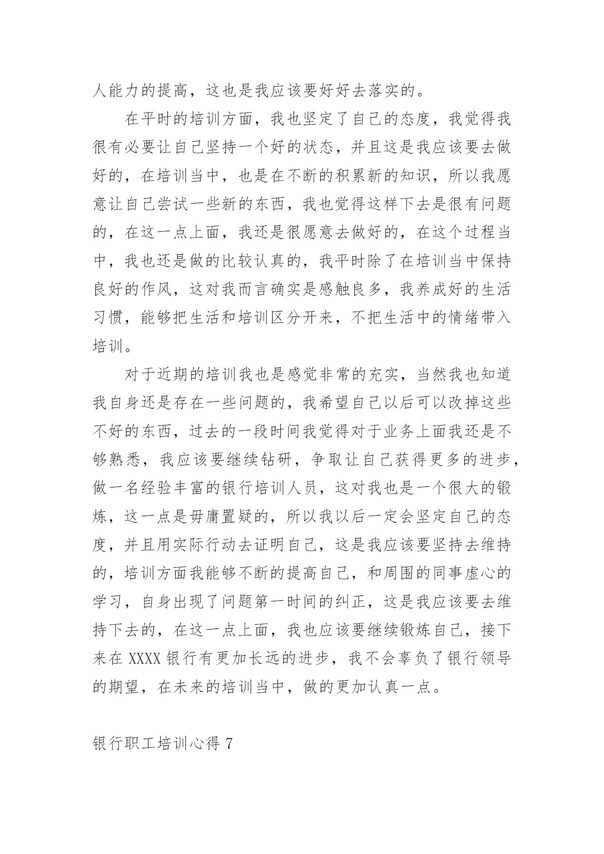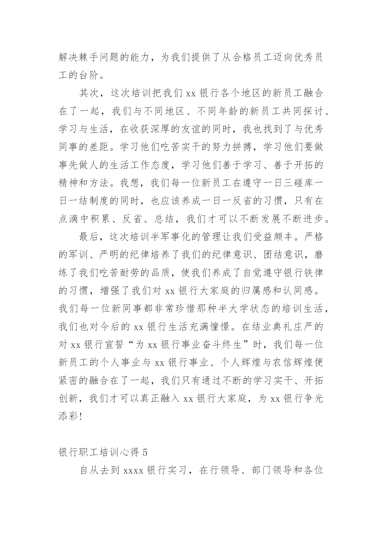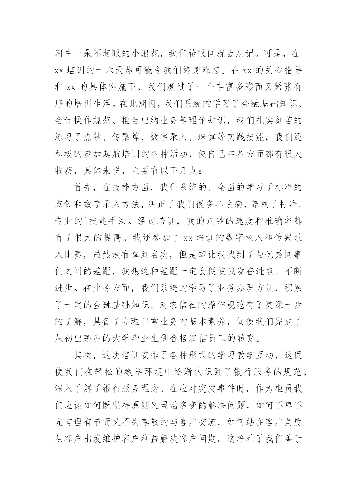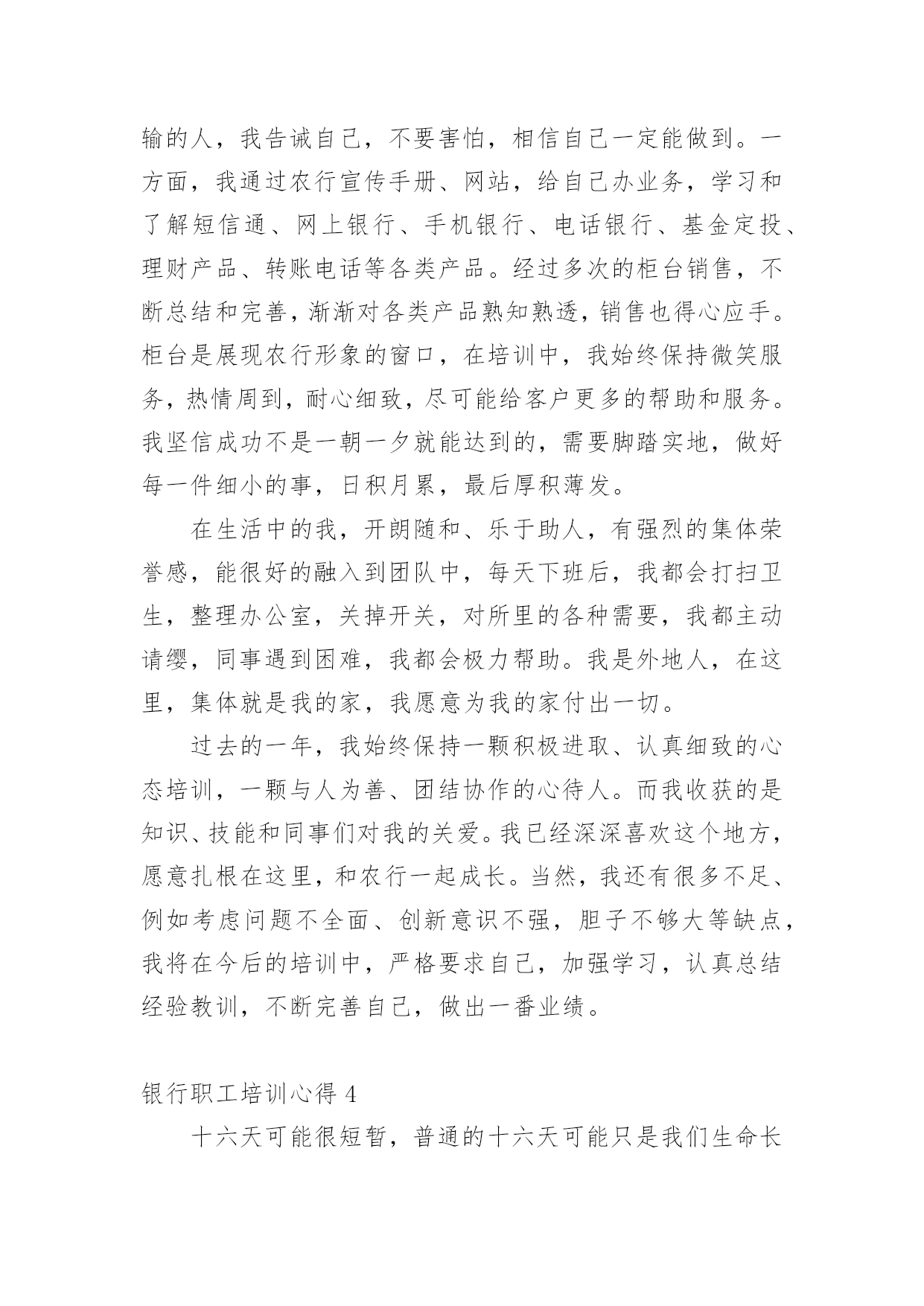 银行职工培训心得我们有一些启发后,可以通过写心得体会的方式将其记录下来,如此可以一直更新迭代自己的想法。怎样写好心得体会呢?下面是小编为大家收集的银行职工培训心得,仅供参考,大家一起来看看吧。银行职工培训心得1一、自我审视我在xxxx银行担任大堂经理的职位,主要是协助来银行的客户办理各种业务,随时接受客户的问题咨询并引导他们去到相应的窗口或者自己柜台机办理业务,这个职位表面看似轻松,但实际上也是要精神时刻处于高度紧张的状态,在一家银行,除了保安人员,就是我这个大堂经理在银行的大堂里站着,真正意义上说只有我这个银行内部人员在大厅培训,我就是每个选择来我们银行办理业务的客户第一个见到的银行培训人员,我给客户的第一印象就是,银行给客户的第一印象,我代表着银行的脸面,我的形象直接影响客户对银行的看法,所以我处于银行极其重要的一个点。我每天秉承着一丝不苟的对培训的态度,每天上班前至少检查三次自己的着装以及姿容仪态。恰当好处的谈吐举止是我必备的技能,时刻懂得看客户的脸色,什么话该说什么话不该说,是应该多说话还是少说话,我能在客户进入银行的那一刻就做好判断。这也是我多年培训总结出来的经验。我在今年一年中的培训还是很不错的`,做到了为每一位客户服务。二、总结不足在今年的培训时间中我,我发现了自己在培训中仍存在一些问题,遇到突发情况做不到镇静自如,妥善处理,会慌了神,比如上次来我行存钱的一位老奶奶突发心脏病,我却一下子不知道该怎么办了,没有第一时间拨打求援电话,也没有及时对客户做一定的抢救措施,万幸,送到医院抢救过来了。但是这件事却给我敲响了警钟,我在这方面的的培训经验等于零,的确是应该去简单培训一下,增加自己的培训能力。三、制定对来年的培训计划1、我希望在来年里,学习更多的银行培训内容,让自己能更大效益的为客户处理问题,我希望我能再来年,独自解决客户的一切要求,在柜台能办的事,其实在大厅的机子上面大部分也是能做的。2、跟领导申请去培训下突发情况下紧急治疗的手法,以防万一,毕竟这种事已经发生过一次来了,也不算是没有先例。毕竟在大堂的培训人员只有我一个,我应该要是一个全能的银行员工。银行职工培训心得2随着时代脚步的发展,经济的突飞猛进,金融行业在经济领域中扮演的角色越来越重要,尤其是被称为“金融血液”的银行更是成为“中流砥柱”。通过这几天的培训学习,不但令我学到更为专业的金融知识和服务礼仪,也让我深刻地意识到了银行工作的细致严谨,而这种严谨是存在于每一种产品和每一个服务的细节。我们就简单地以个人金融理财产品为例,虽然从产品大类上分,金融理财产品只能分为储蓄﹑中小企业融资﹑投资﹑金穗卡﹑结算和服务类产品六类,但是从其功能上我们看到虽然是区区六类产品,却涵盖了所有自然人和法人企业所需要的金融储蓄﹑结算﹑投中小企业融资等各项功能。而这仅仅是从大类上看,再细分下去每一个大类产品又分为很多具体小类业务。每样业务又各具特色,例如,在个人储蓄产品中,为了让给客户得到更多实惠的收益,把产品又具体成活期﹑定期﹑定活两便﹑整存整取及个人通知存款,在存期和利息收益上极大地满足了客户的需要和挑选余地,此外银行特有的“双利丰”通知存款在具备普通通知存款优势的基础上又在业务办理的速度和便捷程度方面锦上添花,手续费方面又特地为客户开办钻石卡白金卡尽量为客户减免不必要的开支,可以说农行对客户的关怀是无微不至的,在全心全意为客户服务的宗旨上我们更加注重业务品质的精益求精和细节的到位。银行的产品在收益便捷质量都凝结了每一位员工对客户点滴的心意!客户在接触产品时最先接触的就是前台人员,前台人员是客户和产品之间的桥梁,是客户体会银行员工全体心意的大门更是建立对银行信任感的首要途径,所以前台人员的服务不仅要体现银行人的严谨处事态度,也要体现每一笔业务的`优势,更要让客户通过每位前台人员周到的服务建立对银行的信任。这也是每一个岗位的工作基础,于此同时前台柜员也应该努力地学习专业知识,争取为客户提供更为详尽和高质的服务。因此,个人理财产品与柜员服务是相辅相成,互为前提的,产品要创新高质,而服务要更加细致﹑礼貌,让客户真实地感受到农行全体员工的热情和心意。最后真心地希望我们每个人都能珍惜目前的工作岗位努力学习专业知识,成为搭起客户和银行之间信任和关怀的桥梁!银行职工培训心得3本人于20xx年7月28日到农行xxxx支行培训,至今已经在xxxx支行培训一年了,农行和谐的培训环境、团结向上的企业文化,让我很快完成了从学生到职员的转变。这一年里,我收获不少,学到了各种知识、专业技能,综合素质也有很大提高,让我真切地感受到农行是一个学习和展现自我的广阔舞台。在一年前,经过岗前培训,为了尽快熟悉业务,我虚心向同事请教,对每一项业务做好详细笔记,每天下班后,熟记各类交易码,练习点钞,打字、打算盘,学习