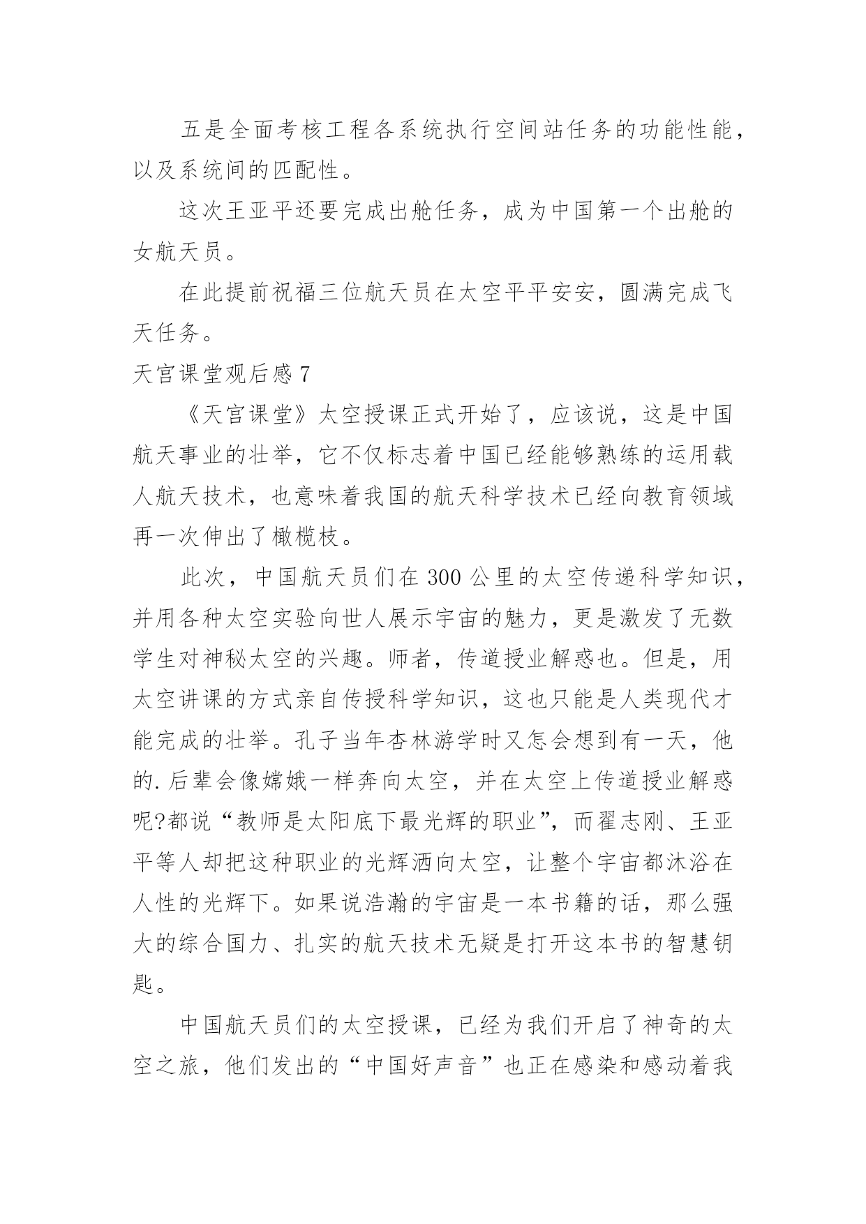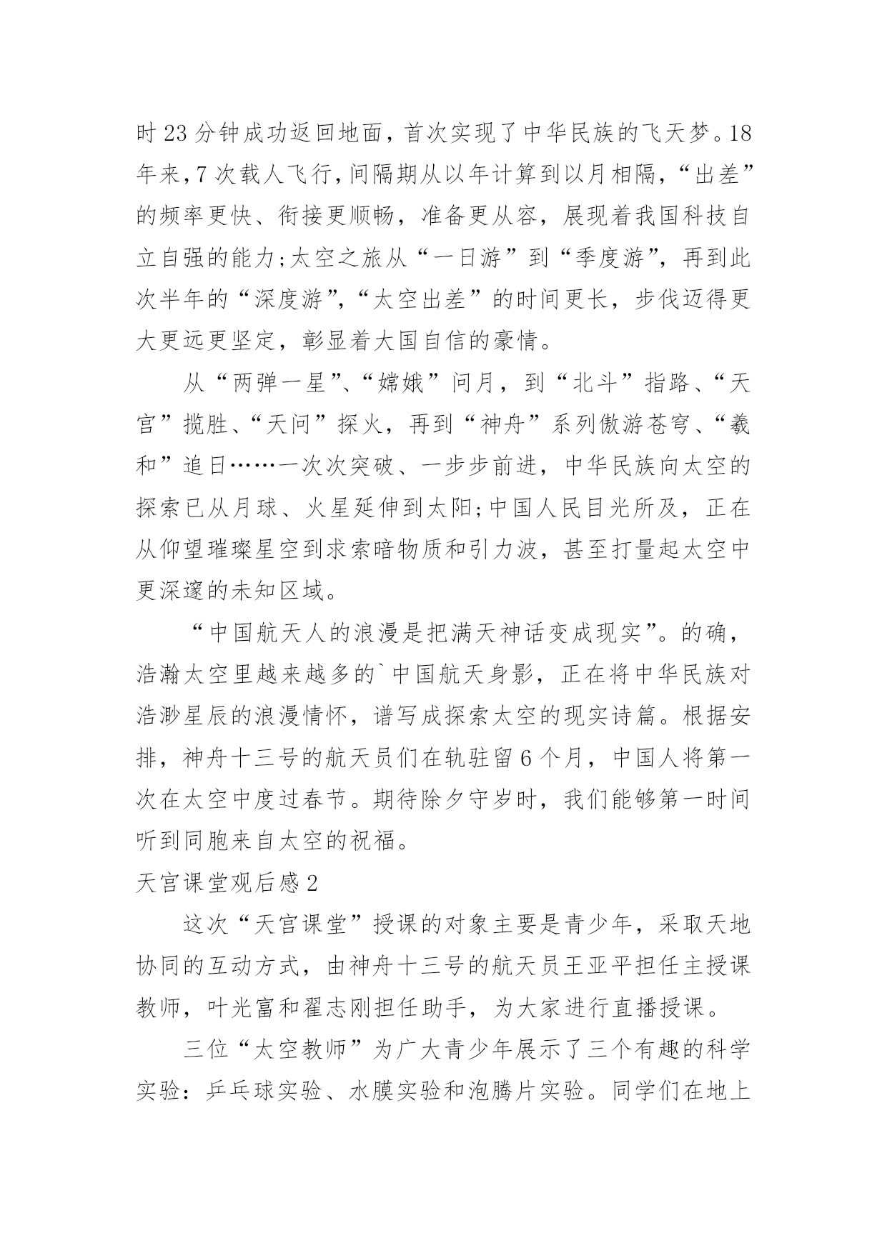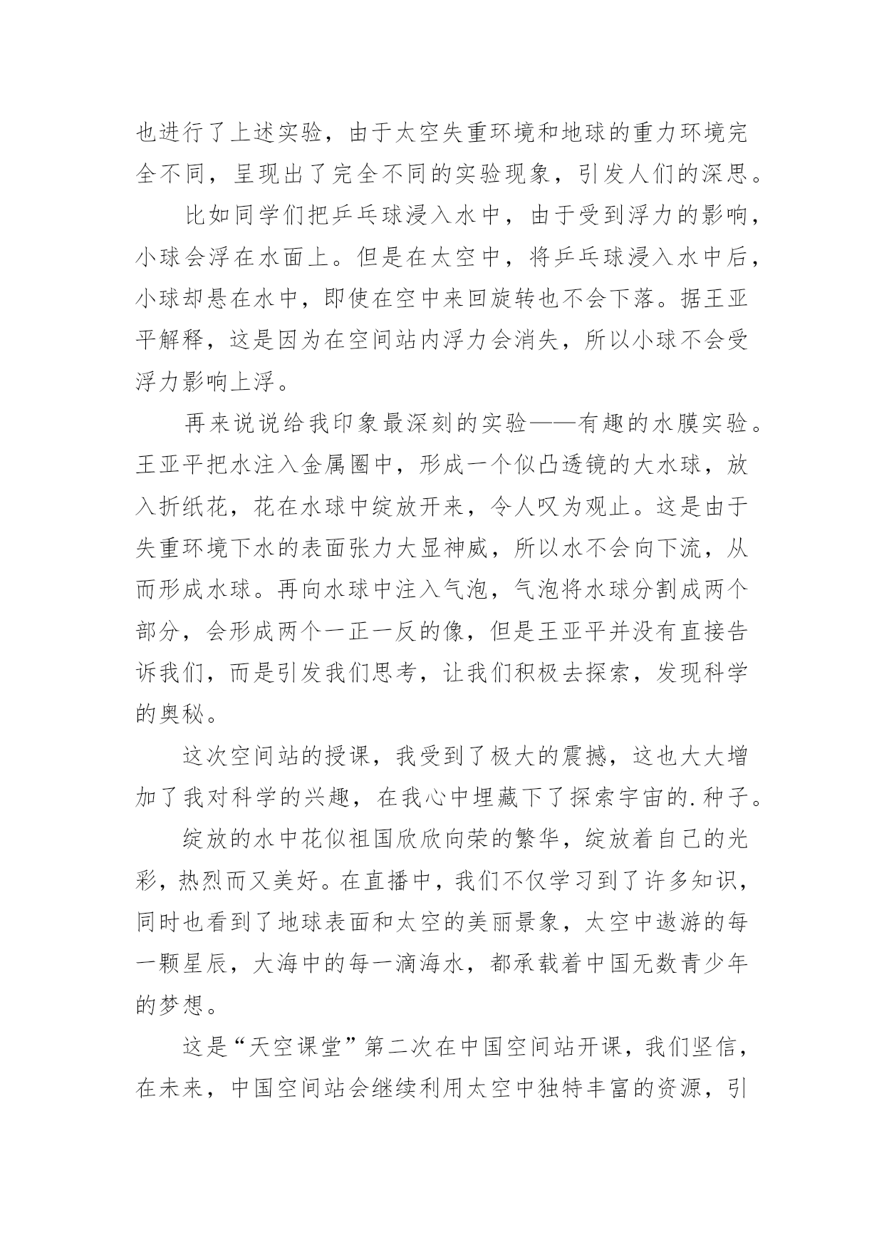天宫课堂观后感天宫课堂观后感看完一部作品以后,想必你有不少可以分享的东西,为此需要好好认真地写观后感。为了让您不再为写观后感头疼,下面是小编整理的天宫课堂观后感,仅供参考,大家一起来看看吧。天宫课堂观后感1“飞天梦永不失重,科学梦张力无限。”8年前,“太空教师”王亚平为全国6000多万名学生太空授课时的寄语尚萦绕在耳畔,如今她又一次踏上了太空之旅,将成为中国首位进驻空间站的女航天员,以及中国首位出舱女航天员。寻声凝望,原本神秘遥远的深邃太空离我们越来越近,一个个美丽的“飞天梦”正成为现实。16日凌晨,神舟十三号成功发射,此时距神舟十二号载人飞船成功返回不到一月时间。由翟志刚、王亚平、叶光富组成的新“太空出差三人组”搭乘载人飞船奔赴中国空间站。此次任务将实现与核心舱径向交会对接、由救援船转入正式任务船等多个“首次”,还将在神舟十二号任务的基础上开展更多的空间科学实验与技术试验。“坐地日行八万里,巡天遥看一千河。”20xx年,神舟五号飞船搭载杨利伟在酒泉卫星发射中心发射,历时21小时23分钟成功返回地面,首次实现了中华民族的飞天梦。18年来,7次载人飞行,间隔期从以年计算到以月相隔,“出差”的频率更快、衔接更顺畅,准备更从容,展现着我国科技自立自强的能力;太空之旅从“一日游”到“季度游”,再到此次半年的“深度游”,“太空出差”的时间更长,步伐迈得更大更远更坚定,彰显着大国自信的豪情。从“两弹一星”、“嫦娥”问月,到“北斗”指路、“天宫”揽胜、“天问”探火,再到“神舟”系列傲游苍穹、“羲和”追日……一次次突破、一步步前进,中华民族向太空的探索已从月球、火星延伸到太阳;中国人民目光所及,正在从仰望璀璨星空到求索暗物质和引力波,甚至打量起太空中更深邃的未知区域。“中国航天人的浪漫是把满天神话变成现实”。的确,浩瀚太空里越来越多的`中国航天身影,正在将中华民族对浩渺星辰的浪漫情怀,谱写成探索太空的现实诗篇。根据安排,神舟十三号的航天员们在轨驻留6个月,中国人将第一次在太空中度过春节。期待除夕守岁时,我们能够第一时间听到同胞来自太空的祝福。天宫课堂观后感2这次“天宫课堂”授课的对象主要是青少年,采取天地协同的互动方式,由神舟十三号的航天员王亚平担任主授课教师,叶光富和翟志刚担任助手,为大家进行直播授课。三位“太空教师”为广大青少年展示了三个有趣的科学实验:乒乓球实验、水膜实验和泡腾片实验。同学们在地上也进行了上述实验,由于太空失重环境和地球的重力环境完全不同,呈现出了完全不同的实验现象,引发人们的深思。比如同学们把乒乓球浸入水中,由于受到浮力的影响,小球会浮在水面上。但是在太空中,将乒乓球浸入水中后,小球却悬在水中,即使在空中来回旋转也不会下落。据王亚平解释,这是因为在空间站内浮力会消失,所以小球不会受浮力影响上浮。再来说说给我印象最深刻的实验——有趣的水膜实验。王亚平把水注入金属圈中,形成一个似凸透镜的大水球,放入折纸花,花在水球中绽放开来,令人叹为观止。这是由于失重环境下水的表面张力大显神威,所以水不会向下流,从而形成水球。再向水球中注入气泡,气泡将水球分割成两个部分,会形成两个一正一反的像,但是王亚平并没有直接告诉我们,而是引发我们思考,让我们积极去探索,发现科学的奥秘。这次空间站的授课,我受到了极大的震撼,这也大大增加了我对科学的兴趣,在我心中埋藏下了探索宇宙的.种子。绽放的水中花似祖国欣欣向荣的繁华,绽放着自己的光彩,热烈而又美好。在直播中,我们不仅学习到了许多知识,同时也看到了地球表面和太空的美丽景象,太空中遨游的每一颗星辰,大海中的每一滴海水,都承载着中国无数青少年的梦想。这是“天空课堂”第二次在中国空间站开课,我们坚信,在未来,中国空间站会继续利用太空中独特丰富的资源,引导和鼓励青少们积极探索,弘扬伟大的科学精神,让我们怀着一颗热爱科学和探索未来的心继续期待接下来的课程吧!天宫课堂观后感3随着科技的迅速发展,科学史上有着不可度量的成就。在古代,我们的祖先也许从未想过来到天上,来到月球,更没有想到,自己的后代竟有如此厉害的科技。如今,世界上唯一拥有自己空间站的中国,迎来了一次生动有趣的“天宫课堂”。一直对太空感兴趣的我,这次课堂,怎么会少的了我?步入太空,许多不同的实验让我目瞪口呆!太空细胞学实验,在与地球条件相差极远的时候,依然可以养活种种生命。太空转身,当你扭动身体时会扭在一起。像这样有趣的事要有很多很多,都是人们一步一步踏出来的,就像鲁迅说的一样:其实地上本没有路,但走的人多了,也便成了路。看着浩瀚无际的宇宙,是什么让我们能学到如此知识呢?是那些勇于为国家做奉献的宇航员。古往今来,中国人的“飞天梦”从未断绝。长征七号运载火箭于20xx年6月25日从中国文昌航天发射场首次成功发射,这也是文昌航天发射场的.首次发射任务。