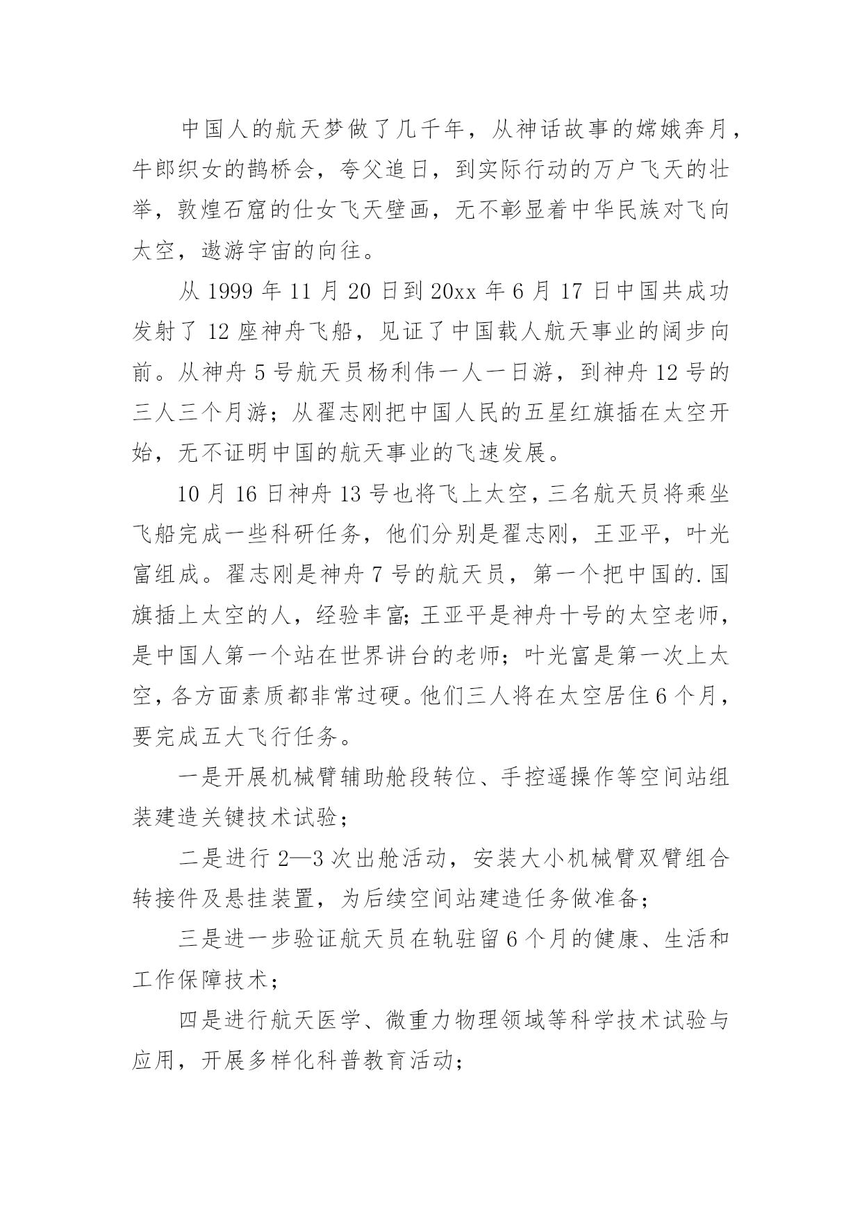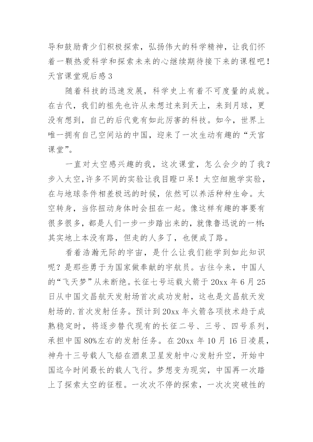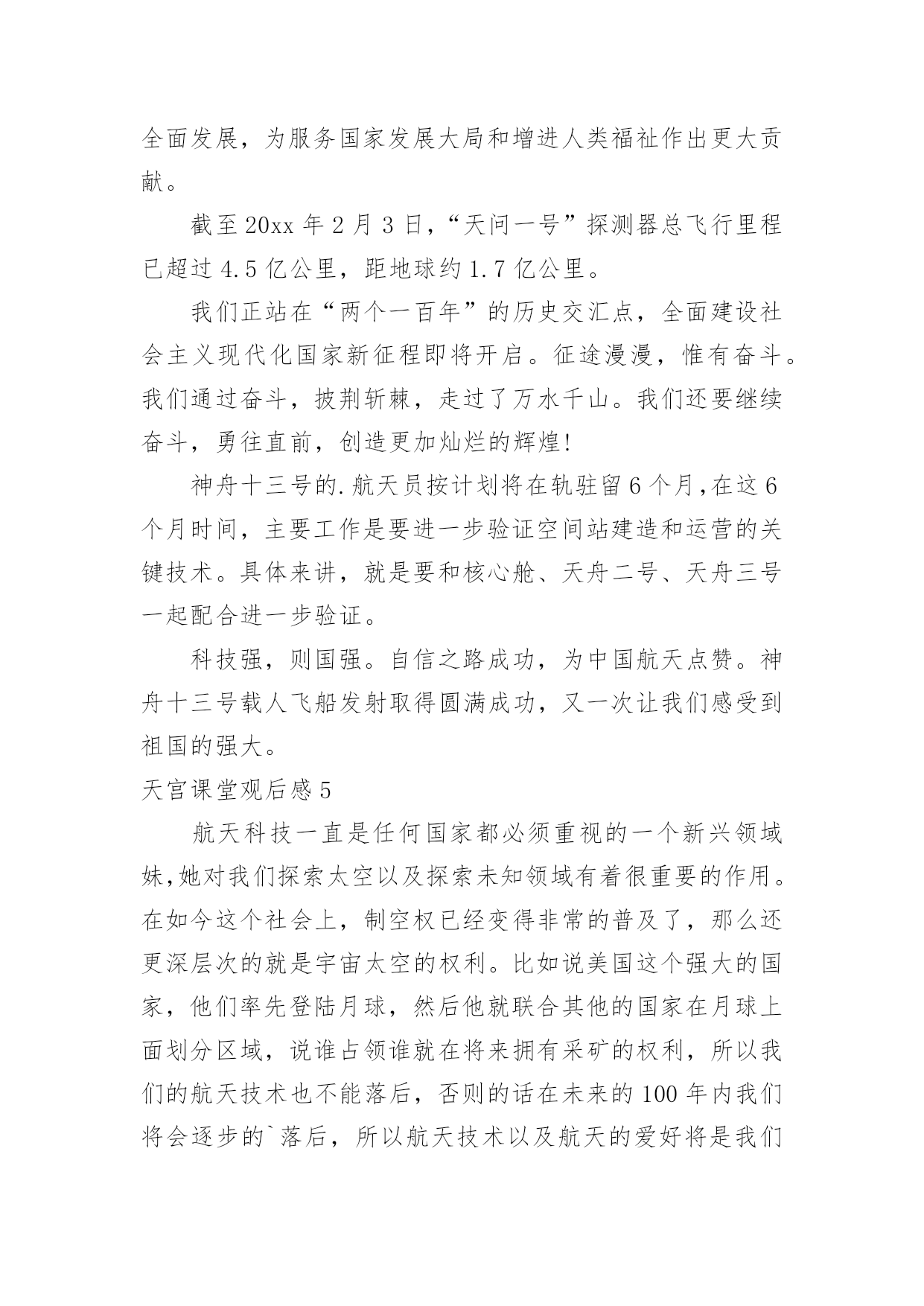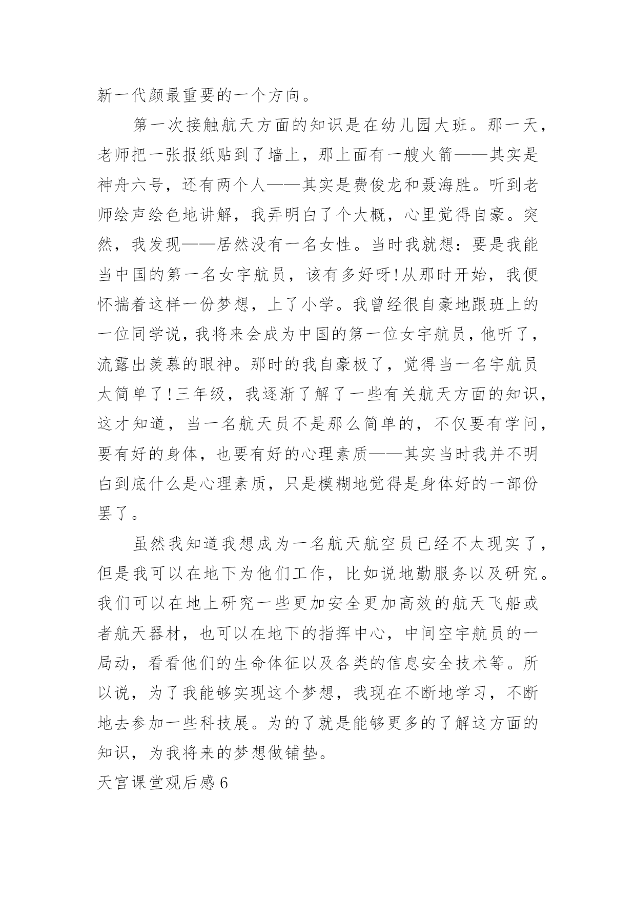 天宫课堂观后感天宫课堂观后感看完一部作品以后,想必你有不少可以分享的东西,为此需要好好认真地写观后感。为了让您不再为写观后感头疼,下面是小编整理的天宫课堂观后感,仅供参考,大家一起来看看吧。天宫课堂观后感1“飞天梦永不失重,科学梦张力无限。”8年前,“太空教师”王亚平为全国6000多万名学生太空授课时的寄语尚萦绕在耳畔,如今她又一次踏上了太空之旅,将成为中国首位进驻空间站的女航天员,以及中国首位出舱女航天员。寻声凝望,原本神秘遥远的深邃太空离我们越来越近,一个个美丽的“飞天梦”正成为现实。16日凌晨,神舟十三号成功发射,此时距神舟十二号载人飞船成功返回不到一月时间。由翟志刚、王亚平、叶光富组成的新“太空出差三人组”搭乘载人飞船奔赴中国空间站。此次任务将实现与核心舱径向交会对接、由救援船转入正式任务船等多个“首次”,还将在神舟十二号任务的基础上开展更多的空间科学实验与技术试验。“坐地日行八万里,巡天遥看一千河。”20xx年,神舟五号飞船搭载杨利伟在酒泉卫星发射中心发射,历时21小时23分钟成功返回地面,首次实现了中华民族的飞天梦。18年来,7次载人飞行,间隔期从以年计算到以月相隔,“出差”的频率更快、衔接更顺畅,准备更从容,展现着我国科技自立自强的能力;太空之旅从“一日游”到“季度游”,再到此次半年的“深度游”,“太空出差”的时间更长,步伐迈得更大更远更坚定,彰显着大国自信的豪情。从“两弹一星”、“嫦娥”问月,到“北斗”指路、“天宫”揽胜、“天问”探火,再到“神舟”系列傲游苍穹、“羲和”追日……一次次突破、一步步前进,中华民族向太空的探索已从月球、火星延伸到太阳;中国人民目光所及,正在从仰望璀璨星空到求索暗物质和引力波,甚至打量起太空中更深邃的未知区域。“中国航天人的浪漫是把满天神话变成现实”。的确,浩瀚太空里越来越多的`中国航天身影,正在将中华民族对浩渺星辰的浪漫情怀,谱写成探索太空的现实诗篇。根据安排,神舟十三号的航天员们在轨驻留6个月,中国人将第一次在太空中度过春节。期待除夕守岁时,我们能够第一时间听到同胞来自太空的祝福。天宫课堂观后感2这次“天宫课堂”授课的对象主要是青少年,采取天地协同的互动方式,由神舟十三号的航天员王亚平担任主授课教师,叶光富和翟志刚担任助手,为大家进行直播授课。三位“太空教师”为广大青少年展示了三个有趣的科学实验:乒乓球实验、水膜实验和泡腾片实验。同学们在地上也进行了上述实验,由于太空失重环境和地球的重力环境完全不同,呈现出了完全不同的实验现象,引发人们的深思。比如同学们把乒乓球浸入水中,由于受到浮力的影响,小球会浮在水面上。但是在太空中,将乒乓球浸入水中后,小球却悬在水中,即使在空中来回旋转也不会下落。据王亚平解释,这是因为在空间站内浮力会消失,所以小球不会受浮力影响上浮。再来说说给我印象最深刻的实验——有趣的水膜实验。王亚平把水注入金属圈中,形成一个似凸透镜的大水球,放入折纸花,花在水球中绽放开来,令人叹为观止。这是由于失重环境下水的表面张力大显神威,所以水不会向下流,从而形成水球。再向水球中注入气泡,气泡将水球分割成两个部分,会形成两个一正一反的像,但是王亚平并没有直接告诉我们,而是引发我们思考,让我们积极去探索,发现科学的奥秘。这次空间站的授课,我受到了极大的震撼,这也大大增加了我对科学的兴趣,在我心中埋藏下了探索宇宙的.种子。绽放的水中花似祖国欣欣向荣的繁华,绽放着自己的光彩,热烈而又美好。在直播中,我们不仅学习到了许多知识,同时也看到了地球表面和太空的美丽景象,太空中遨游的每一颗星辰,大海中的每一滴海水,都承载着中国无数青少年的梦想。这是“天空课堂”第二次在中国空间站开课,我们坚信,在未来,中国空间站会继续利用太空中独特丰富的资源,引导和鼓励青少们积极探索,弘扬伟大的科学精神,让我们怀着一颗热爱科学和探索未来的心继续期待接下来的课程吧!天宫课堂观后感3随着科技的迅速发展,科学史上有着不可度量的成就。在古代,我们的祖先也许从未想过来到天上,来到月球,更没有想到,自己的后代竟有如此厉害的科技。如今,世界上唯一拥有自己空间站的中国,迎来了一次生动有趣的“天宫课堂”。一直对太空感兴趣的我,这次课堂,怎么会少的了我?步入太空,许多不同的实验让我目瞪口呆!太空细胞学实验,在与地球条件相差极远的时候,依然可以养活种种生命。太空转身,当你扭动身体时会扭在一起。像这样有趣的事要有很多很多,都是人们一步一步踏出来的,就像鲁迅说的一样:其实地上本没有路,但走的人多了,也便成了路。看着浩瀚无际的宇宙,是什么让我们能学到如此知识呢?是那些勇于为国家做奉献的宇航员。古往今来,中国人的“飞天梦”从未断绝。长征七号运载火箭于20xx年6月25日从中国文昌航天发射场首次成功发射,这也是文昌航天发射场的.首次发射任务。