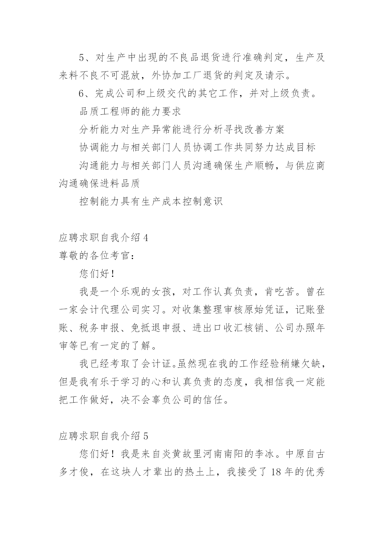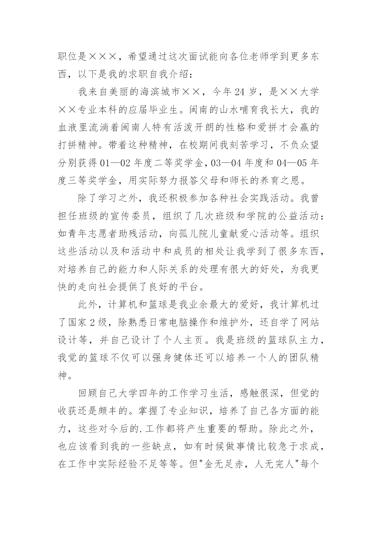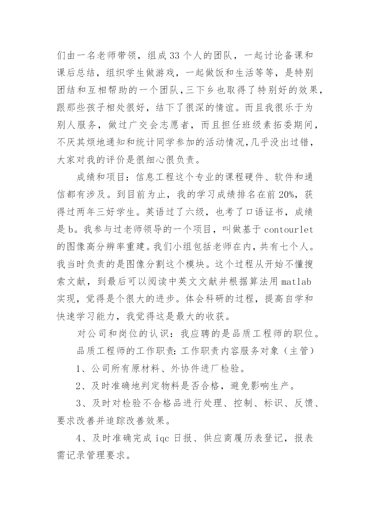 应聘求职自我介绍当进入一个新环境,常常需要我们进行自我介绍,用自我介绍往往可以让他人有一定的了解。那么什么样的自我介绍才合适呢?下面是小编为大家整理的应聘求职自我介绍,欢迎大家借鉴与参考,希望对大家有所帮助。应聘求职自我介绍1大家好,我叫___,应聘贵校的体育教师一职。首先向各位领导进行一下个人自我介绍__大学的四年时光,认真学习,刻苦训练,并且各课成绩优异。同时兼任体育学院院队、中长跑队队长,配合教练担任起院田径队中长跑的训练任务,从专项业务能力方面自己得到了充分发挥。自己不但专项突出,从第二专选及爱好方面发展自己的一技之长,而且通过教育实习证明自己有较强的组织能力,教学能力,力求教学方面新疑有效,且在实习中取得了优异成绩。在学习上,我积极进取,平时高标准严格要求自己,并采取先进的思维方式,客观地看待问题,学习运用辩证唯物主义分析解决问题。为了更加适应社会的需要,我坚持学习英语及计算机,就是靠这一点一滴的积累我逐渐的充实自己、完善自己。在生活上,我非常注重人际交往。因此我常常参加一些校院组织的公益活动及劳动当中,从中培养自己的交往能力,平时注意团结同学,乐于助人,往往以帮助他们摆脱困难为自己的快乐。在求学过程中,我犹深体会到作为一名人民教师的神圣职责,也由衷地感受到每一位老师犹如人梯,为成就攀登者而牺牲自己:犹如露珠,滋润着吐艳的花果。现在,我马上就要从一名受教者,到一名施教者,这是一直梦寐以求的愿望。因此,我将以满腔的热情、百倍的信心投入到我热爱的教育事业中去。经过四年的学习,我自信已具备走上教师岗位的条件,我坚信,贵校定会任贤唯举,慧眼识才,希望贵校能给我加入你们队伍的机会,我知道虽然我的讲台很窄,但我可以用青春和知识为己插上博空万里的翅膀,必尽我绵薄之力,为贵校作出贡献。应聘求职自我介绍2各位考官好,能参加这次面试我感到很荣幸,我希望通过这次面试将一个真实的自己展示给您,帮助自己抓住这个机会。我是___,来自于___。可能有的人知道___,那里就是我出生的地方,所以以此为名,同时它也有吉祥延绵之意。我平时喜欢阅读书籍和时事消息,尤其喜欢名人传记,在阅读他们时,我相信它们不光可以了解名人的风采,更可以增长自己的人生阅历,经历我生活中无法经历的精彩人生。而在事实方面更偏好于国际形势的了解。我相信在这个广泛合作的现代生活中,扩大自己的知识面是必然的。我毕业于___,在校期间多次参加专业实践活动和项目制定实施过程。成为一名合格的___是我一直不变的愿望。通过多年的学习和锻炼,我养成坚韧的性格和乐观的精神,尤其是人际关系和对事情的处理方式方面得到了长足的进展。1、人际方面我充分利用自己友善,有耐性的性格特点与身边的人和睦相处,在与人相处尤其是人际间的谈话中我可以掌握每一个人的情绪变化和表达含义及时的调整谈话内容和回应方式。2、在处事方面我坚信知己知彼才能百战不殆,不打无准备之仗,尽量考虑成功与失败的条件和得失,减少风险得程度,完成任务。我相信这两方面的特点可以帮助我更好的成为一名合格的___,帮助社会弱势群特获得更多的帮助和支持。人的生命是平等的,每个人都有获得美好生活的权利,这就是我对一名___职责的理解和诠释,我相信我会用我努力来见证一名___价值,希望大家给我这个机会。应聘求职自我介绍3基本信息:我叫__。_是__的_。来自华南理工大学,专业是信息工程。性格和社团活动:我性格比较开朗随和,乐于与人沟通,做事也很踏实认真。我在学校的社团联合会待过一年,曾参与组织过鹰翔计划等活动,就是针对学生社团各个负责人进行户外培训的拓展营活动。大二暑假参加学院组织的暑期三下乡活动,担任义教老师,这次经历让我印象深刻。当时我们由一名老师带领,组成33个人的团队,一起讨论备课和课后总结,组织学生做游戏,一起做饭和生活等等,是特别团结和互相帮助的一个团队,三下乡也取得了特别好的效果,跟那些孩子相处很好,结下了很深的情谊。而且我很乐于为别人服务,做过广交会志愿者,而且担任班级素拓委期间,不厌其烦地通知和统计同学参加的活动情况,几乎没出过错,大家对我的评价是很细心很负责。成绩和项目:信息工程这个专业的课程硬件、软件和通信都有涉及。到目前为止,我的学习成绩排名在前20%,获得过两年三好学生。英语过了六级,也考了口语证书,成绩是b。我参与过老师领导的一个项目,叫做基于contourlet的图像高分辨率重建。我们小组包括老师在内,共有七个人。我当时负责的是图像分割这个模块。这个过程从开始不懂搜索文献,到最后可以阅读中英文文献并根据算法用matlab实现,觉得是个很大的进步。体会科研的过程,提高自学和快速学习能力,我觉得这是最大的收获。对公司和岗位的认识:我应聘的是品质工程师的职位。品质工程师的工作职责:工作职责内容服务对象(主管)1、公司所有原材料、