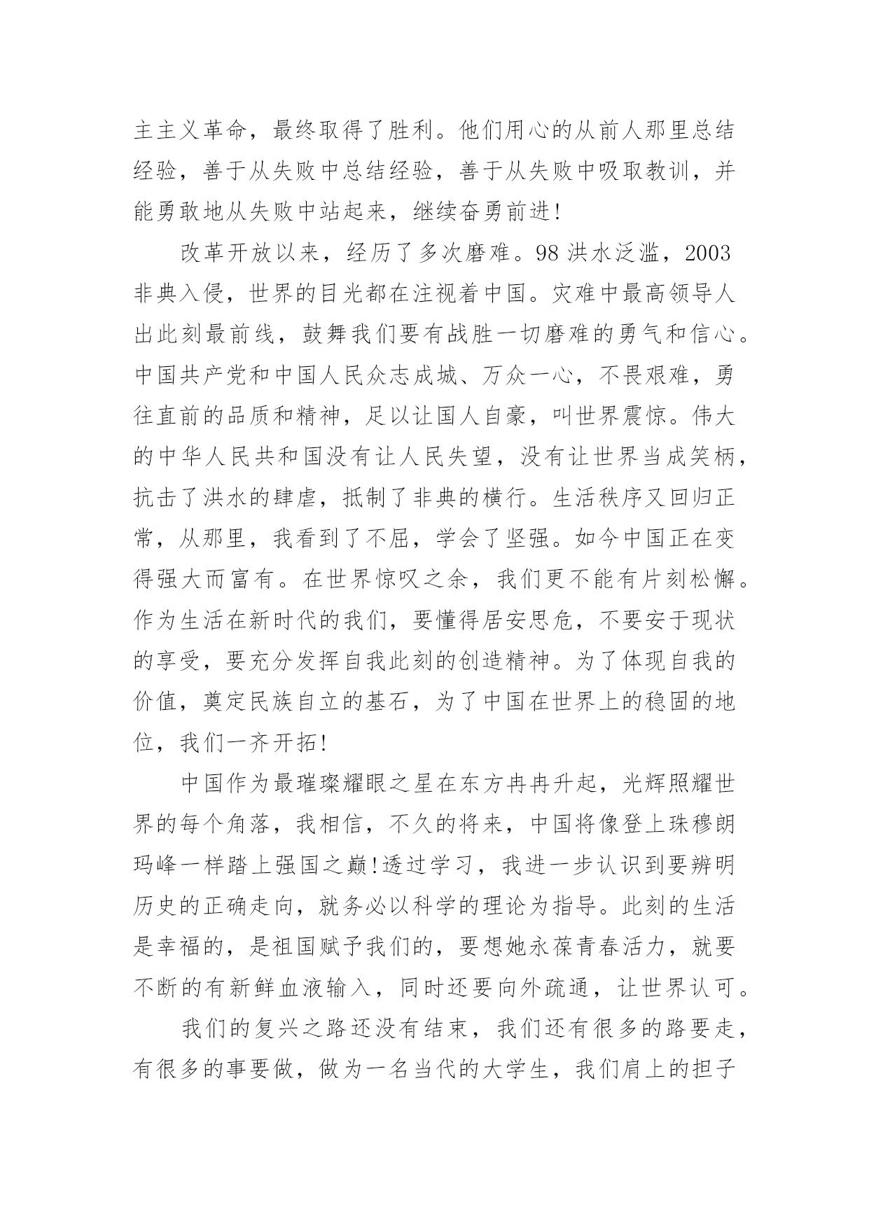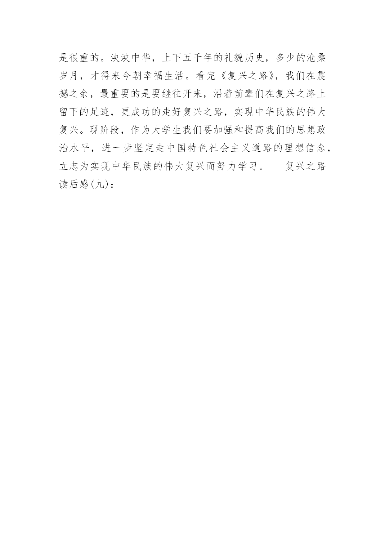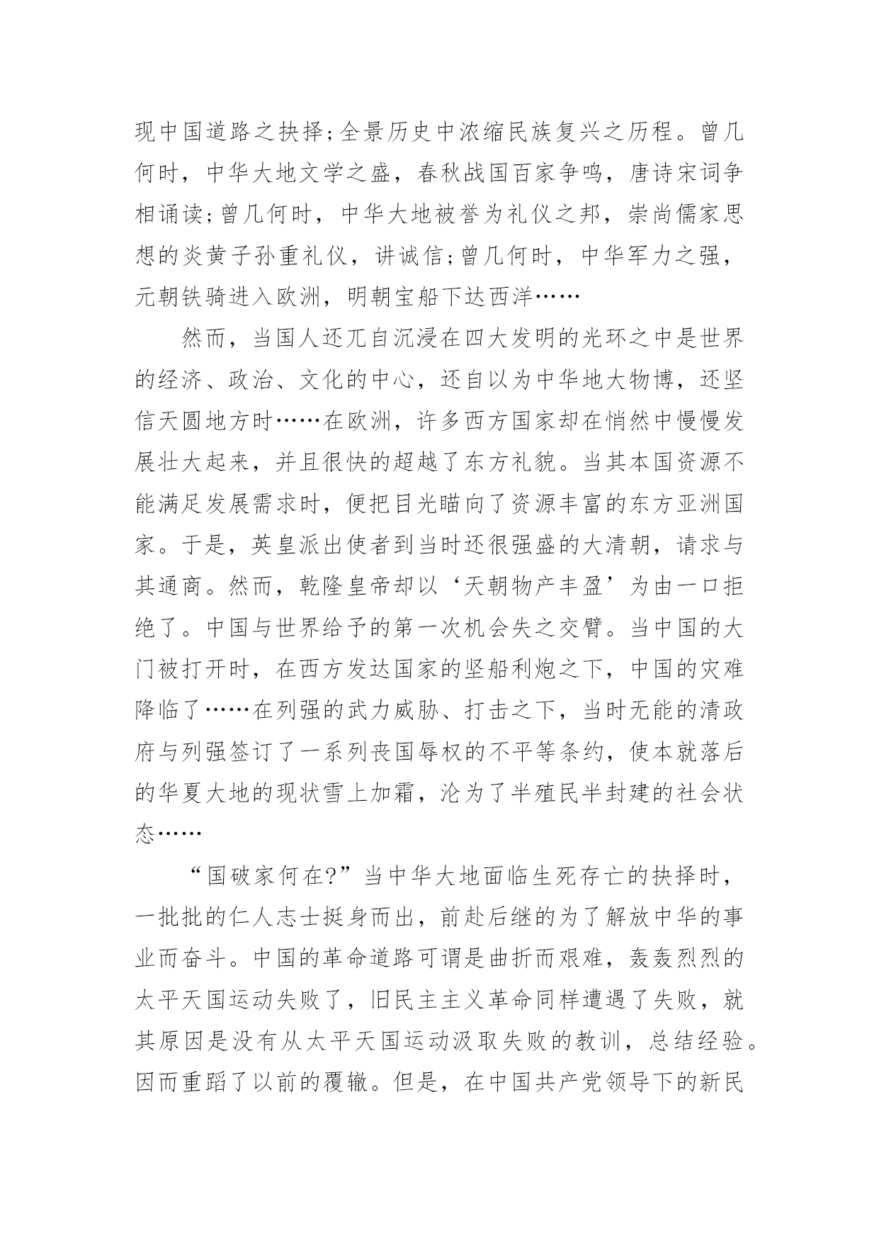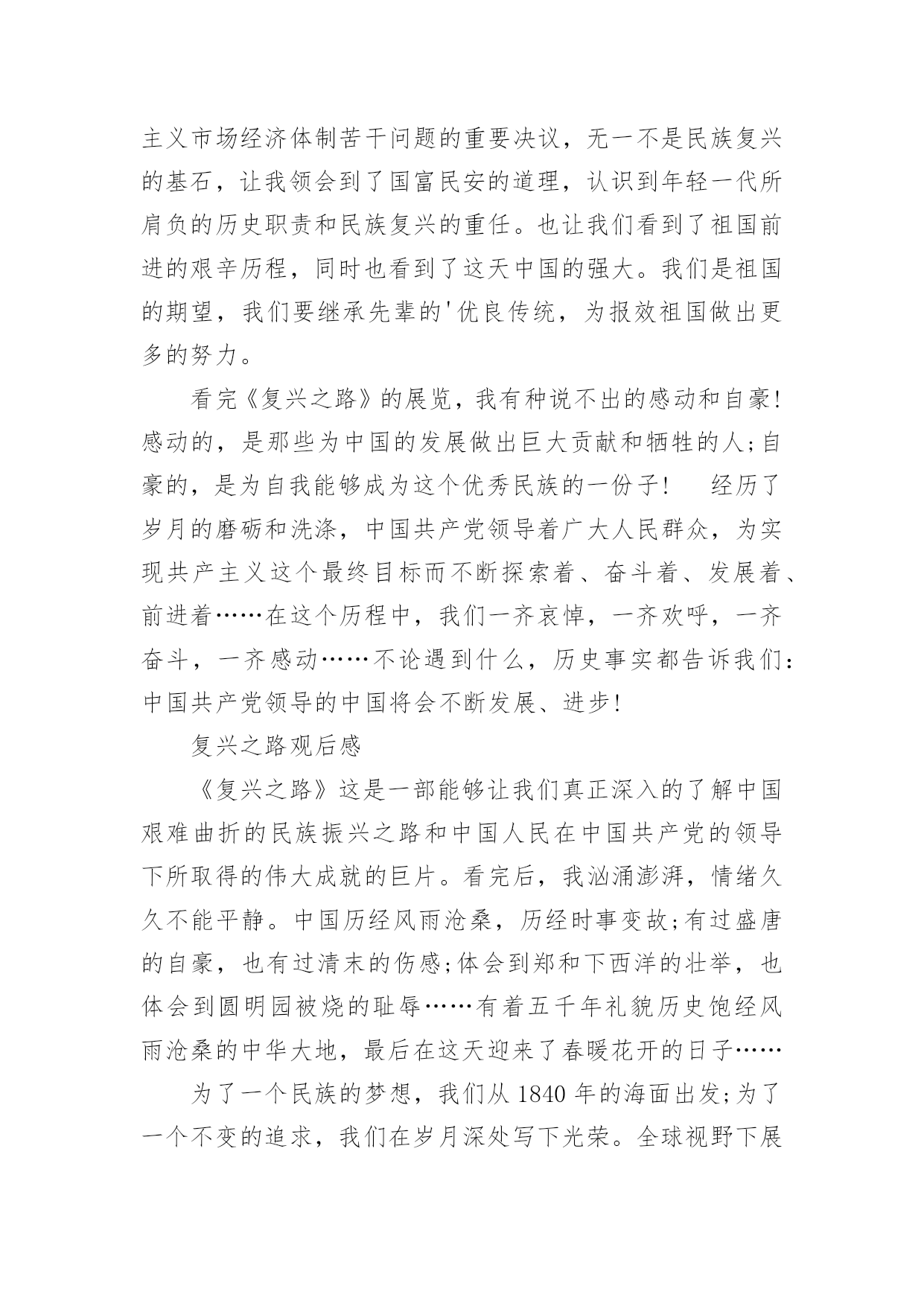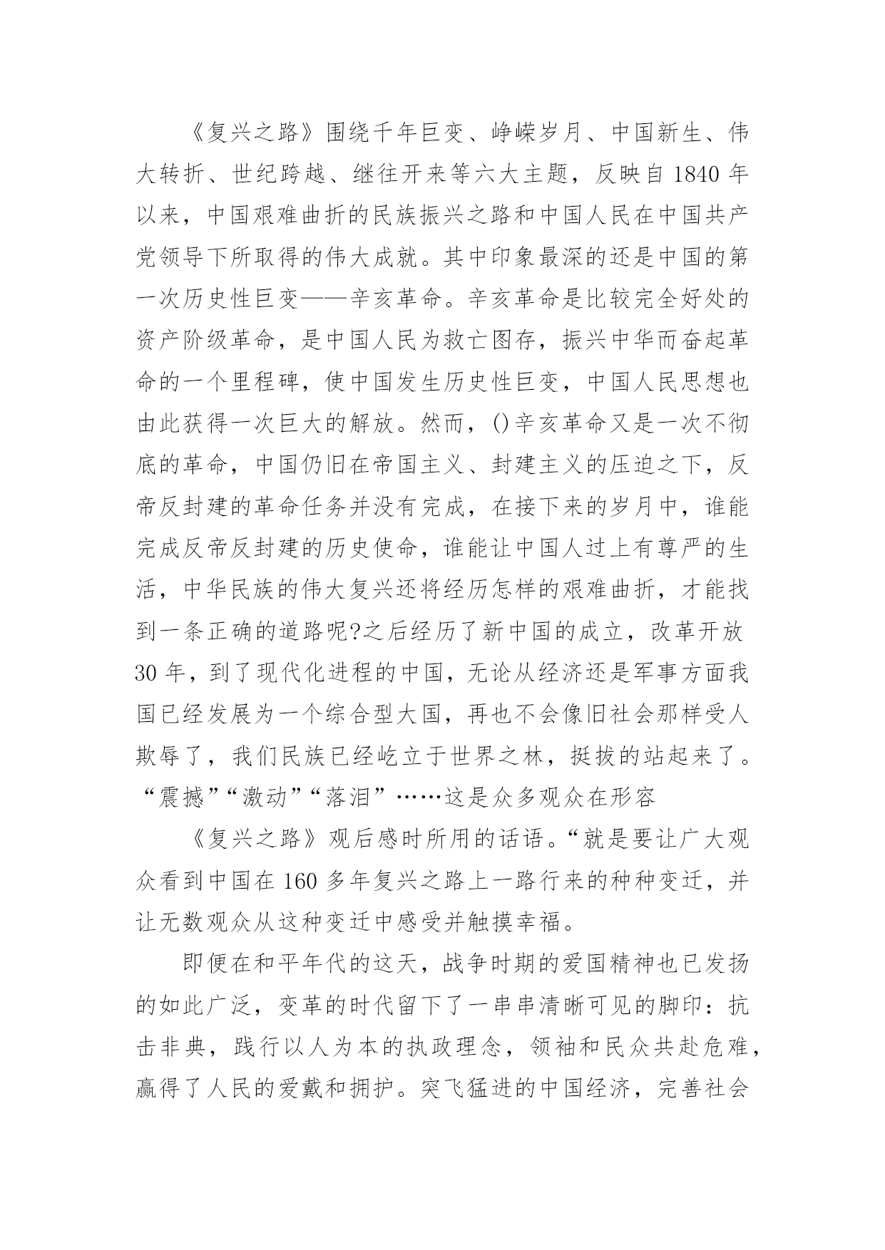 《复兴之路》观后感《复兴之路》,以战争以来一百多年的重大事件为视角,应用生动详细的历史资料,向我们展示一幅幅振兴图强的全景画面,使我们在历史的长河中体味百年祖国的沧桑巨变,体味民族的奋斗历程。中国是一头沉睡的巨狮。作为青少年的我们,理当奋发图强,为实现中华民族的伟大复兴添砖加瓦。下面两篇《复兴之路》观后感分享给大家,希望能带给你启发。复兴之路观后感历经风雨沧桑,历经时事变故,有过盛唐的自豪,也有过清末的伤感,体会到郑和下西洋的壮举,也体会到圆明园被烧的耻辱……有着五千年礼貌历史饱经风雨沧桑的中华大地,最后在这天迎来了春暖花开的日子,建党90周年之际,我们为这个国家而骄傲,为这个民族的繁荣昌盛而自豪。这天来到了国家博物馆进行参观,这天的主题是“复兴之路”,从战争到现代化的中国,步步经历了从困难到胜利的过程,无论是战争时期的流血牺牲还是和平年代的经济竞争,中国都在世界人民面前展现了我们是个勇敢自强的民族,所有困难我们都能够克服,唯独坚挺不拔的精神不能失去,这就是中华民族的伟大,我为我的祖国感到骄傲和自豪!“为了一个民族的梦想,我们从1840年的海面出发;为了一个不变的追求,我们在岁月深处写下光荣。全球视野下展现中国道路之抉择;全景历史中浓缩民族复兴之历程。”《复兴之路》围绕千年巨变、峥嵘岁月、中国新生、伟大转折、世纪跨越、继往开来等六大主题,反映自1840年以来,中国艰难曲折的民族振兴之路和中国人民在中国共产党领导下所取得的伟大成就。其中印象最深的还是中国的第一次历史性巨变——辛亥革命。辛亥革命是比较完全好处的资产阶级革命,是中国人民为救亡图存,振兴中华而奋起革命的一个里程碑,使中国发生历史性巨变,中国人民思想也由此获得一次巨大的解放。然而,()辛亥革命又是一次不彻底的革命,中国仍旧在帝国主义、封建主义的压迫之下,反帝反封建的革命任务并没有完成,在接下来的岁月中,谁能完成反帝反封建的历史使命,谁能让中国人过上有尊严的生活,中华民族的伟大复兴还将经历怎样的艰难曲折,才能找到一条正确的道路呢?之后经历了新中国的成立,改革开放30年,到了现代化进程的中国,无论从经济还是军事方面我国已经发展为一个综合型大国,再也不会像旧社会那样受人欺辱了,我们民族已经屹立于世界之林,挺拔的站起来了。“震撼”“激动”“落泪”……这是众多观众在形容《复兴之路》观后感时所用的话语。“就是要让广大观众看到中国在160多年复兴之路上一路行来的种种变迁,并让无数观众从这种变迁中感受并触摸幸福。即便在和平年代的这天,战争时期的爱国精神也已发扬的如此广泛,变革的时代留下了一串串清晰可见的脚印:抗击非典,践行以人为本的执政理念,领袖和民众共赴危难,赢得了人民的爱戴和拥护。突飞猛进的中国经济,完善社会主义市场经济体制苦干问题的重要决议,无一不是民族复兴的基石,让我领会到了国富民安的道理,认识到年轻一代所肩负的历史职责和民族复兴的重任。也让我们看到了祖国前进的艰辛历程,同时也看到了这天中国的强大。我们是祖国的期望,我们要继承先辈的'优良传统,为报效祖国做出更多的努力。看完《复兴之路》的展览,我有种说不出的感动和自豪!感动的,是那些为中国的发展做出巨大贡献和牺牲的人;自豪的,是为自我能够成为这个优秀民族的一份子!经历了岁月的磨砺和洗涤,中国共产党领导着广大人民群众,为实现共产主义这个最终目标而不断探索着、奋斗着、发展着、前进着……在这个历程中,我们一齐哀悼,一齐欢呼,一齐奋斗,一齐感动……不论遇到什么,历史事实都告诉我们:中国共产党领导的中国将会不断发展、进步!复兴之路观后感《复兴之路》这是一部能够让我们真正深入的了解中国艰难曲折的民族振兴之路和中国人民在中国共产党的领导下所取得的伟大成就的巨片。看完后,我汹涌澎湃,情绪久久不能平静。中国历经风雨沧桑,历经时事变故;有过盛唐的自豪,也有过清末的伤感;体会到郑和下西洋的壮举,也体会到圆明园被烧的耻辱……有着五千年礼貌历史饱经风雨沧桑的中华大地,最后在这天迎来了春暖花开的日子……为了一个民族的梦想,我们从1840年的海面出发;为了一个不变的追求,我们在岁月深处写下光荣。全球视野下展现中国道路之抉择;全景历史中浓缩民族复兴之历程。曾几何时,中华大地文学之盛,春秋战国百家争鸣,唐诗宋词争相诵读;曾几何时,中华大地被誉为礼仪之邦,崇尚儒家思想的炎黄子孙重礼仪,讲诚信;曾几何时,中华军力之强,元朝铁骑进入欧洲,明朝宝船下达西洋……然而,当国人还兀自沉浸在四大发明的光环之中是世界的经济、政治、文化的中心,还自以为中华地大物博,还坚信天圆地方时……在欧洲,许多西方国家却在悄然中慢慢发展壮大起来,并且很快的超越了东方礼貌。当其本国资源不能满足发展需求时,便把目光瞄向了资源丰富的东方亚洲国家。于是,英皇派出使者到当时还很强盛的大清朝,请求与其通