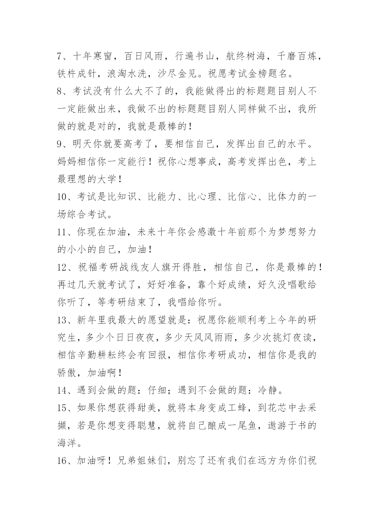 经典考试顺利祝福短信经典考试顺利祝福短信(精选30句)祝愿天下所有考生开心度过期中考试。祝福你们旗开得胜,取得美好佳绩。平心对待,你们是最棒的!仁慈的上帝会祝福你们的,相信自己,一定能行!以下是小编为大家提供的考试顺利祝福短信,仅供参考,欢迎大家阅读。1、生命中的一切美好需要我们去追寻,愿师弟师妹把握好自己!2、一年一考年年考,考试并非华容道。人生大考多在后,全力拼搏有精彩!3、付出终有回报,信心绝对重要。现在就到期中,别忘面带微笑。抽空睡个好觉,不必紧张煎熬。敞开鲲鹏怀抱,直上青云九霄。4、兄弟你今天就要参加考试了,送你一条幸运短信,据说在考试当天能收到这样一条短信,就会考出自己满意的成绩,祝你考试好运气啊!5、告别炎夏日,离开家乡故土,走进大学校门,开始新的生活,加入社团组织,认识更多朋友,拥有好的人气,帮助更多学生,好运带来福运,克服更多困难,盼望学业有成,指点祖国河山。6、别想分数高低,放松最为重要。老妈最近很累,别忘对她笑笑,老爸场场接送,给他一个拥抱。穿得漂漂亮亮,誓把监考迷倒。最后提醒一遍,一定要检查哦!7、十年寒窗,百日风雨,行遍书山,航终树海,千磨百炼,铁杵成针,浪淘水洗,沙尽金见。祝愿考试金榜题名。8、考试没有什么大不了的,我能做得出的标题题目别人不一定能做出来,我做不出的标题题目别人同样做不出,我所做的就是对的,我就是最棒的!9、明天你就要高考了,要相信自己,发挥出自己的水平。妈妈相信你一定能行!祝你心想事成,高考发挥出色,考上最理想的大学!10、考试是比知识、比能力、比心理、比信心、比体力的一场综合考试。11、你现在加油,未来十年你会感激十年前那个为梦想努力的小小的自己,加油!12、祝福考研战线友人旗开得胜,相信自己,你是最棒的!再过几天就考试了,好好准备,靠个好成绩,好久没唱歌给你听了,等考研结束了,我唱给你听。13、新年里我最大的愿望就是:祝愿你能顺利考上今年的研究生,多少个日日夜夜,多少天风风雨雨,多少次挑灯夜读,相信辛勤耕耘终会有回报,相信你考研成功,相信你是我的骄傲,加油啊!14、遇到会做的题:仔细;遇到不会做的题:冷静。15、如果你想获得甜美,就将本身变成工蜂,到花芯中去采撷,若是你想变得聪慧,就将自己酿成一尾鱼,遨游于书的海洋。16、加油呀!兄弟姐妹们,别忘了还有我们在远方为你们祝福、加油!考试榜上有名!17、初中的你是优秀的,我相信,高中的你也会甘当不让,披荆斩棘,所向披靡。以胜利者的姿态,在数学的王国,傲视群雄!18、大海航行靠舵手,万物生长靠太阳,做题靠的是方法和思想。抓住题眼,就不会迷失方向,学会联想,思维就生长了翅膀,经典是锦囊,危难中自有主张,实深精活,积极向上,愿你在数学的王国,尽显才能,雄霸一方!19、就要考试了,希望我的问候短信会为你送去一份轻松清爽的心情,不要太紧张哦!20、十年寒窗,百日风雨,行遍书山,航终树海,千磨百炼,铁杵成针,浪淘水洗,沙尽金见。祝愿艺考金榜题名。21、昨日撒下勤奋种,今朝一搏必成功。鲤鱼一跃便成龙,大鹏展翅震长空。前程似锦圆美梦,锦衣凯旋沐春风。寒窗不负苦心人,金榜有你祝高中。艺考顺利,愿你成功!22、当你步入考场的时候,我祝福你是信心满满的;当你正在答题的时候,我祝愿你是思路清晰的;当你走出考场的时候,我希望你是开心快乐的。祝你有好成绩,拿到自己想要的岗位!23、心态要好,保持冷静,基础打好,莫要烦躁,开开心心,早睡早起,精神十足,考上大学,实现梦想,相信自己,一定最好。24、只有成功,没有失败,努力是一步,成功是一步,只要你努力,一定能行!相信自己。25、努力的苦读,就为这一刻。26、终于要考试了,我知道你准备了好久,也就是为了这一天。不过不要紧张,不用害怕,我相信你,你也有这份自信,送你句祝福语:祝你马到成功!27、信心来自于实力,实力来自于勤奋。人生终有许多选择。每一步都要慎重。但是一次选择不能决定一切。不要犹豫,作出选择就不要后悔。只要我们能不屈不挠地奋斗,胜利就在前方。28、立下宏伟志愿,奋发图强,积极进取;喊响学习口号,好好学习,天天向上;挥洒辛勤汗水,努力用功,29、在平常生活中,我们每天都在不断尝试中,我们走向过成功,也品味过失败的滋味,走过心灵阴雨晴空。运动员,不要放弃任何一次尝试,无论失败,重要是你们勇敢参与的精神,付出的背后就是胜利。无论是成功还是失败,我们永远赞美你,你们永远是我们最大的骄傲。30、今朝苦学迎夜灯,他年折桂步蟾宫。墙上的日历一页页的撕去,显赫的倒计时渐渐临近,我亲爱的朋友,请努力起来吧!为了六月的辉煌,请惜取每一寸光陰。