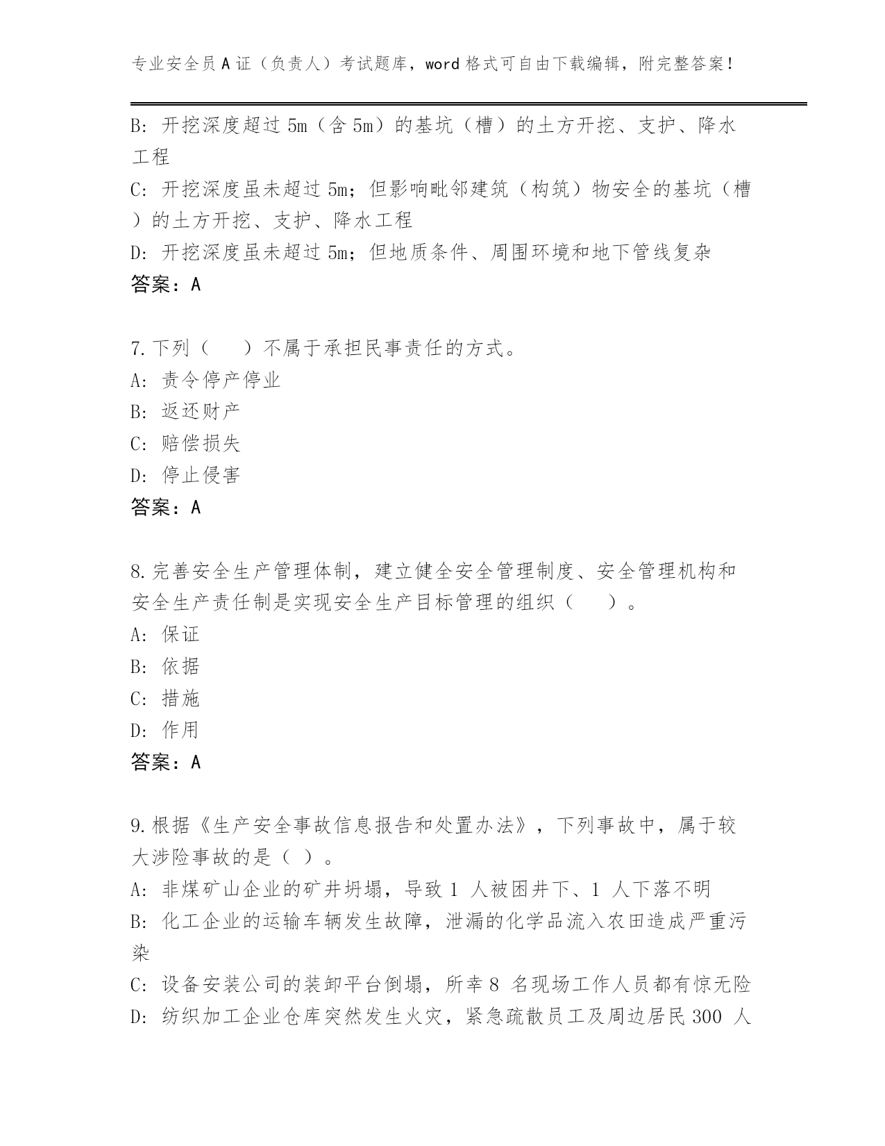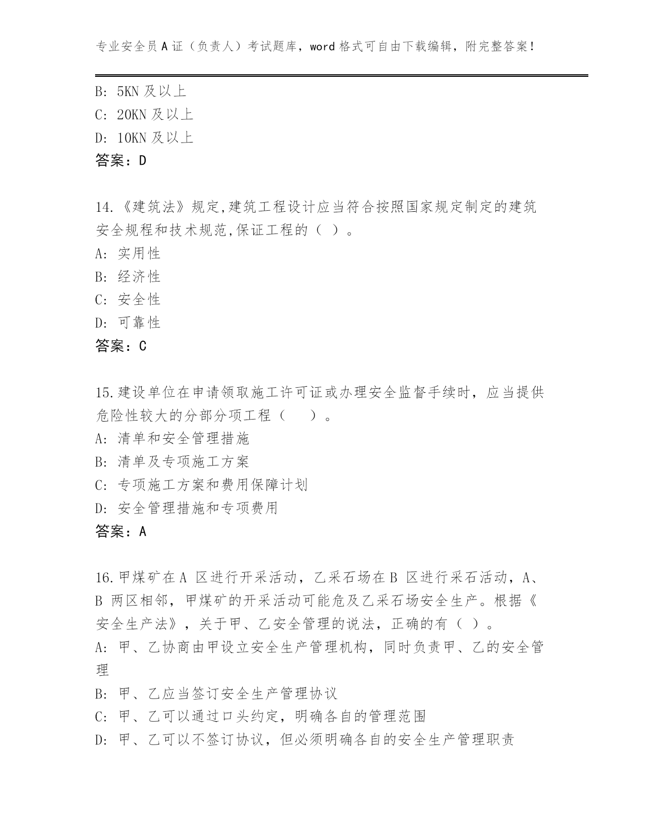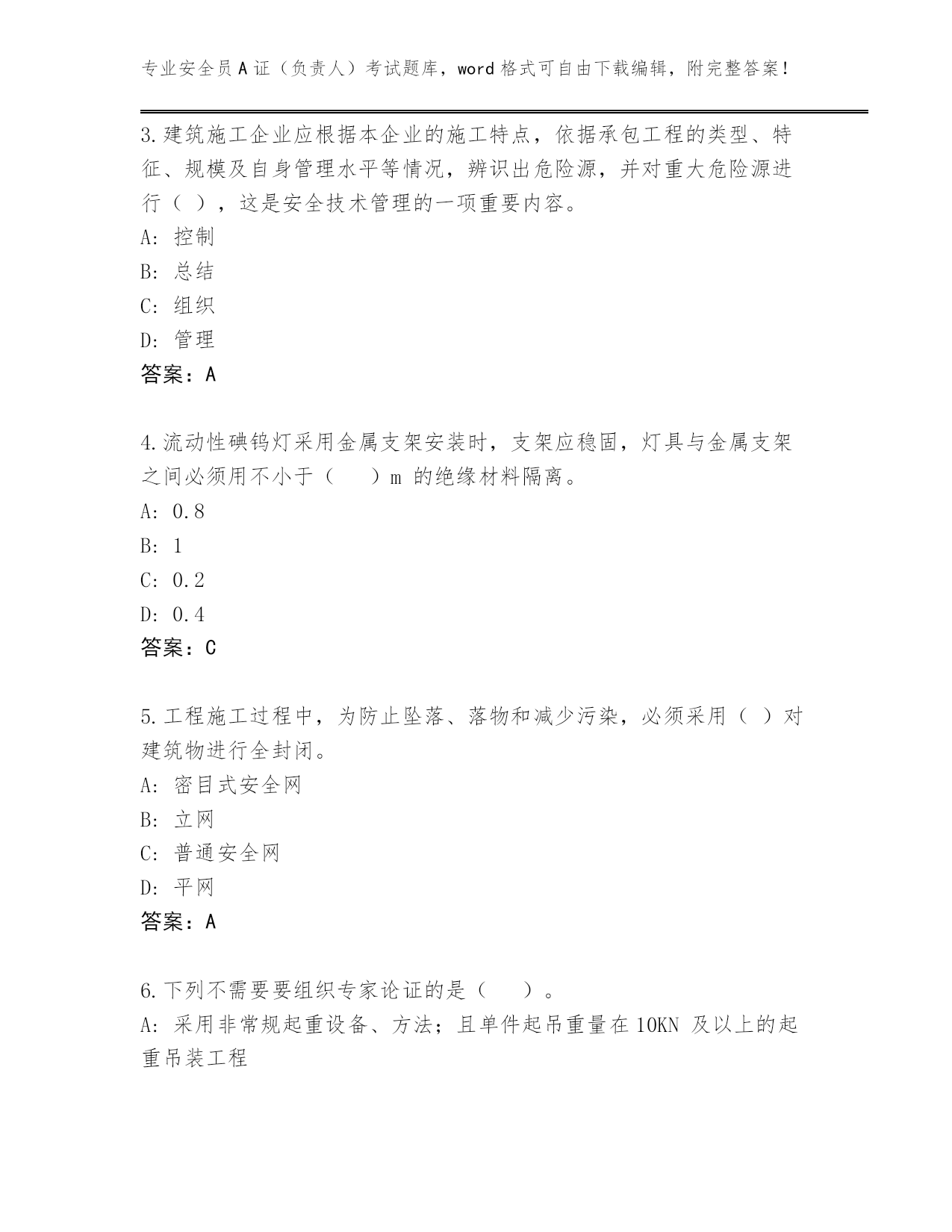 专业安全员A证(负责人)考试题库,word格式可自由下载编辑,附完整答案!内部使用河南省孟州市安全员A证(负责人)考试真题题库及答案【历年真题】第I部分单选题(100题)1.某大型仓储企业有闲置厂房多处,为盘活固定资产,对外出租闲置厂房。依据《安全生产法》的规定,下列做法正确的是()。A:将某闲置厂房出租给某矿山企业存放民用爆破物品,并与该企业签订专门的安全生产管理协议,约定由该企业全权负责安全管理并承担安全责任B:将某闲置厂房出租给某保险公司作经营用房,考虑到保险公司业务特点,在租赁合同中对双方安全职责未做明确规定C:将某闲置厂房出租给某物流公司,在租赁合同中明确双方安全职责,并按照合同约定由出租方定期对该公司进行安全检查,发现安全问题及时督促整改D:将某闲置厂房出租给某大型连锁超市,双方签订专门的安全生产管理协议,规定出租方不承担对该连锁超市安全生产检查的责任答案:C2.《安全生产法》规定,生产经营单位必须对安全设备进行()维护、保养。A:阶段性B:经常性C:永久性D:一次性答案:B3.建筑施工企业应根据本企业的施工特点,依据承包工程的类型、特征、规模及自身管理水平等情况,辨识出危险源,并对重大危险源进行(),这是安全技术管理的一项重要内容。A:控制B:总结C:组织D:管理答案:A4.流动性碘钨灯采用金属支架安装时,支架应稳固,灯具与金属支架之间必须用不小于()m的绝缘材料隔离。A:0.8B:1C:0.2D:0.4答案:C5.工程施工过程中,为防止坠落、落物和减少污染,必须采用()对建筑物进行全封闭。A:密目式安全网B:立网C:普通安全网D:平网答案:A6.下列不需要要组织专家论证的是()。A:采用非常规起重设备、方法;且单件起吊重量在10KN及以上的起重吊装工程B:开挖深度超过5m(含5m)的基坑(槽)的土方开挖、支护、降水工程C:开挖深度虽未超过5m;但影响毗邻建筑(构筑)物安全的基坑(槽)的土方开挖、支护、降水工程D:开挖深度虽未超过5m;但地质条件、周围环境和地下管线复杂答案:A7.下列()不属于承担民事责任的方式。A:责令停产停业B:返还财产C:赔偿损失D:停止侵害答案:A8.完善安全生产管理体制,建立健全安全管理制度、安全管理机构和安全生产责任制是实现安全生产目标管理的组织()。A:保证B:依据C:措施D:作用答案:A9.根据《生产安全事故信息报告和处置办法》,下列事故中,属于较大涉险事故的是()。A:非煤矿山企业的矿井坍塌,导致1人被困井下、1人下落不明B:化工企业的运输车辆发生故障,泄漏的化学品流入农田造成严重污染C:设备安装公司的装卸平台倒塌,所幸8名现场工作人员都有惊无险D:纺织加工企业仓库突然发生火灾,紧急疏散员工及周边居民300人答案:B10.物料提升机地面进料口应设置防护围栏;围栏高度不应小于(),围栏立面可采用网板结构,强度符合规定。A:1.5mB:1.8mC:2mD:1m答案:B11.任何单位和个人不得将产生职业病危害的作业()给不具备职业病防护条件的单位和个人。A:安排B:转移C:转让D:分包答案:B12.生产经营单位应当在有较大危险因素的生产经营场所和有关设施、设备上,设置明显的()。A:安全使用标志B:安全合格标志C:安全警示标志D:安全检验检测标志答案:C13.采用非常规起重设备、方法,且单件起吊重量在()的起重吊装工程确定为危险性较大的分部分项工程。A:15KN及以上B:5KN及以上C:20KN及以上D:10KN及以上答案:D14.《建筑法》规定,建筑工程设计应当符合按照国家规定制定的建筑安全规程和技术规范,保证工程的()。A:实用性B:经济性C:安全性D:可靠性答案:C15.建设单位在申请领取施工许可证或办理安全监督手续时,应当提供危险性较大的分部分项工程()。A:清单和安全管理措施B:清单及专项施工方案C:专项施工方案和费用保障计划D:安全管理措施和专项费用答案:A16.甲煤矿在A区进行开采活动,乙采石场在B区进行采石活动,A、B两区相邻,甲煤矿的开采活动可能危及乙采石场安全生产。根据《安全生产法》,关于甲、乙安全管理的说法,正确的有()。A:甲、乙协商由甲设立安全生产管理机构,同时负责甲、乙的安全管理B:甲、乙应当签订安全生产管理协议C:甲、乙可以通过口头约定,明确各自的管理范围D:甲、乙可以不签订协议,但必须明确各自的安全生产管理职责答案:B17.特种设备安全法规定,对特种设备生产、经营、使用单位擅自动用、调换、转移、损毁被查封、扣押的特