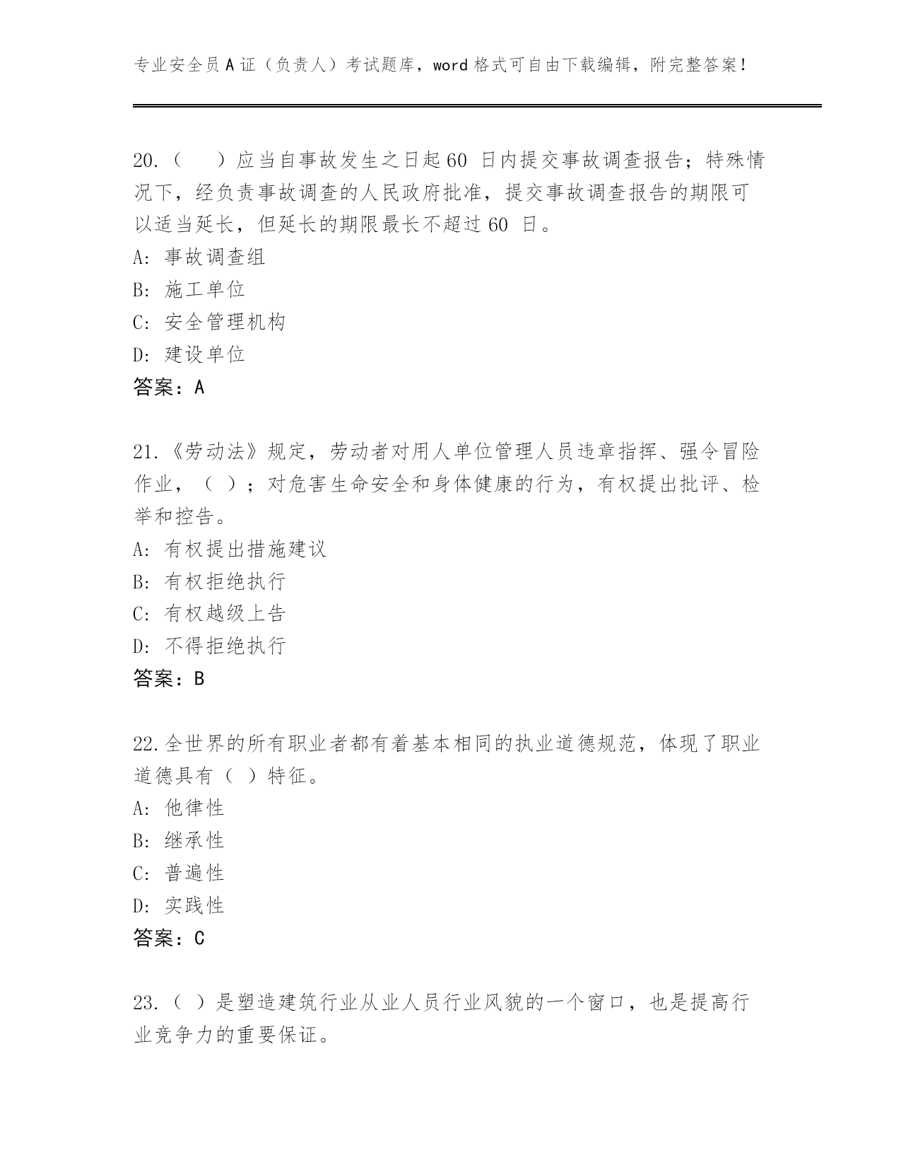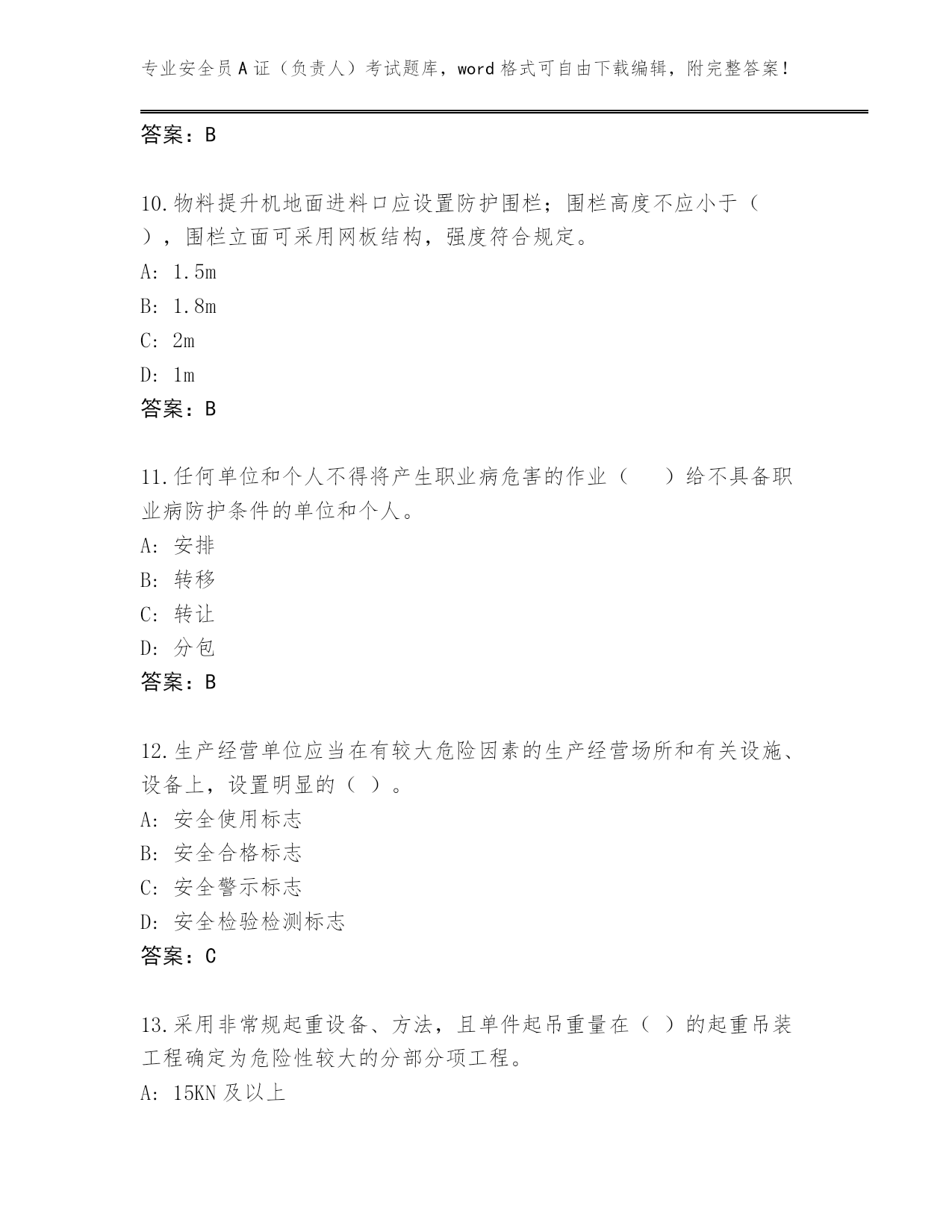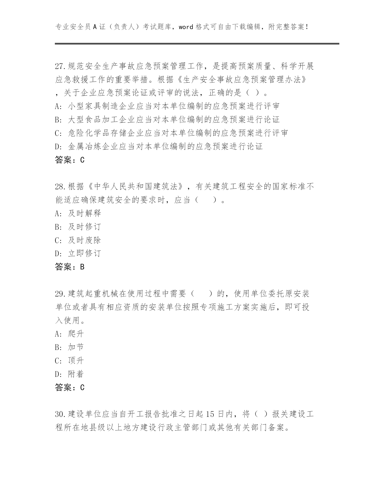专业安全员A证(负责人)考试题库,word格式可自由下载编辑,附完整答案!内部使用河南省孟州市安全员A证(负责人)考试真题题库及答案【历年真题】第I部分单选题(100题)1.某大型仓储企业有闲置厂房多处,为盘活固定资产,对外出租闲置厂房。依据《安全生产法》的规定,下列做法正确的是()。A:将某闲置厂房出租给某矿山企业存放民用爆破物品,并与该企业签订专门的安全生产管理协议,约定由该企业全权负责安全管理并承担安全责任B:将某闲置厂房出租给某保险公司作经营用房,考虑到保险公司业务特点,在租赁合同中对双方安全职责未做明确规定C:将某闲置厂房出租给某物流公司,在租赁合同中明确双方安全职责,并按照合同约定由出租方定期对该公司进行安全检查,发现安全问题及时督促整改D:将某闲置厂房出租给某大型连锁超市,双方签订专门的安全生产管理协议,规定出租方不承担对该连锁超市安全生产检查的责任答案:C2.《安全生产法》规定,生产经营单位必须对安全设备进行()维护、保养。A:阶段性B:经常性C:永久性D:一次性答案:B3.建筑施工企业应根据本企业的施工特点,依据承包工程的类型、特征、规模及自身管理水平等情况,辨识出危险源,并对重大危险源进行(),这是安全技术管理的一项重要内容。A:控制B:总结C:组织D:管理答案:A4.流动性碘钨灯采用金属支架安装时,支架应稳固,灯具与金属支架之间必须用不小于()m的绝缘材料隔离。A:0.8B:1C:0.2D:0.4答案:C5.工程施工过程中,为防止坠落、落物和减少污染,必须采用()对建筑物进行全封闭。A:密目式安全网B:立网C:普通安全网D:平网答案:A6.下列不需要要组织专家论证的是()。A:采用非常规起重设备、方法;且单件起吊重量在10KN及以上的起重吊装工程B:开挖深度超过5m(含5m)的基坑(槽)的土方开挖、支护、降水工程C:开挖深度虽未超过5m;但影响毗邻建筑(构筑)物安全的基坑(槽)的土方开挖、支护、降水工程D:开挖深度虽未超过5m;但地质条件、周围环境和地下管线复杂答案:A7.下列()不属于承担民事责任的方式。A:责令停产停业B:返还财产C:赔偿损失D:停止侵害答案:A8.完善安全生产管理体制,建立健全安全管理制度、安全管理机构和安全生产责任制是实现安全生产目标管理的组织()。A:保证B:依据C:措施D:作用答案:A9.根据《生产安全事故信息报告和处置办法》,下列事故中,属于较大涉险事故的是()。A:非煤矿山企业的矿井坍塌,导致1人被困井下、1人下落不明B:化工企业的运输车辆发生故障,泄漏的化学品流入农田造成严重污染C:设备安装公司的装卸平台倒塌,所幸8名现场工作人员都有惊无险D:纺织加工企业仓库突然发生火灾,紧急疏散员工及周边居民300人答案:B10.物料提升机地面进料口应设置防护围栏;围栏高度不应小于(),围栏立面可采用网板结构,强度符合规定。A:1.5mB:1.8mC:2mD:1m答案:B11.任何单位和个人不得将产生职业病危害的作业()给不具备职业病防护条件的单位和个人。A:安排B:转移C:转让D:分包答案:B12.生产经营单位应当在有较大危险因素的生产经营场所和有关设施、设备上,设置明显的()。A:安全使用标志B:安全合格标志C:安全警示标志D:安全检验检测标志答案:C13.采用非常规起重设备、方法,且单件起吊重量在()的起重吊装工程确定为危险性较大的分部分项工程。A:15KN及以上B:5KN及以上C:20KN及以上D:10KN及以上答案:D14.《建筑法》规定,建筑工程设计应当符合按照国家规定制定的建筑安全规程和技术规范,保证工程的()。A:实用性B:经济性C:安全性D:可靠性答案:C15.建设单位在申请领取施工许可证或办理安全监督手续时,应当提供危险性较大的分部分项工程()。A:清单和安全管理措施B:清单及专项施工方案C:专项施工方案和费用保障计划D:安全管理措施和专项费用答案:A16.甲煤矿在A区进行开采活动,乙采石场在B区进行采石活动,A、B两区相邻,甲煤矿的开采活动可能危及乙采石场安全生产。根据《安全生产法》,关于甲、乙安全管理的说法,正确的有()。A:甲、乙协商由甲设立安全生产管理机构,同时负责甲、乙的安全管理B:甲、乙应当签订安全生产管理协议C:甲、乙可以通过口头约定,明确各自的管理范围D:甲、乙可以不签订协议,但必须明确各自的安全生产管理职责答案:B17.特种设备安全法规定,对特种设备生产、经营、使用单位擅自动用、调换、转移、损毁被查封、扣押的特