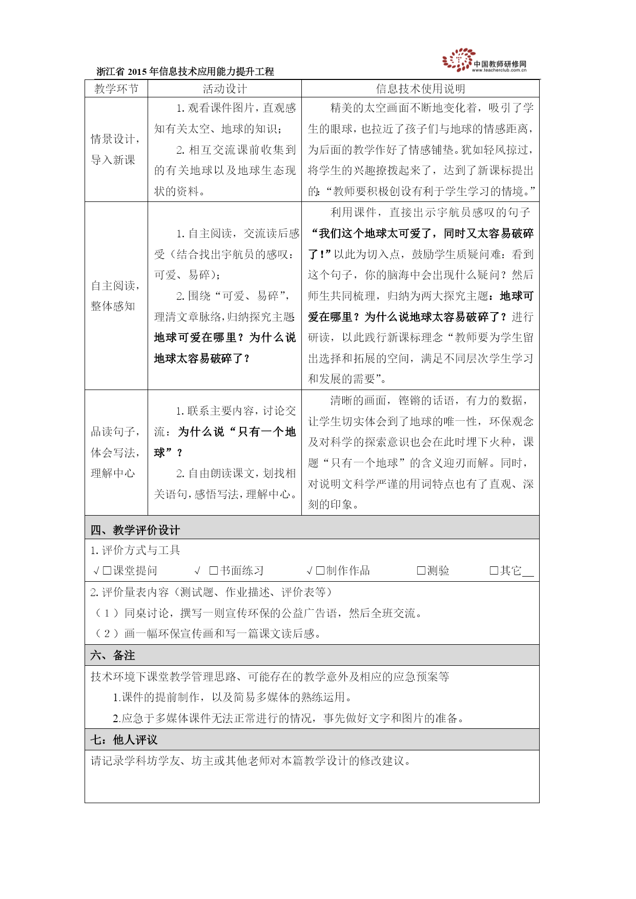 浙江省2015年信息技术应用能力提升工程沈燕芳的教学设计课题摘要学科语文学段小学高段年级六年级单元第三单元教材版本人教版课程名称《只有一个地球》一、学习内容分析1.教材分析《只有一个地球》是新课标人教版小学语文第十一册的一篇逻辑严谨、条理清晰、通俗易懂的有关环境保护方面的科普知识说明文。这篇文章以题目贯穿全文,主题重大,立意深远,学生通过学习,不仅能获得地球的有关知识,而且能增强环保意识,为他们将来自觉地担负起环保的责任打下初步基础。全文条分缕析,说服力强,先讲人类拥有的地球美丽而渺小,接着讲地球上资源有限,然后讲人类不能够居住别的星球,最后呼吁人类精心保护这唯一可赖以生存的星球。从而使得“保护地球,势在必行”的观念深入读者之心,达到作者写作之初衷。另外,作者还运用列数字、举例子、作比较、打比方等多种说明方法增强文章的说服力,不仅把地球的特点、地球与人类的关系说得清楚、明白、通俗易懂,而且说得准确、生动、形象,从而增强了文章的说服力、感染力和号召力。2.学情分析教学前,学生通过看电视、听广告等途径,对保护地球有了一定的了解,这为学习本课铺垫了一定的思想基础。然而,小学生的阅读理解能力还不强,知识面也不宽,所以,理解“生态灾难、不能移居”等道理将是他们学习中的难点。3.教学目标(含重难点)(1)默读课文,自主认识生字新词。能联系上下文理解“慷慨、有限、本来”等词。(2)根据课文内容理解句子“我们这个地球太可爱了,又太容易破碎了!”(3)理解课内容,懂得“只有一个地球”的道理,增强爱护环境,保护地球的意识。(4)体会说明文用语的准确、严谨,学习说明的方法。教学重点:让学生明白人类的生存“只有一个地球”,懂得珍惜资源、保护地球的生态环境。教学难点:通过联系实际思考问题,加深对课文的理解,并将保护地球的意识付诸行动。二、教学环境选择√□简易多媒体教室□交互式电子白板□网络教室□移动学习环境三、教学过程设计教学环节活动设计信息技术使用说明情景设计,导入新课1.观看课件图片,直观感知有关太空、地球的知识;2.相互交流课前收集到的有关地球以及地球生态现状的资料。精美的太空画面不断地变化着,吸引了学生的眼球,也拉近了孩子们与地球的情感距离,为后面的教学作好了情感铺垫。犹如轻风掠过,将学生的兴趣撩拨起来了,达到了新课标提出的:“教师要积极创设有利于学生学习的情境。”自主阅读,整体感知1.自主阅读,交流读后感受(结合找出宇航员的感叹:可爱、易碎);2.围绕“可爱、易碎”,理清文章脉络,归纳探究主题:地球可爱在哪里?为什么说地球太容易破碎了?利用课件,直接出示宇航员感叹的句子“我们这个地球太可爱了,同时又太容易破碎了!”以此为切入点,鼓励学生质疑问难:看到这个句子,你的脑海中会出现什么疑问?然后师生共同梳理,归纳为两大探究主题:地球可爱在哪里?为什么说地球太容易破碎了?进行研读,以此践行新课标理念“教师要为学生留出选择和拓展的空间,满足不同层次学生学习和发展的需要”。品读句子,体会写法,理解中心1.联系主要内容,讨论交流:为什么说“只有一个地球”?2.自由朗读课文,划找相关语句,感悟写法,理解中心。清晰的画面,铿锵的话语,有力的数据,让学生切实体会到了地球的唯一性,环保观念及对科学的探索意识也会在此时埋下火种,课题“只有一个地球”的含义迎刃而解。同时,对说明文科学严谨的用词特点也有了直观、深刻的印象。四、教学评价设计1.评价方式与工具√□课堂提问√□书面练习√□制作作品□测验□其它2.评价量表内容(测试题、作业描述、评价表等)(1)同桌讨论,撰写一则宣传环保的公益广告语,然后全班交流。(2)画一幅环保宣传画和写一篇课文读后感。六、备注技术环境下课堂教学管理思路、可能存在的教学意外及相应的应急预案等1.课件的提前制作,以及简易多媒体的熟练运用。2.应急于多媒体课件无法正常进行的情况,事先做好文字和图片的准备。七:他人评议请记录学科坊学友、坊主或其他老师对本篇教学设计的修改建议。