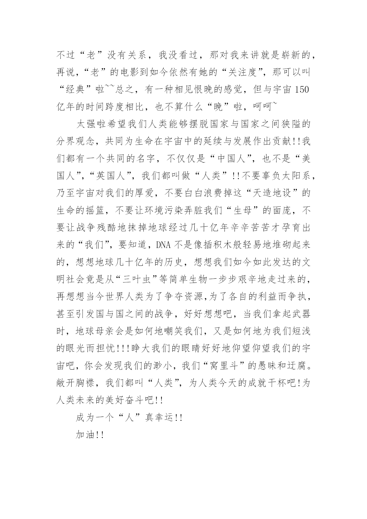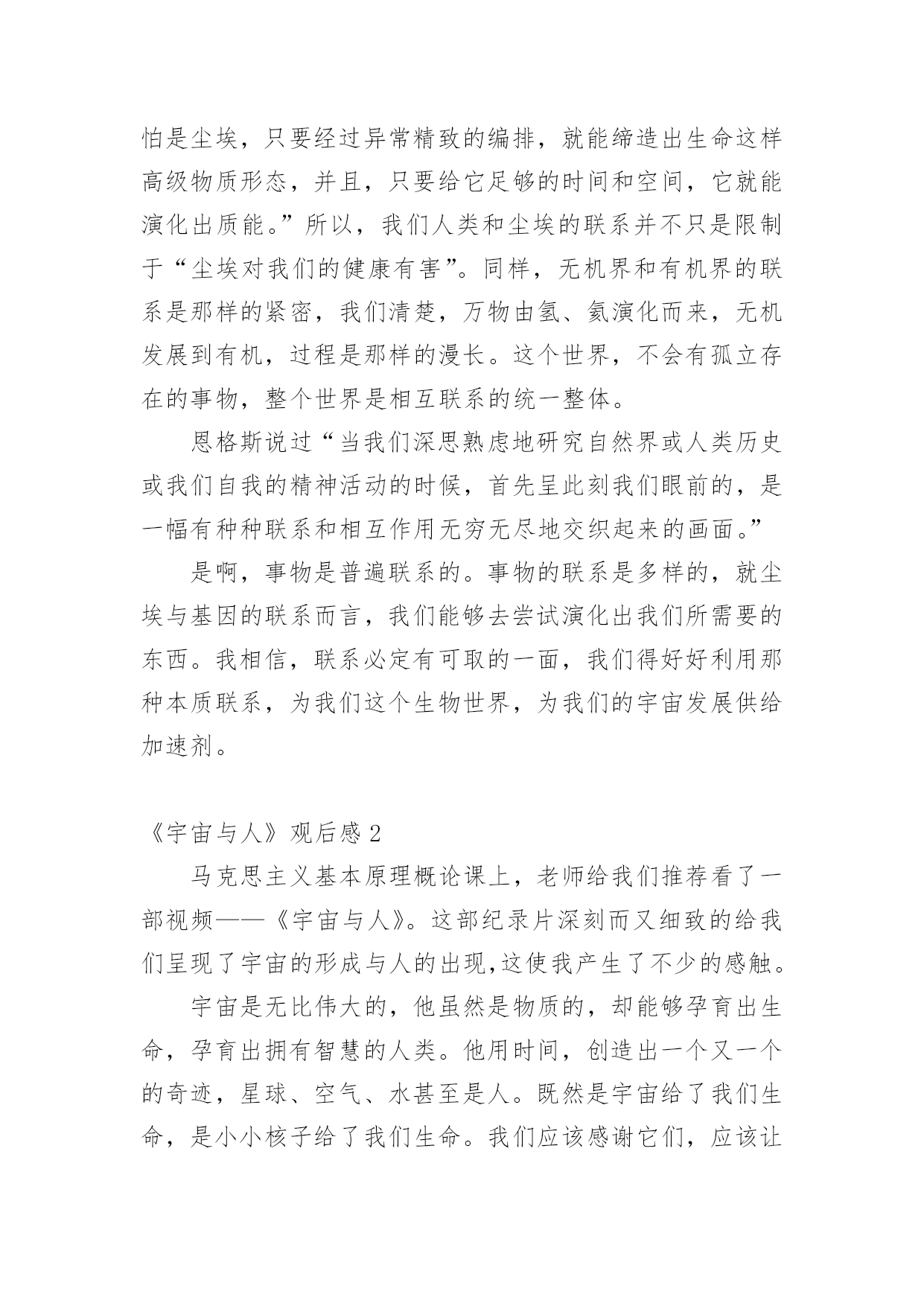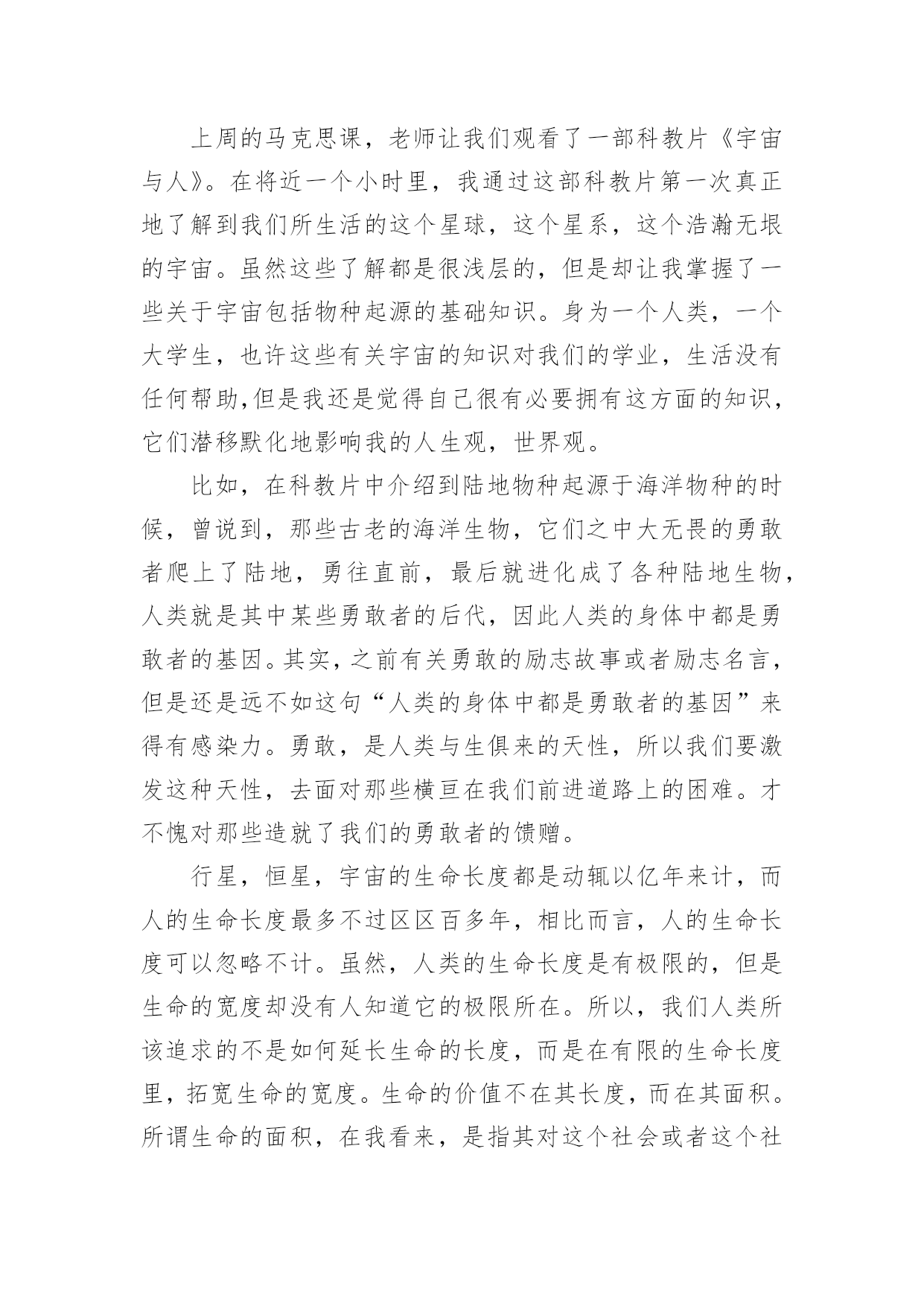 《宇宙与人》观后感认真观看完一部影视作品以后,你有什么总结呢?需要写一篇观后感好好地作记录了。到底应如何写观后感呢?以下是小编收集整理的《宇宙与人》观后感,仅供参考,欢迎大家阅读。《宇宙与人》观后感1高中的时候,政治教师就说过“事物联系的普遍性”的哲学观点。我真的想不明白天空中飞扬的尘埃和我们人类有什么关系,按我的观点,如果硬要把我们人类和尘埃来上关系,那就是,尘埃对我们的健康有影响。无机界又怎样和丰富多彩的有机界拉上关系呢,实在令人费解。影片中有这么一句话“自从人类发现了这种叫基因的机构之后,就能够相信,哪怕是尘埃,只要经过异常精致的编排,就能缔造出生命这样高级物质形态,并且,只要给它足够的时间和空间,它就能演化出质能。”一句多么蕴含科学哲理的话啊。再看看影片,我们明白宇宙的开端并不是那么的丰富,而是极端的单调,仅有氢元素和极少量的氦元素。我们都明白,没有重元素的参与,我们的这个生物大世界肯定不会这样丰富多样!而这些重元素必定就是靠氢、氦两种元素演化而来。所以,物质是普遍联系的,说的俗一点,他们就像有同样的祖先。当然,事物联系的普遍性并不能只是追溯到它们都是有氢、氦演化而来的。但这恰好能说明“哪怕是尘埃,只要经过异常精致的编排,就能缔造出生命这样高级物质形态,并且,只要给它足够的时间和空间,它就能演化出质能。”所以,我们人类和尘埃的联系并不只是限制于“尘埃对我们的健康有害”。同样,无机界和有机界的联系是那样的紧密,我们清楚,万物由氢、氦演化而来,无机发展到有机,过程是那样的漫长。这个世界,不会有孤立存在的事物,整个世界是相互联系的统一整体。恩格斯说过“当我们深思熟虑地研究自然界或人类历史或我们自我的精神活动的时候,首先呈此刻我们眼前的,是一幅有种种联系和相互作用无穷无尽地交织起来的画面。”是啊,事物是普遍联系的。事物的联系是多样的,就尘埃与基因的联系而言,我们能够去尝试演化出我们所需要的东西。我相信,联系必定有可取的一面,我们得好好利用那种本质联系,为我们这个生物世界,为我们的宇宙发展供给加速剂。《宇宙与人》观后感2马克思主义基本原理概论课上,老师给我们推荐看了一部视频——《宇宙与人》。这部纪录片深刻而又细致的给我们呈现了宇宙的形成与人的出现,这使我产生了不少的感触。宇宙是无比伟大的,他虽然是物质的,却能够孕育出生命,孕育出拥有智慧的人类。他用时间,创造出一个又一个的奇迹,星球、空气、水甚至是人。既然是宇宙给了我们生命,是小小核子给了我们生命。我们应该感谢它们,应该让它们继续去创造比我们更伟大的生命。也许保护宇宙是我们力所不能及的事情,但是,保护地球是我们应该做的,是我们能够做的,更是我们必须做的。前几天在在网上看见了一个公益广告片,说的是在中国有一些养熊厂里面养着一些抽胆黑熊,它们身上背着5公斤的铁马甲,腹部有一个伤口,里面插着一根手指那么粗的管子,连接着铁马甲里的袋子和黑熊的胆,胆汁全部都被收集到了袋子里,养熊厂的农夫借此谋取暴利,而黑熊却在狭小的铁笼中忍受着伤口带来的巨痛。他们整日被关在连身子都转不过来的铁匣子里,所能做的只有吃食,睡觉。大部分的黑熊都因为身上有伤等原因患有各种疾病,农夫就给他打各种抗生素。如果一只熊死了,它的四只熊掌就会被砍下出售,其他的器官也会被“充分利用”。这是对生命的侮辱,是对地球的宣战,是对宇宙的亵渎。作为地球里的小小一份子,我们所能做的就是不够买,没有买卖就没有杀害,还要向所有人呼吁,不要再做自毁退路的事,不要再做自毁前程的事,不要再做破坏地球的事!希望人们可以做力所能及保护地球的事,能够真正明白宇宙的存在的意义,理解他,守护他,让这个伟大的奇迹永远不会消失。《宇宙与人》观后感3今天在同学们的推荐下看了一部中国的科普电影《宇宙与人》,这是一部很老的电影,很多同学说他们初中就看过。不过“老”没有关系,我没看过,那对我来讲就是崭新的,再说,“老”的电影到如今依然有她的“关注度”,那可以叫“经典”啦~~总之,有一种相见恨晚的感觉,但与宇宙150亿年的时间跨度相比,也不算什么“晚”啦,呵呵~太强啦希望我们人类能够摆脱国家与国家之间狭隘的分界观念,共同为生命在宇宙中的延续与发展作出贡献!!我们都有一个共同的名字,不仅仅是“中国人”,也不是“美国人”,“英国人”,我们都叫做“人类”!!不要辜负太阳系,乃至宇宙对我们的厚爱,不要白白浪费掉这“天造地设”的生命的摇篮,不要让环境污染弄脏我们“生母”的面庞,不要让战争残酷地抹掉地球经过几十亿年辛辛苦苦才孕育出来的“我们”,要知道,DNA不是像插积木般轻易地堆砌起来的,想想地球几十亿年的历史,想想我们如今如此发达的文明社会竟是从“三叶虫”等简单生物一步步艰辛地走过来的,再想想当今世界人类为了争夺资源,为了各自的利益而争执,甚至引发国与国之间的战争,好好想想吧