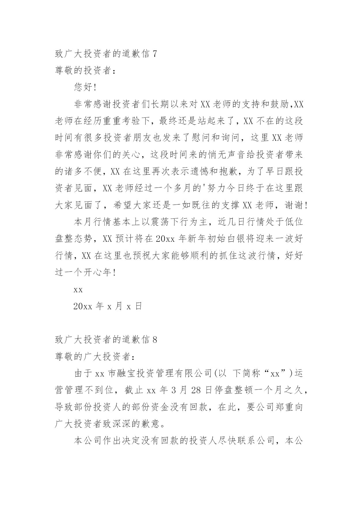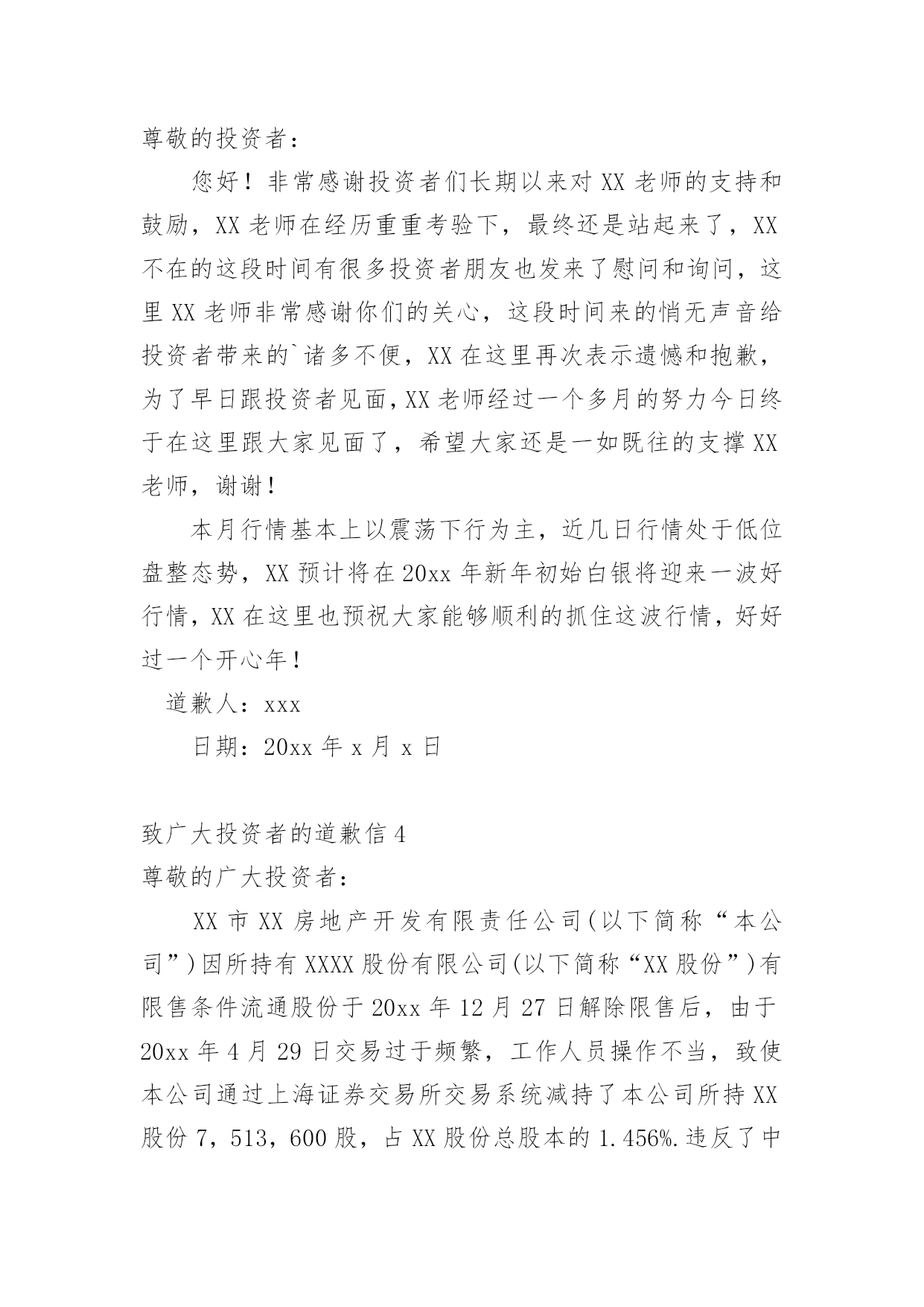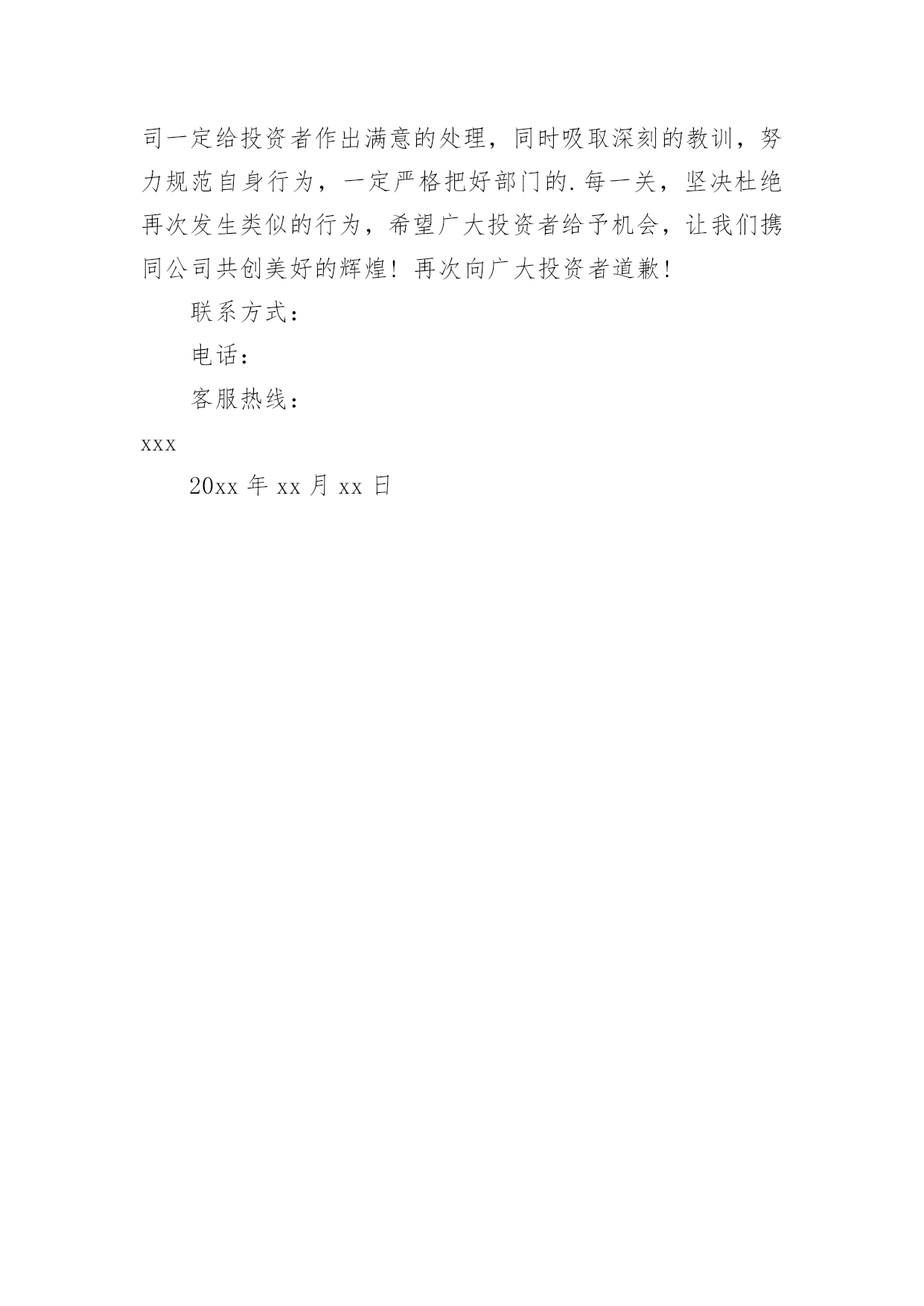 致广大投资者的道歉信致广大投资者的道歉信8篇现如今,我们不免要用到道歉信,在写道歉信的时候要注意态度诚恳、语气温和。那么,怎么去写道歉信呢?以下是小编精心整理的致广大投资者的道歉信,欢迎大家借鉴与参考,希望对大家有所帮助。致广大投资者的道歉信1尊敬的广大投资者:XX市XX房地产开发有限责任公司(以下简称本公司)因所持有XXXX股份有限公司(以下简称XX股份)有限售条件流通股份于20xx年12月27日解除限售后,由于20xx年4月29日交易过于频繁,工作人员操作不当,致使本公司通过上海证券交易所交易系统减持了本公司所持XX股份7,513,600股,占XX股份总股本的`1.456%。违反了中国证监会颁布的上市公司解除限售存量股份转让指导意见。为此,本公司向广大中小投资者表示最真诚的歉意。同时,本公司坚决支持中国证监会颁布的上市公司解除限售存量股份转让指导意见,也诚恳接受中国证监会和上海证券交易所及当地监管部门的相关处罚。本公司表示,要认真反思自身行为,剖析违规原因,深刻吸取教训,逐一落实改进措施,真正从行动上避免此类违规事件的发生。今后在从事证券交易活动中,严格遵守国家及监管部门的法律和行政法规,自觉维护证券市场秩序。此致敬礼!道歉人:xxx日期:20xx年x月x日致广大投资者的道歉信2尊敬的投资者:您好!非常感谢投资者们长期以来对XX老师的支持和鼓励,XX老师在经历重重考验下,最终还是站起来了,XX不在的`这段时间有很多投资者朋友也发来了慰问和询问,这里XX老师非常感谢你们的关心,这段时间来的悄无声音给投资者带来的诸多不便,XX在这里再次表示遗憾和抱歉,为了早日跟投资者见面,XX老师经过一个多月的努力今日终于在这里跟大家见面了,希望大家还是一如既往的支撑XX老师,谢谢!本月行情基本上以震荡下行为主,近几日行情处于低位盘整态势,XX预计将在20xx年新年初始白银将迎来一波好行情,XX在这里也预祝大家能够顺利的抓住这波行情,好好过一个开心年!xx20xx年x月x日致广大投资者的道歉信3尊敬的投资者:您好!非常感谢投资者们长期以来对XX老师的支持和鼓励,XX老师在经历重重考验下,最终还是站起来了,XX不在的这段时间有很多投资者朋友也发来了慰问和询问,这里XX老师非常感谢你们的关心,这段时间来的悄无声音给投资者带来的`诸多不便,XX在这里再次表示遗憾和抱歉,为了早日跟投资者见面,XX老师经过一个多月的努力今日终于在这里跟大家见面了,希望大家还是一如既往的支撑XX老师,谢谢!本月行情基本上以震荡下行为主,近几日行情处于低位盘整态势,XX预计将在20xx年新年初始白银将迎来一波好行情,XX在这里也预祝大家能够顺利的抓住这波行情,好好过一个开心年!道歉人:xxx日期:20xx年x月x日致广大投资者的道歉信4尊敬的广大投资者:XX市XX房地产开发有限责任公司(以下简称“本公司”)因所持有XXXX股份有限公司(以下简称“XX股份”)有限售条件流通股份于20xx年12月27日解除限售后,由于20xx年4月29日交易过于频繁,工作人员操作不当,致使本公司通过上海证券交易所交易系统减持了本公司所持XX股份7,513,600股,占XX股份总股本的1.456%.违反了中国证监会颁布的《上市公司解除限售存量股份转让指导意见》。为此,本公司向广大中小投资者表示最真诚的歉意。同时,本公司坚决支持中国证监会颁布的.《上市公司解除限售存量股份转让指导意见》,也诚恳接受中国证监会和上海证券交易所及当地监管部门的相关处罚。本公司表示,要认真反思自身行为,剖析违规原因,深刻吸取教训,逐一落实改进措施,真正从行动上避免此类违规事件的发生。今后在从事证券交易活动中,严格遵守国家及监管部门的法律和行政法规,自觉维护证券市场秩序。此致敬礼!XX市XX房地产开发有限责任公司20xx年x月x日致广大投资者的道歉信5尊敬的广大投资者:由于XX市融宝投资管理有限公司(以下简称“XX”)运营管理不到位,截止20xx年3月28日停盘整顿一个月之久,导致部份投资人的部份资金没有回款,在此,要公司郑重向广大投资者致深深的歉意。本公司作出决定没有回款的投资人尽快联系公司,本公司一定给投资者作出满意的处理,同时吸取深刻的.教训,努力规范自身行为,一定严格把好部门的每一关,坚决杜绝再次发生类似的行为,希望广大投资者给予机会,让我们携同公司共创美好的辉煌!再次向广大投资者道歉!联系方式:XX官方QQ群:7151XXXX电话:0752—577XXXX客服热线:400—788—XXXXXXX20xx年x月x日致广大投资者的道歉信6尊敬的广大投资者:由于XX市融宝投资管理有限公司(以下简称“XX”)运营管理不到位,截止20xx年3月28日停盘整顿一个月之久,导致部份投资人的'部份资金没有回款,在此,要公司